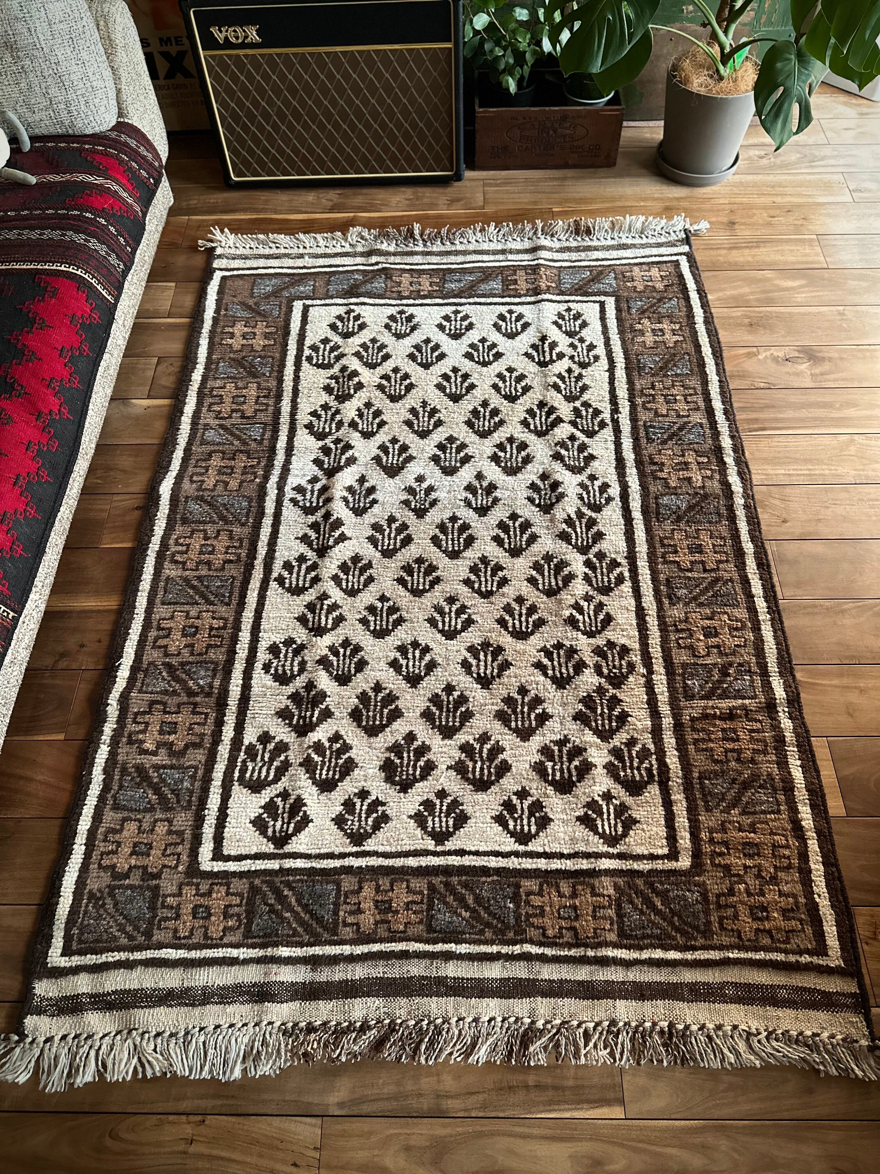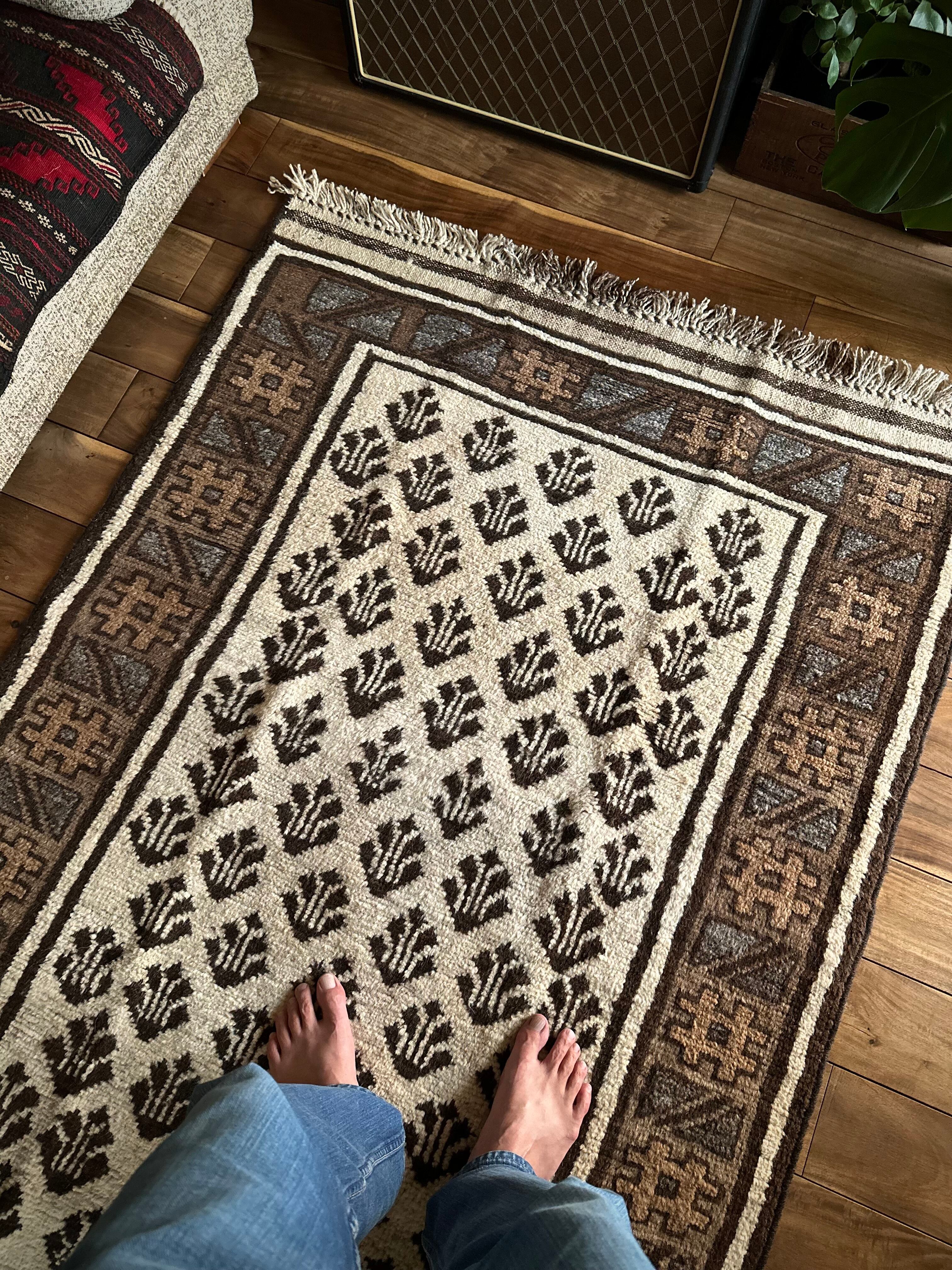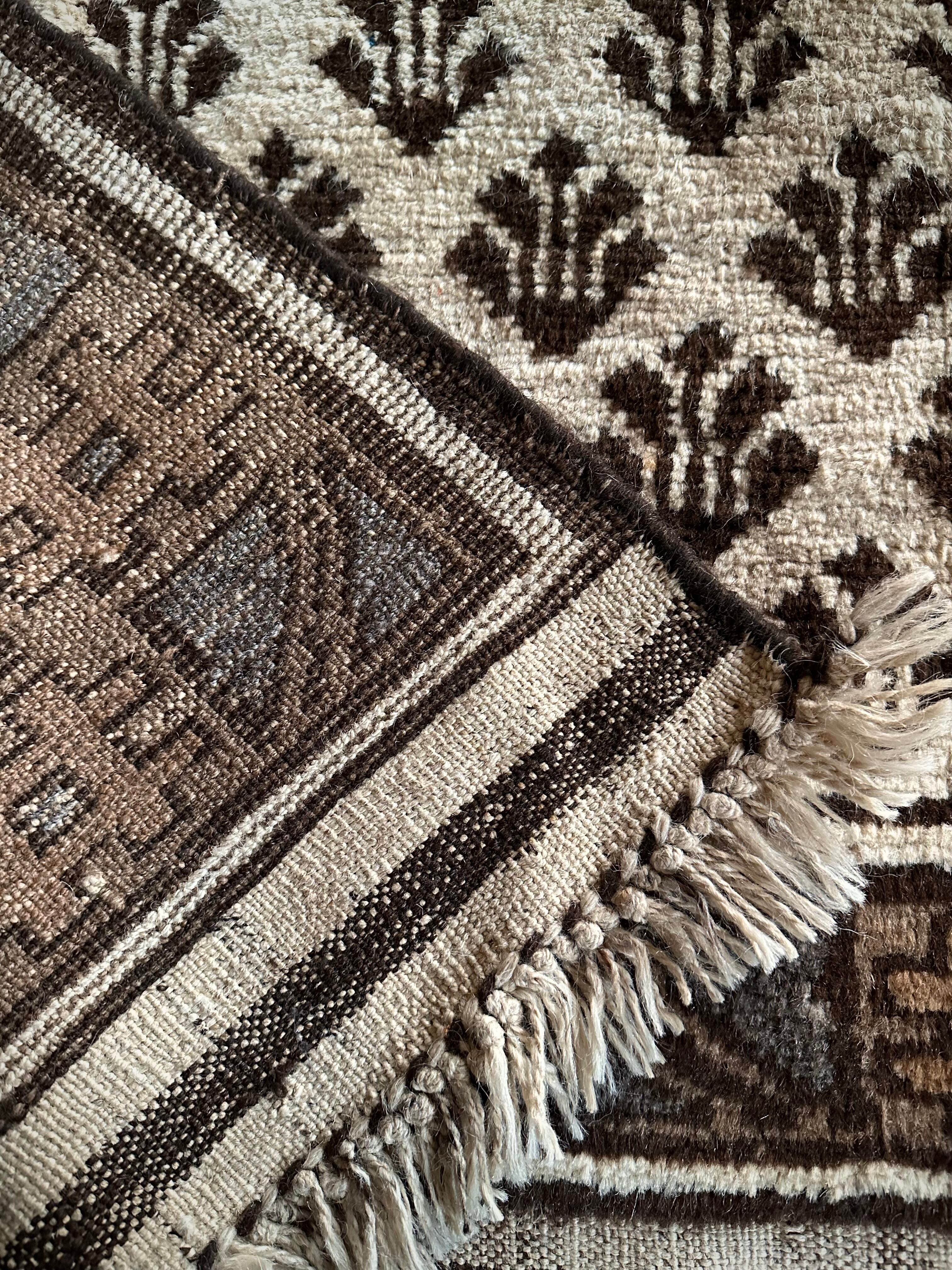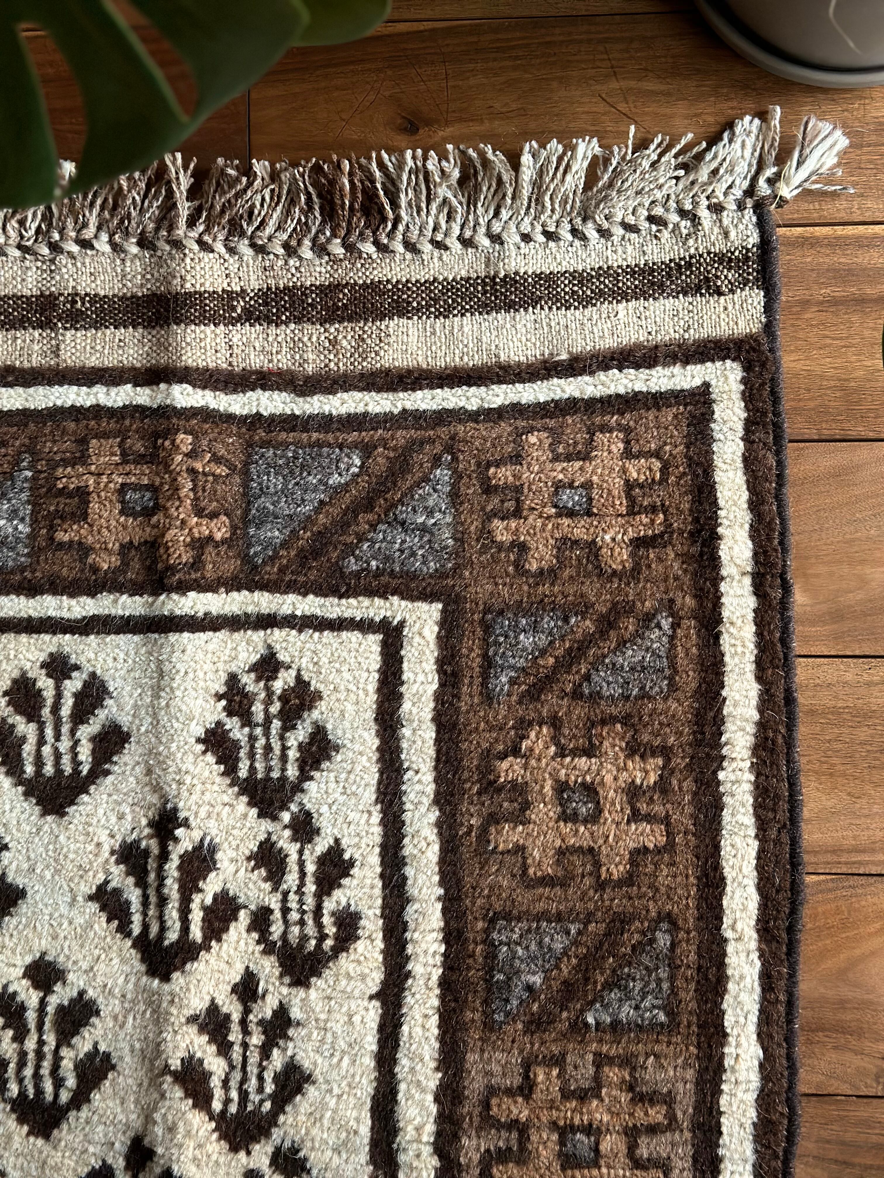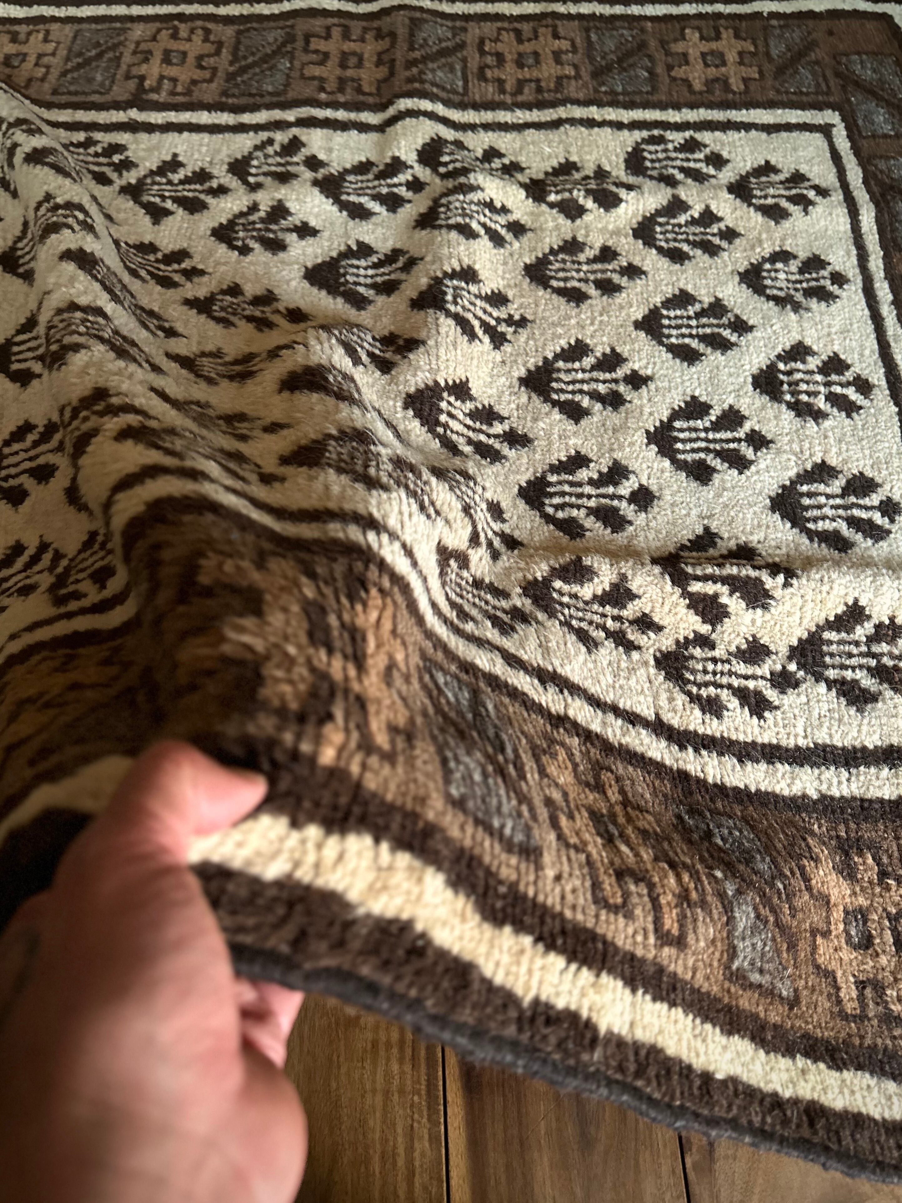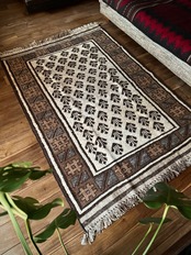 最後にラグそのものに関しては羊毛特有の匂いがあり、採寸は中央付近で計測していますが、手織りならではの歪みによる誤差や水洗いクリーニングによる縮み、また草木染めによる経年劣化の色ムラなどがありますが、それもまたヴィンテージラグの魅力かとご理解ください。