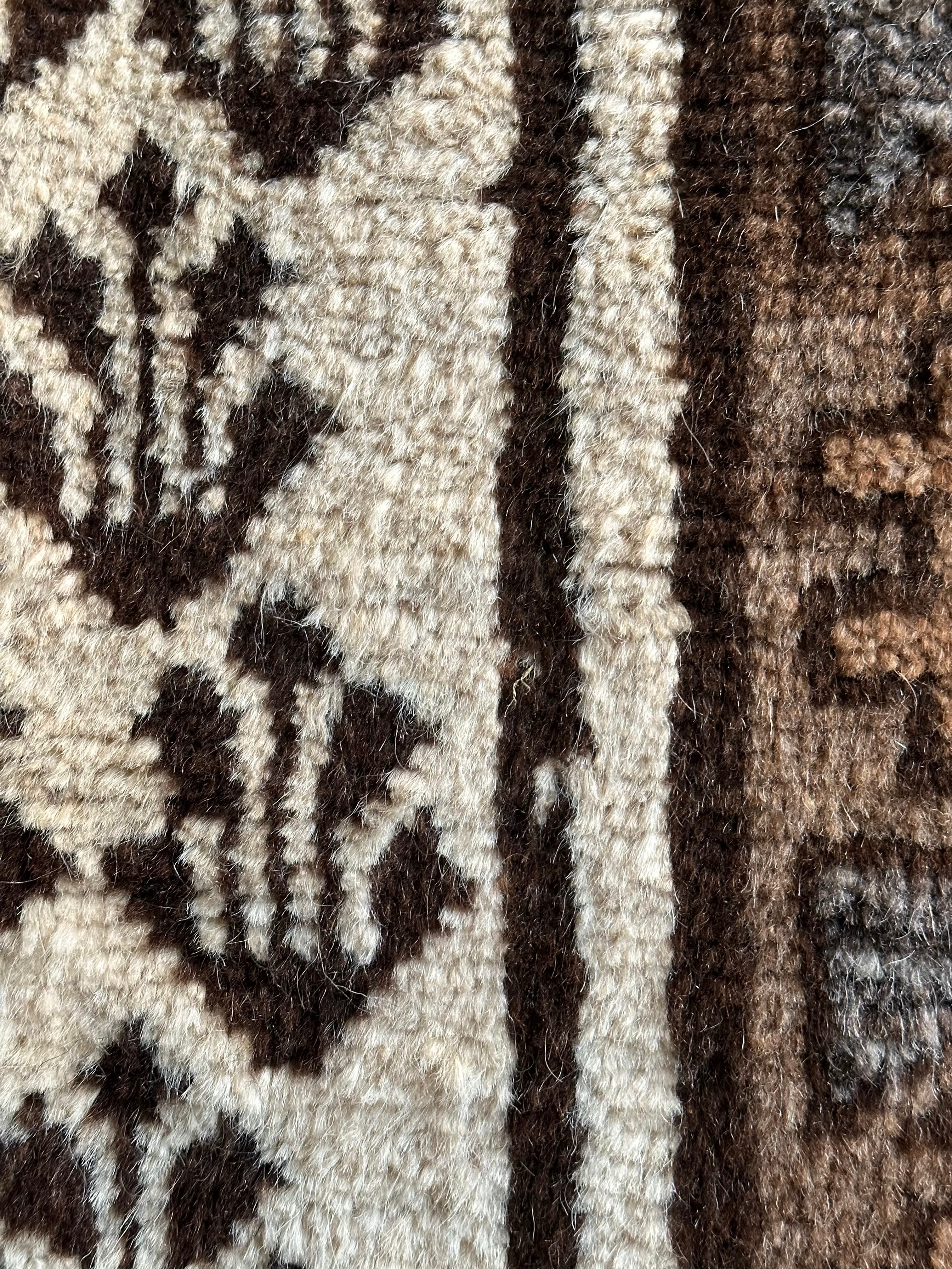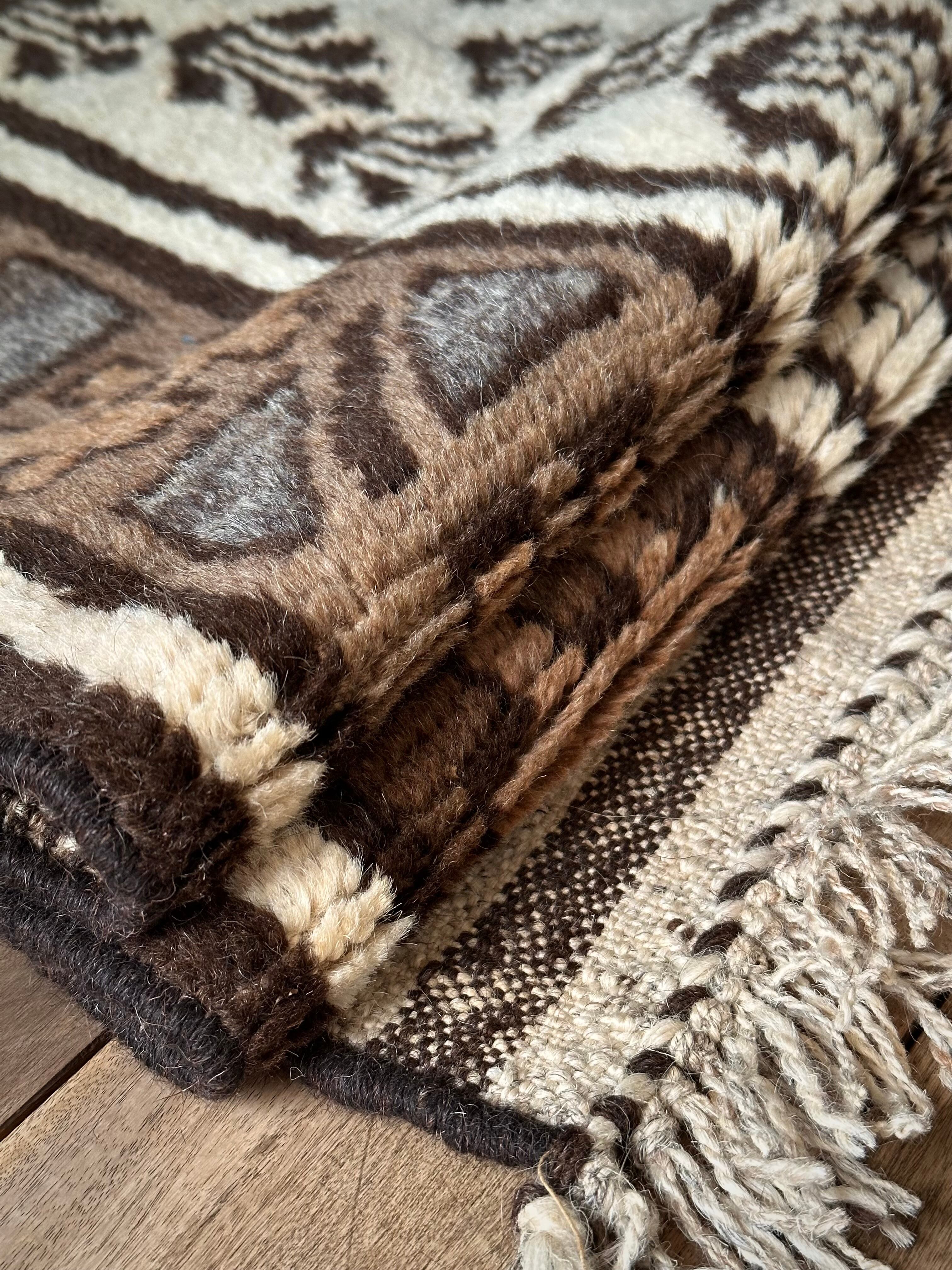 原毛を使用したラグではモロッコのベルベル人が織るベニワレンが有名ですが、こちら無染色のタイマニラグも近年は人気で、やはりインテリアへの馴染みやすさが魅力のひとつでしょうか。長いパイルのフカフカとした毛足の肌触りと、百合の花をモチーフとしたシンプルな見た目で、大きさ的にも二人掛けソファ前にぴったりなサイズ感になります。