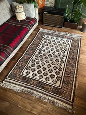 経年としては35年とヴィンテージラグとしてはまだ新しく、気になる経年劣化もなく目立つダメージやリペア箇所は見当たらないグッドコンディションになりますが、元が荒々しくざっくりとした織り方である事をご理解下さい。