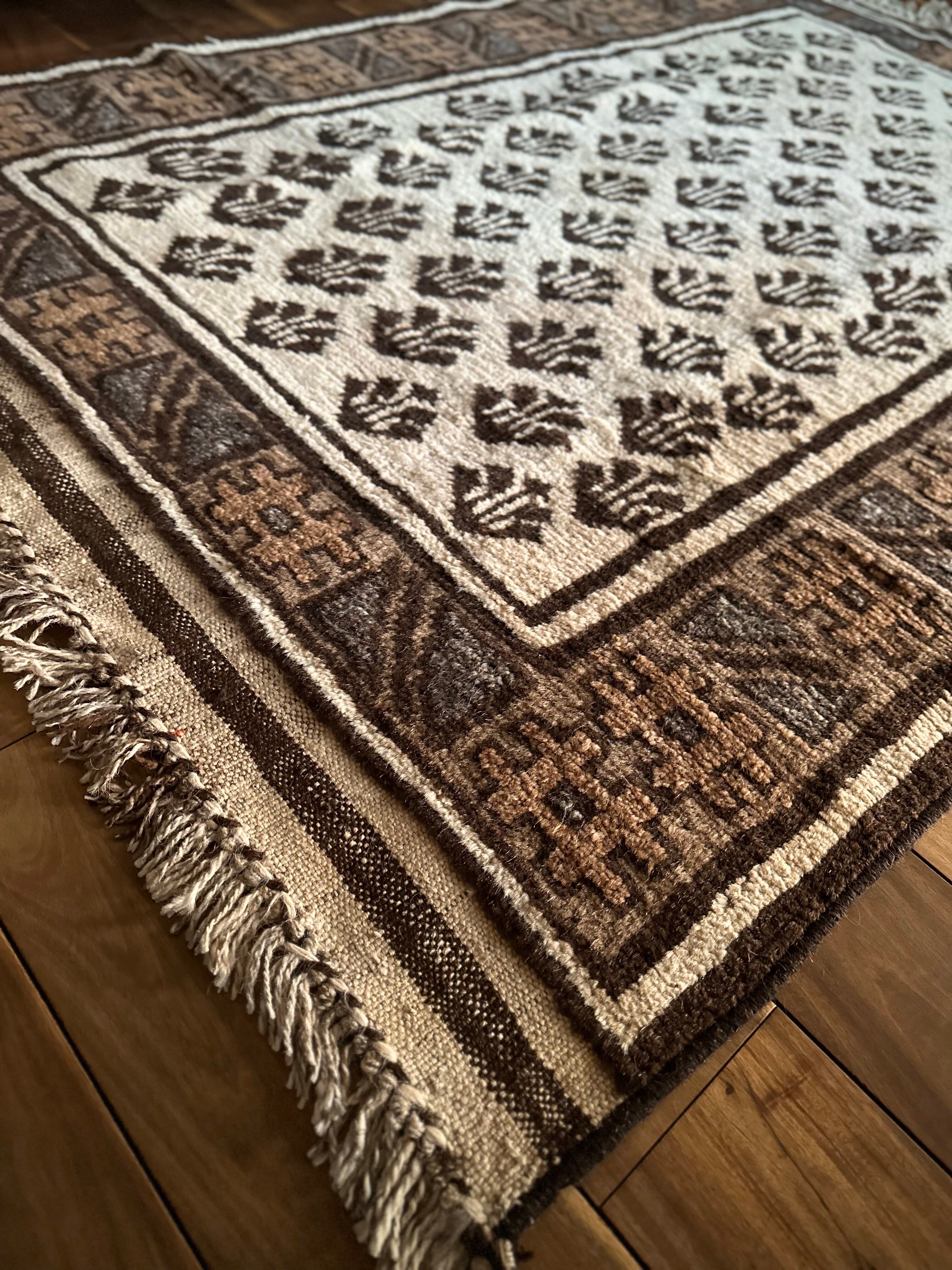 無染色のナチュラルウールな風合いが優しく感じるヘラート州に居住するタイマニ族のトライバルラグで、イラン南東部のロリ族のワイルドなラグにも引けを取らない毛足の長いざっくりとした織りが、まさにプリミティブアートと言わんばかりの印象を与えてくれます。