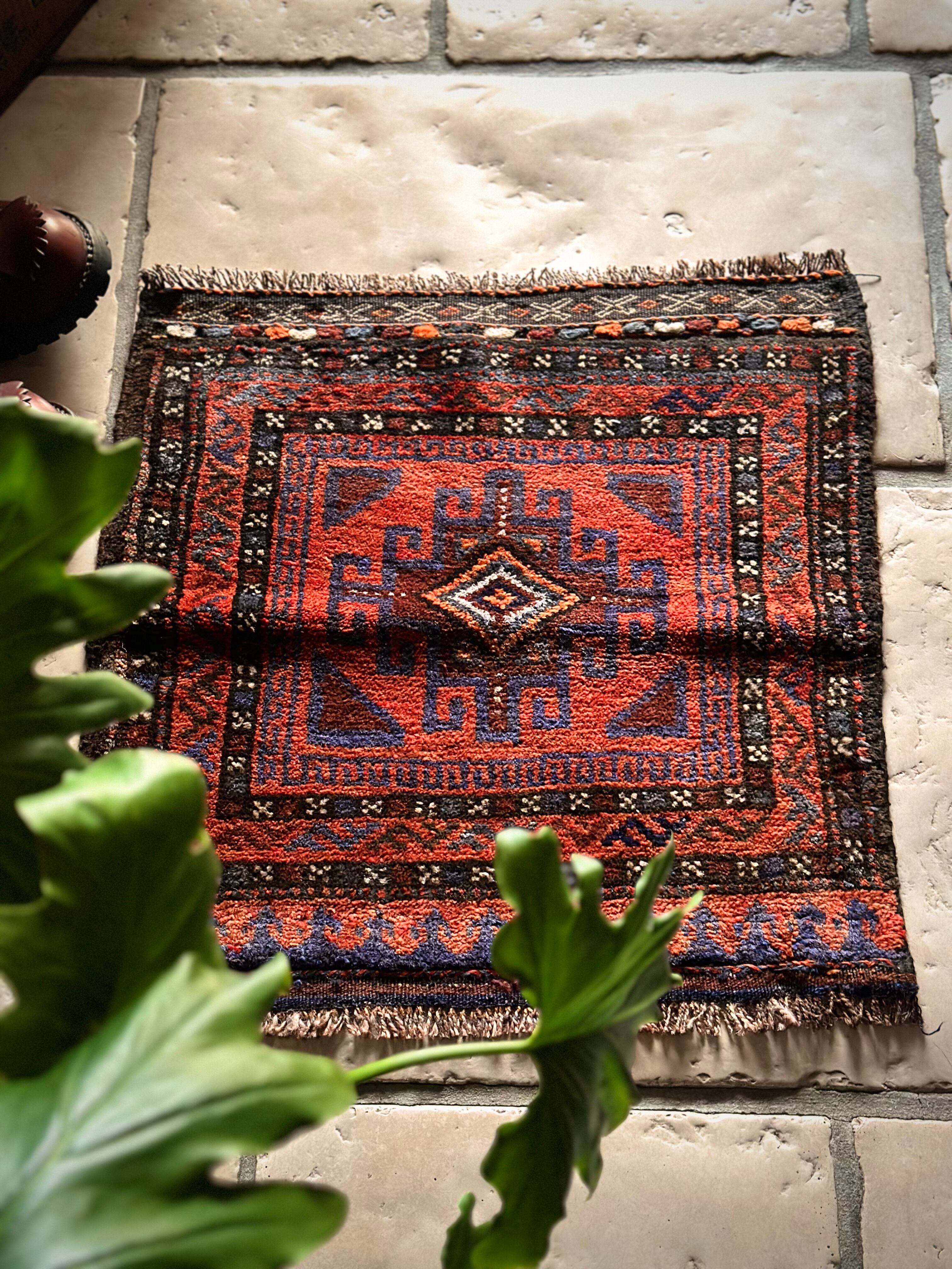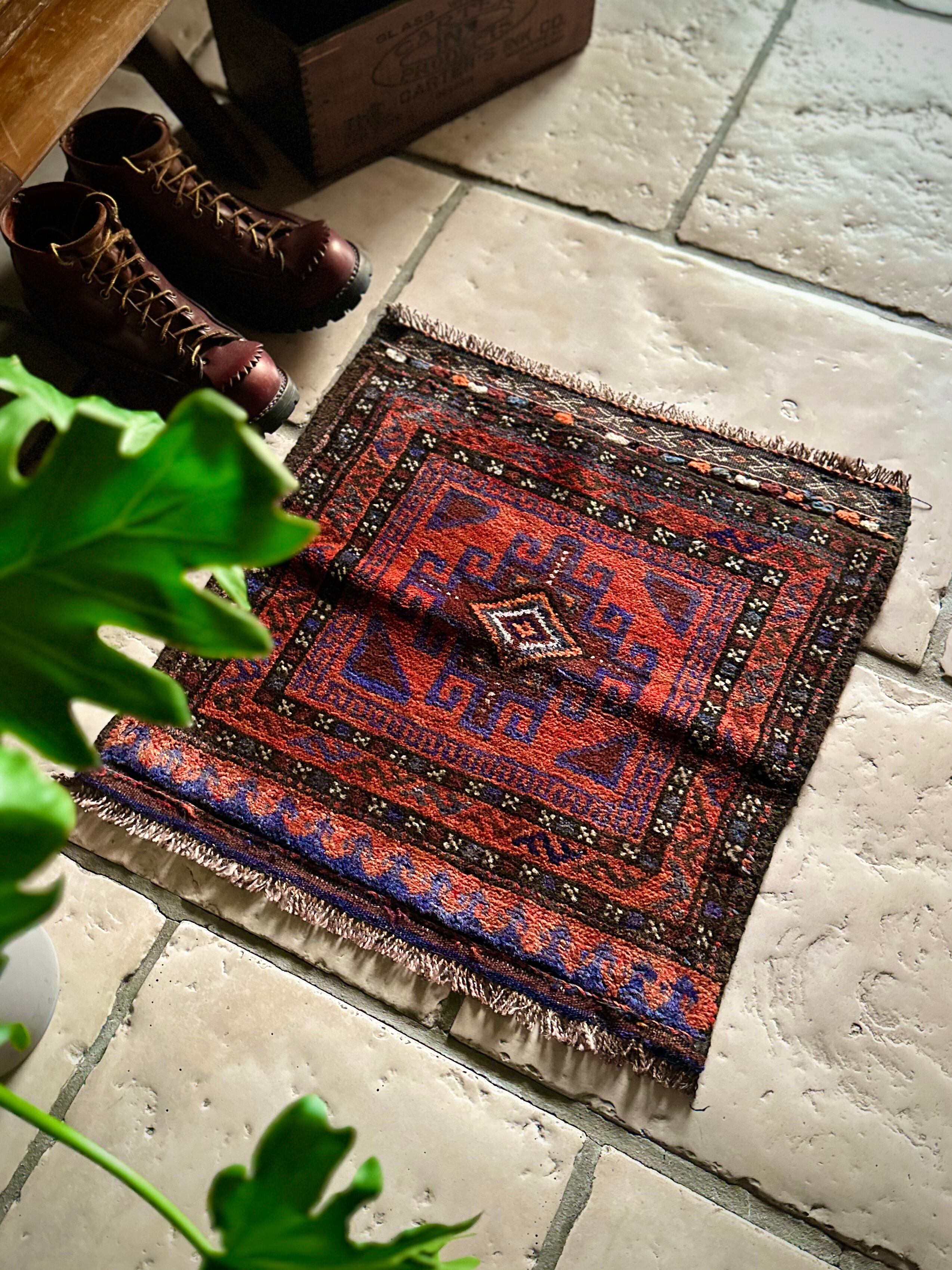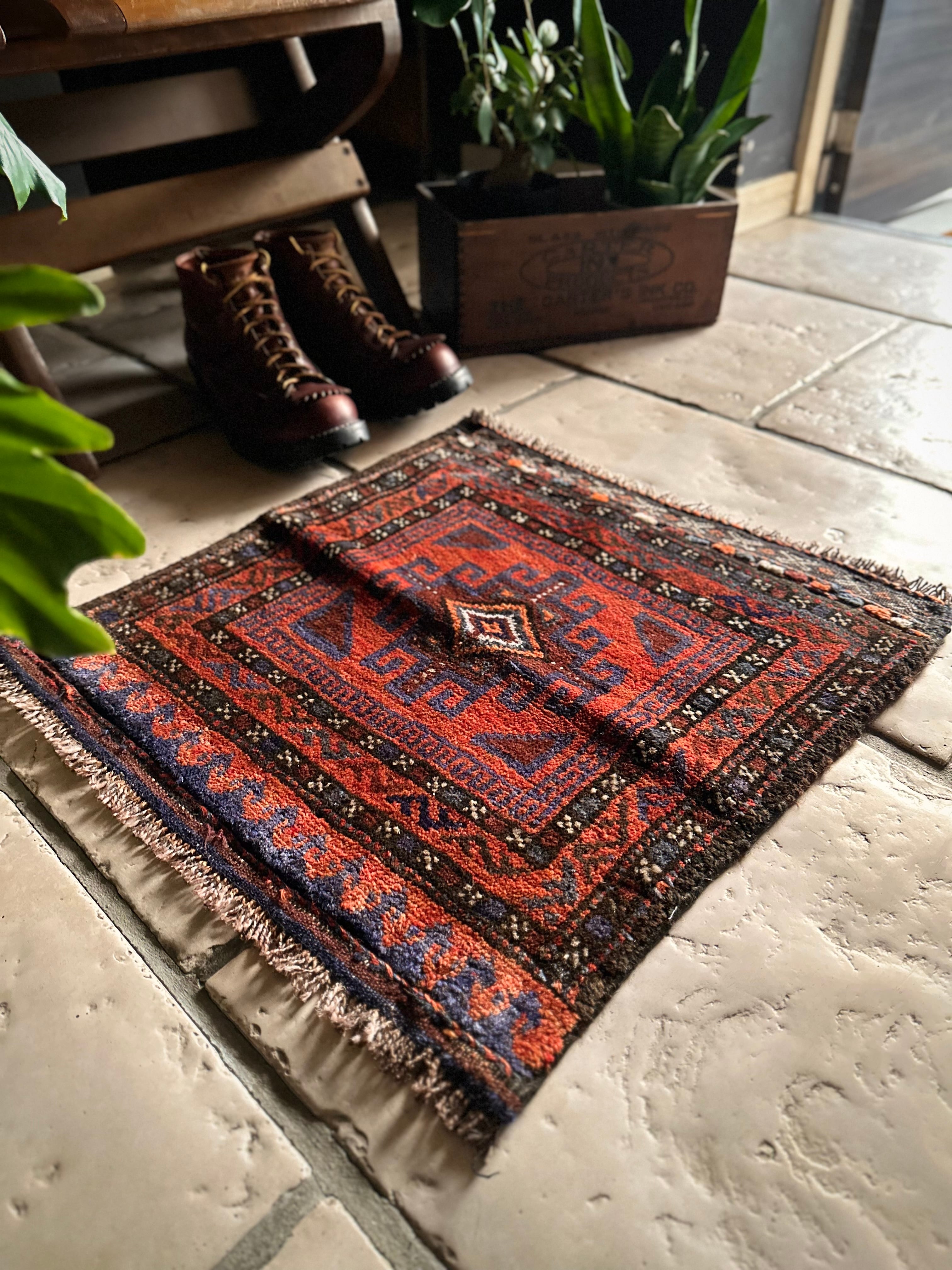 メダリオンを象徴したテラコッタカラーの小振りサイズのミニラグで、アフガニスタン西部のヘラート州に居所するバルーチ族のトライバルラグになります。元々はホルジンと呼ばれるラクダやロバの背に跨がせるサドルバッグやトルパと言った袋物の表皮をラグに仕立て直したモノになります。