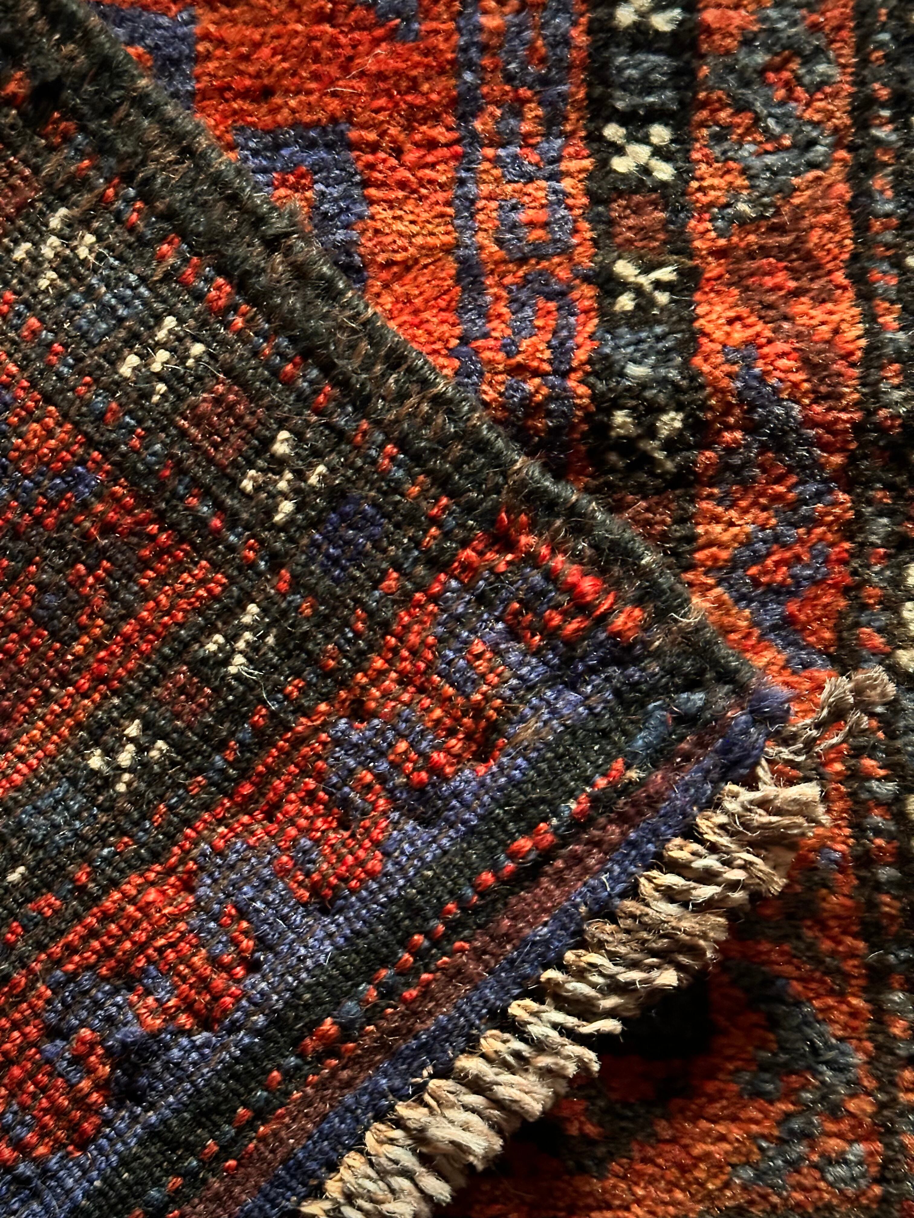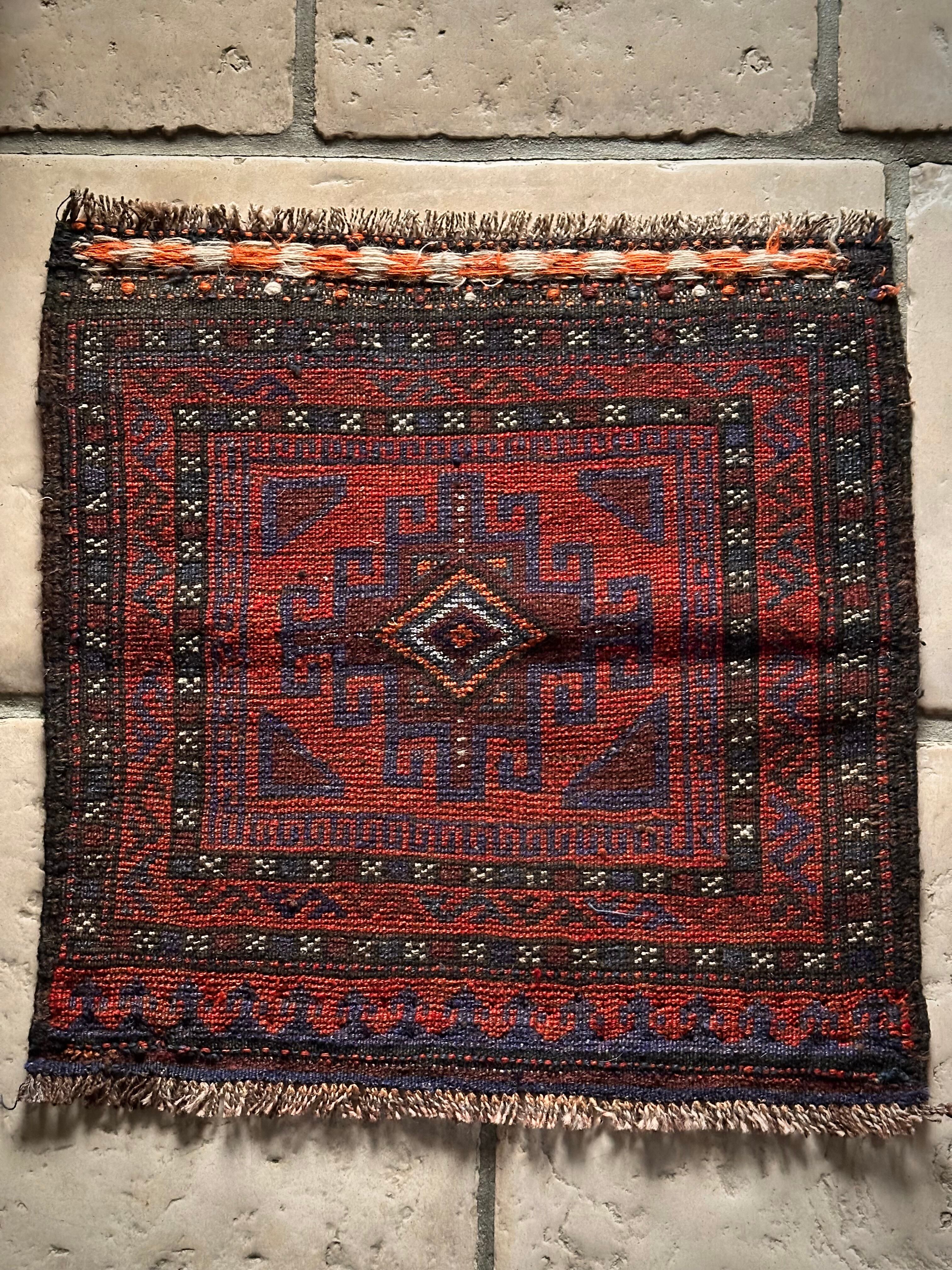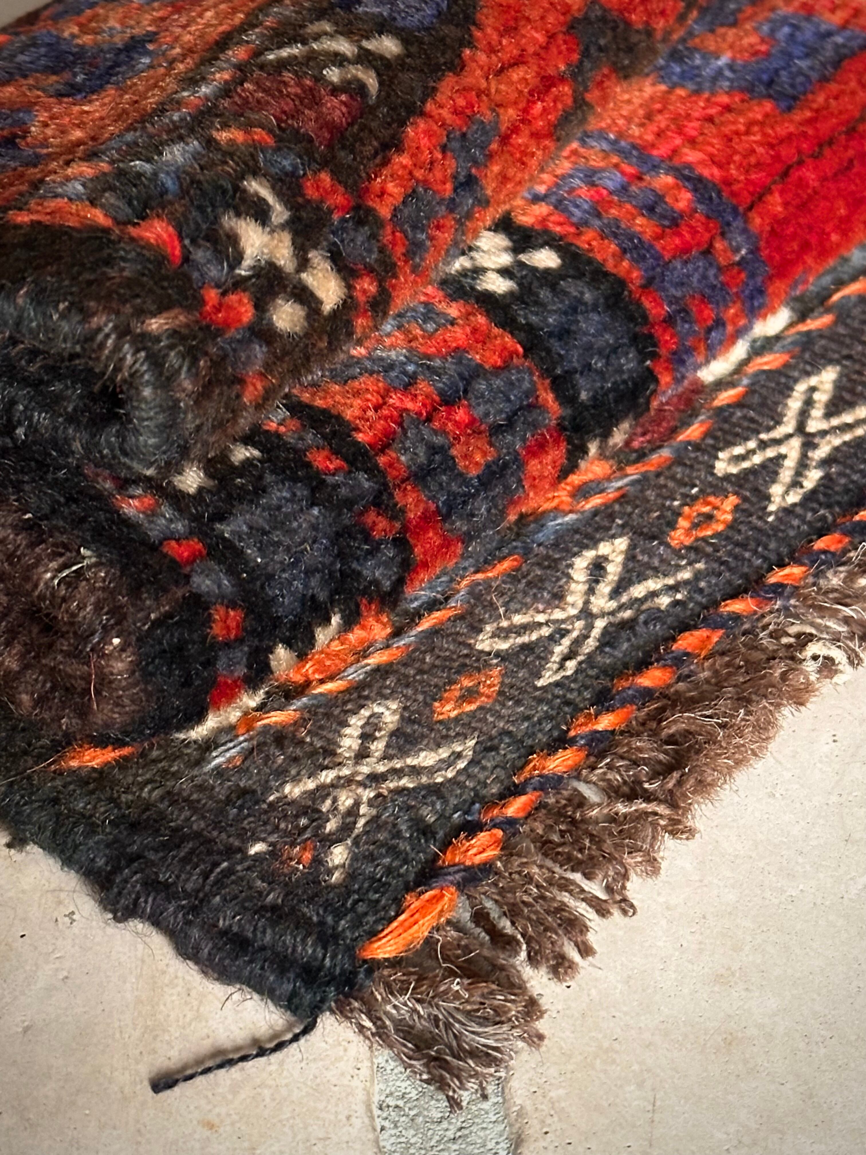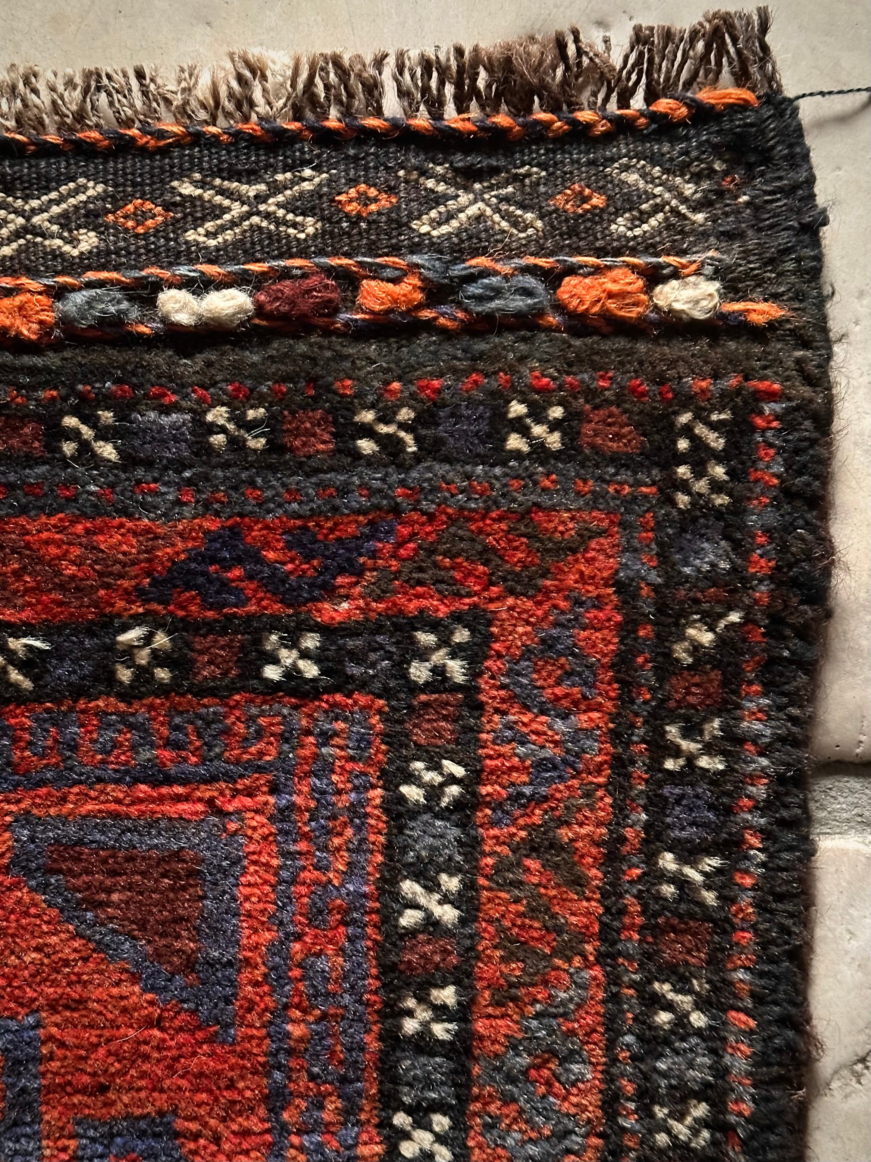 メダリオンを象徴したテラコッタカラーの小振りサイズのミニラグで、アフガニスタン西部のヘラート州に居所するバルーチ族のトライバルラグになります。元々はホルジンと呼ばれるラクダやロバの背に跨がせるサドルバッグやトルパと言った袋物の表皮をラグに仕立て直したモノになります。