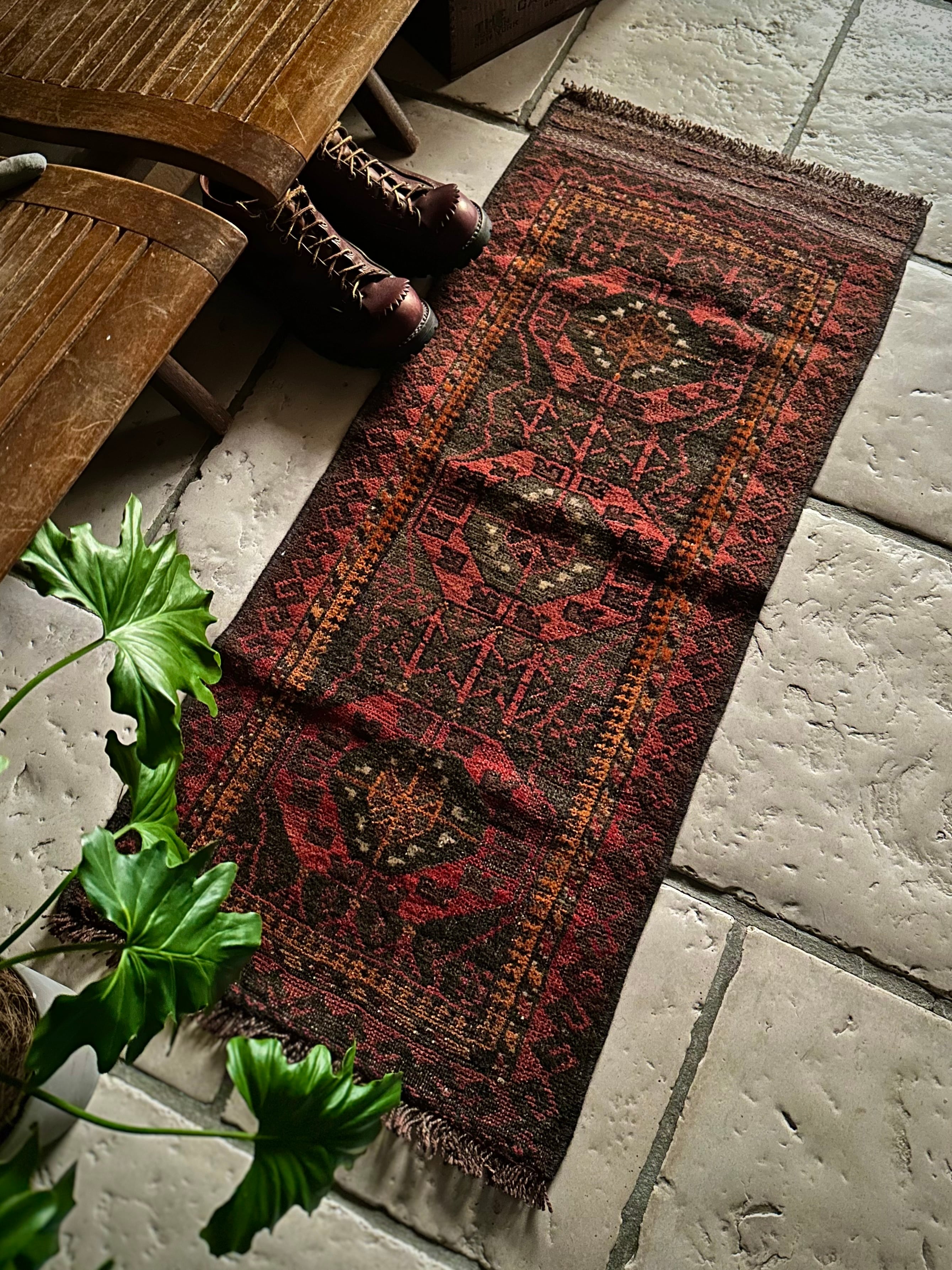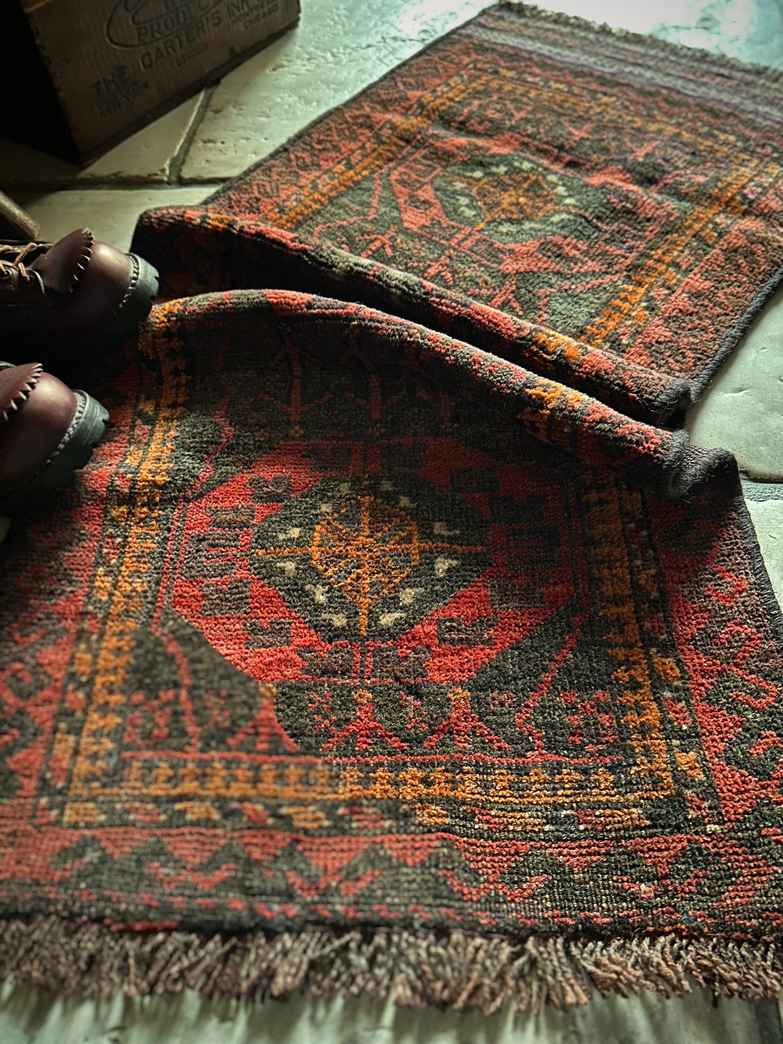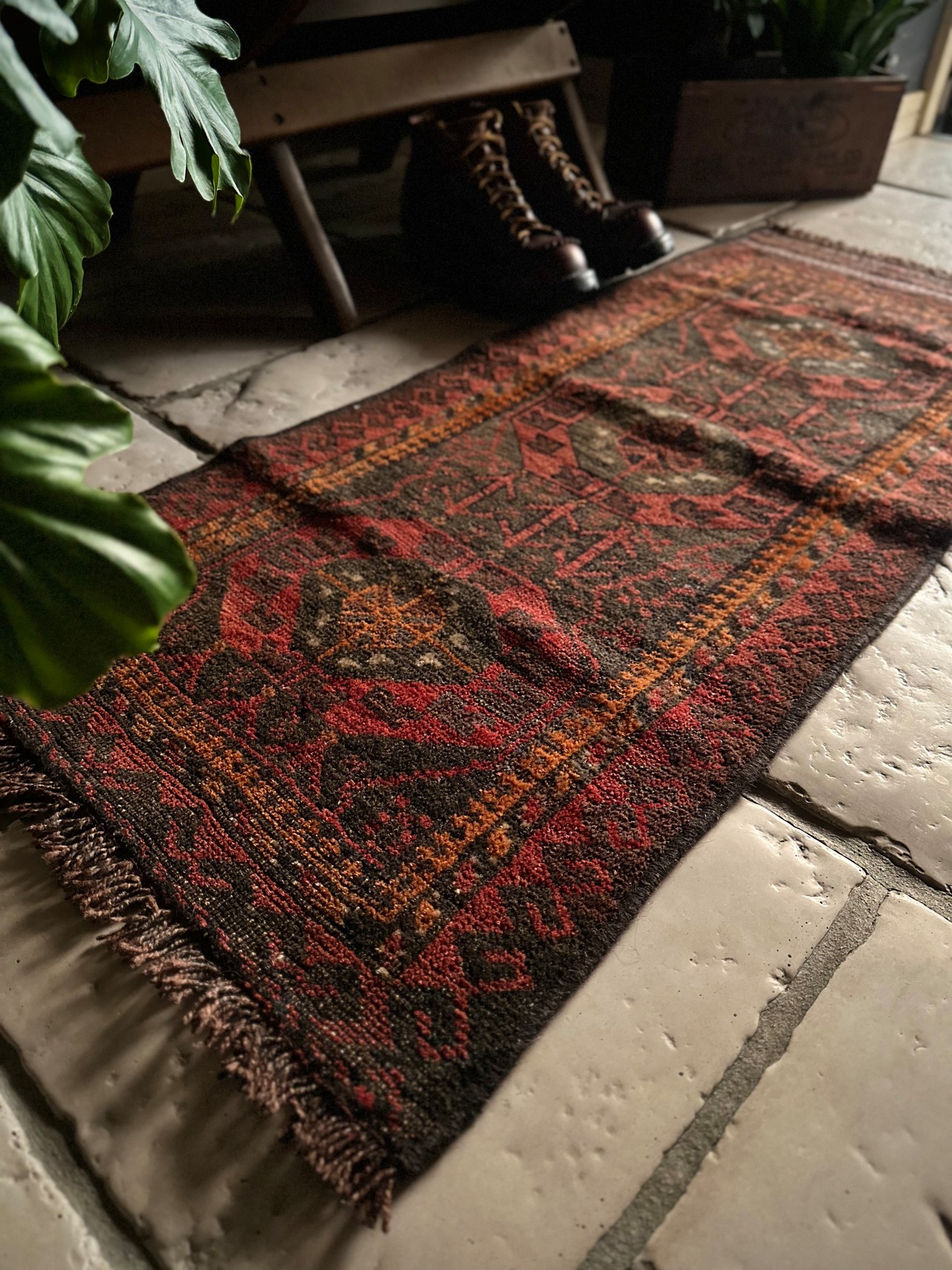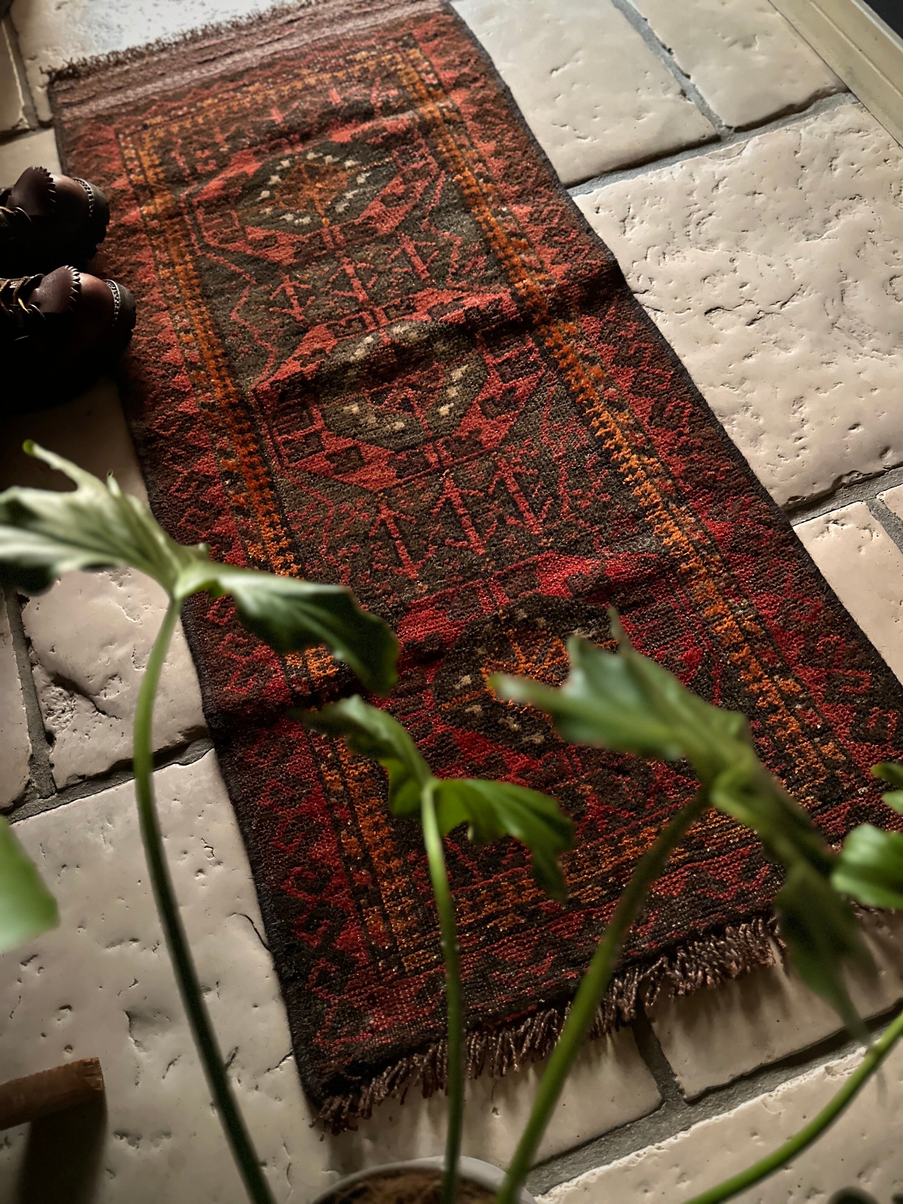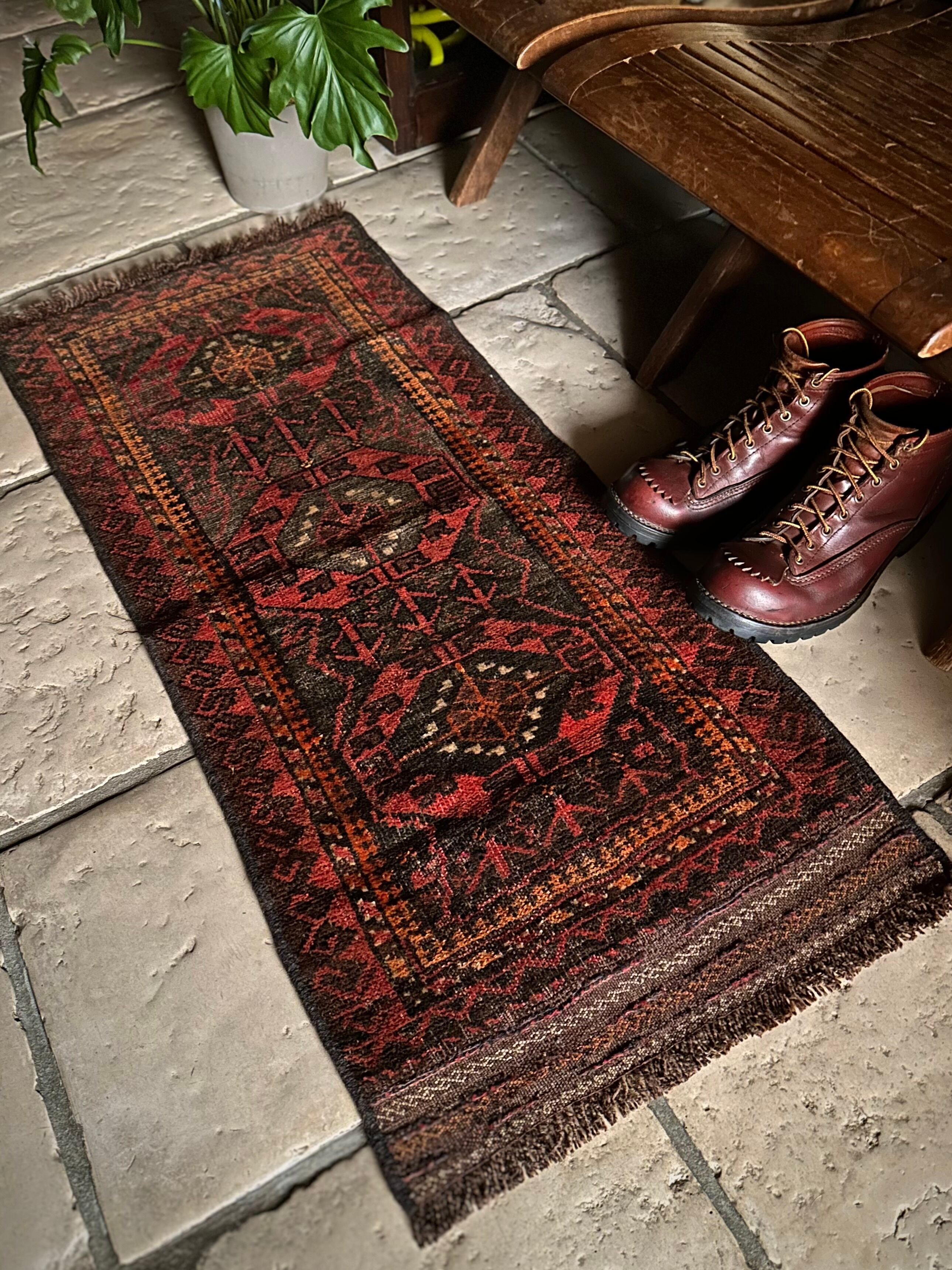 一目見た感じのアンティークな雰囲気が堪らなく、テラコッタ調の色彩も温かみを感じさせてくれるヘラート産バルーチ族のトライバルラグで、元々は収納やクッションとして使われていたバーリシトと呼ばれる袋物の表皮をラグに仕立て直してもらったモノになります。