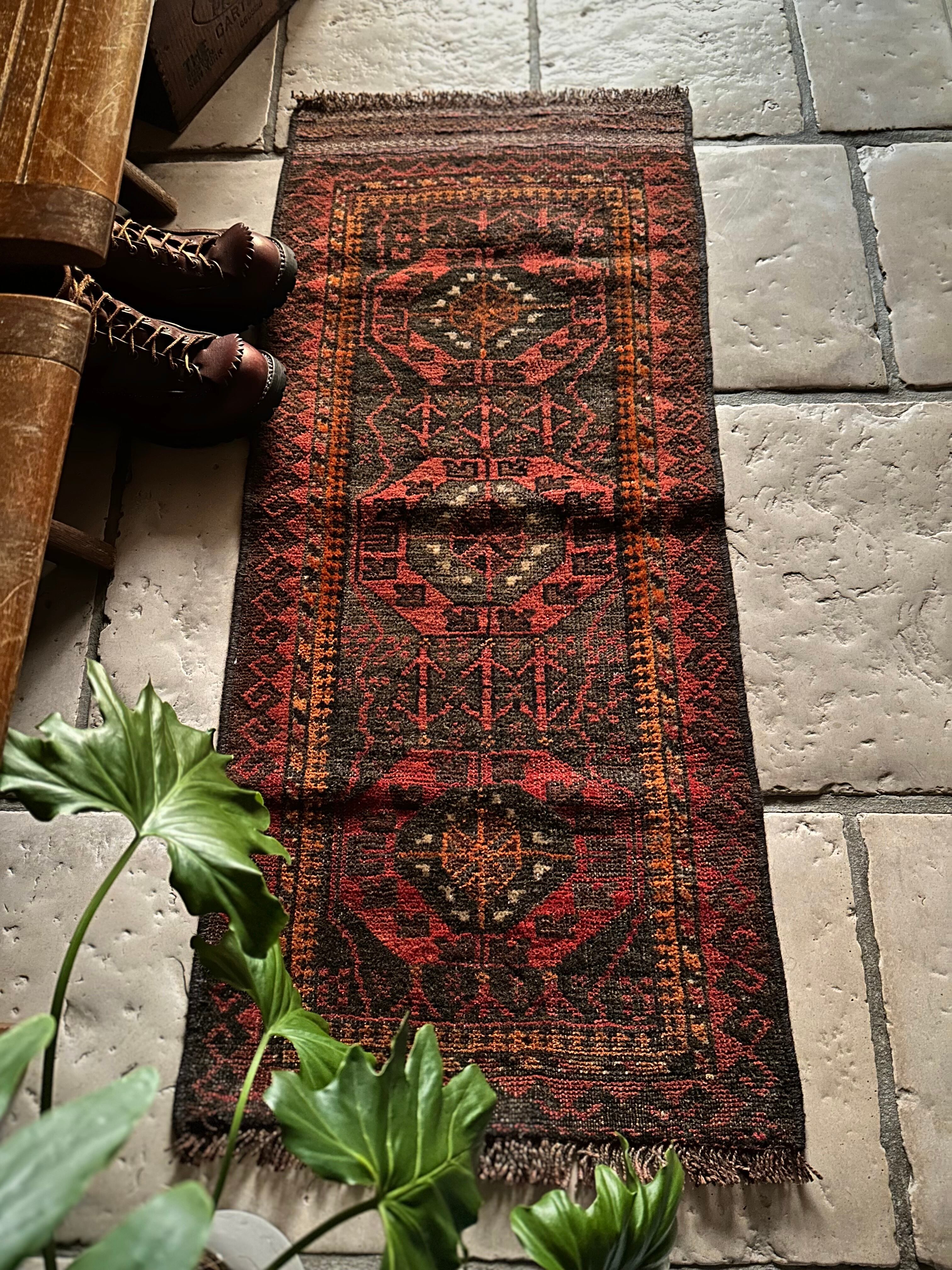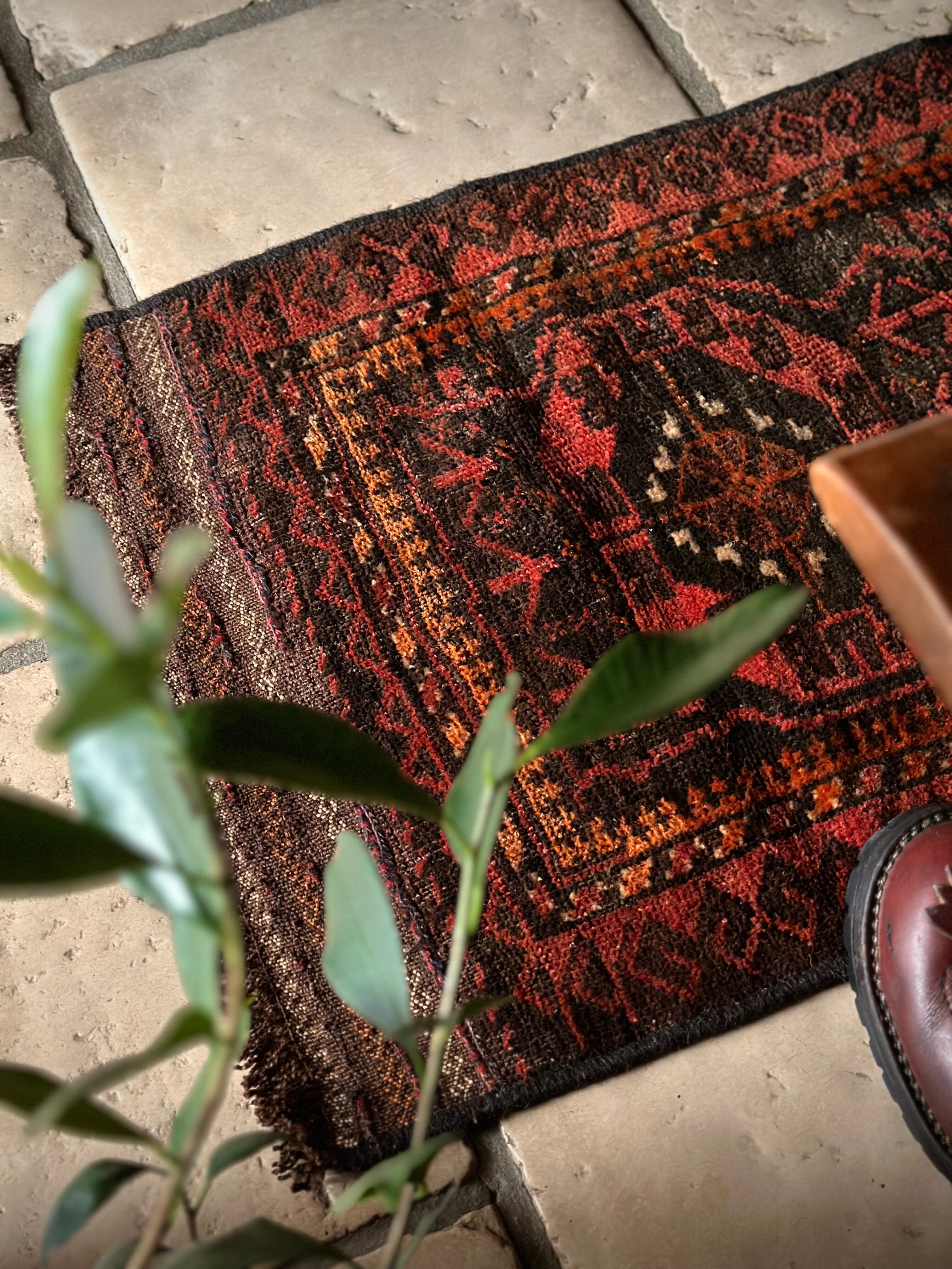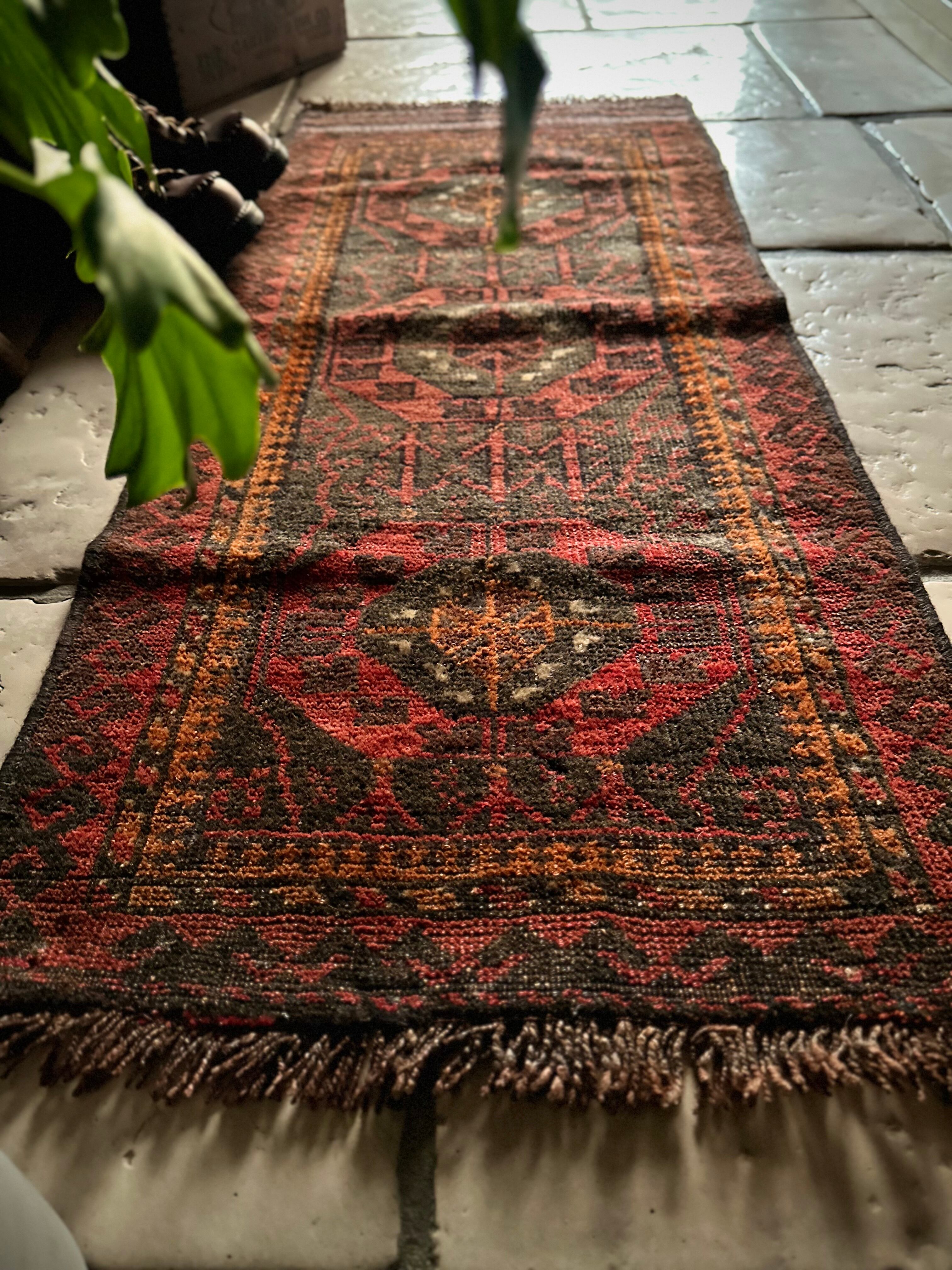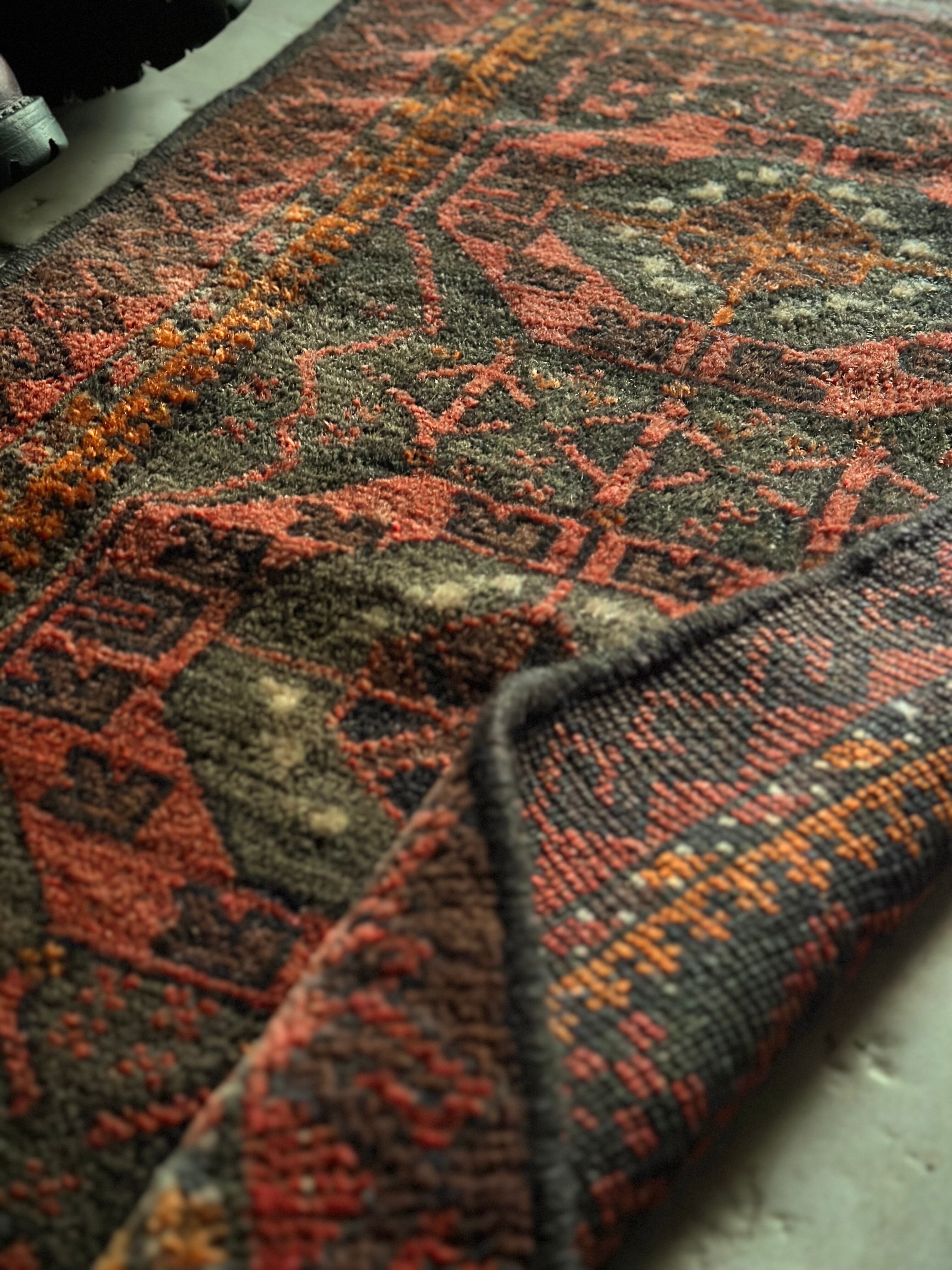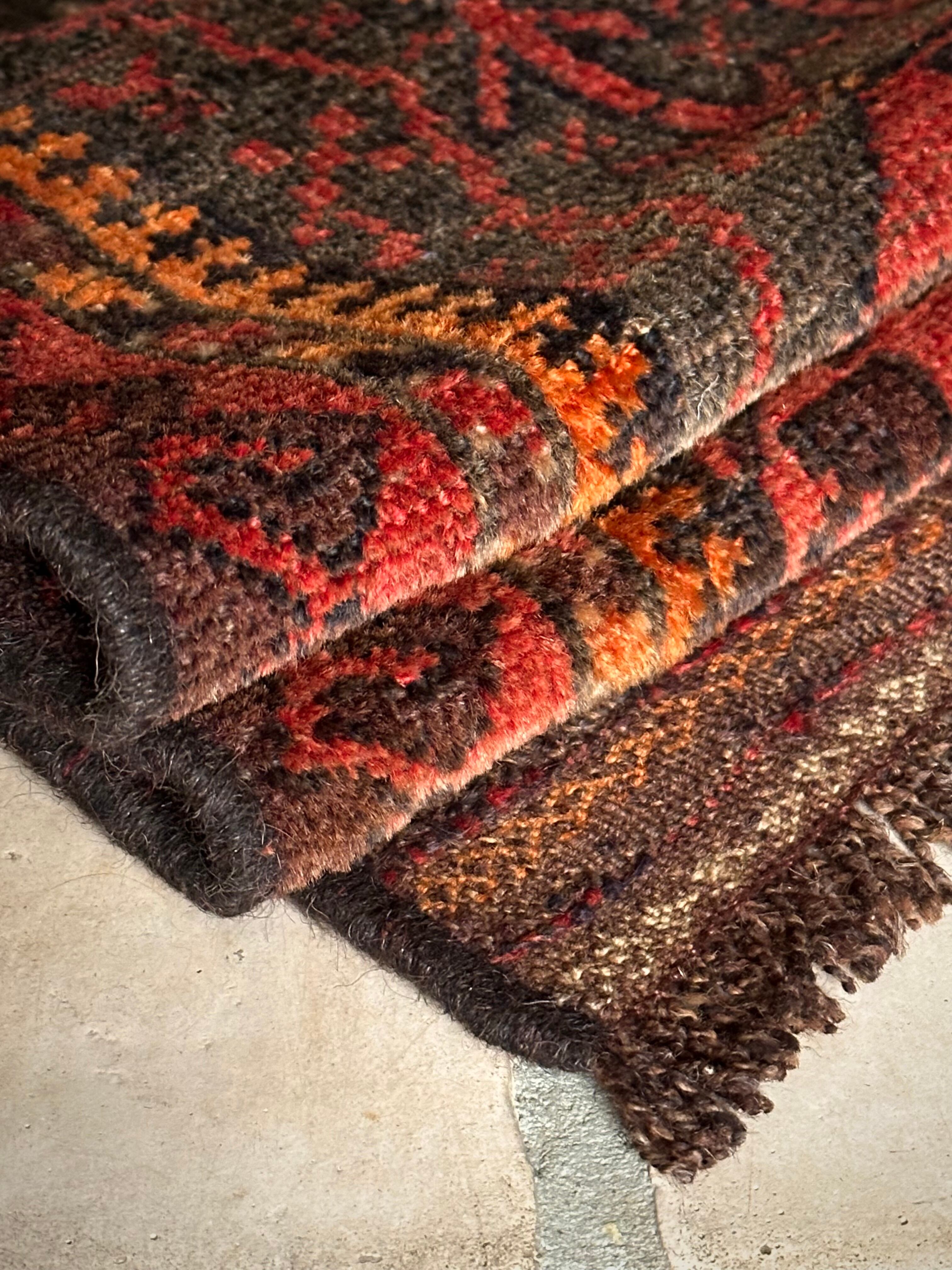 一目見た感じのアンティークな雰囲気が堪らなく、テラコッタ調の色彩も温かみを感じさせてくれるヘラート産バルーチ族のトライバルラグで、元々は収納やクッションとして使われていたバーリシトと呼ばれる袋物の表皮をラグに仕立て直してもらったモノになります。