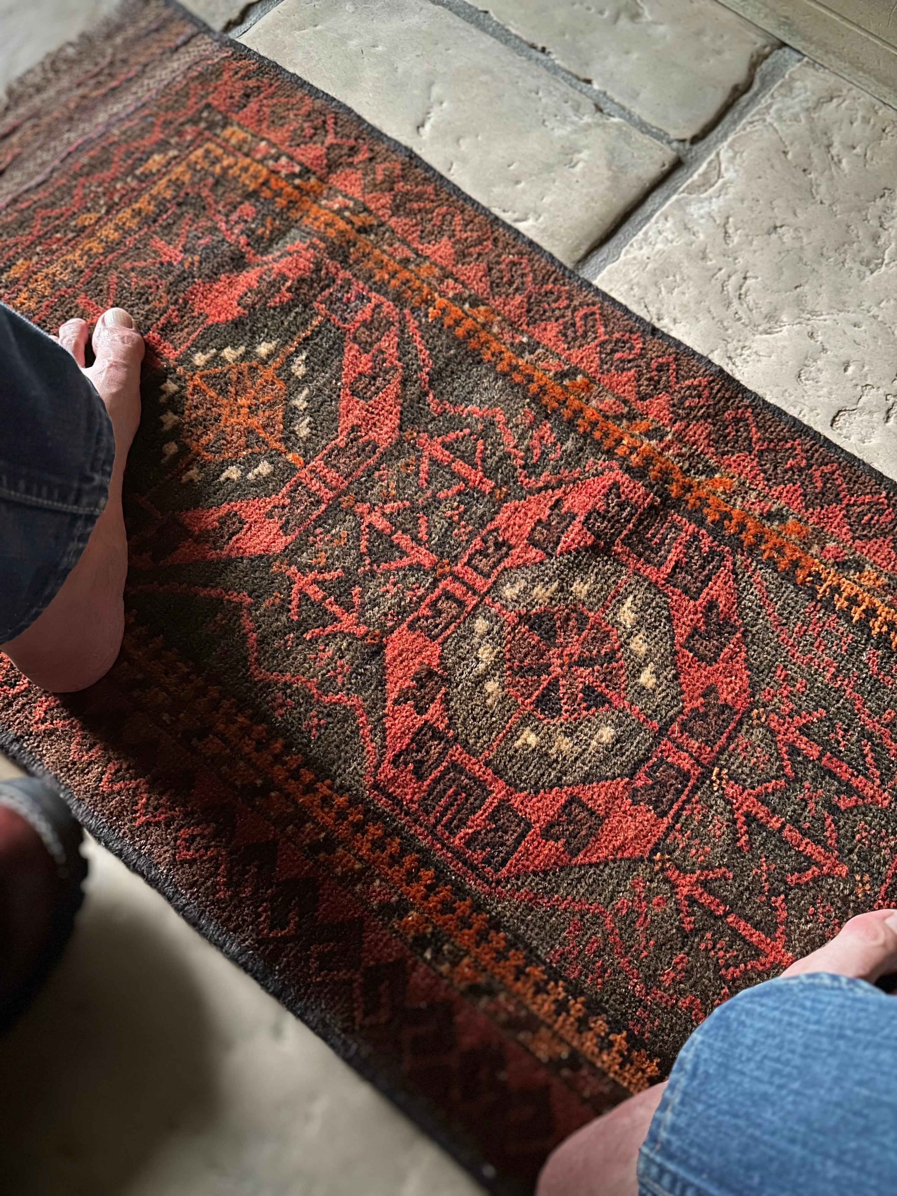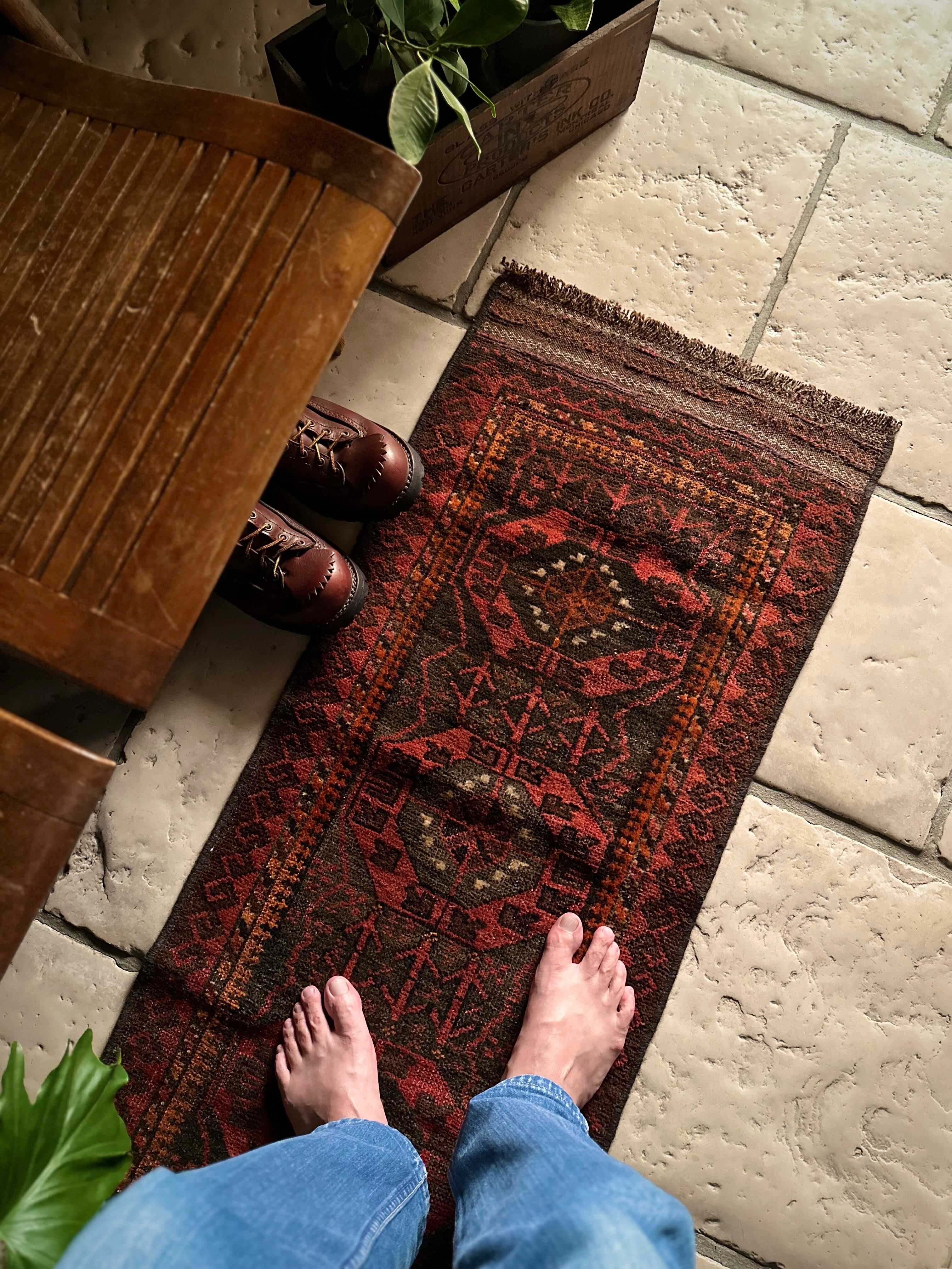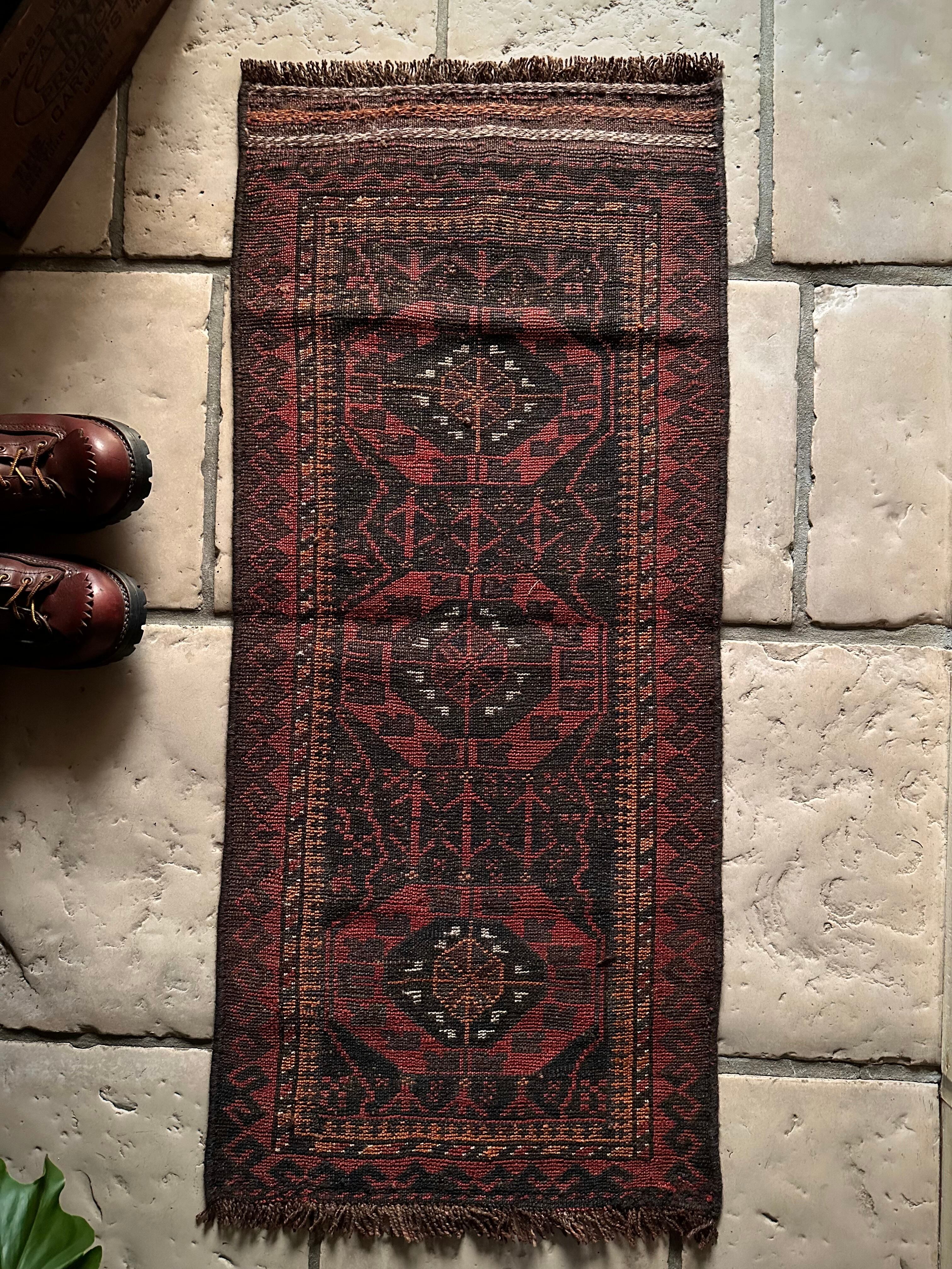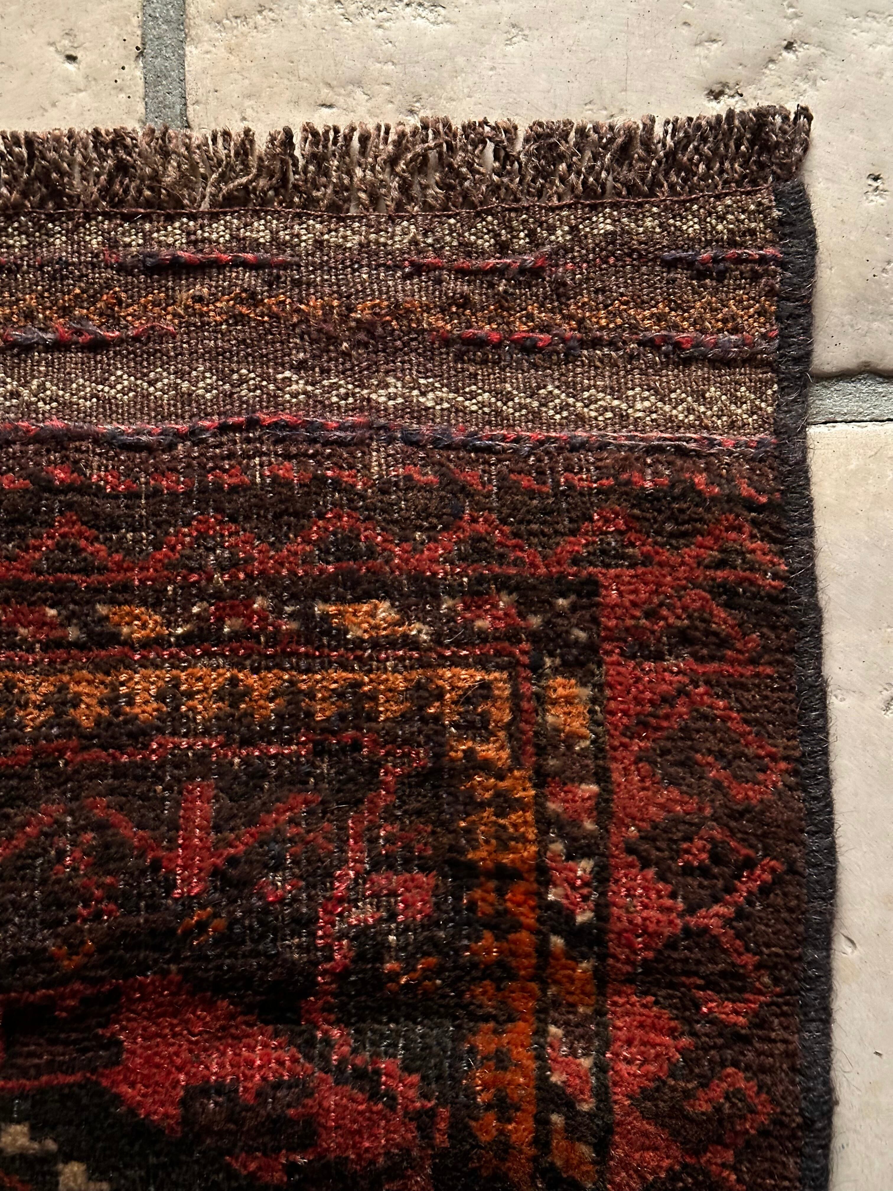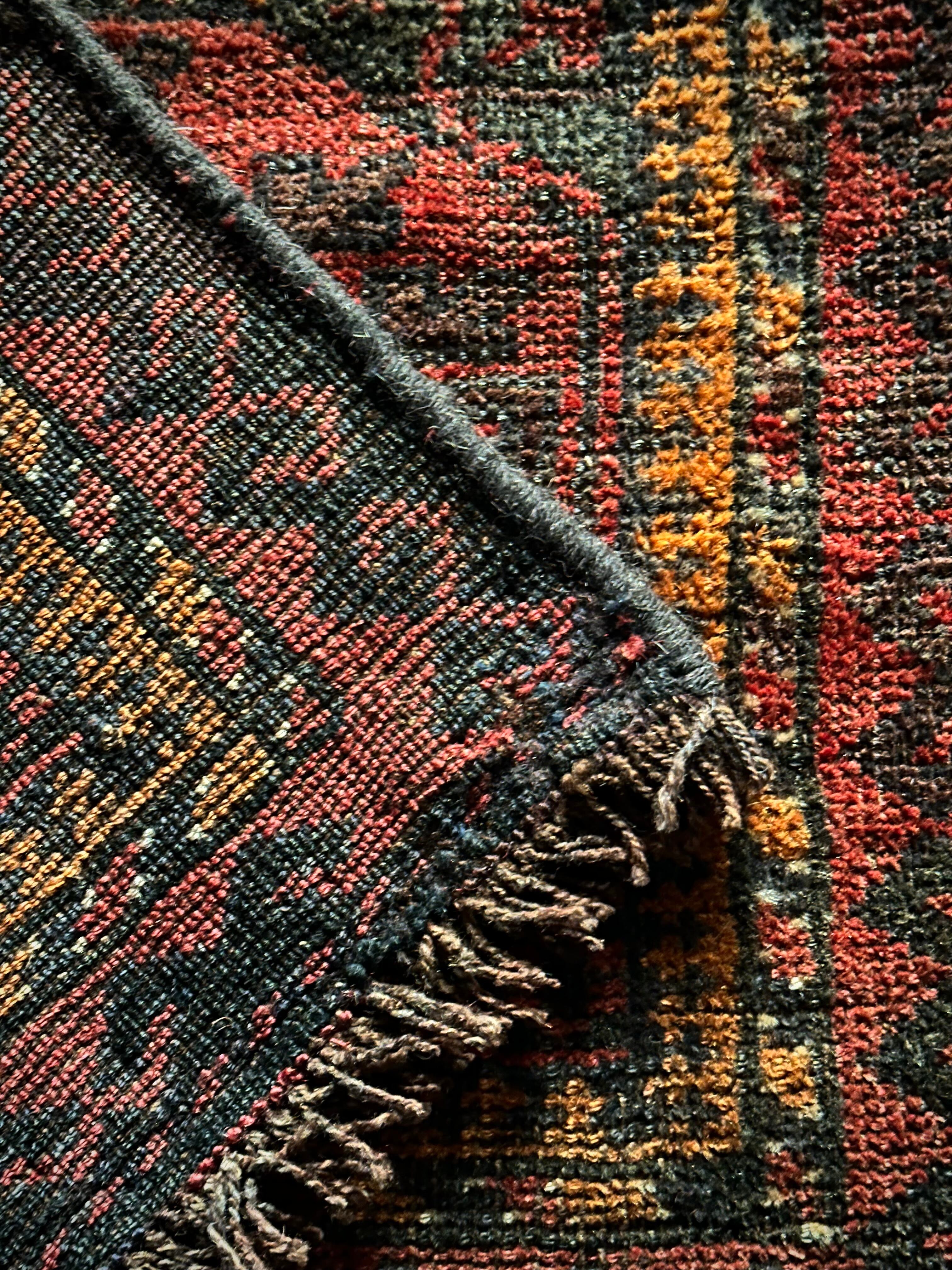 一目見た感じのアンティークな雰囲気が堪らなく、テラコッタ調の色彩も温かみを感じさせてくれるヘラート産バルーチ族のトライバルラグで、元々は収納やクッションとして使われていたバーリシトと呼ばれる袋物の表皮をラグに仕立て直してもらったモノになります。