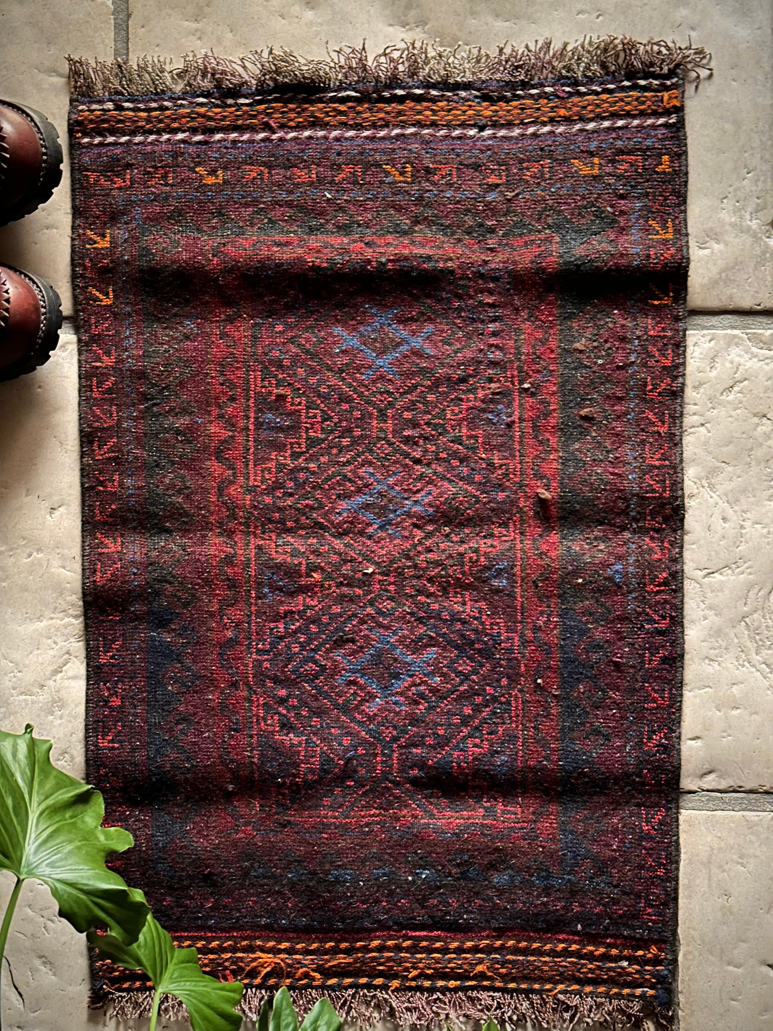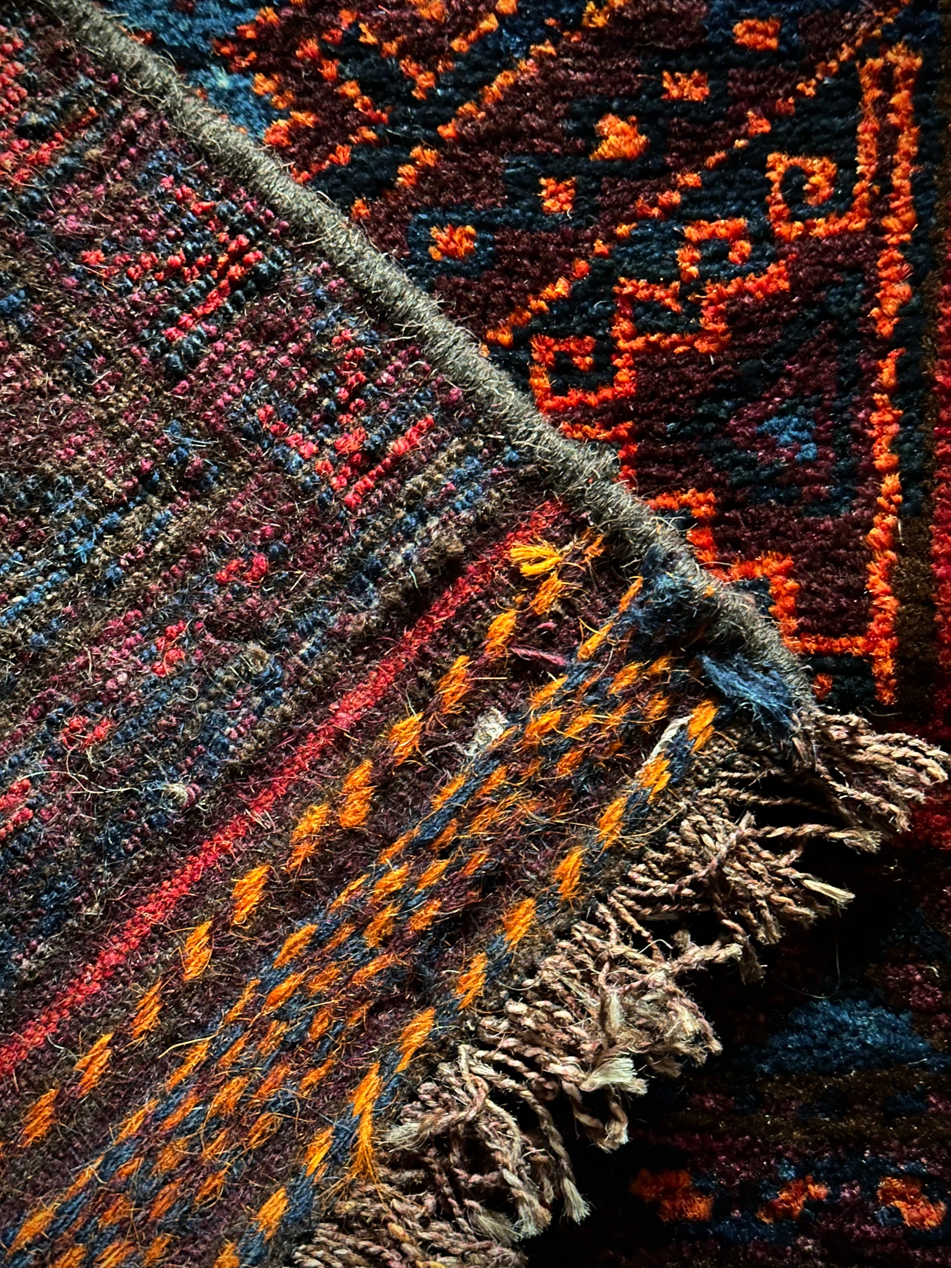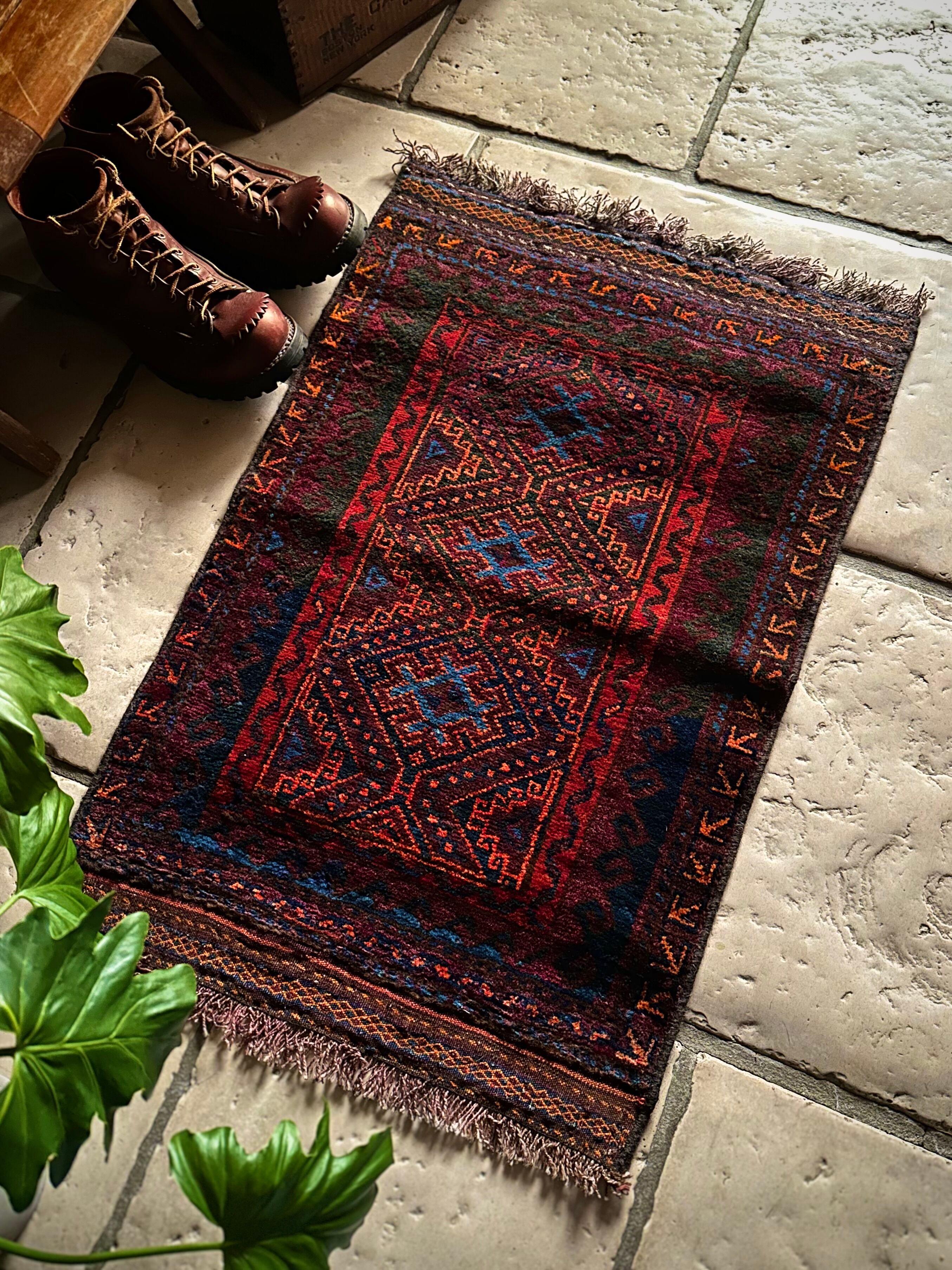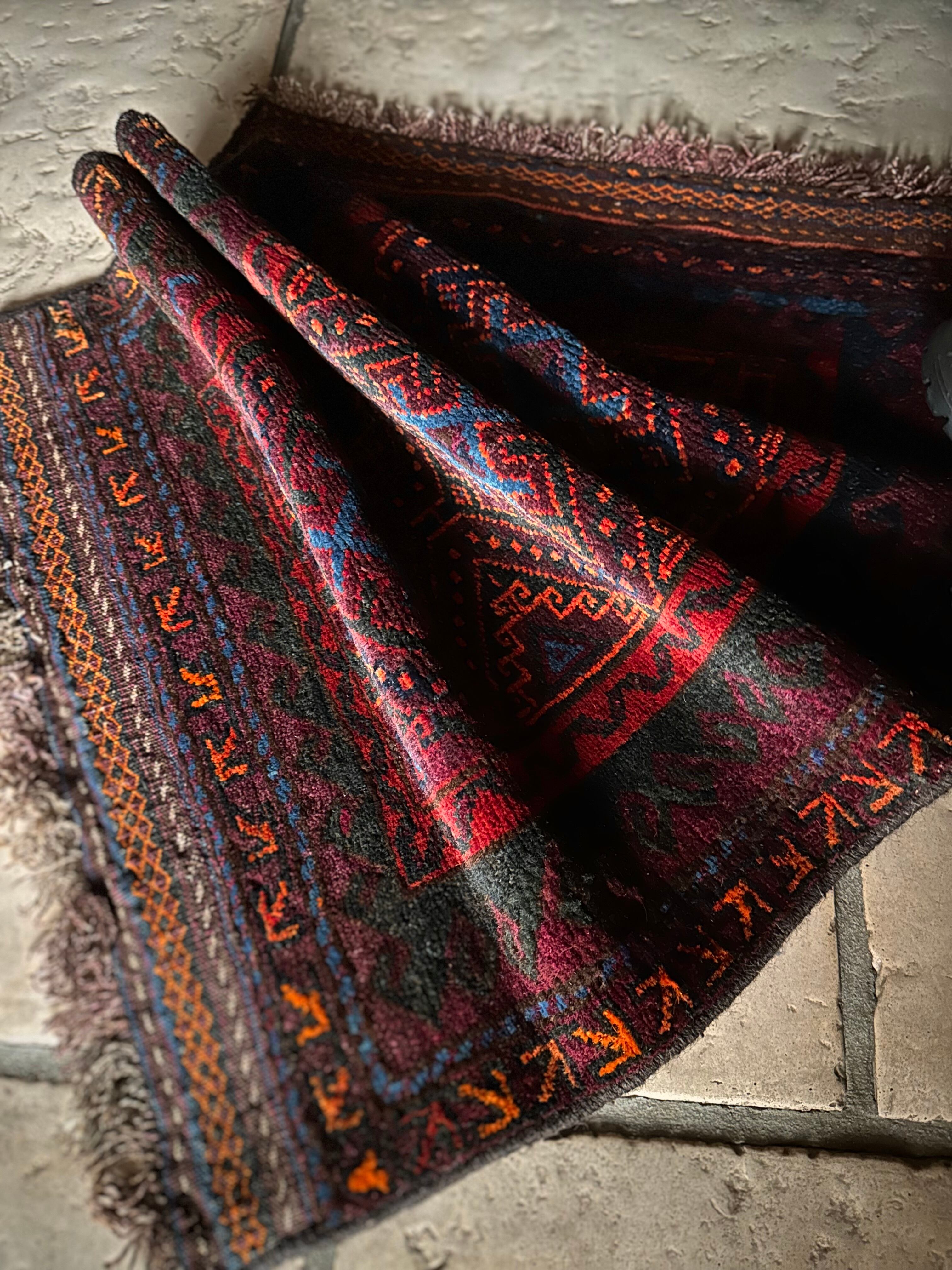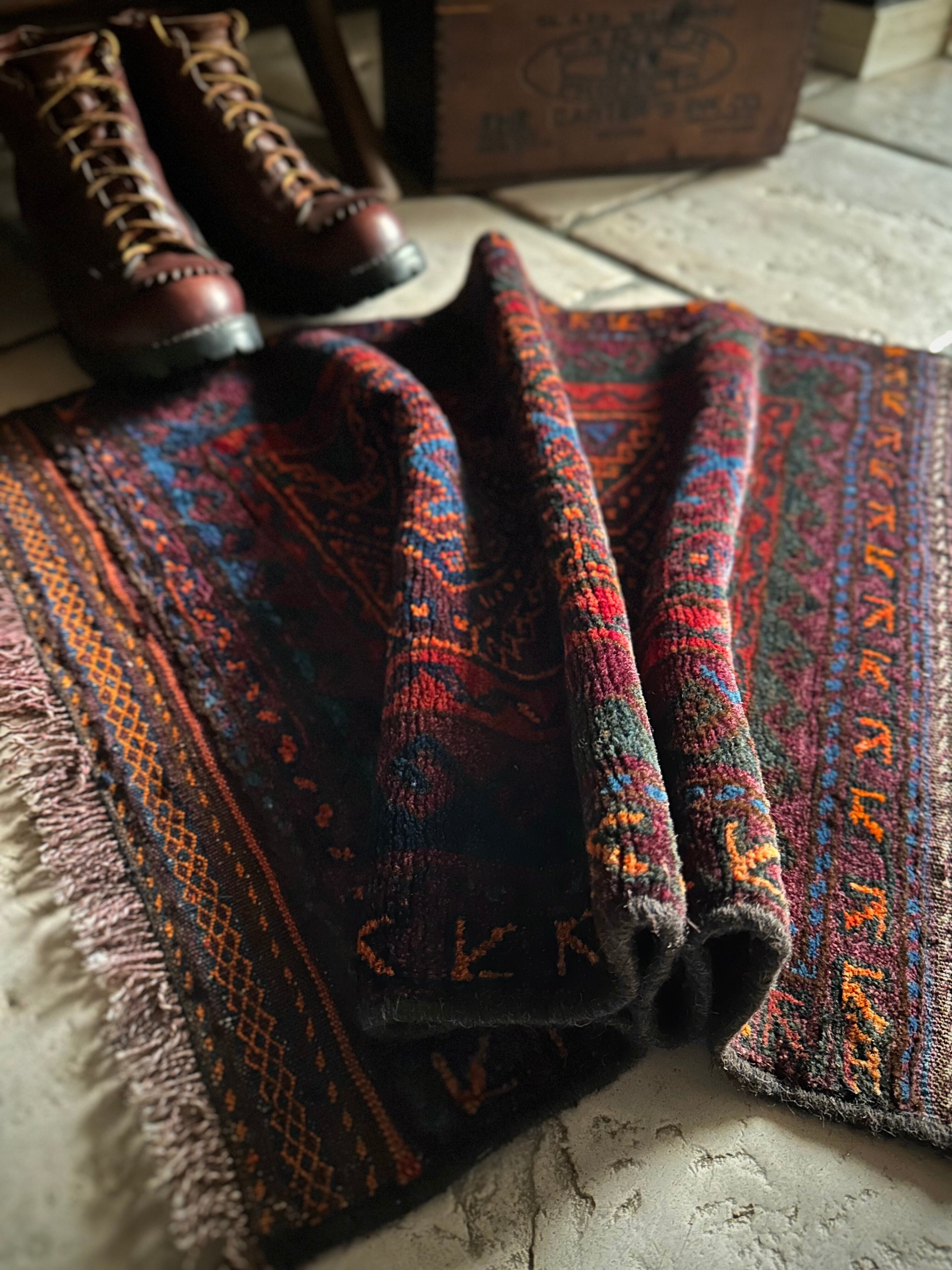 ダークなブラックとバーガンディをベースとしながらも、オレンジとレッドのアクセントにより引き締まった感を出し、ポイントとしてあしらわれたブルーが最高にかっこいいヘラート産バルーチ族のトライバルラグで、元々は収納やクッションとして使われていたバーリシトと呼ばれる袋物の表皮をラグに仕立て直してもらったモノになります。