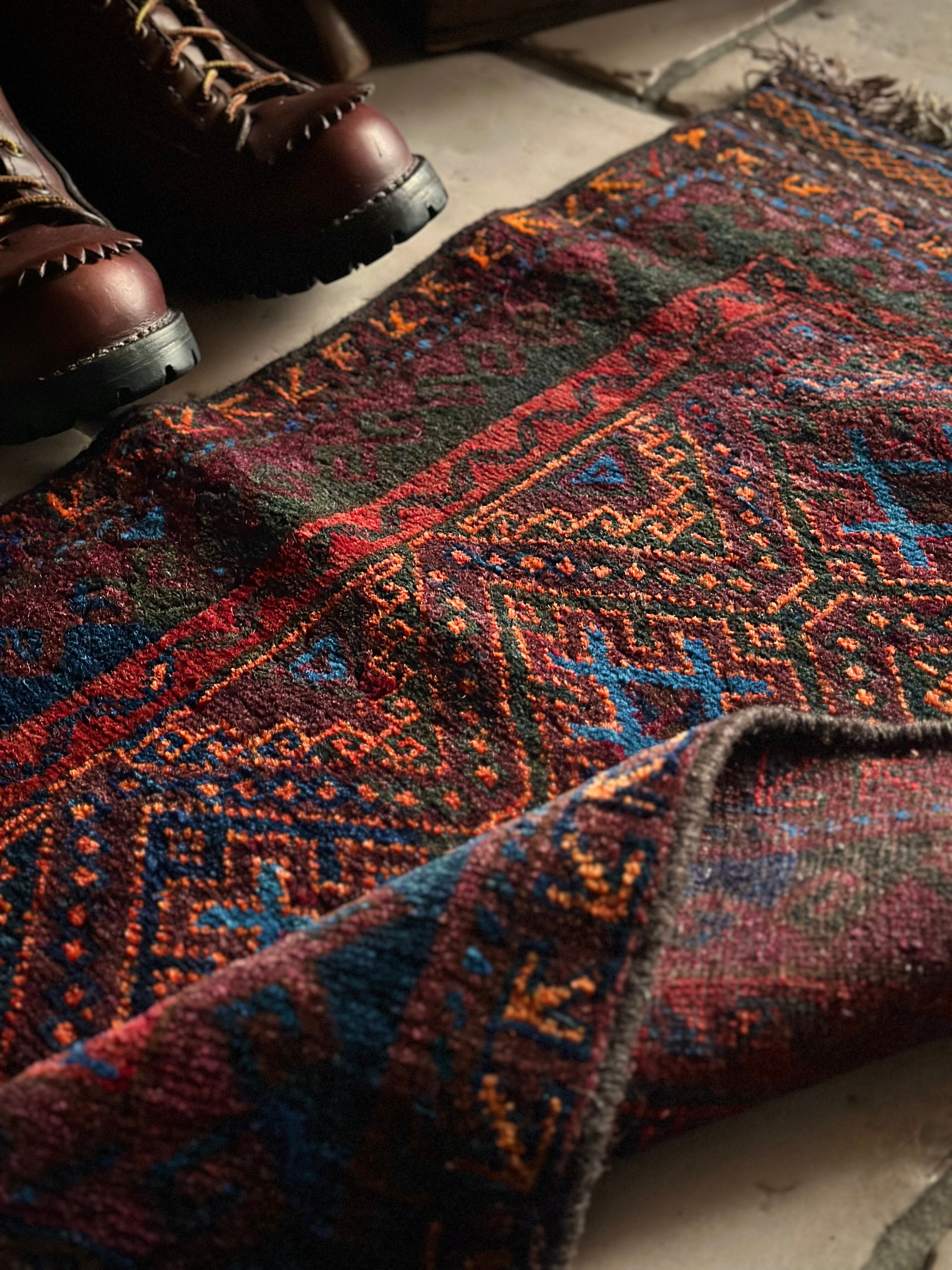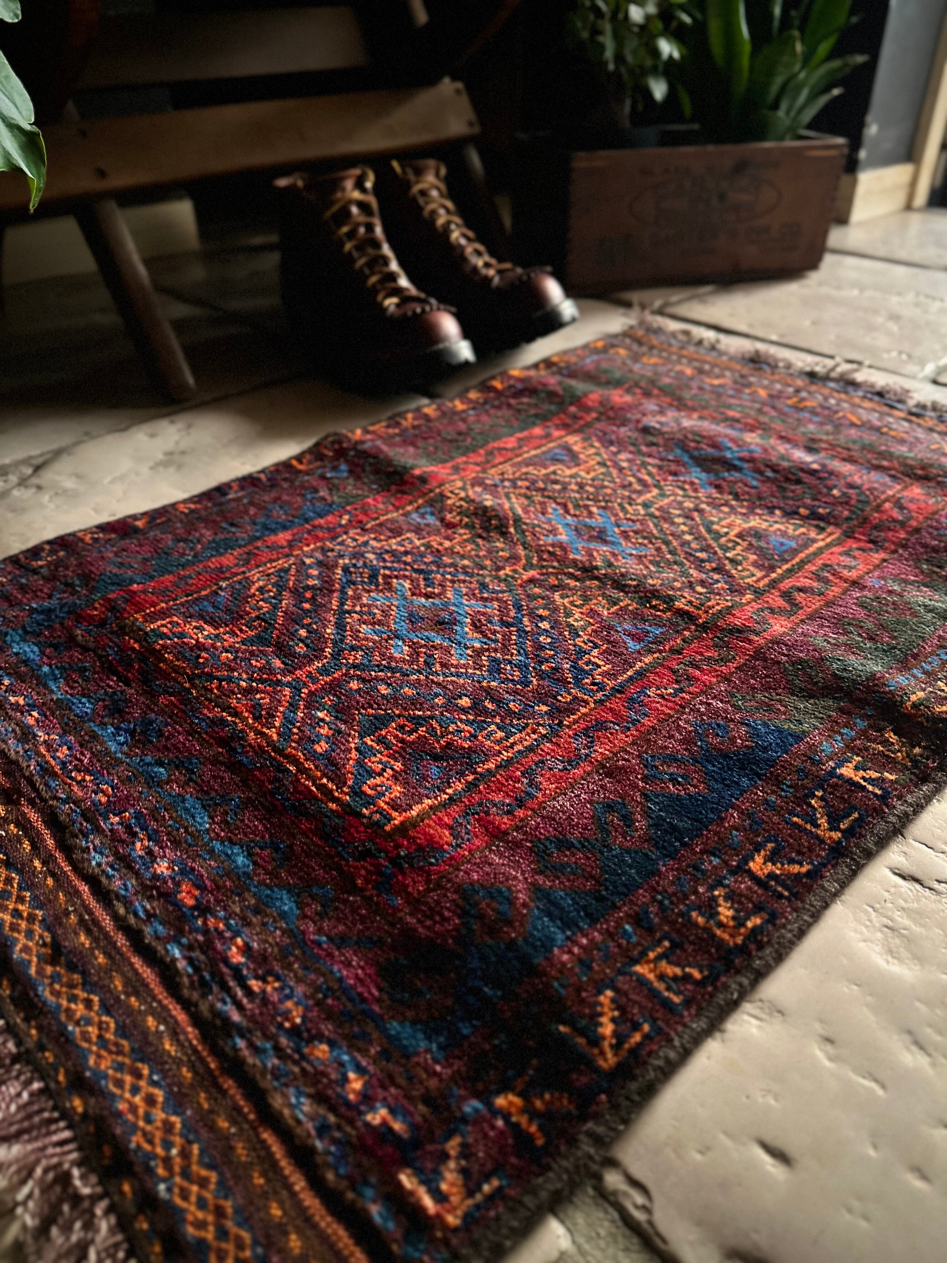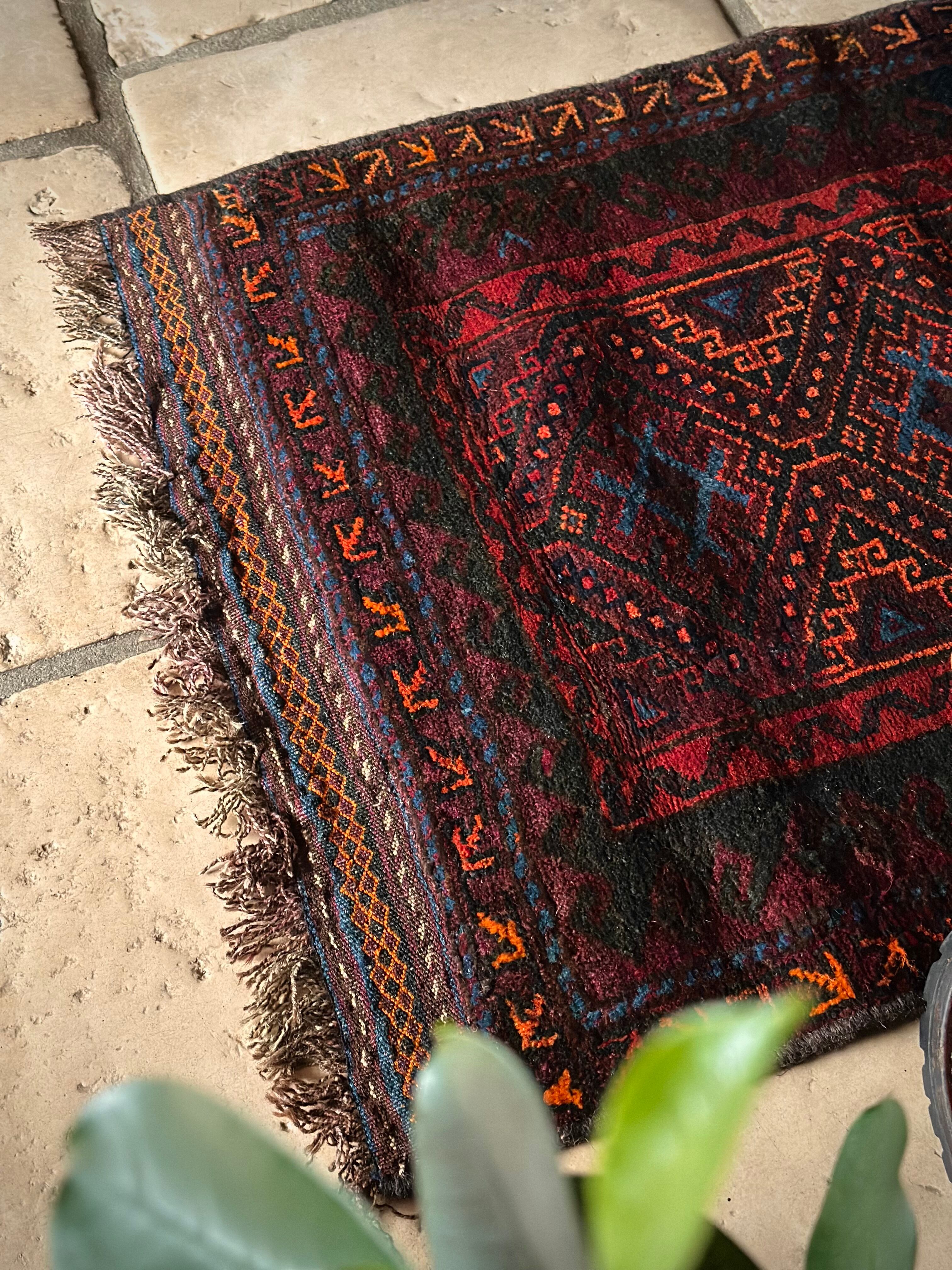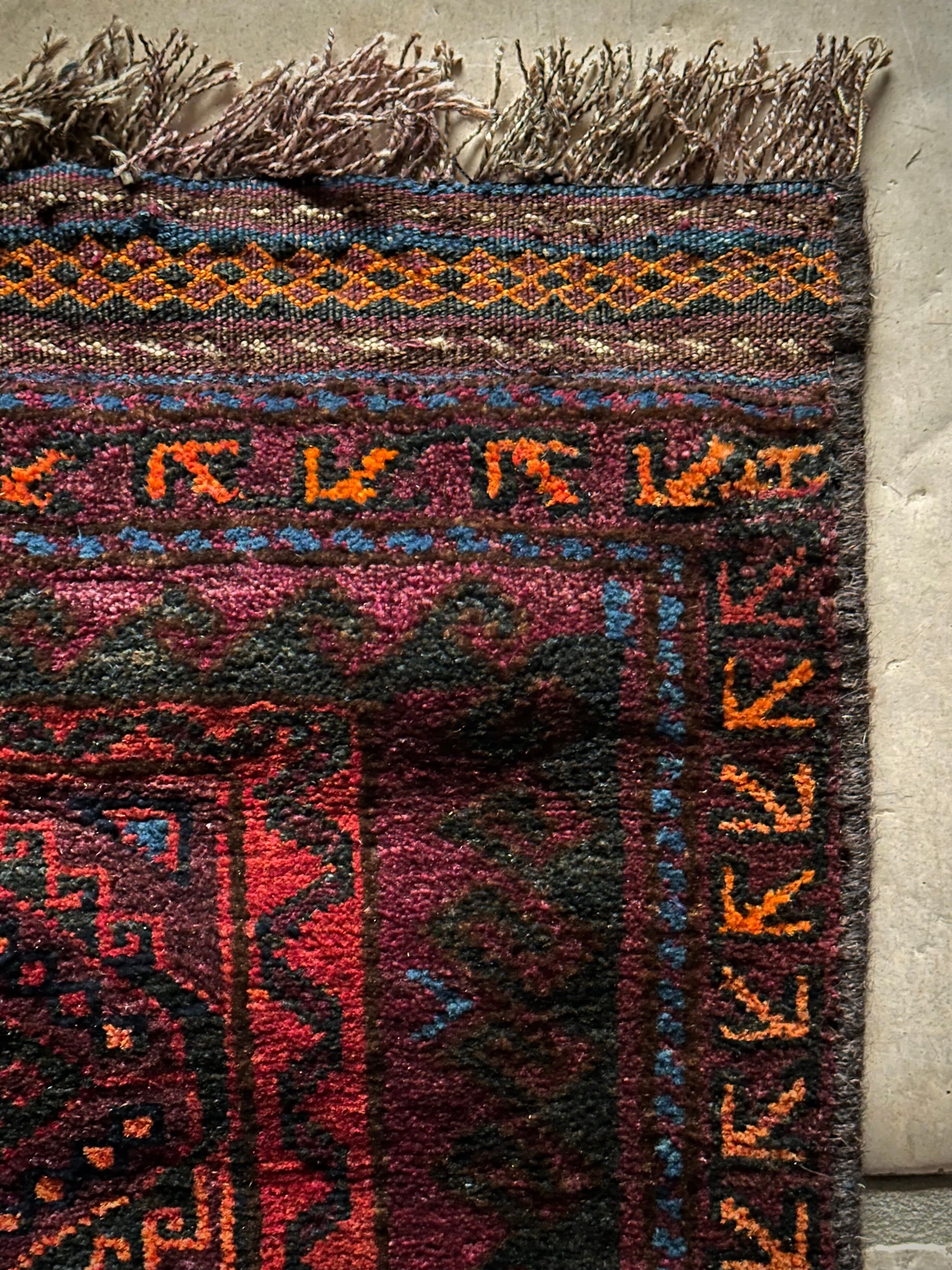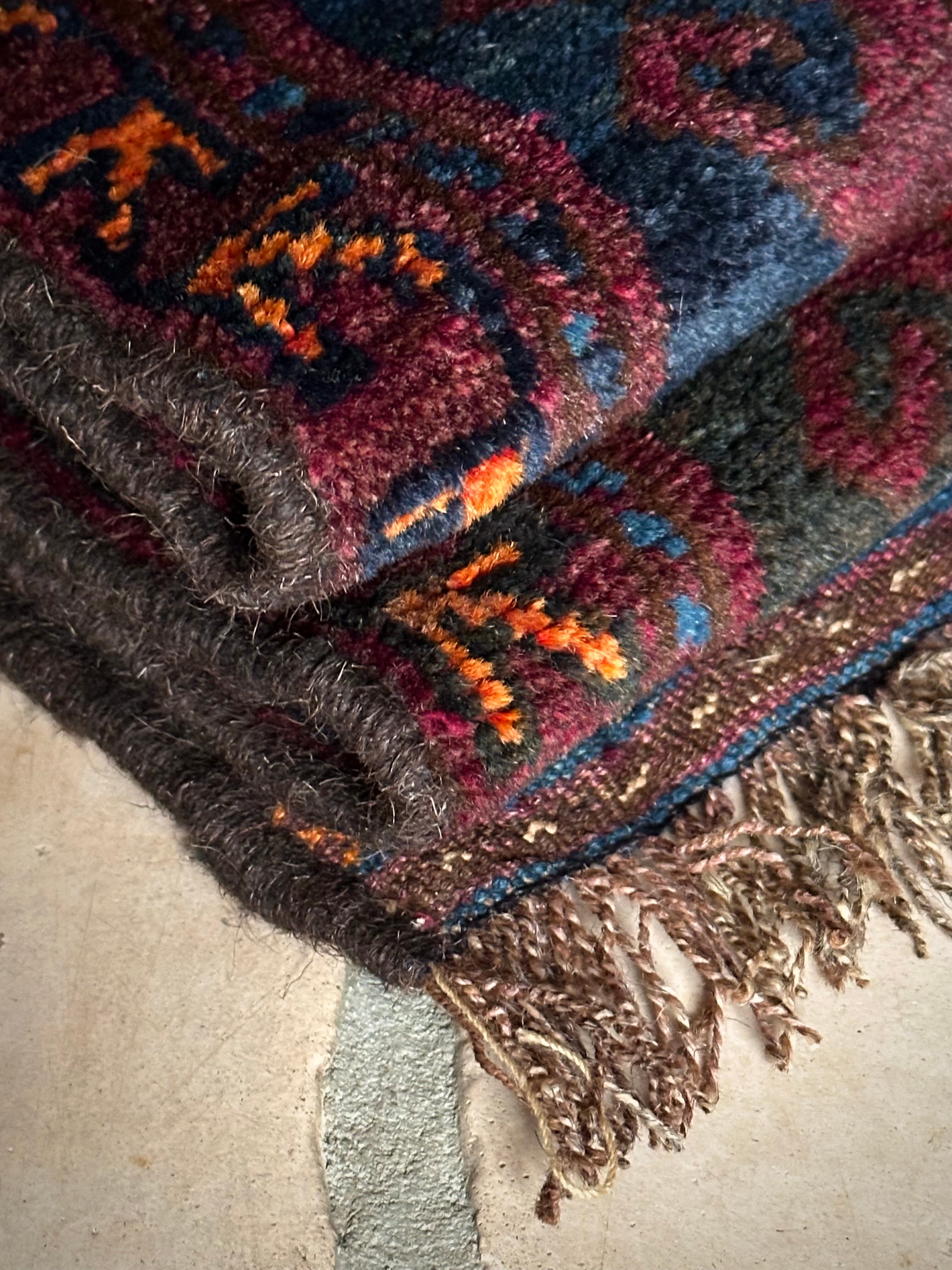 ダークなブラックとバーガンディをベースとしながらも、オレンジとレッドのアクセントにより引き締まった感を出し、ポイントとしてあしらわれたブルーが最高にかっこいいヘラート産バルーチ族のトライバルラグで、元々は収納やクッションとして使われていたバーリシトと呼ばれる袋物の表皮をラグに仕立て直してもらったモノになります。