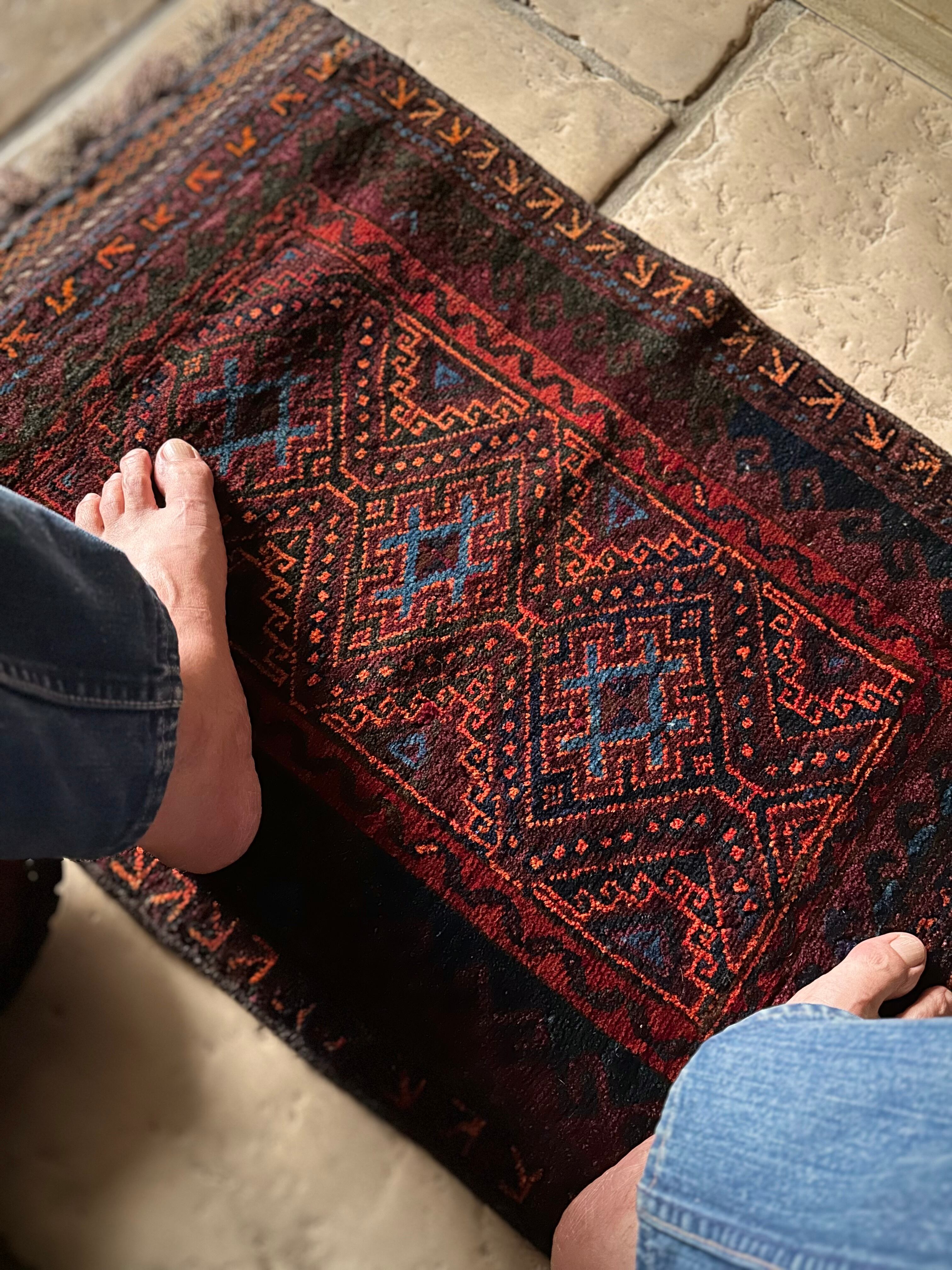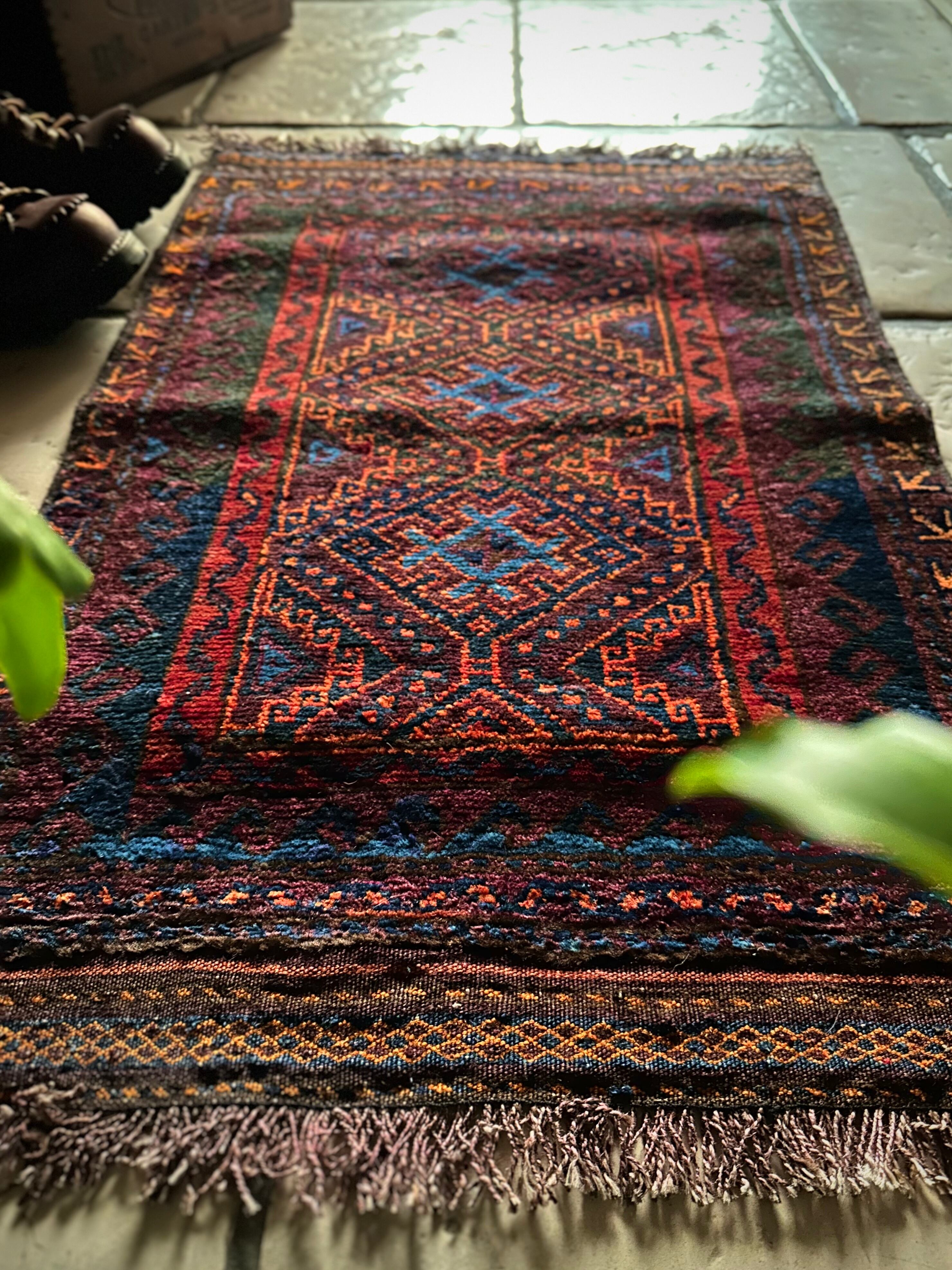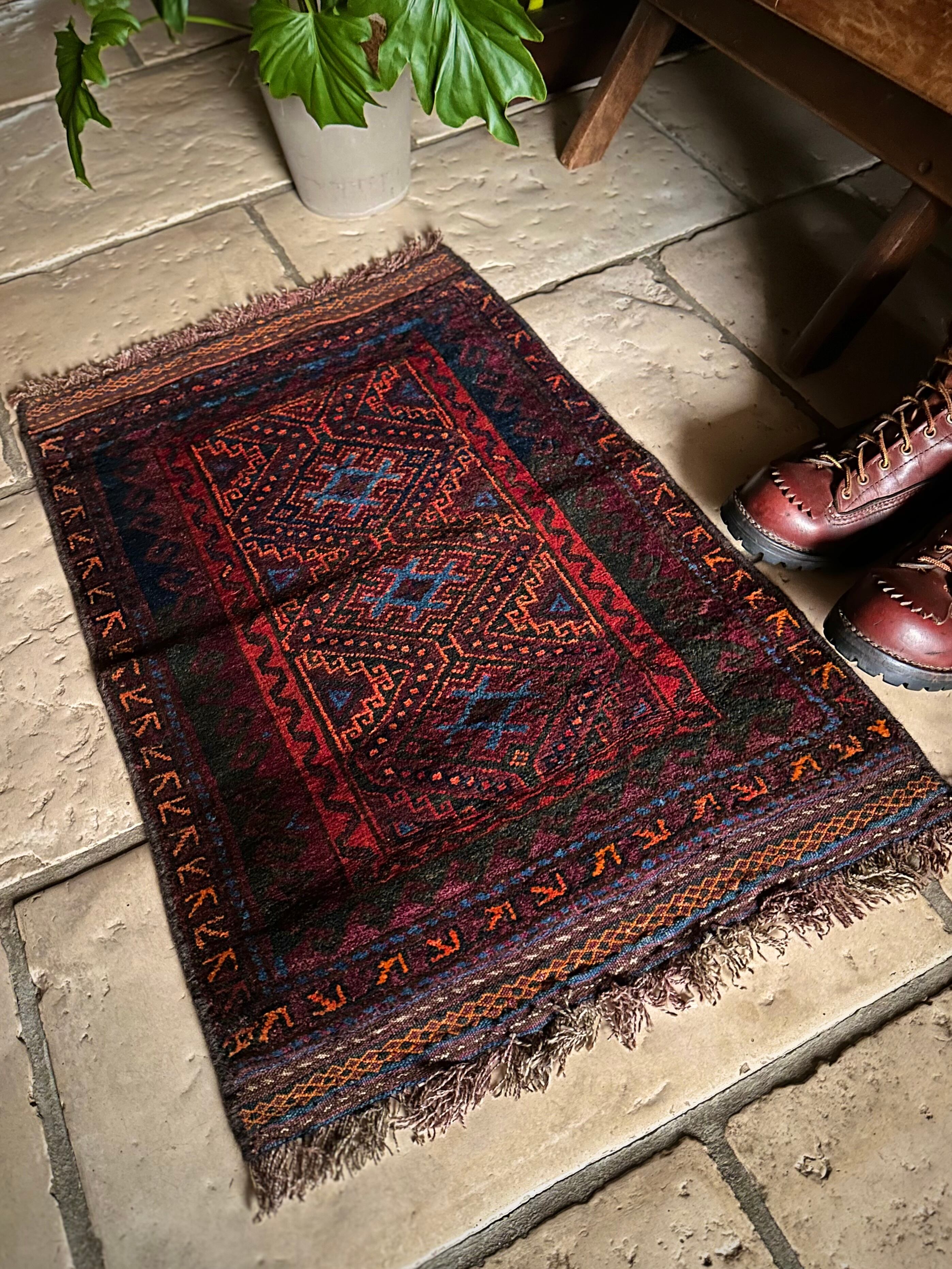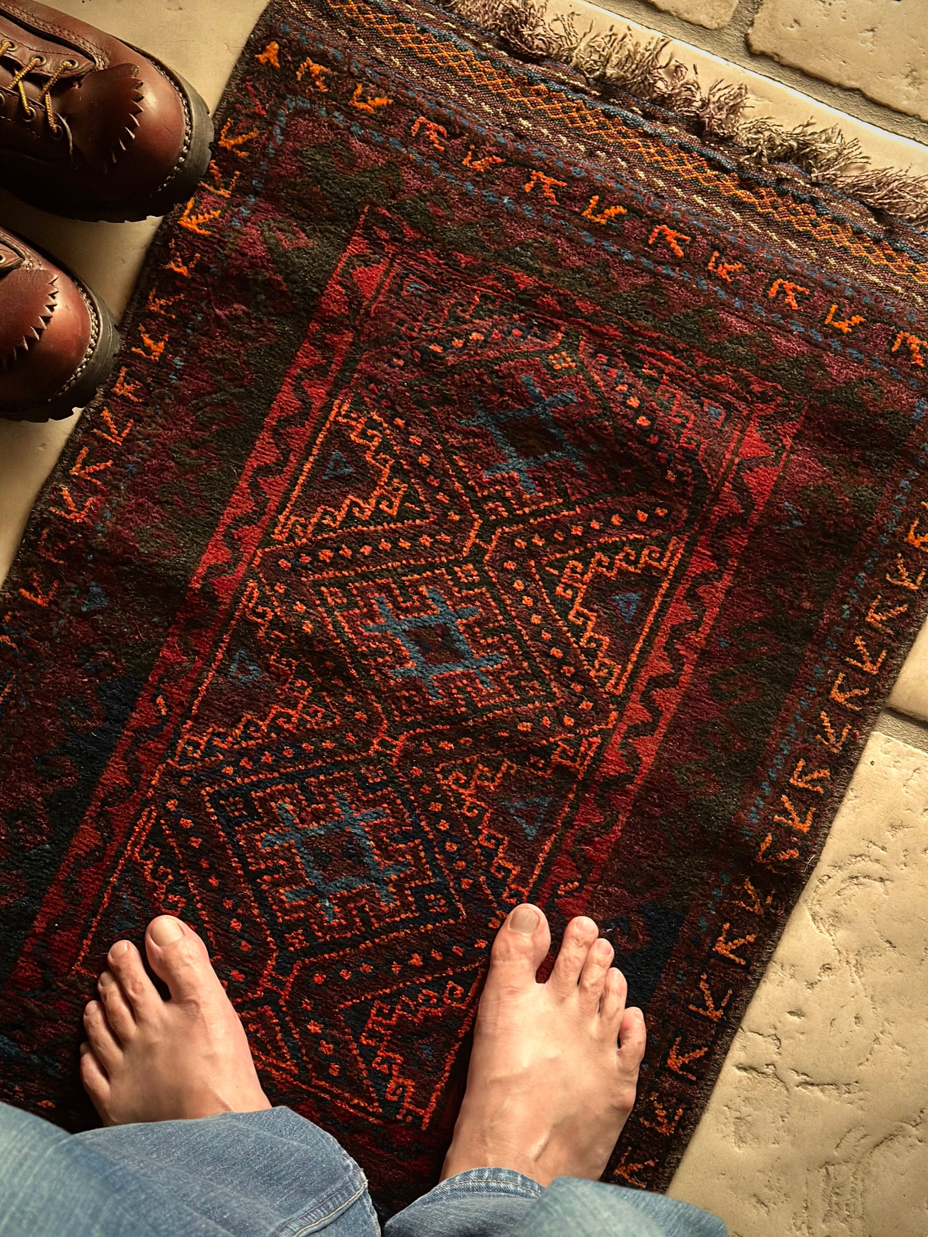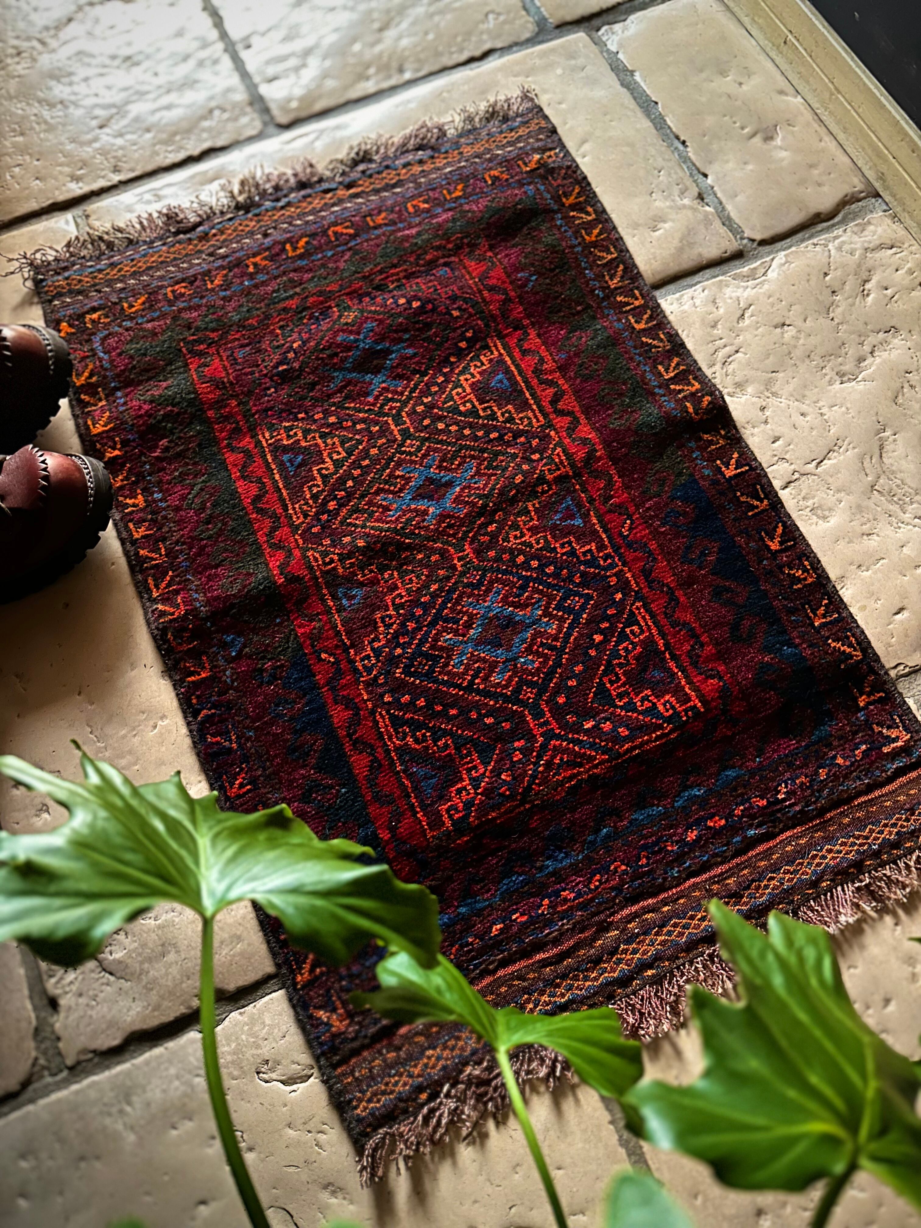 ダークなブラックとバーガンディをベースとしながらも、オレンジとレッドのアクセントにより引き締まった感を出し、ポイントとしてあしらわれたブルーが最高にかっこいいヘラート産バルーチ族のトライバルラグで、元々は収納やクッションとして使われていたバーリシトと呼ばれる袋物の表皮をラグに仕立て直してもらったモノになります。