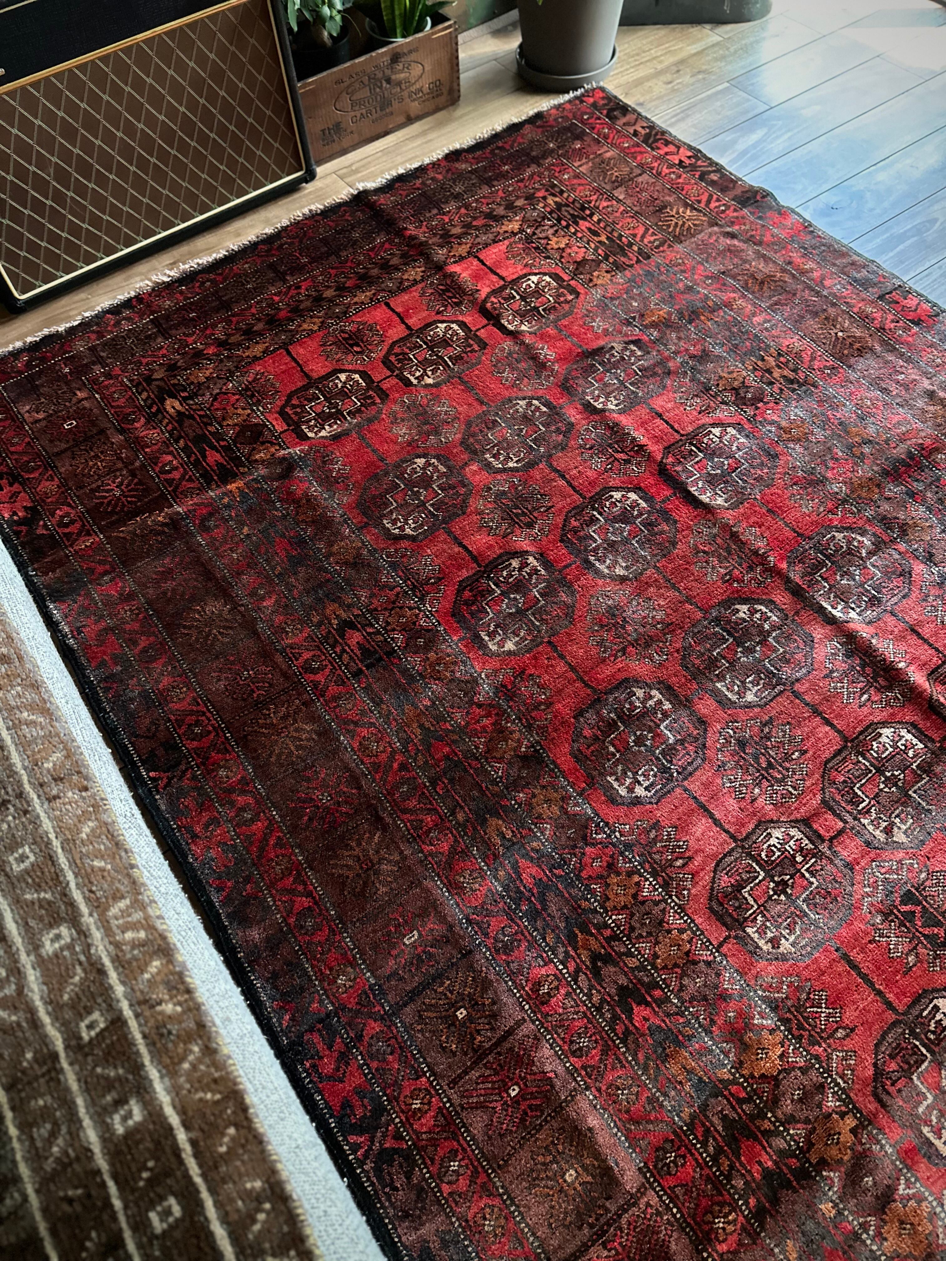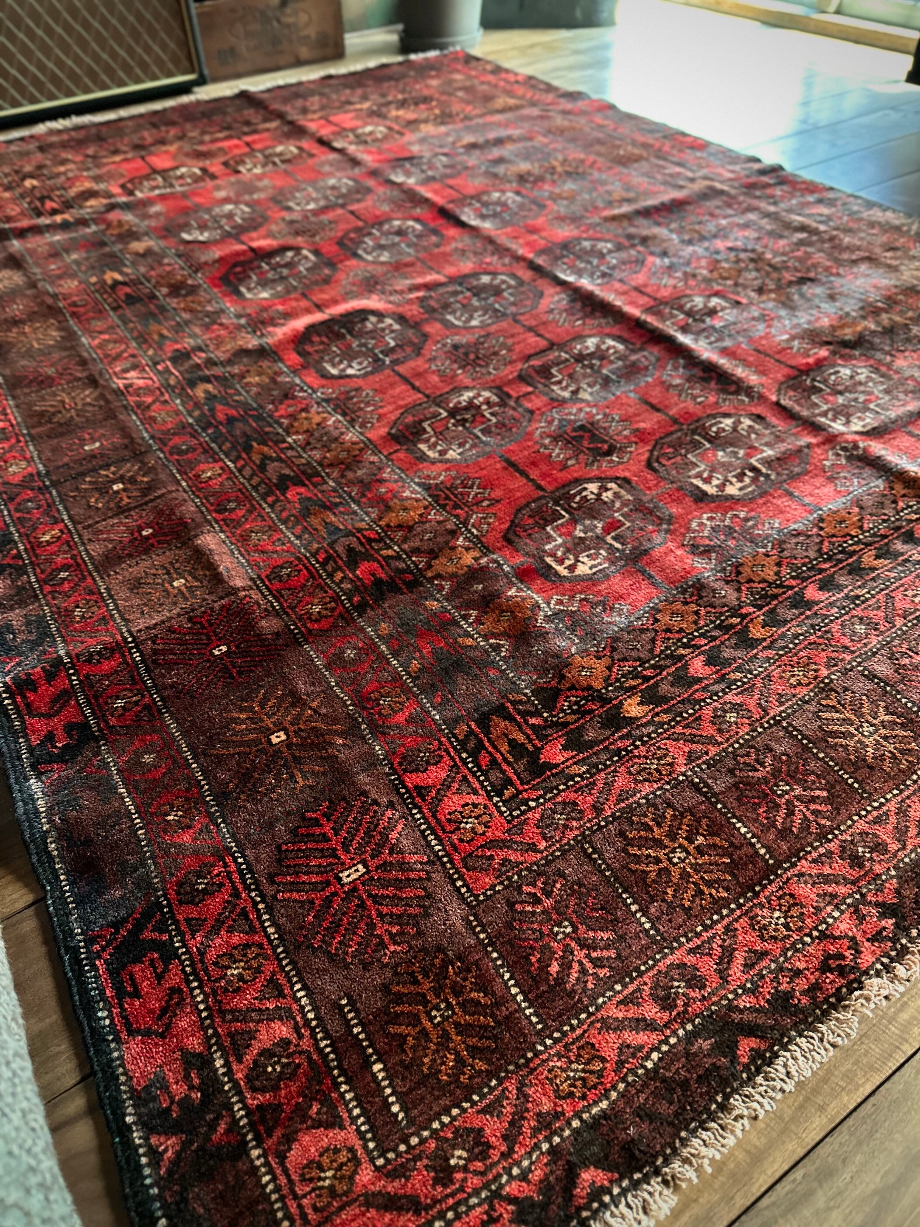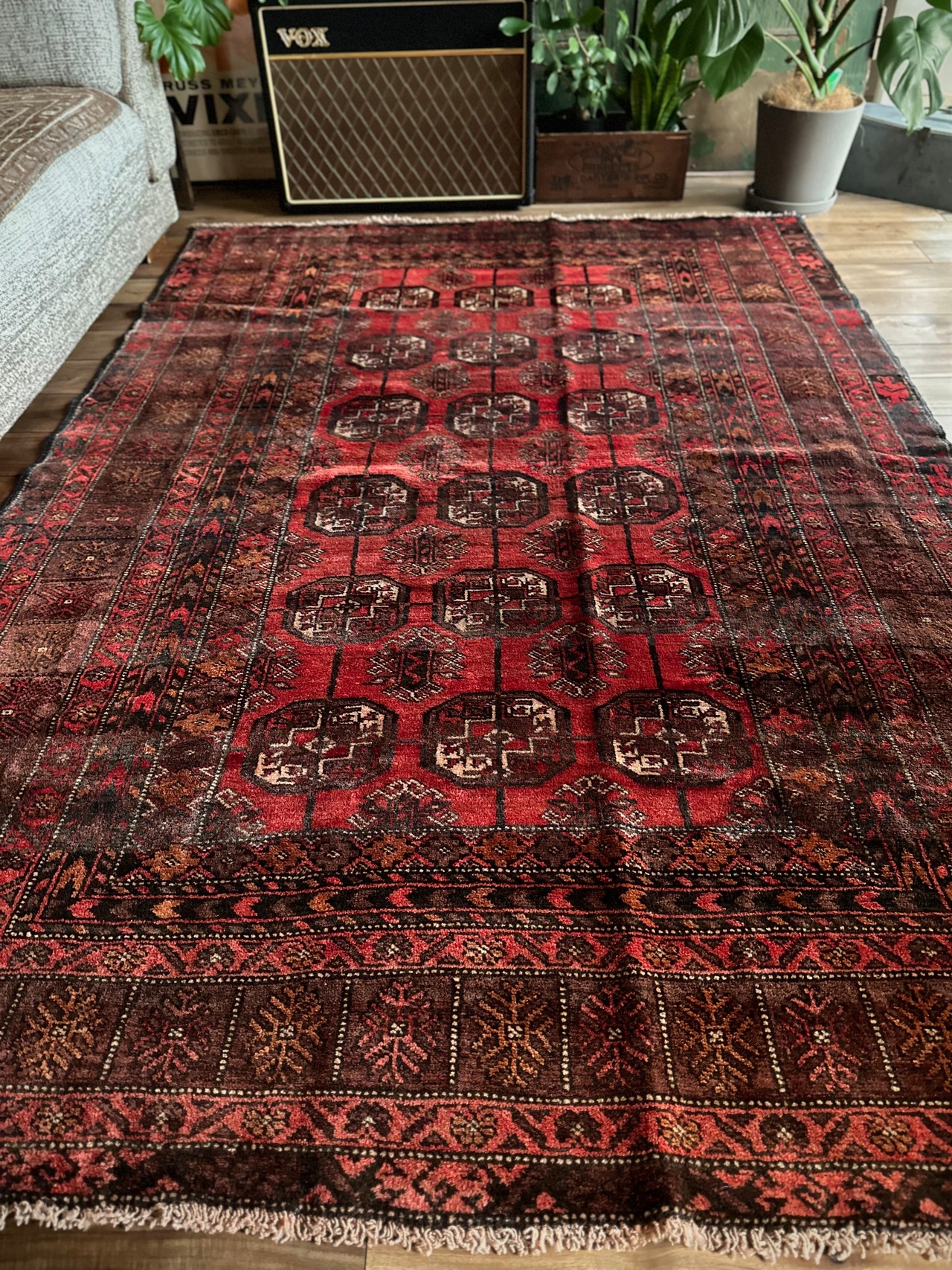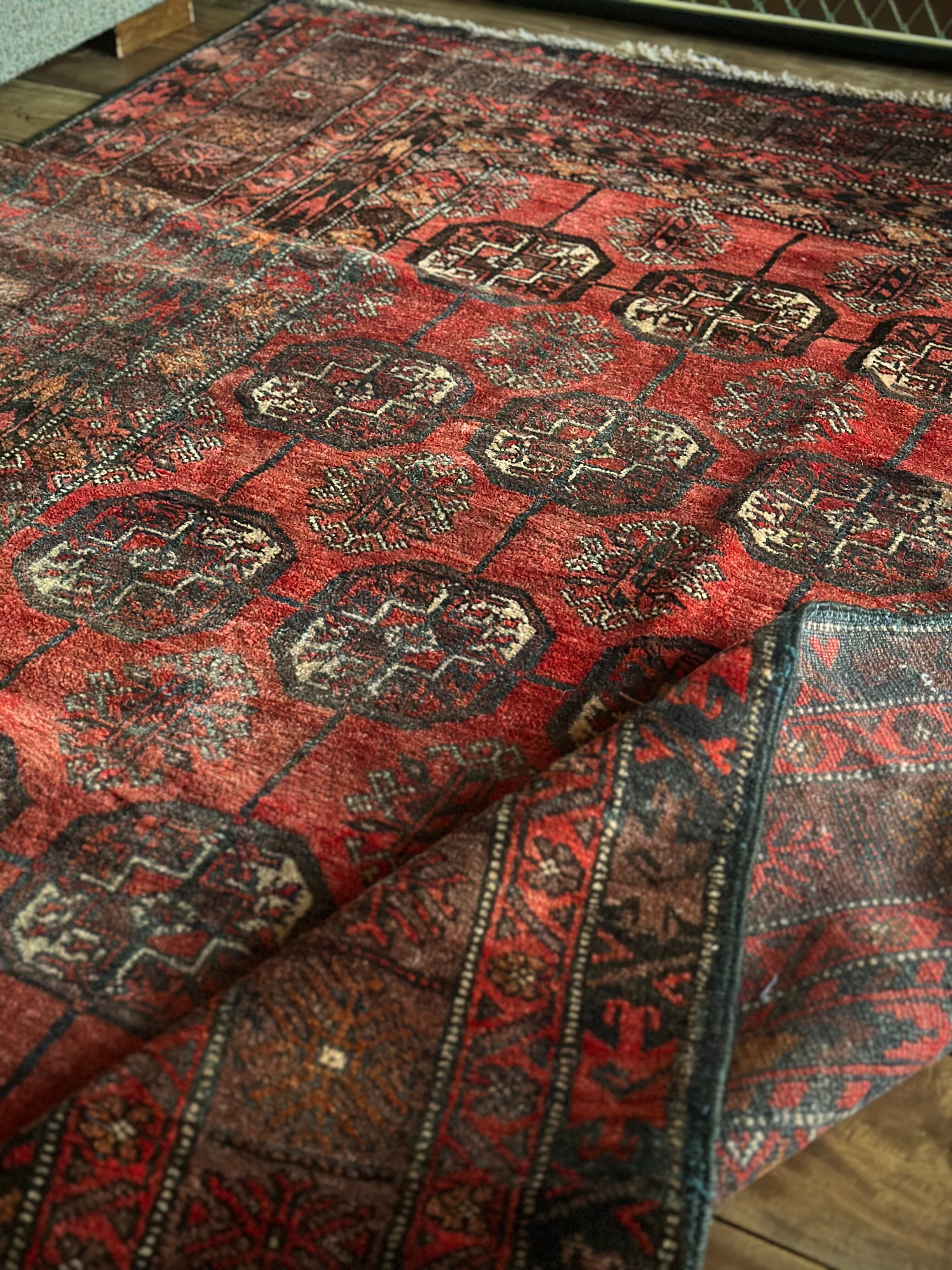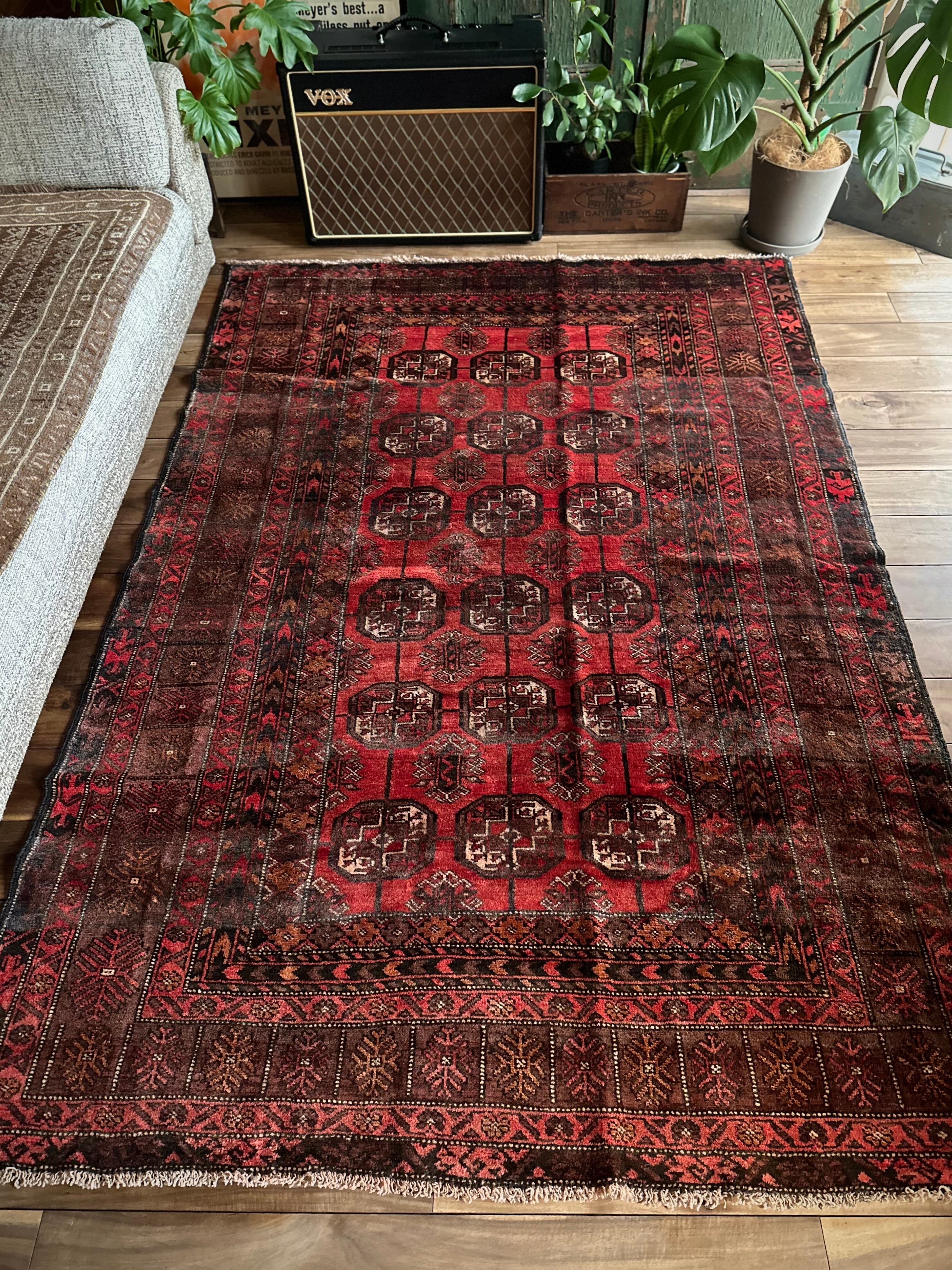 かなり年季の入った真紅の大判サイズが目を引く絨毯で、何層にも連なったミルフィーユ状のボーダーにテッケギュルが並んだ、イラン北東部のマシュハド近郊に居住するバルーチ族のトライバルラグになります。
