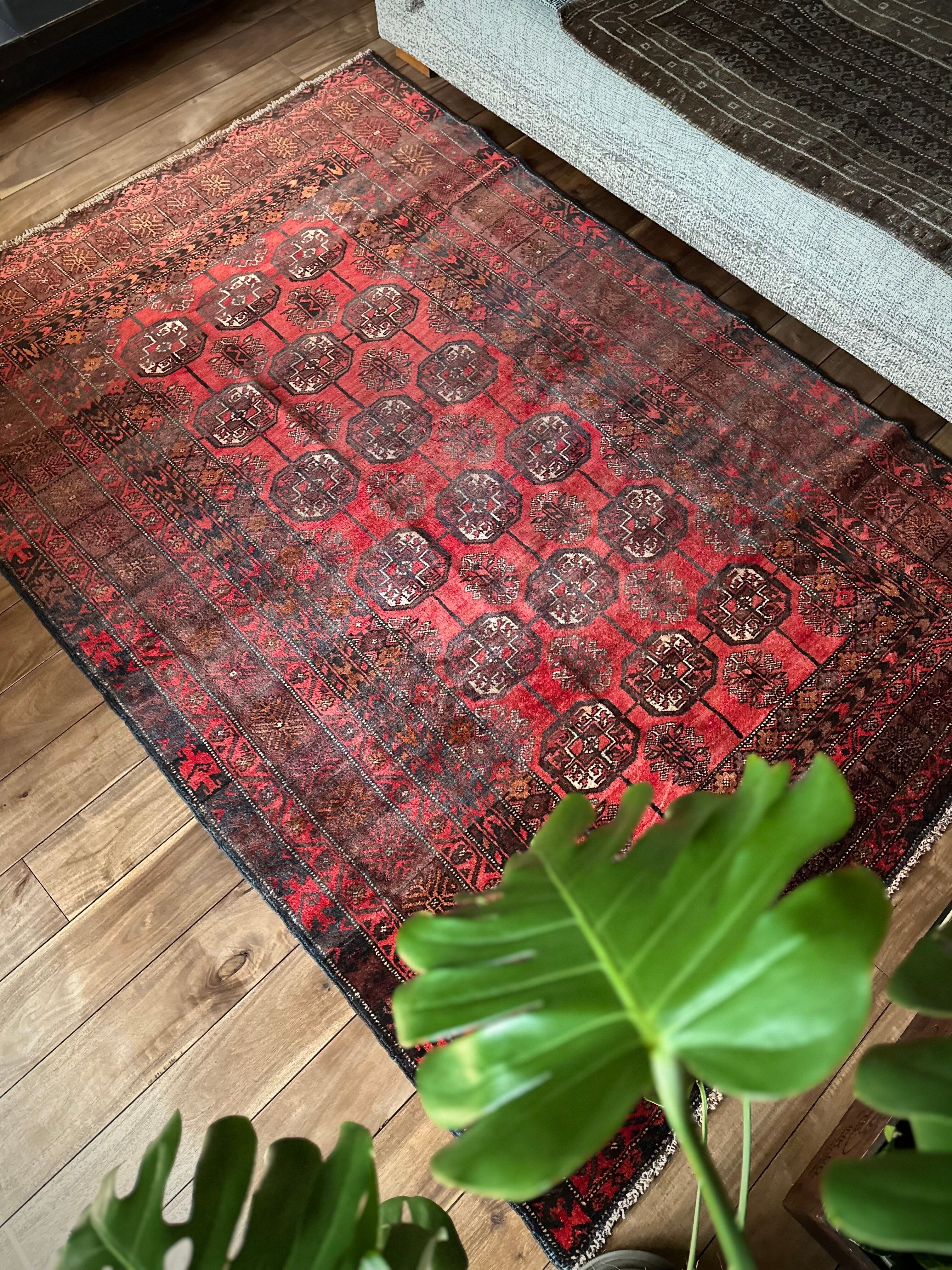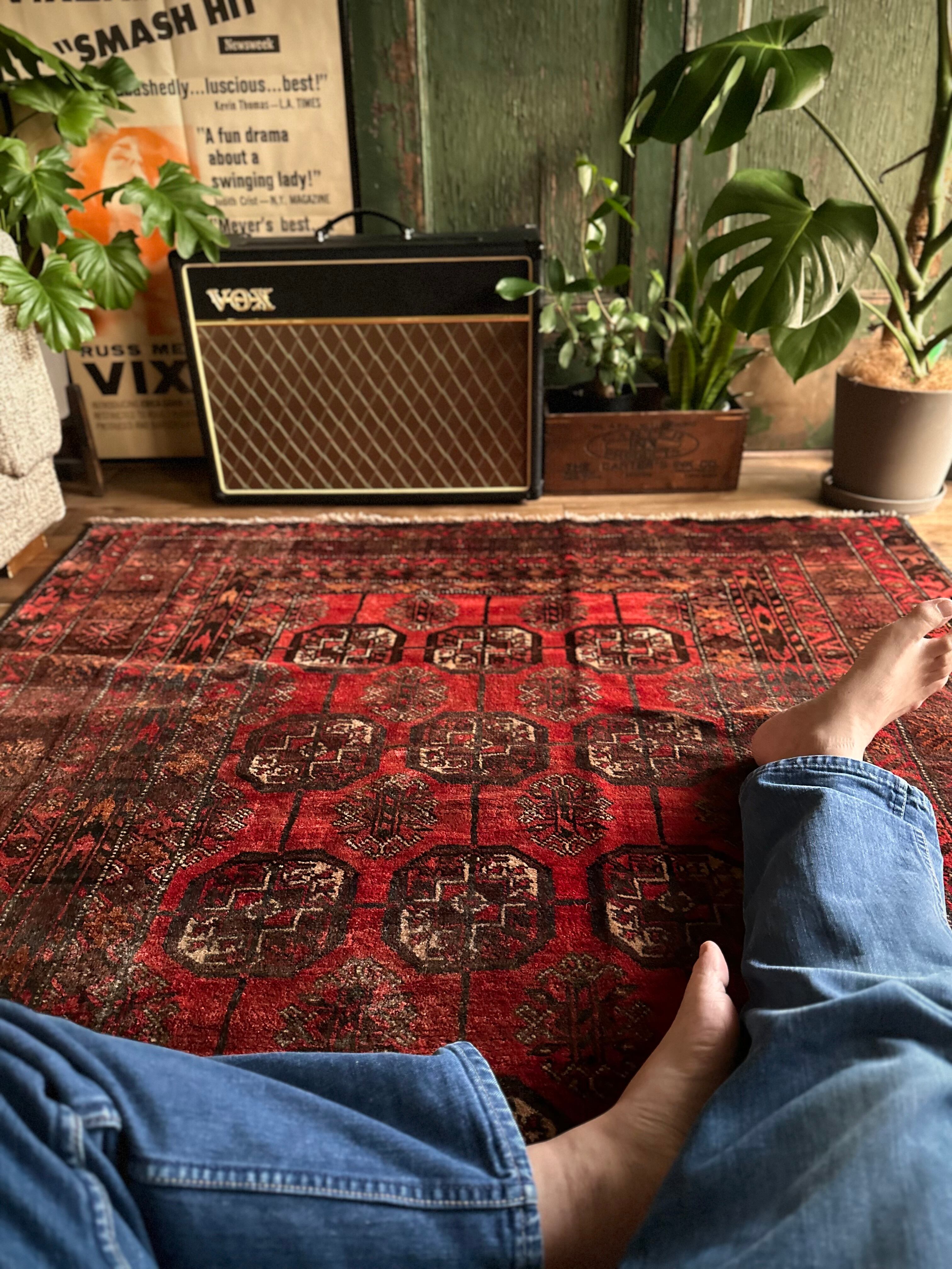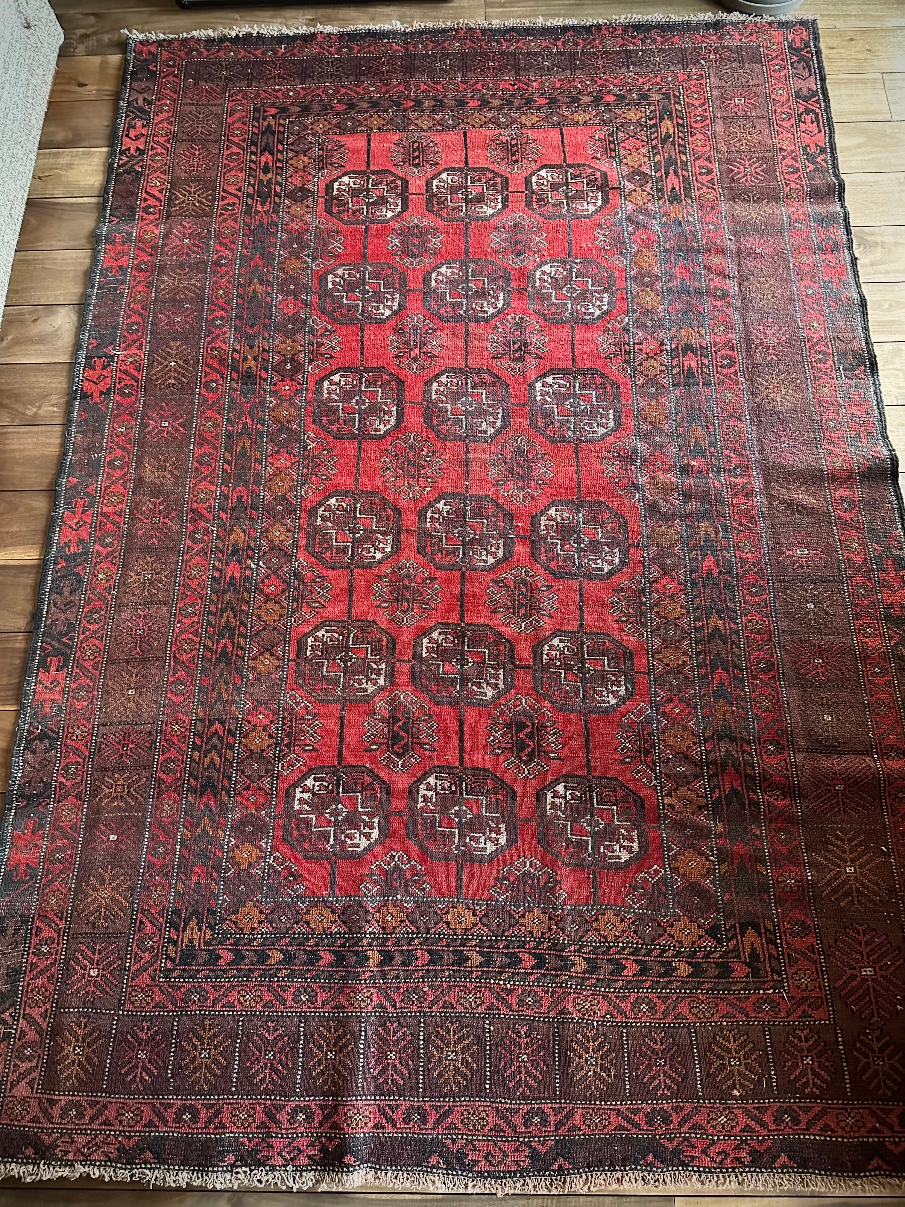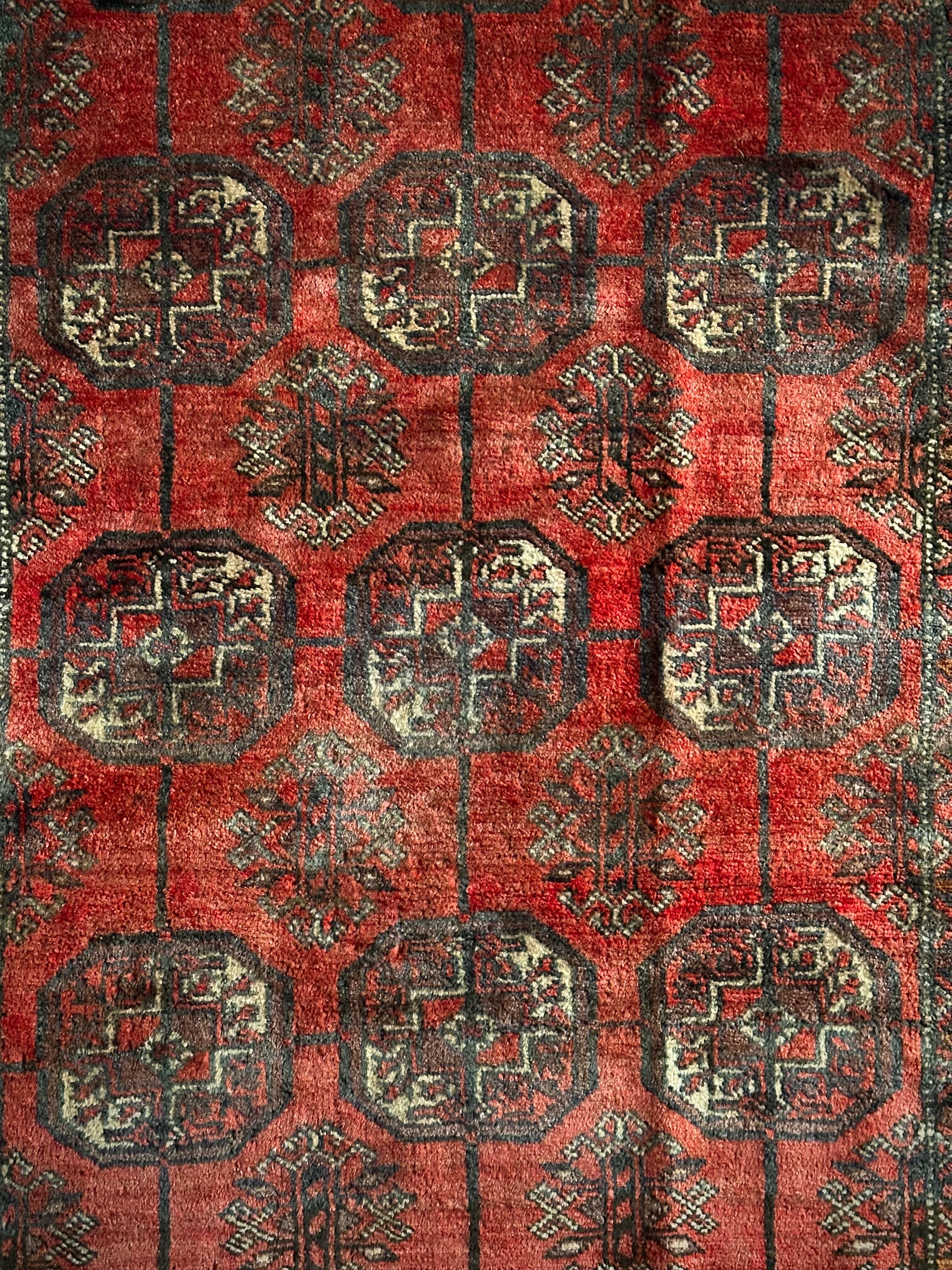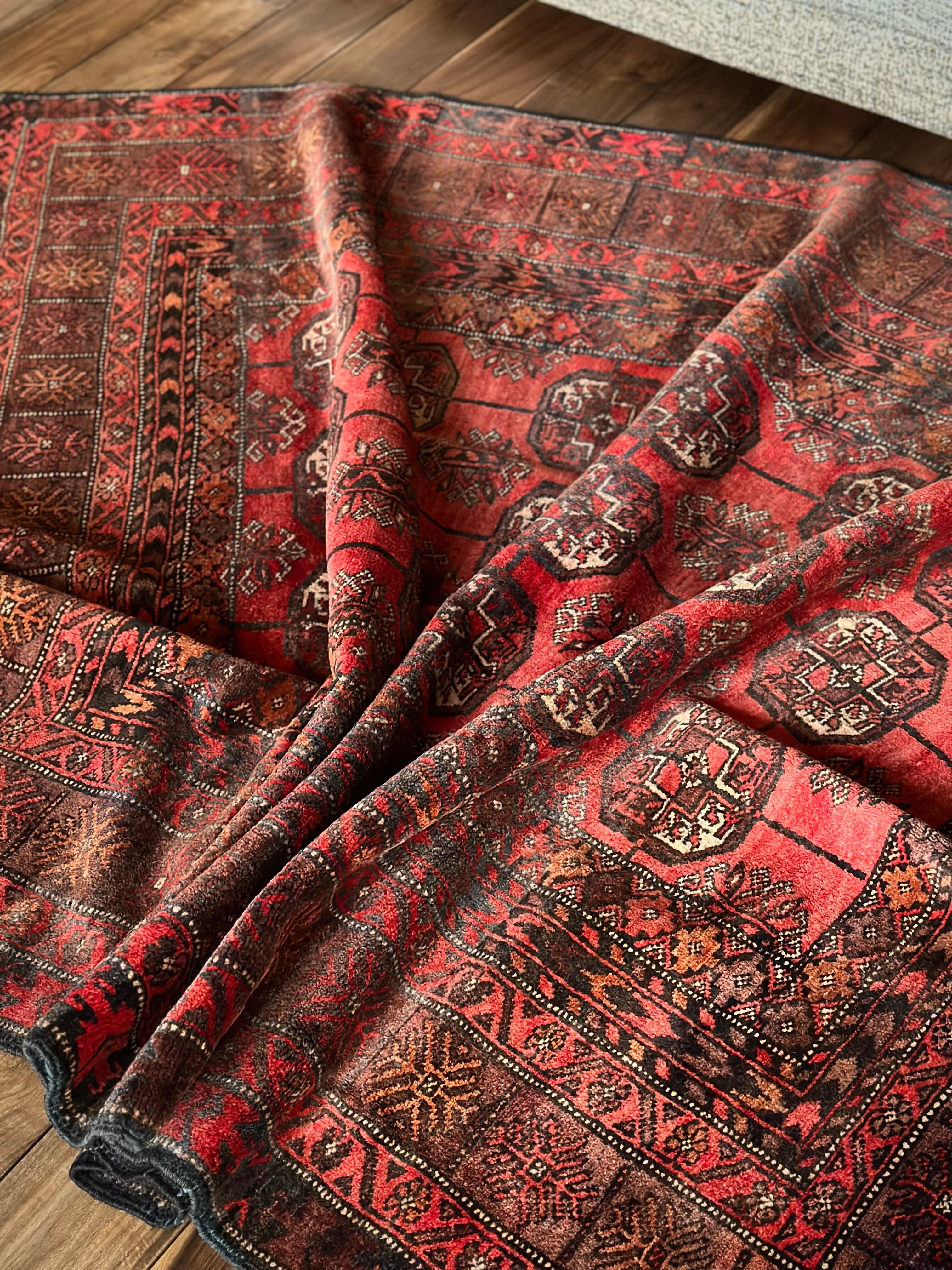かなり年季の入った真紅の大判サイズが目を引く絨毯で、何層にも連なったミルフィーユ状のボーダーにテッケギュルが並んだ、イラン北東部のマシュハド近郊に居住するバルーチ族のトライバルラグになります。