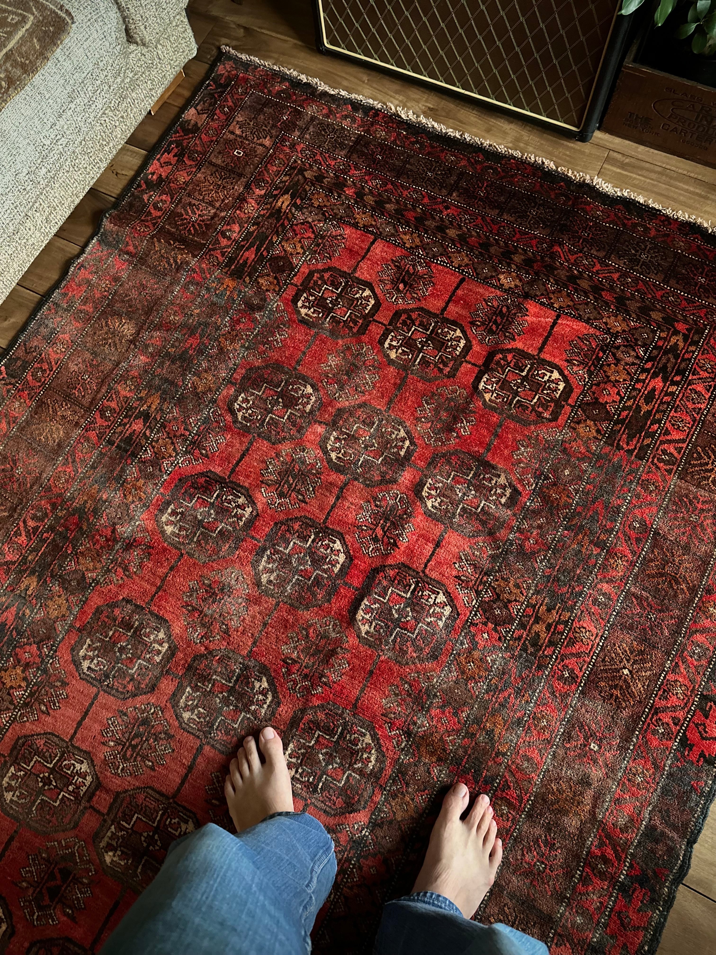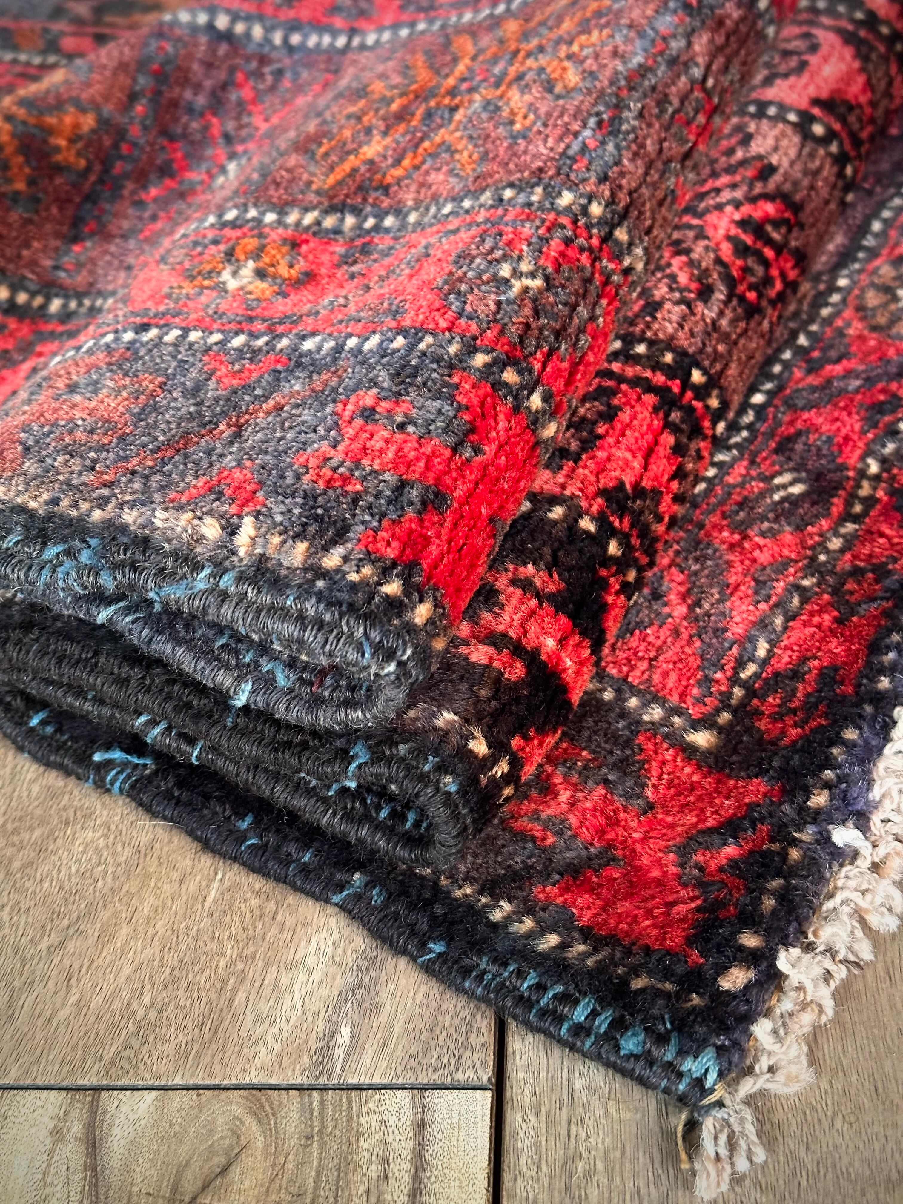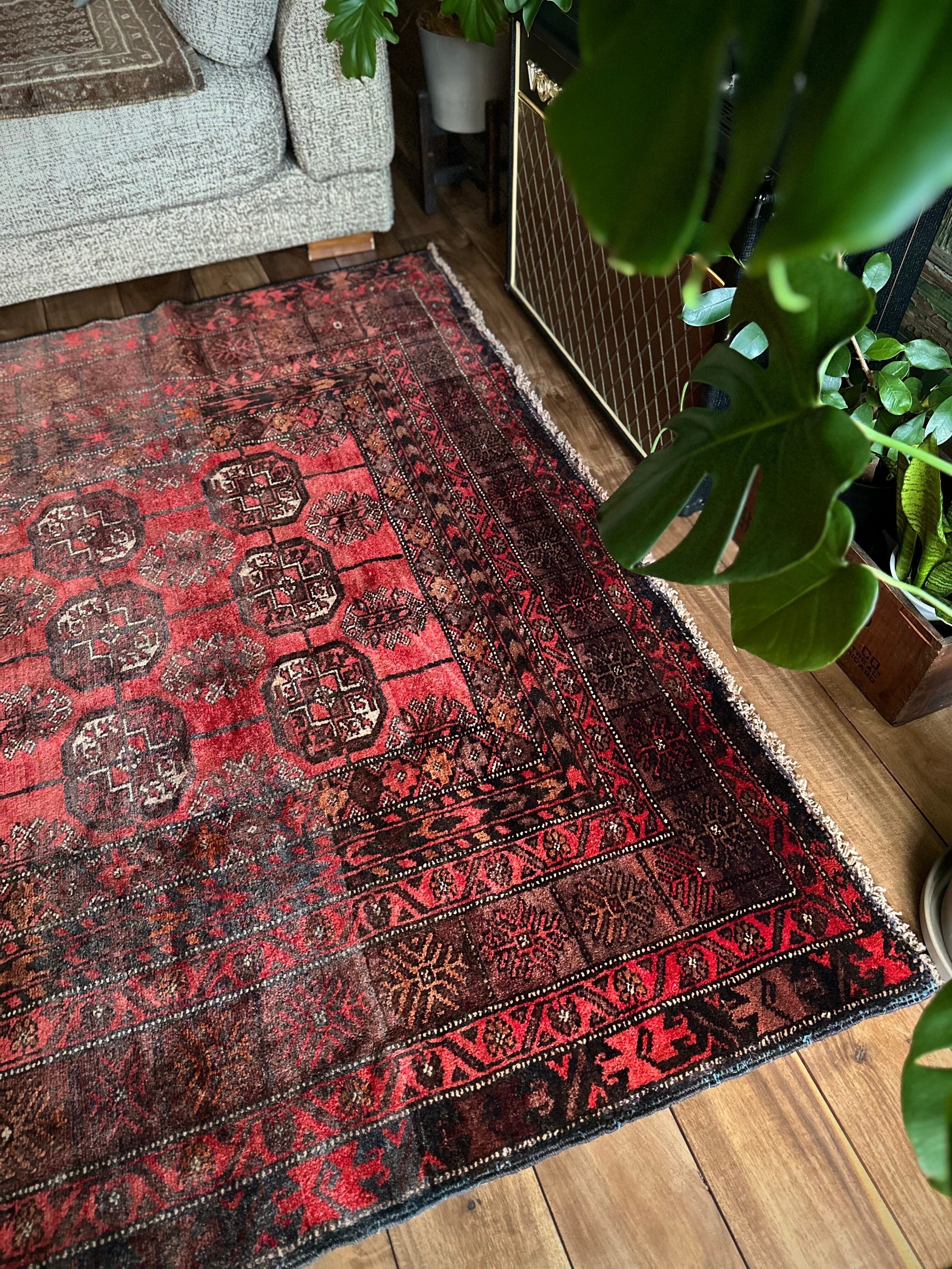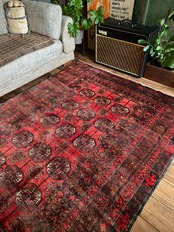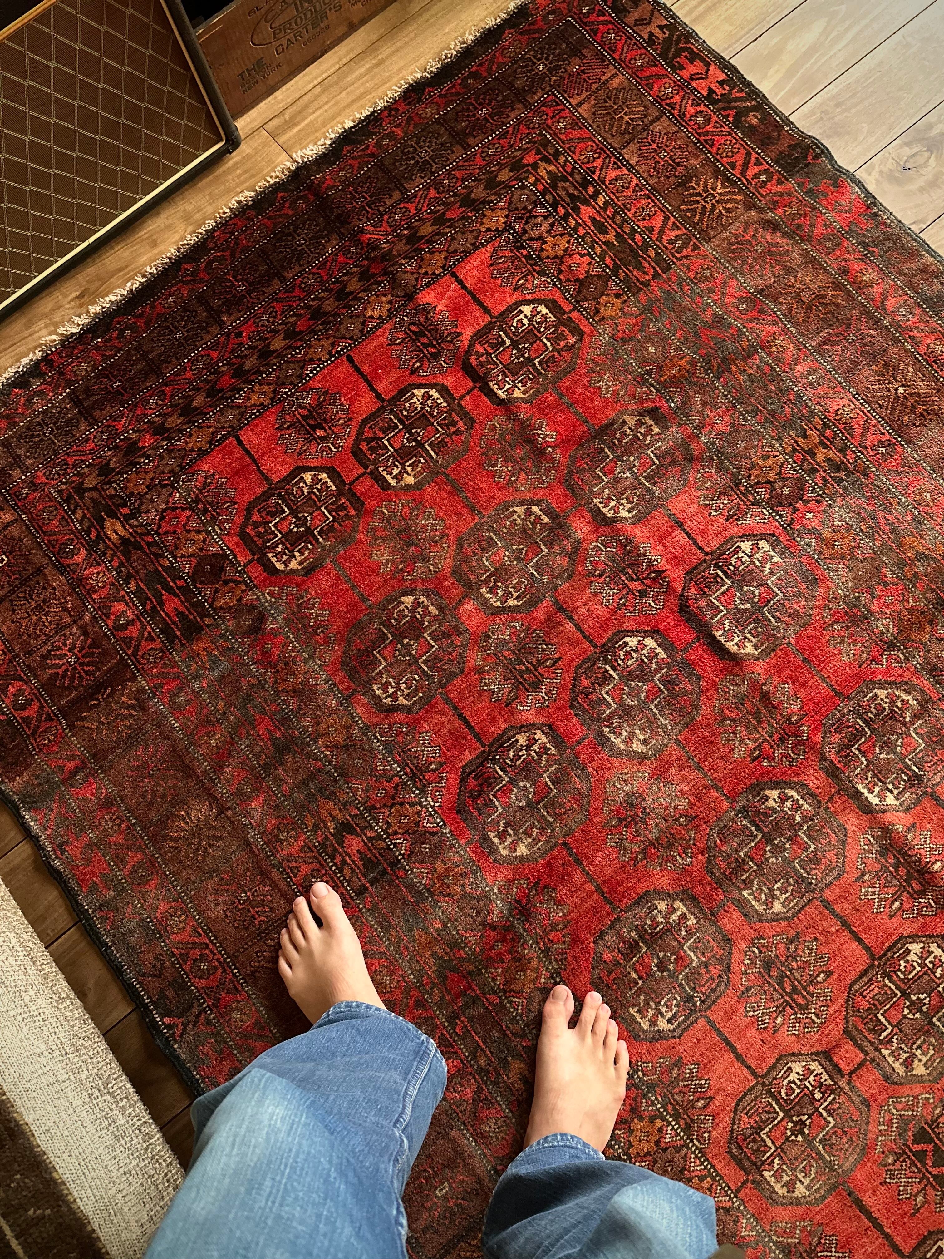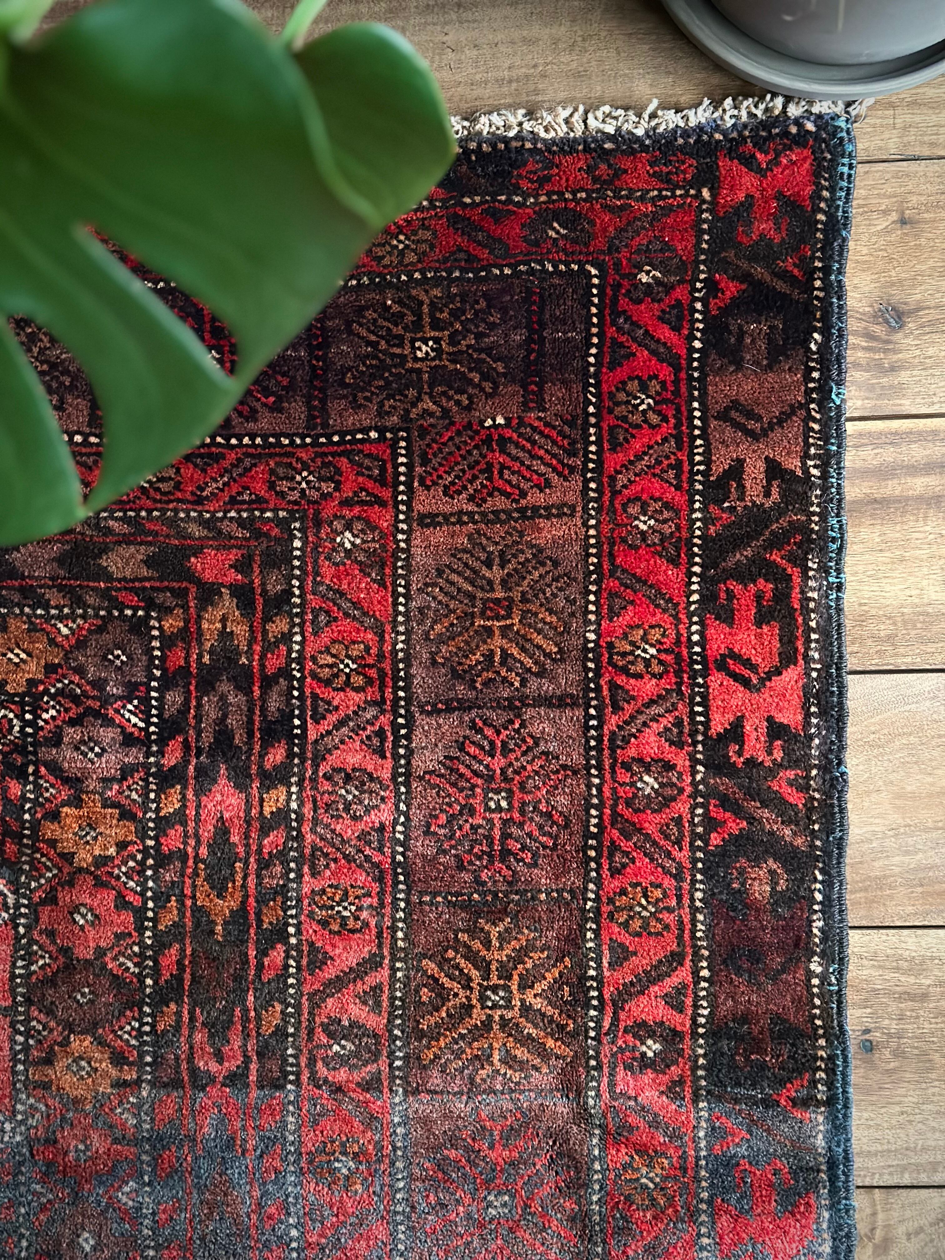 かなり年季の入った真紅の大判サイズが目を引く絨毯で、何層にも連なったミルフィーユ状のボーダーにテッケギュルが並んだ、イラン北東部のマシュハド近郊に居住するバルーチ族のトライバルラグになります。