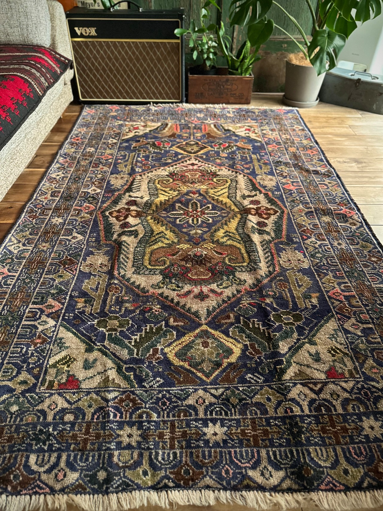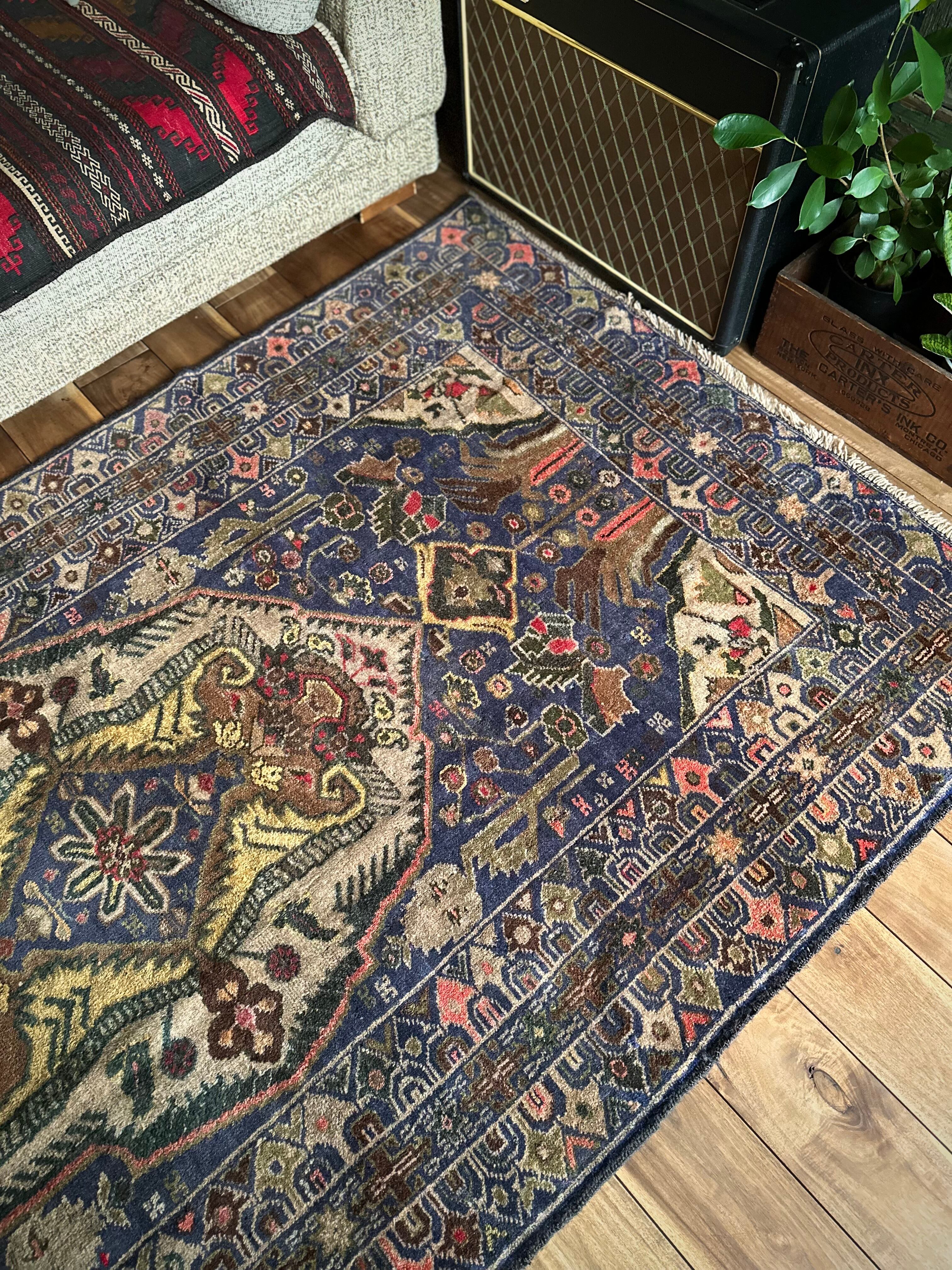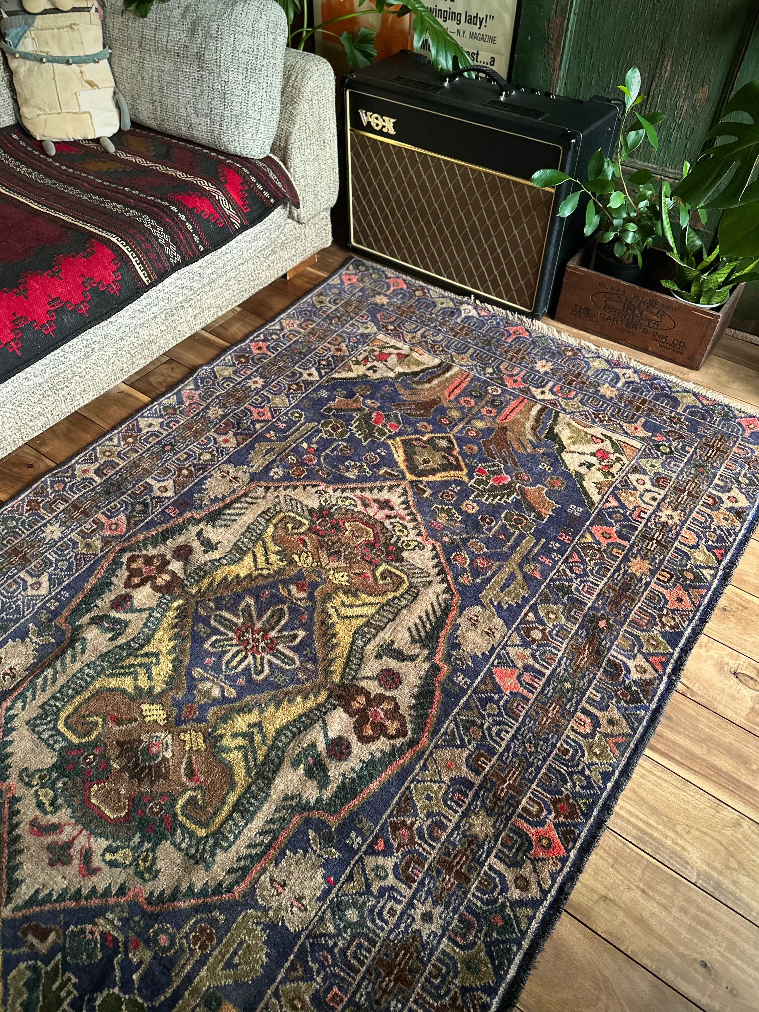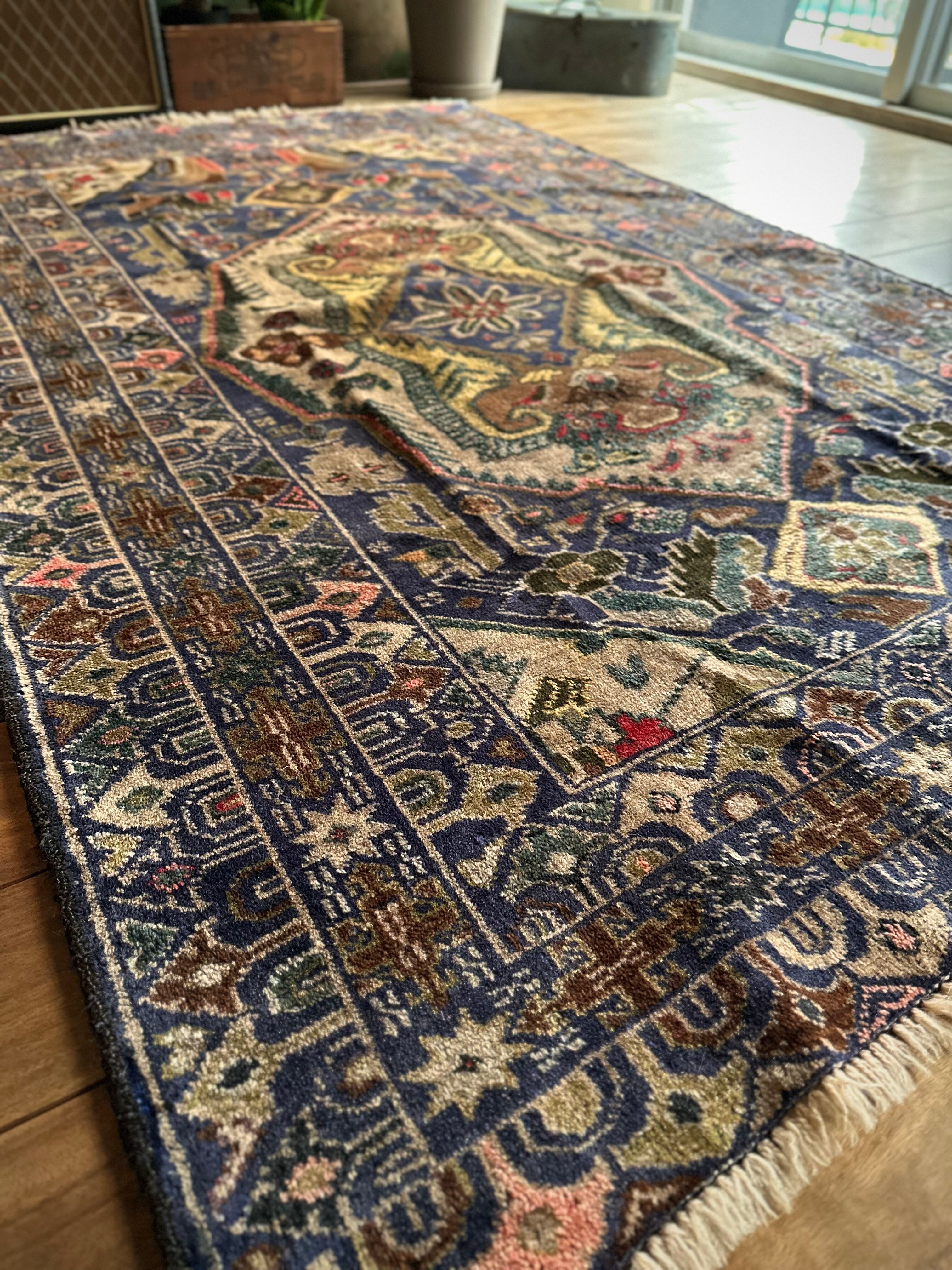 ペルシャ絨毯とは違う趣きの珍しいメダリオンがあしらわれた1枚で、細やかなボーダー部分を見ればバルーチらしさが伺えるでしょうか。このサイズ感にしてはアシメントリーな構図が面白く、今にして思えば写真では逆向きのような気がしますが、光反射の都合上で基本的にパイルの向きが上から下という見方が、写真を撮る上では上手く表現できますのであしからず。
