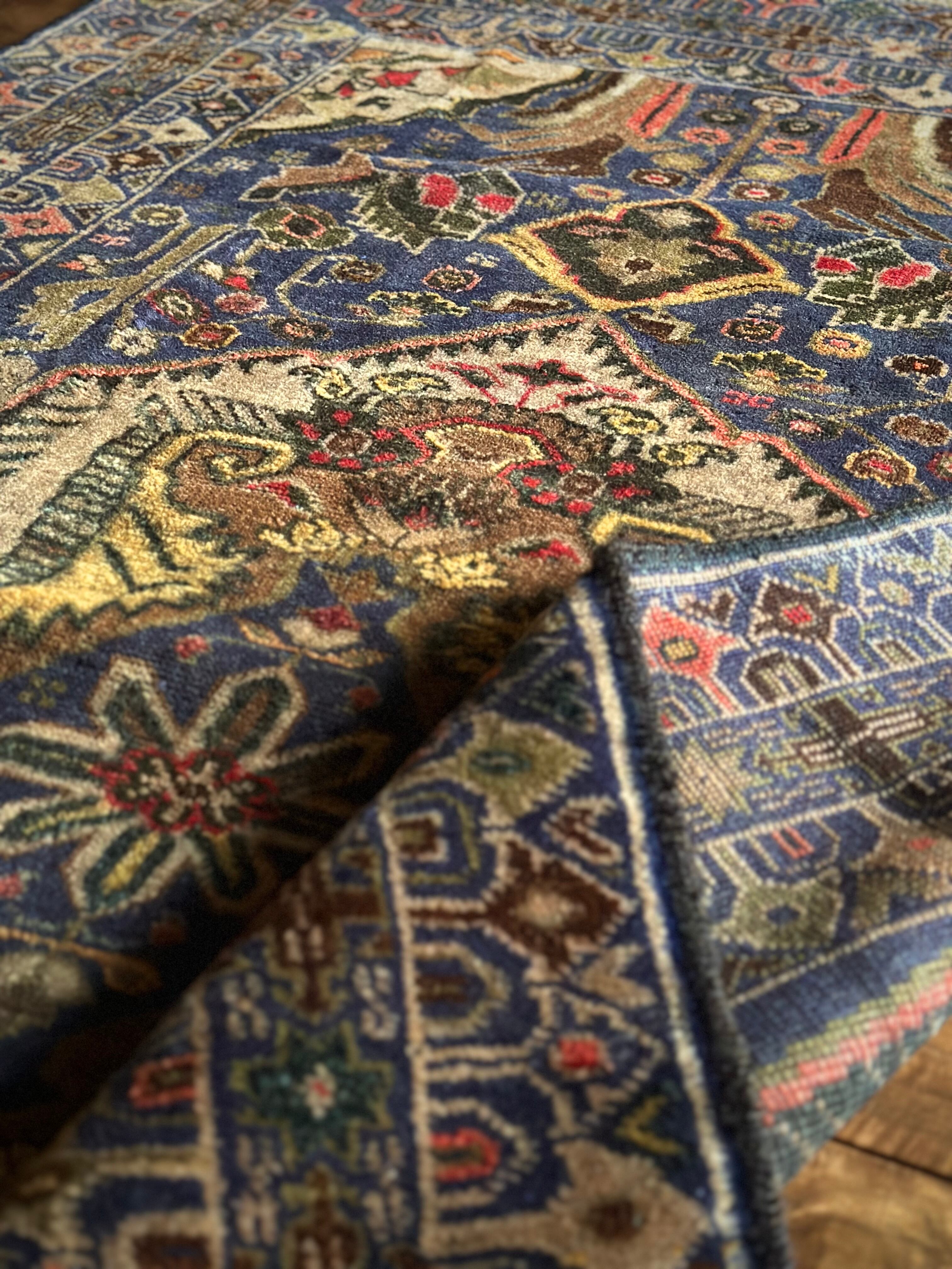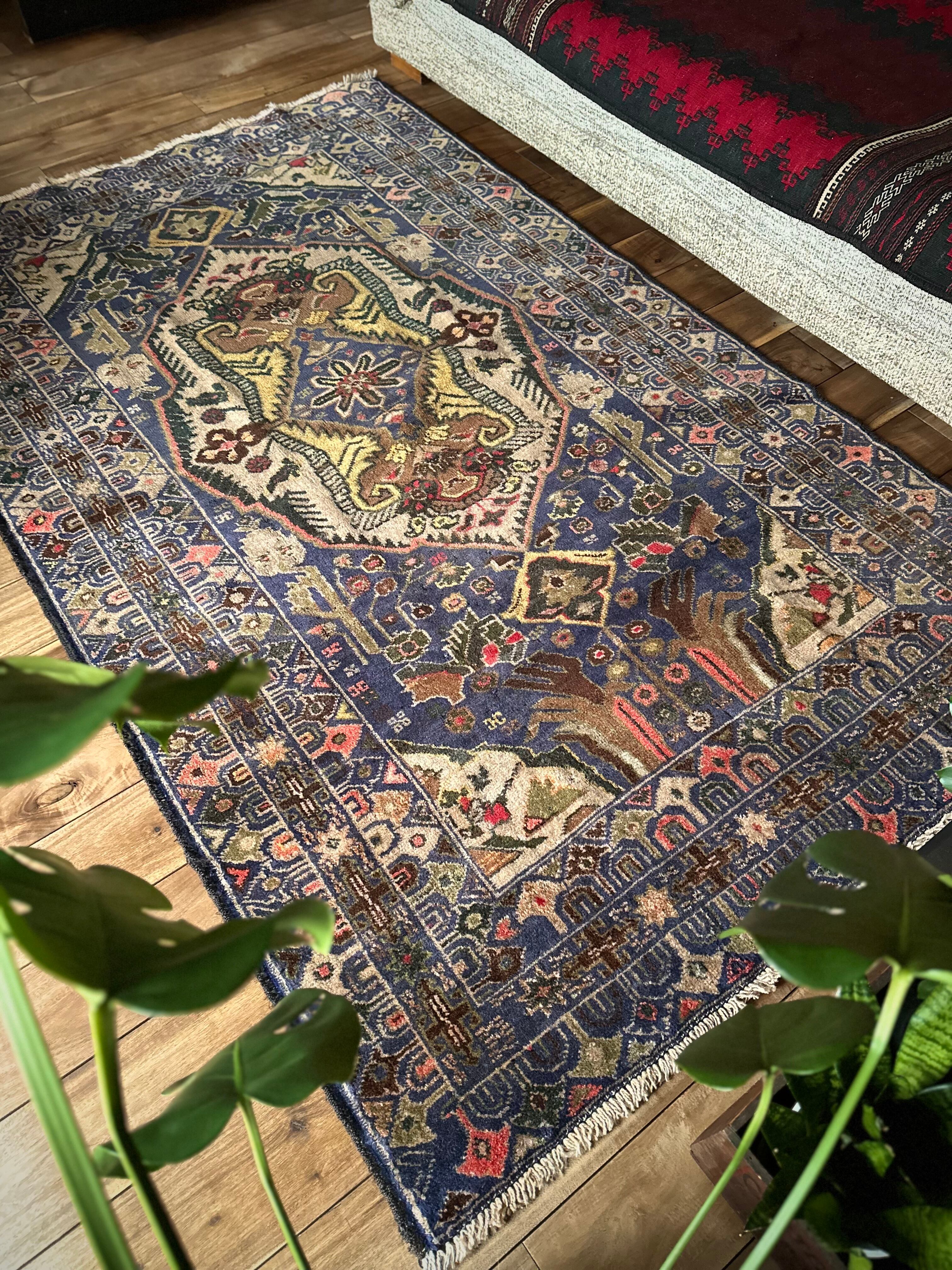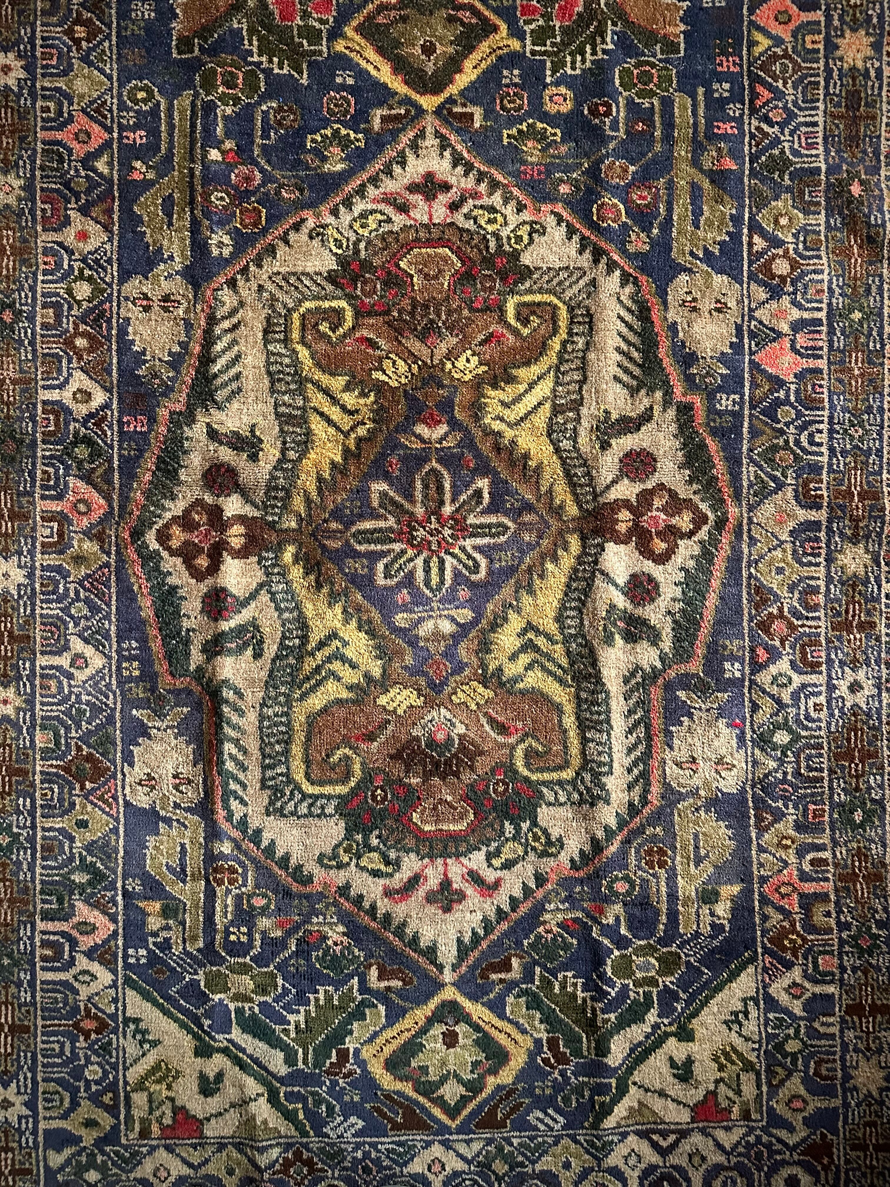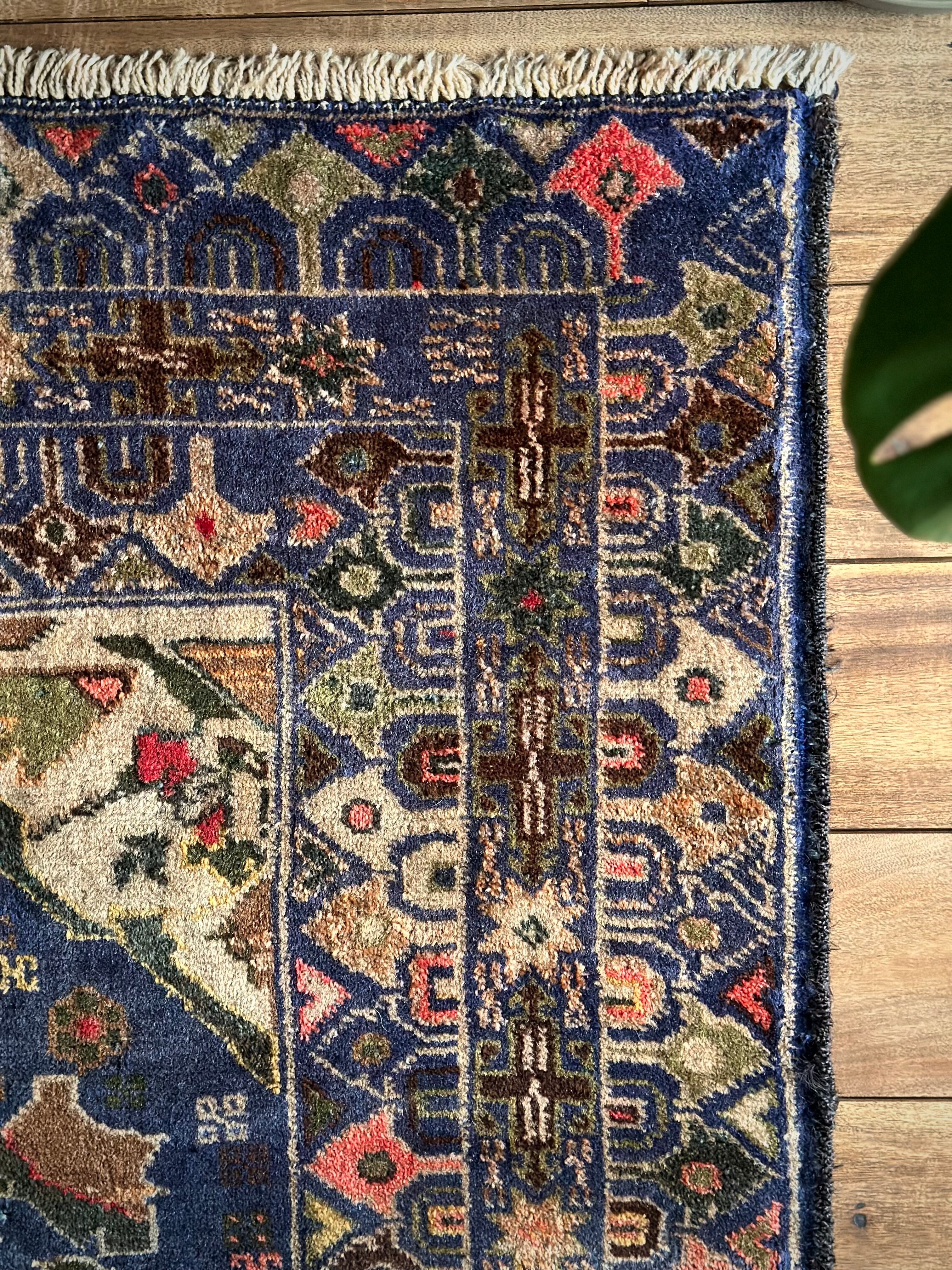 ペルシャ絨毯とは違う趣きの珍しいメダリオンがあしらわれた1枚で、細やかなボーダー部分を見ればバルーチらしさが伺えるでしょうか。このサイズ感にしてはアシメントリーな構図が面白く、今にして思えば写真では逆向きのような気がしますが、光反射の都合上で基本的にパイルの向きが上から下という見方が、写真を撮る上では上手く表現できますのであしからず。