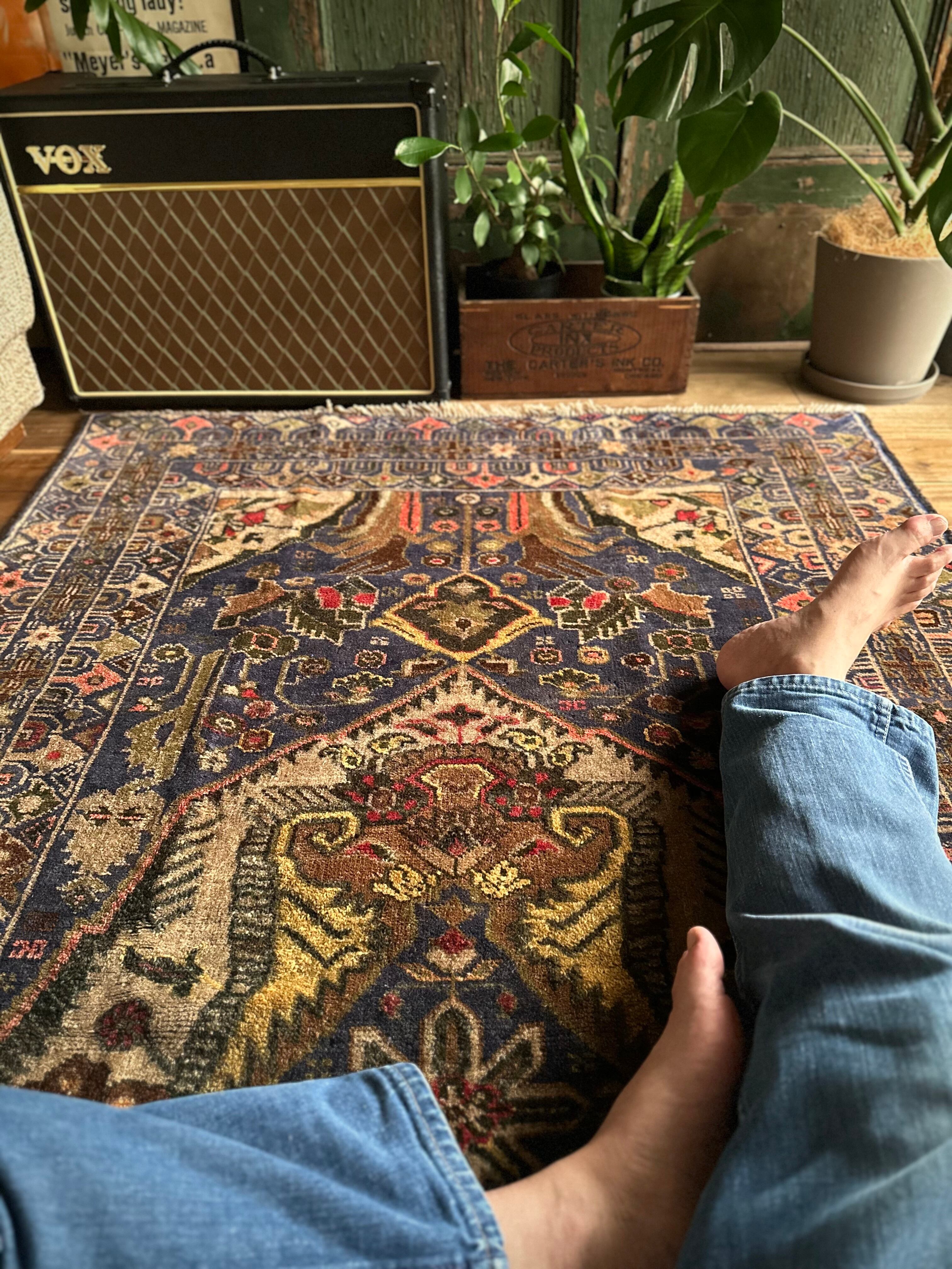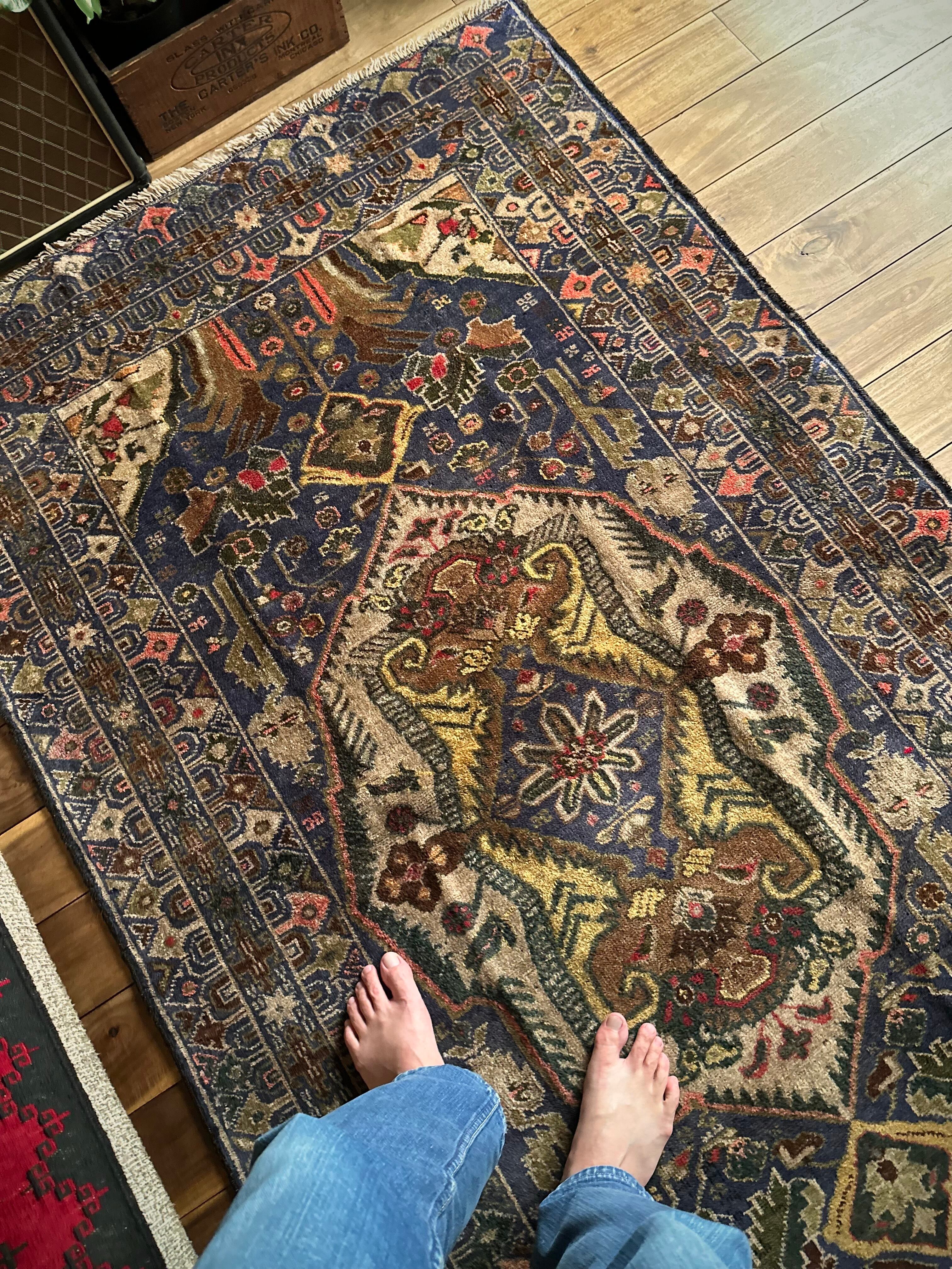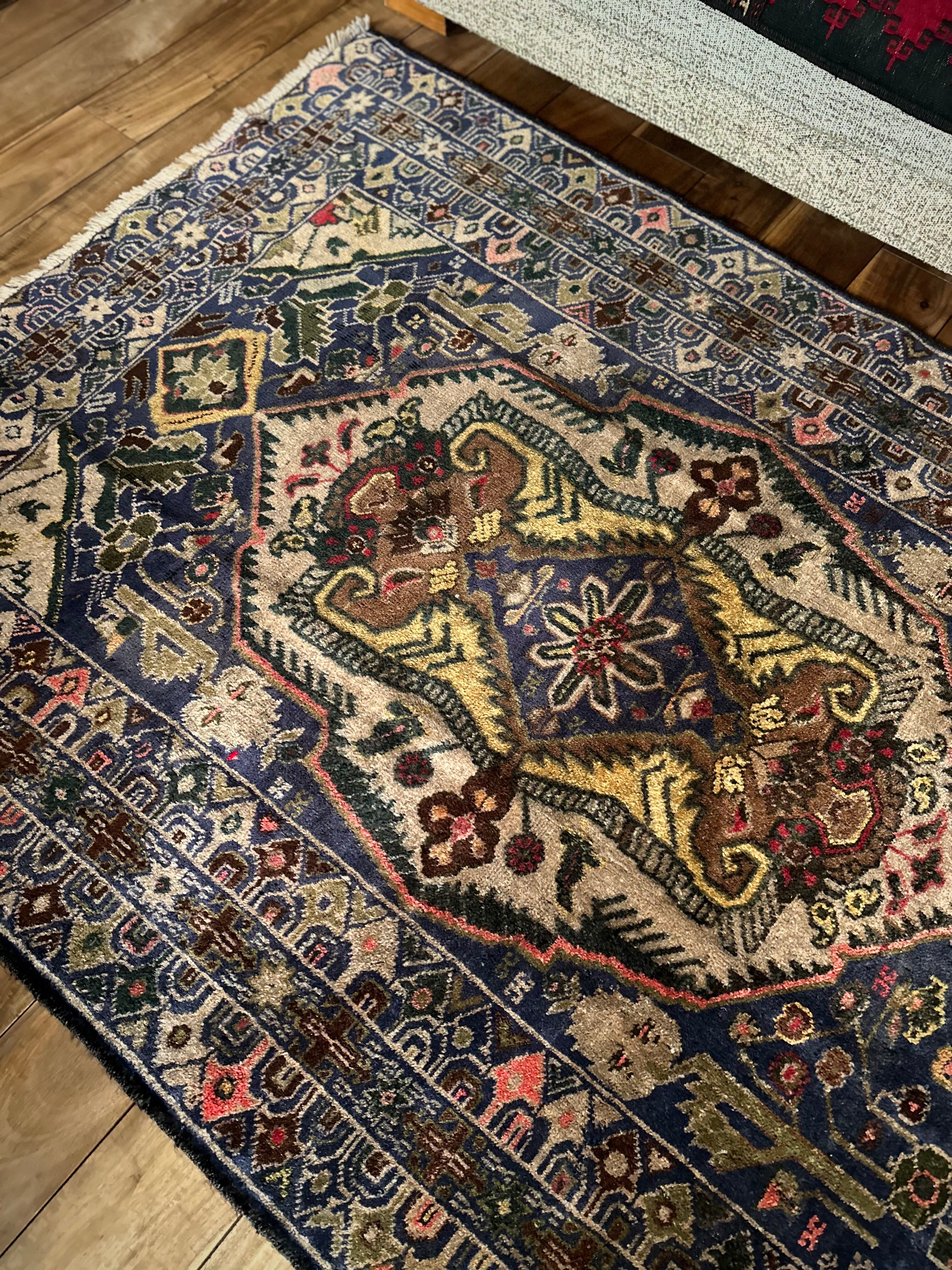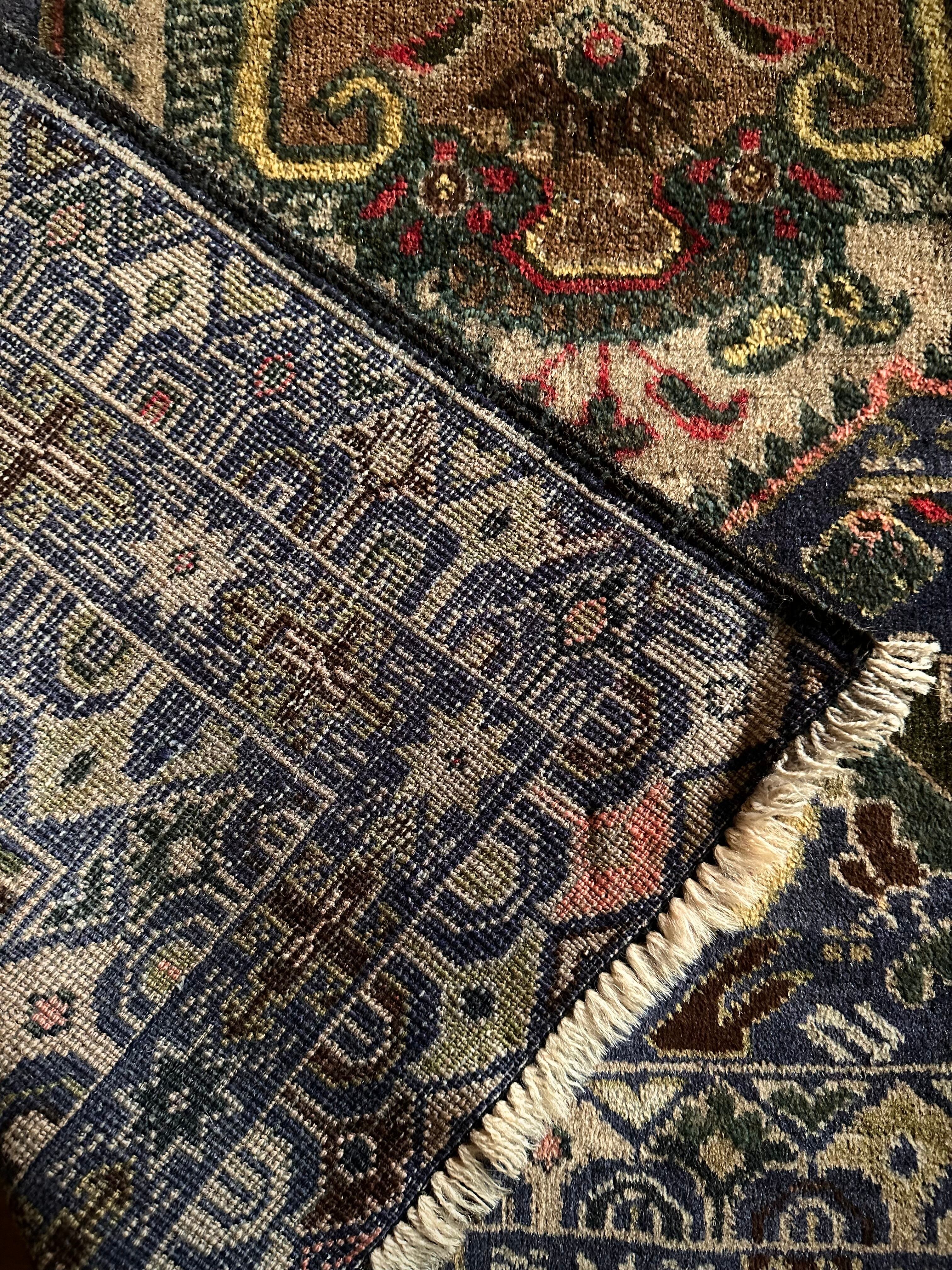 ペルシャ絨毯とは違う趣きの珍しいメダリオンがあしらわれた1枚で、細やかなボーダー部分を見ればバルーチらしさが伺えるでしょうか。このサイズ感にしてはアシメントリーな構図が面白く、今にして思えば写真では逆向きのような気がしますが、光反射の都合上で基本的にパイルの向きが上から下という見方が、写真を撮る上では上手く表現できますのであしからず。