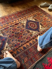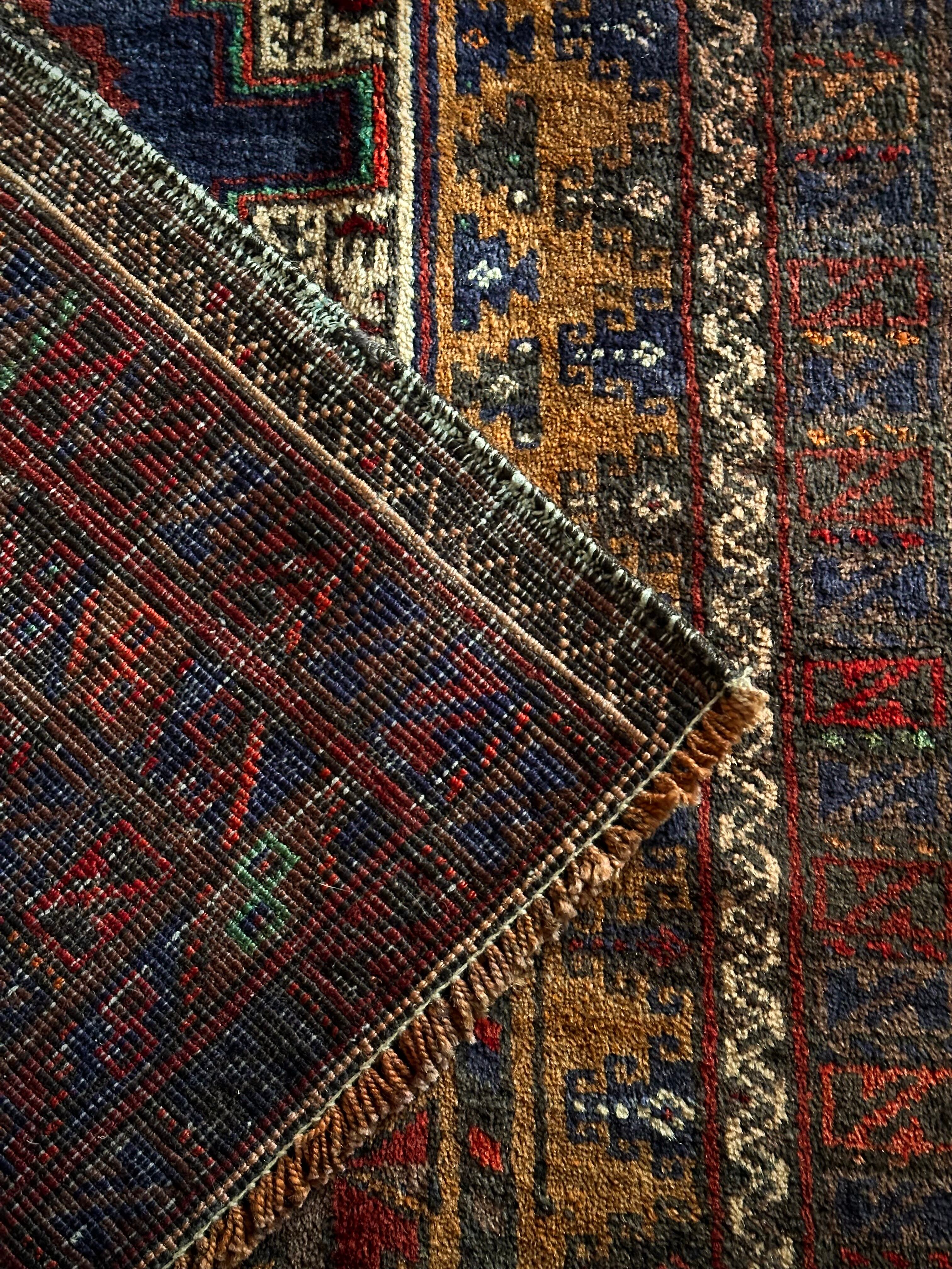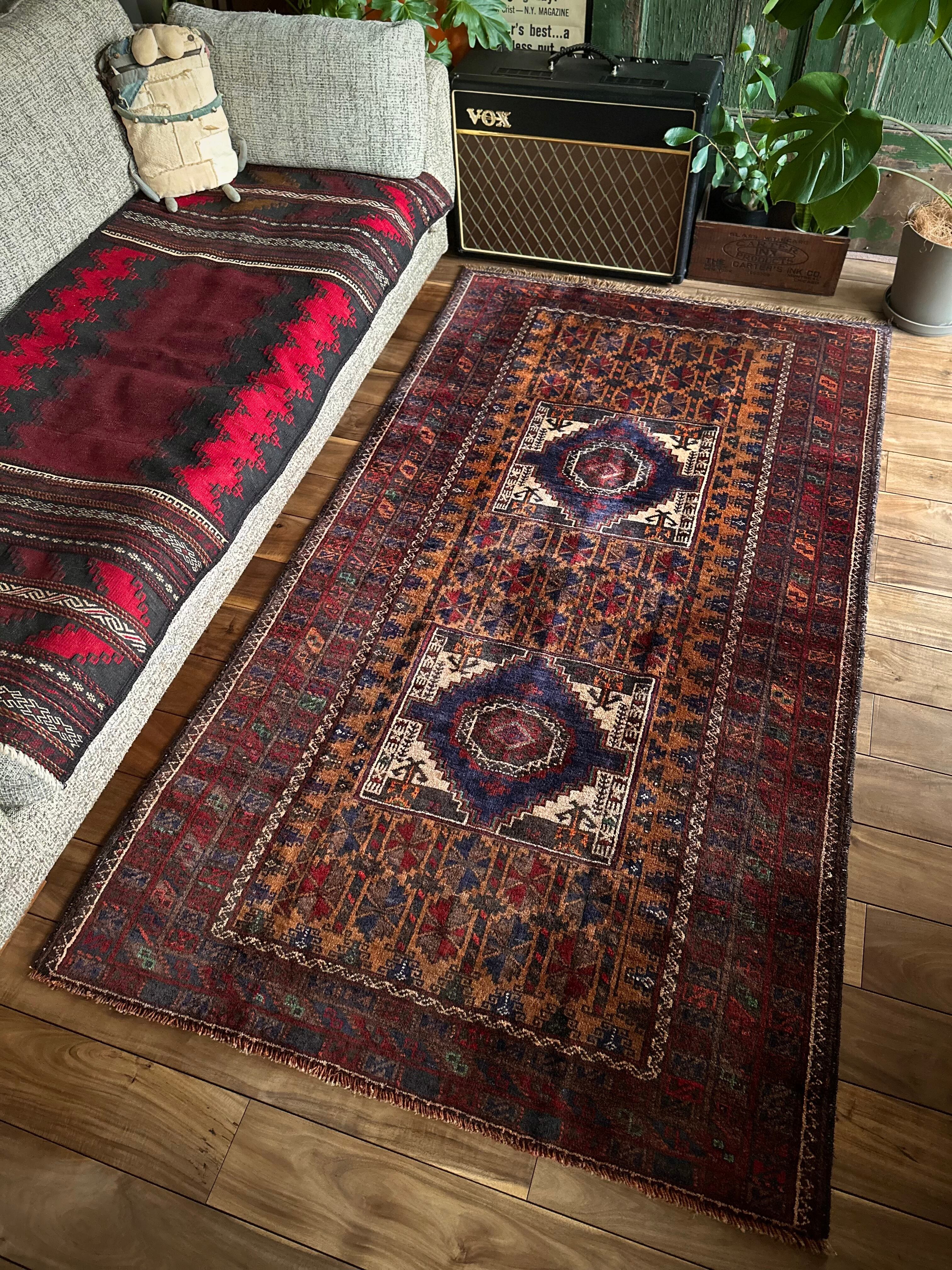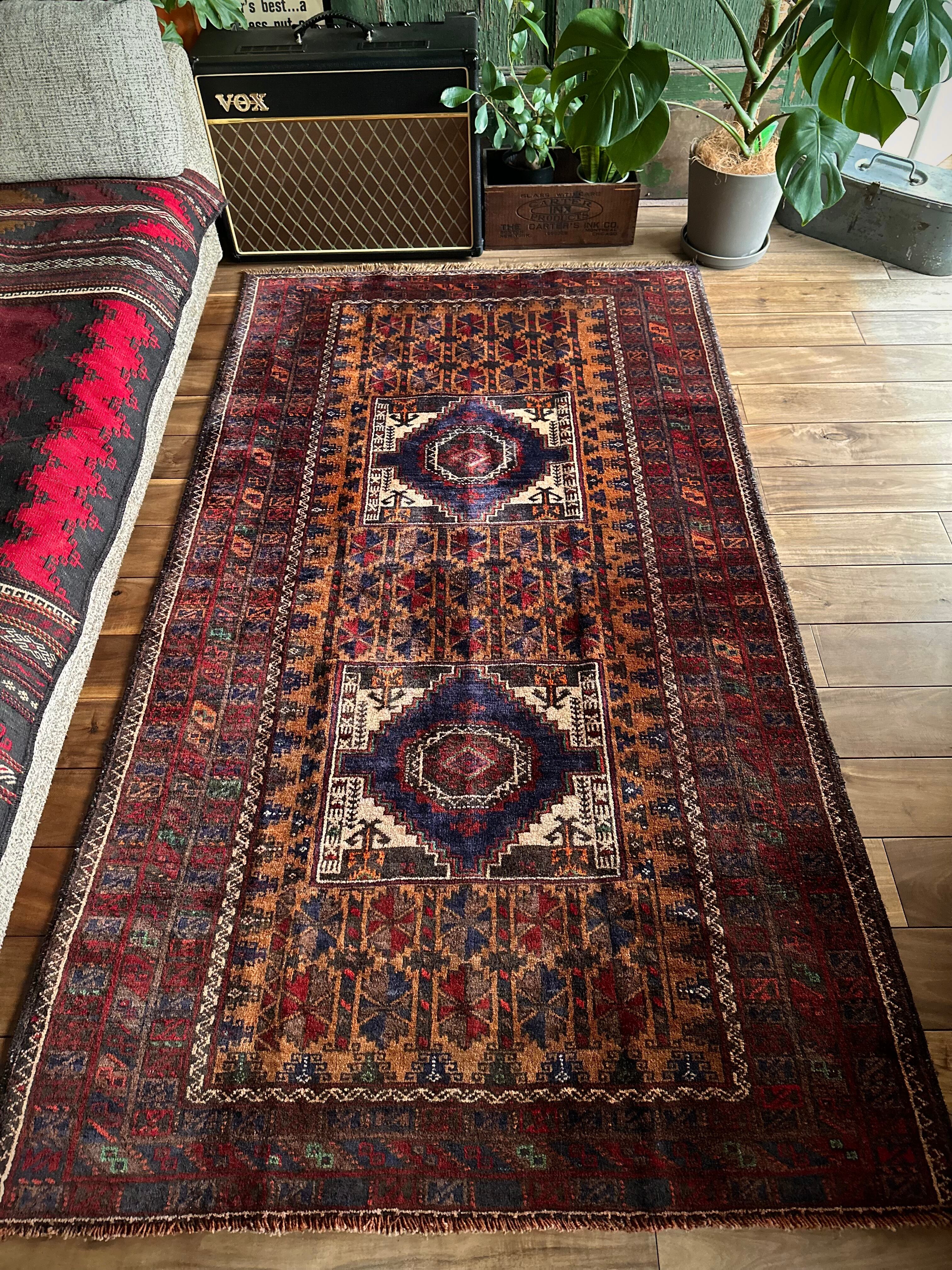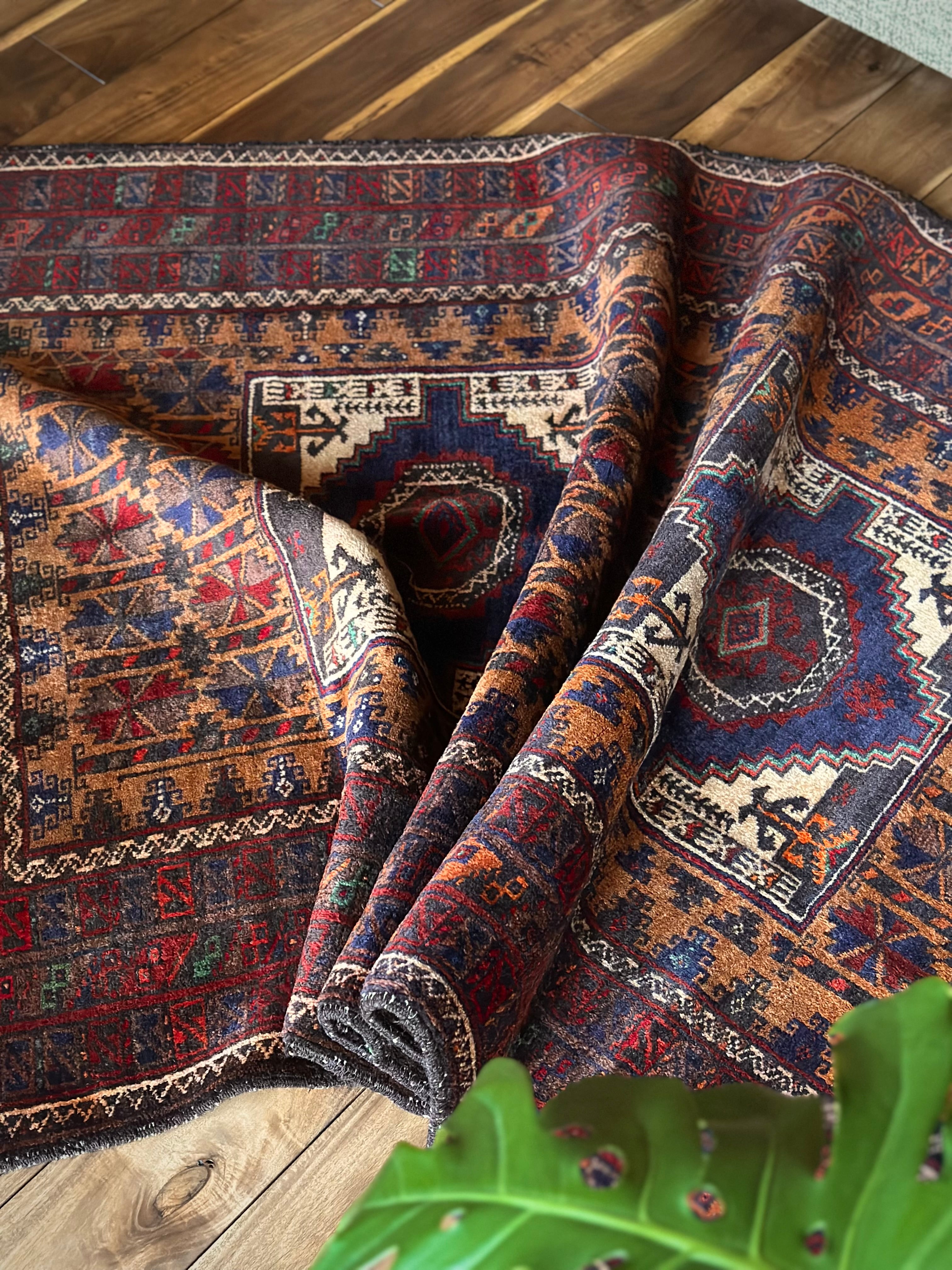 赤を多用に使いながらも全体的には落ち着きのある色合いでまとめられていて、バルーチらしい密度の高い織りでパイルもしっとりと柔らかな質感が気持ち良いでしょうか。大きさ的にも三人掛けソファの前やベッドサイドにもってこいなサイズ感になります。