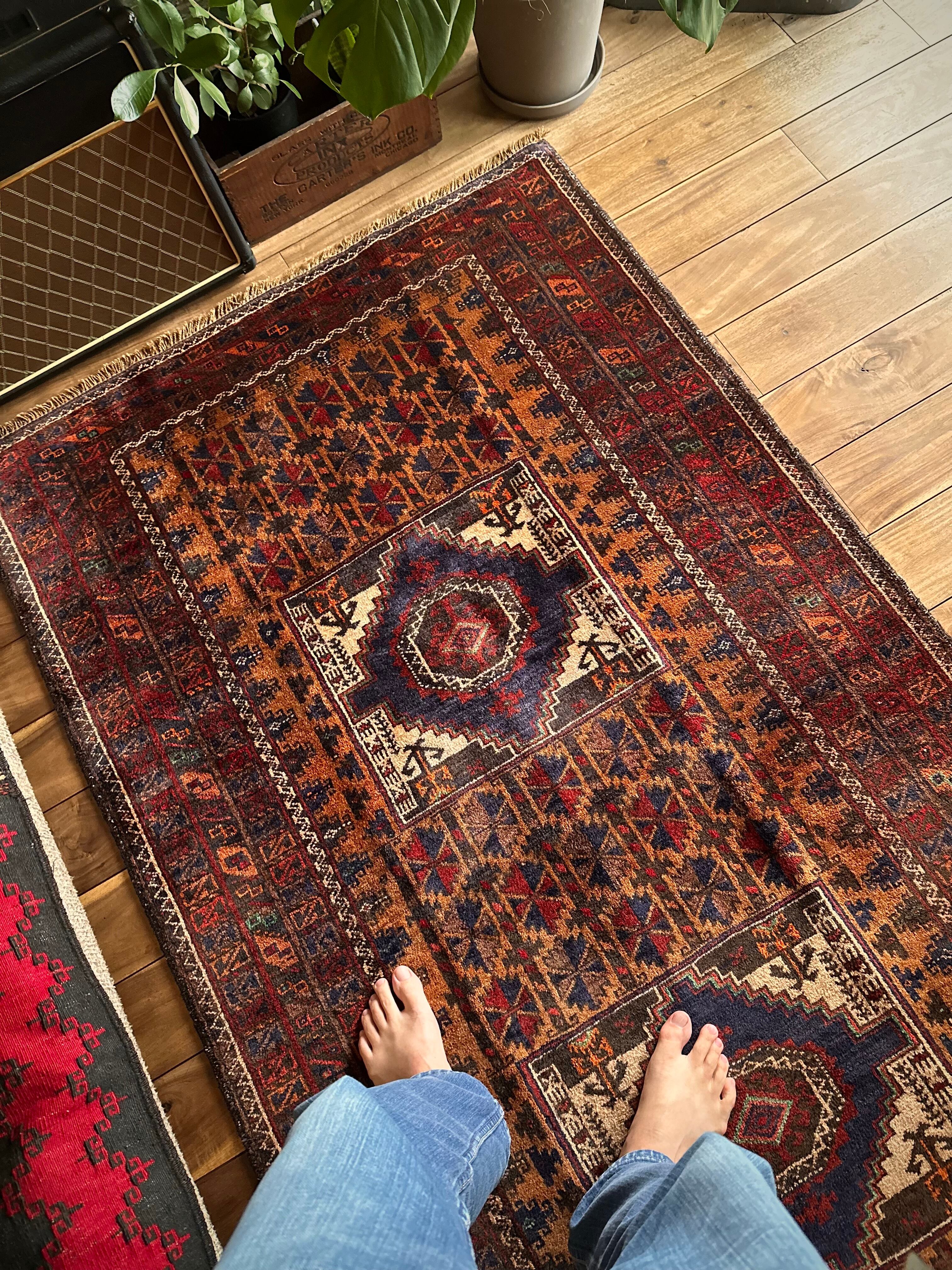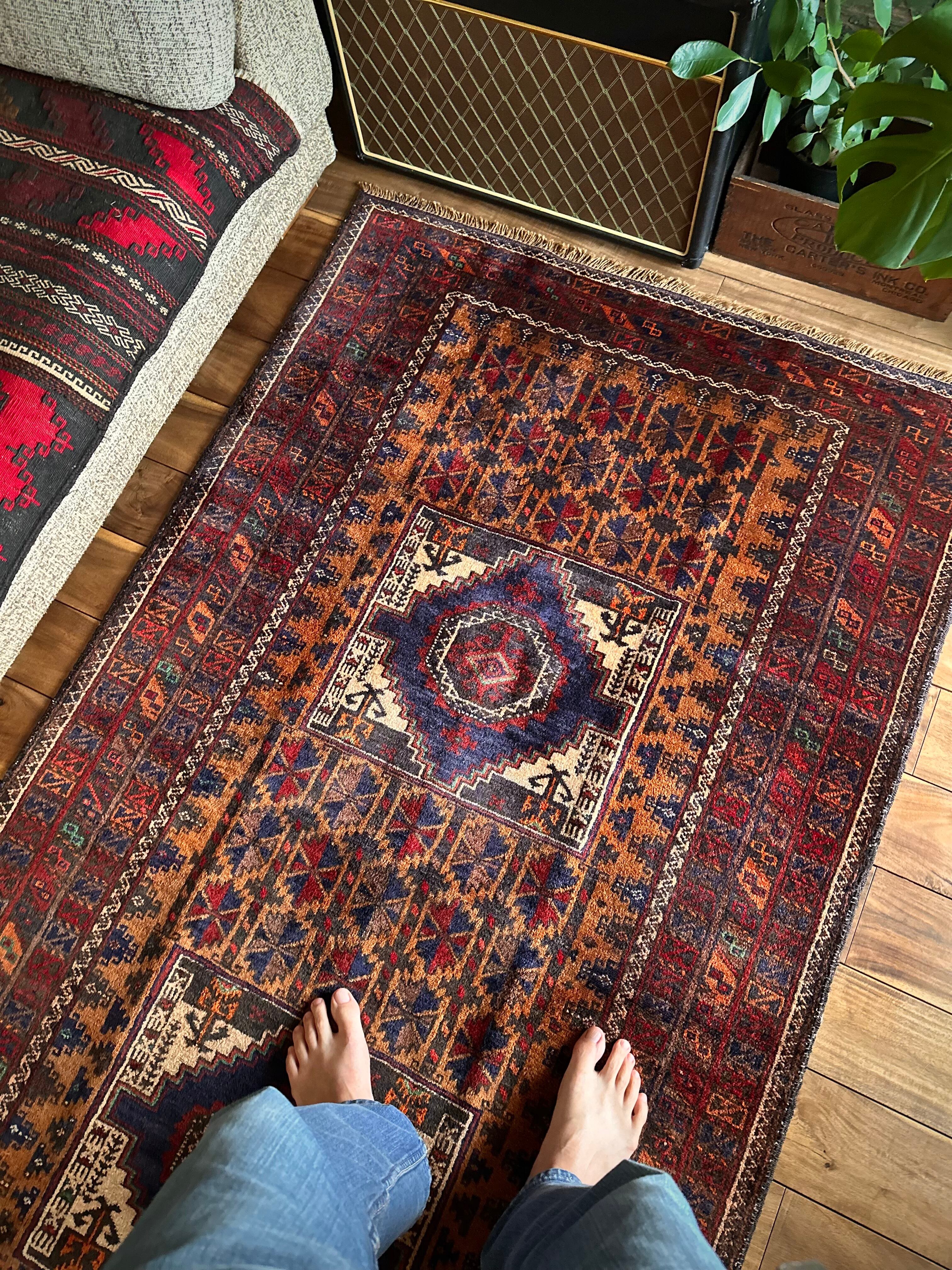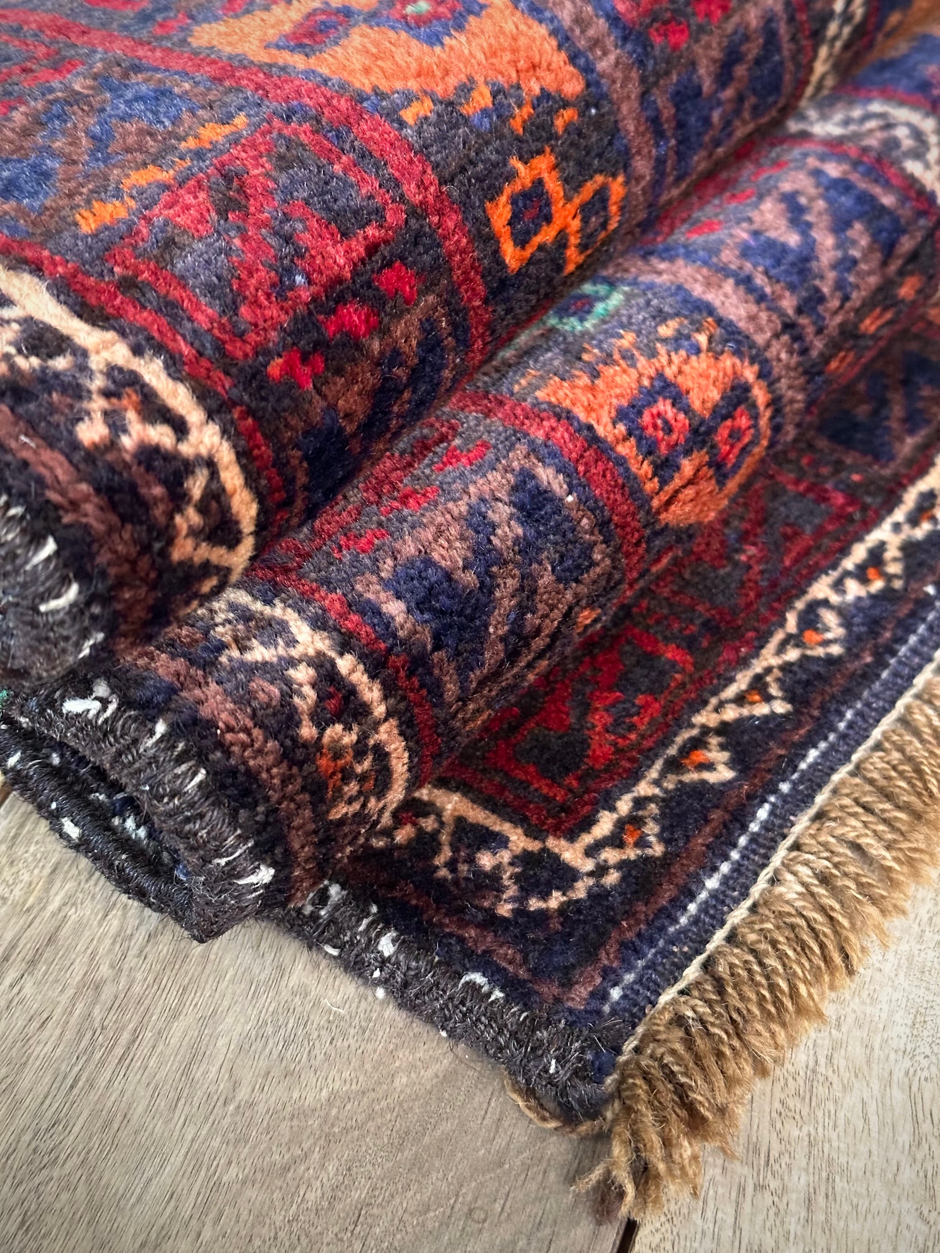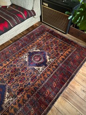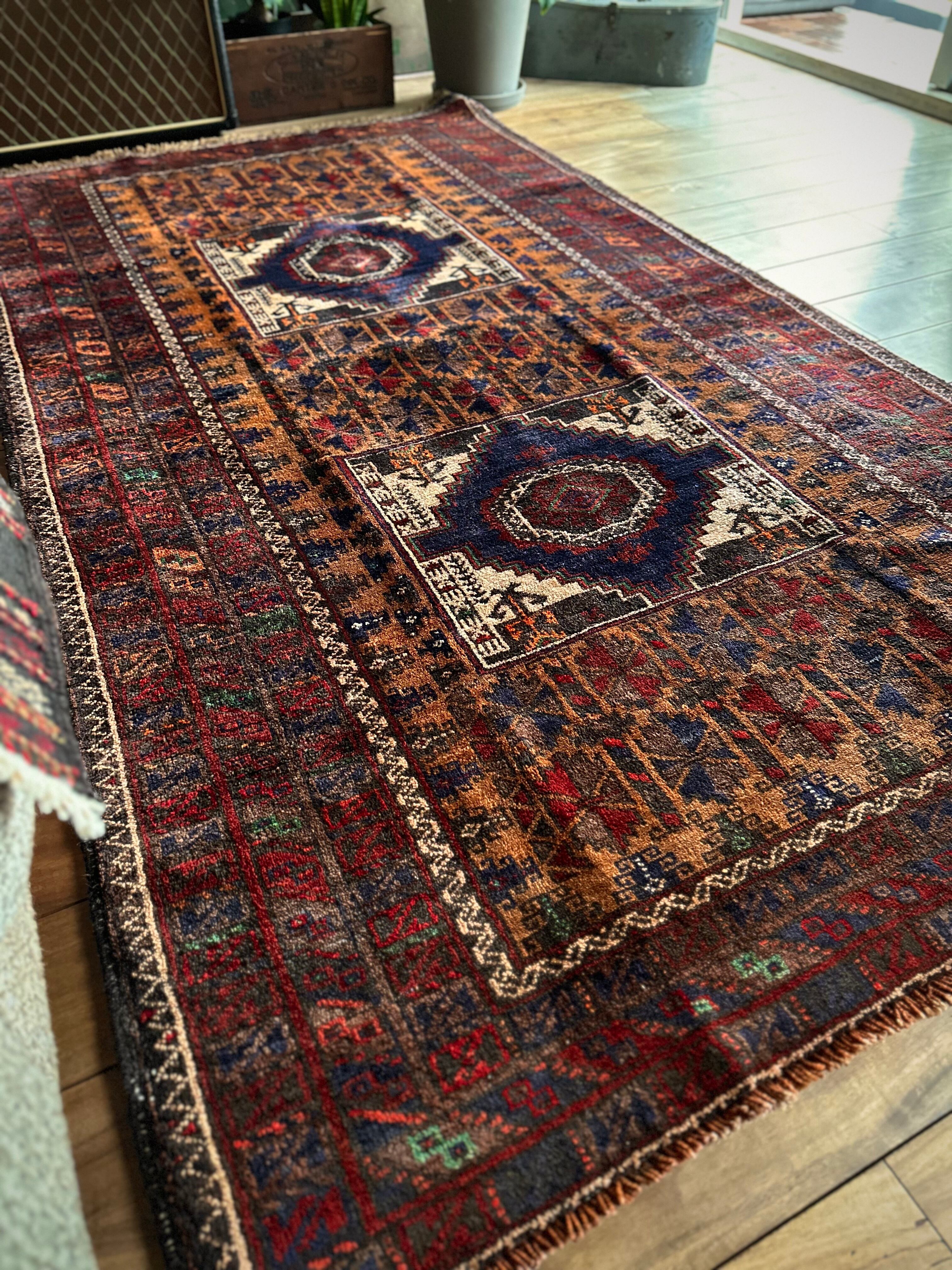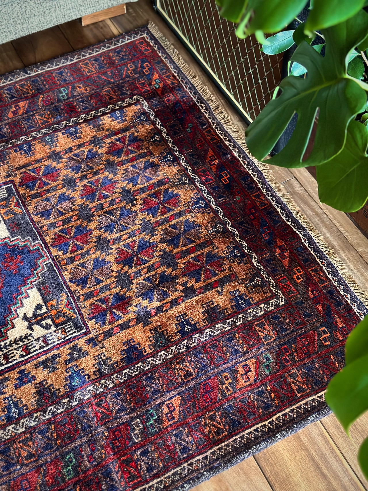赤を多用に使いながらも全体的には落ち着きのある色合いでまとめられていて、バルーチらしい密度の高い織りでパイルもしっとりと柔らかな質感が気持ち良いでしょうか。大きさ的にも三人掛けソファの前やベッドサイドにもってこいなサイズ感になります。