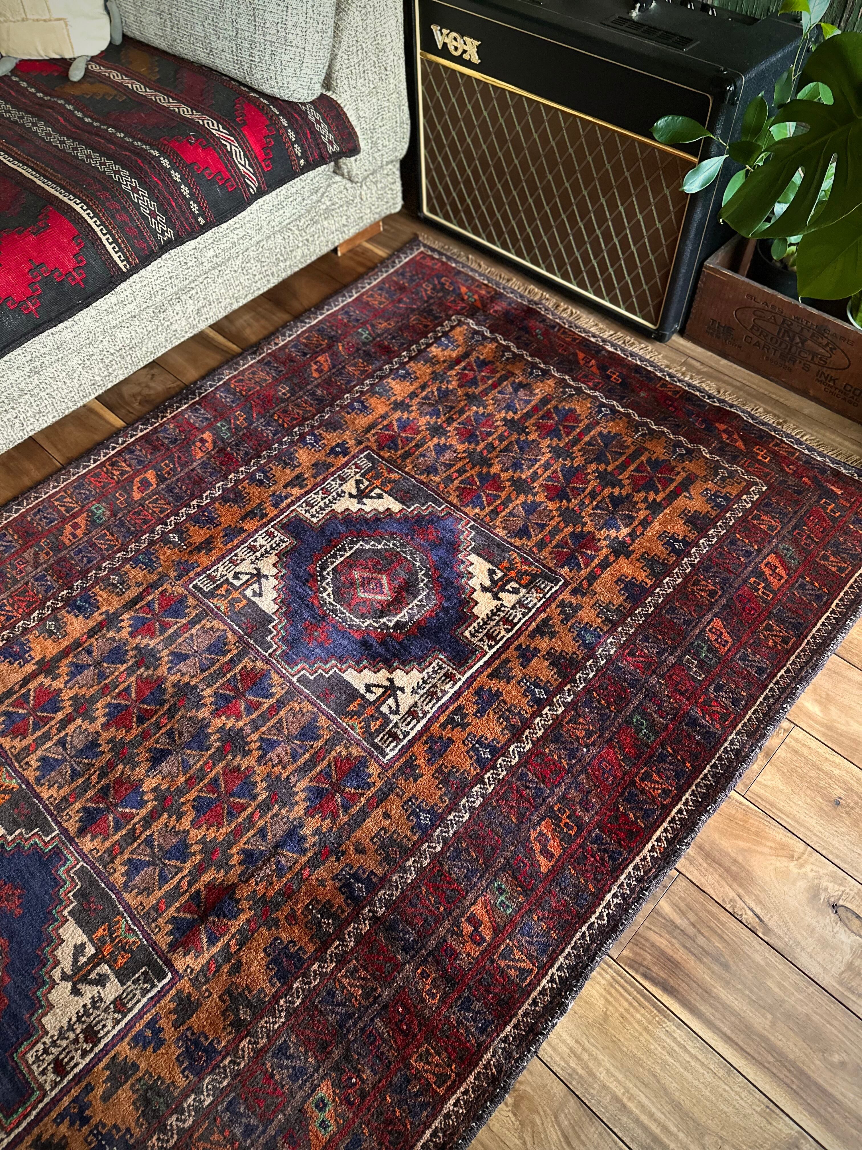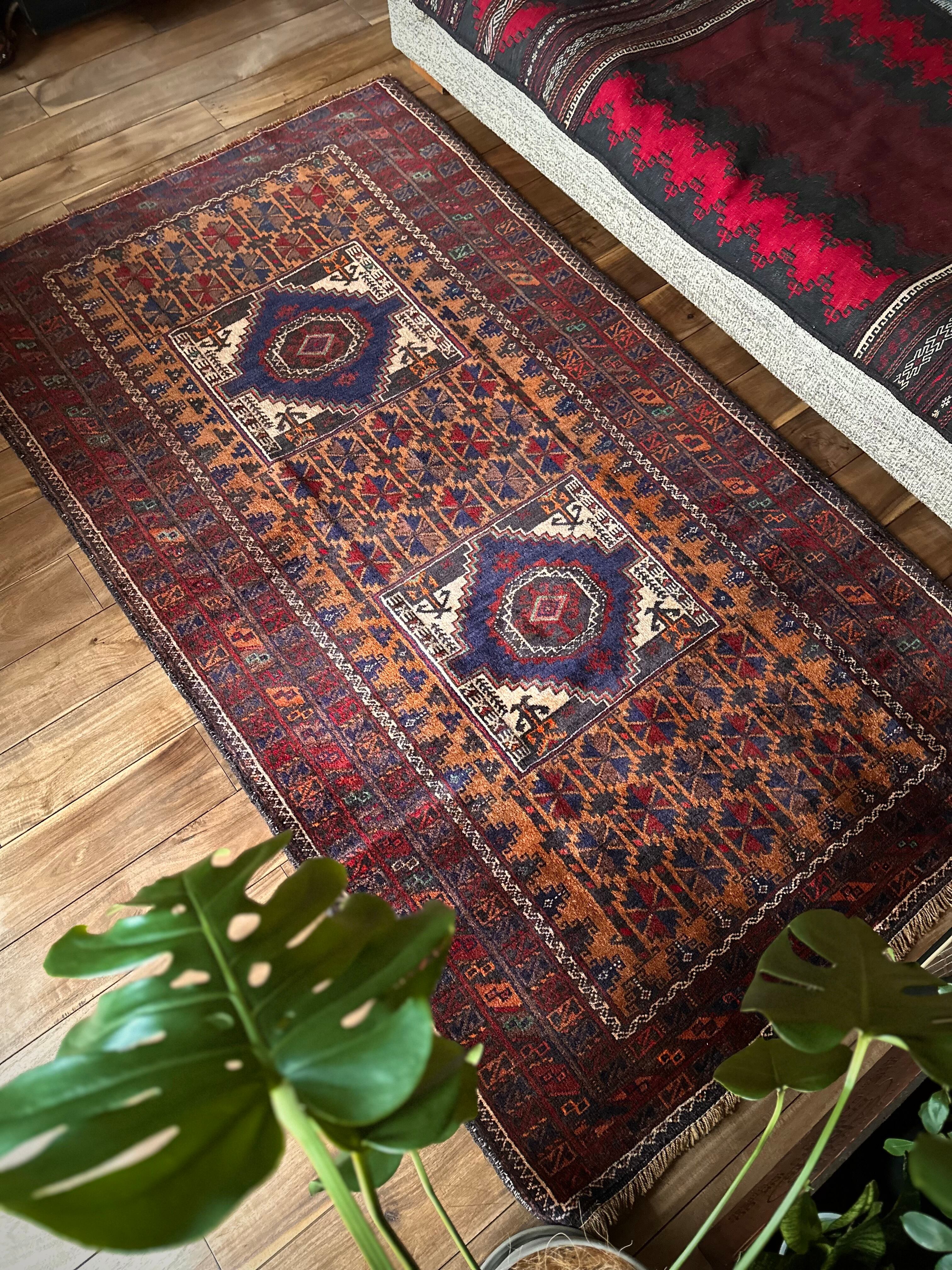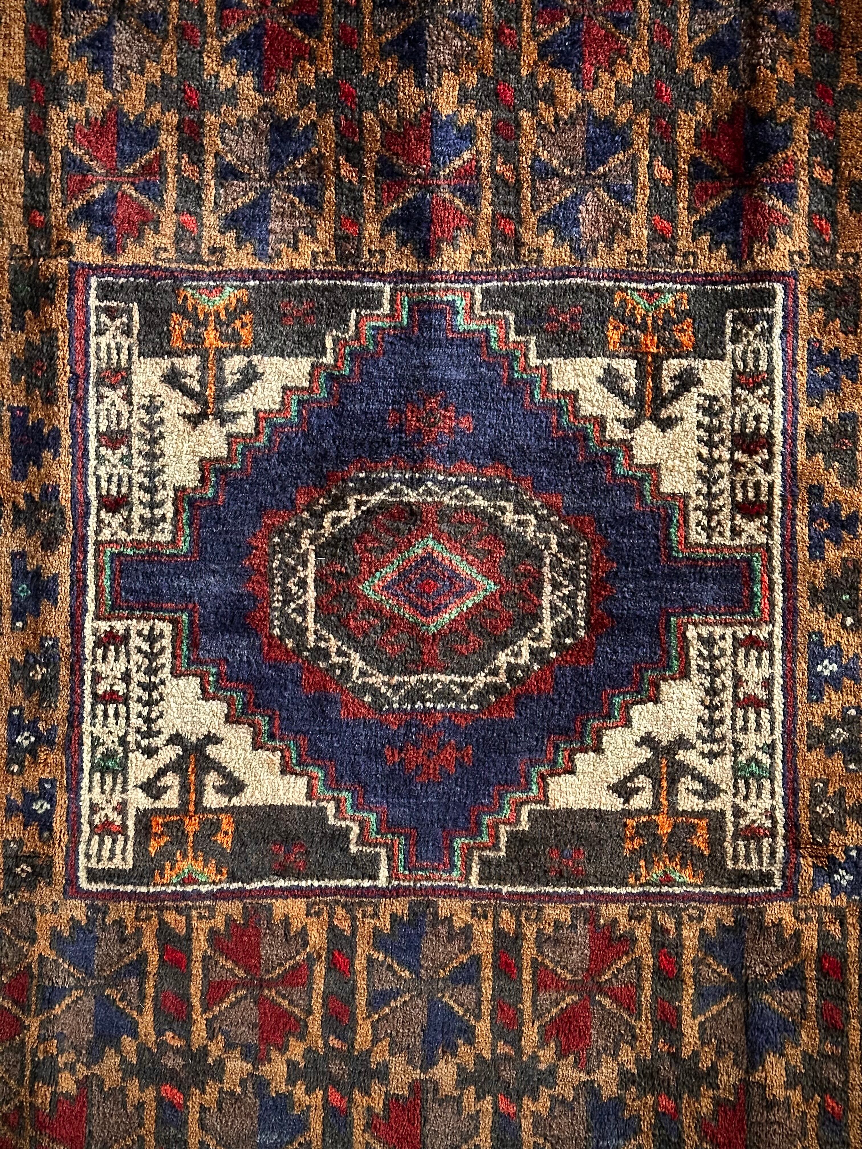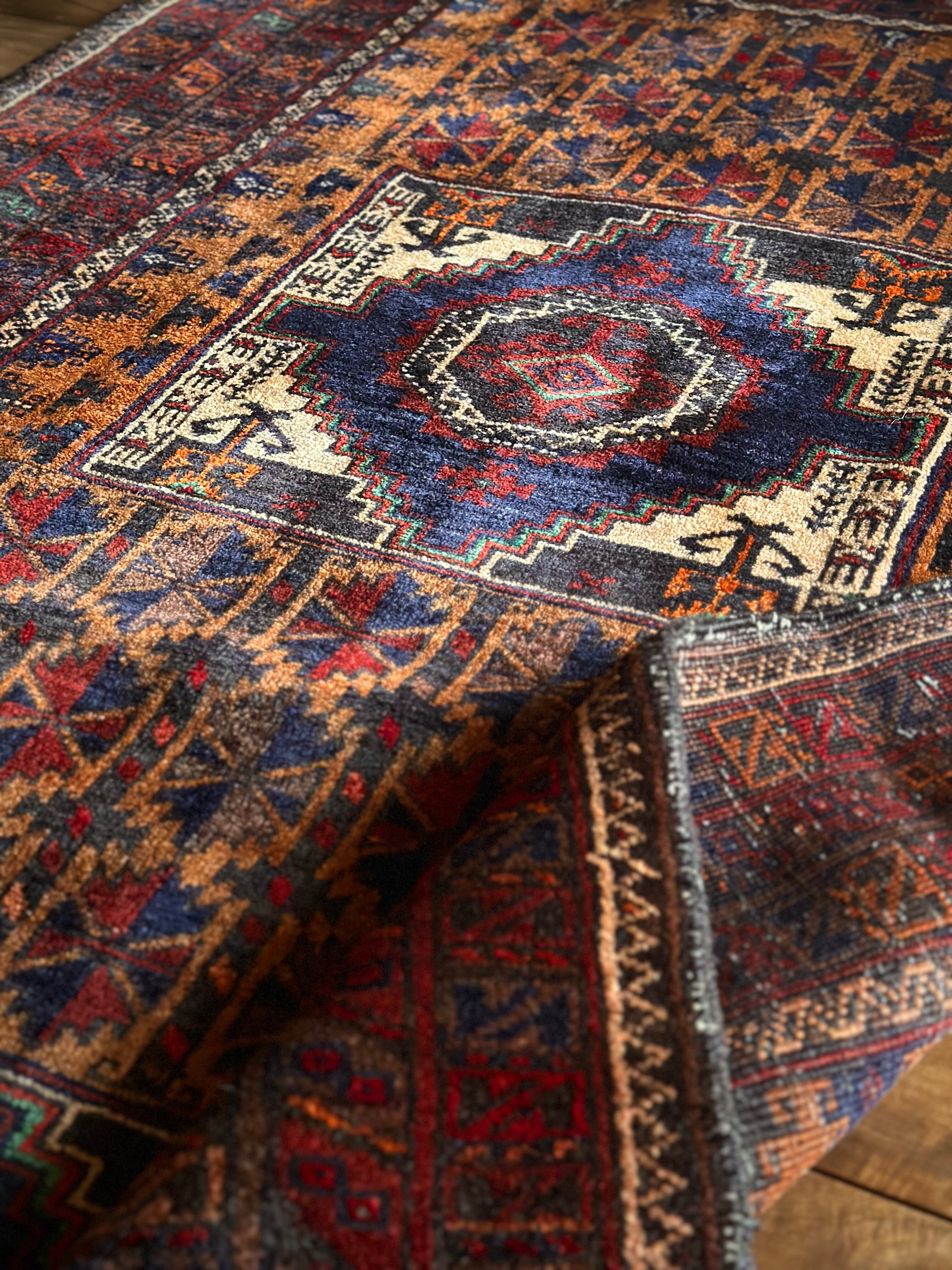 赤を多用に使いながらも全体的には落ち着きのある色合いでまとめられていて、バルーチらしい密度の高い織りでパイルもしっとりと柔らかな質感が気持ち良いでしょうか。大きさ的にも三人掛けソファの前やベッドサイドにもってこいなサイズ感になります。