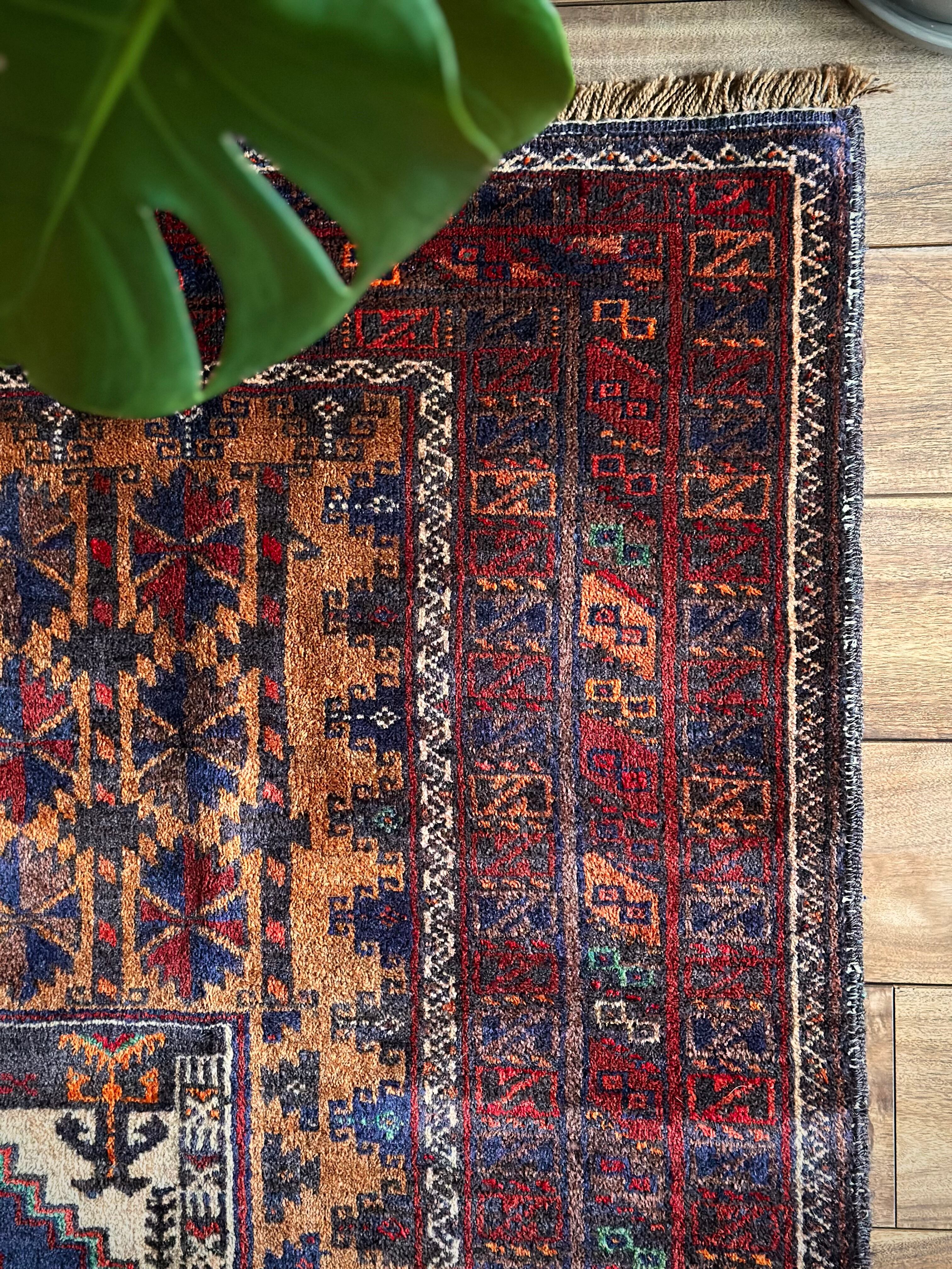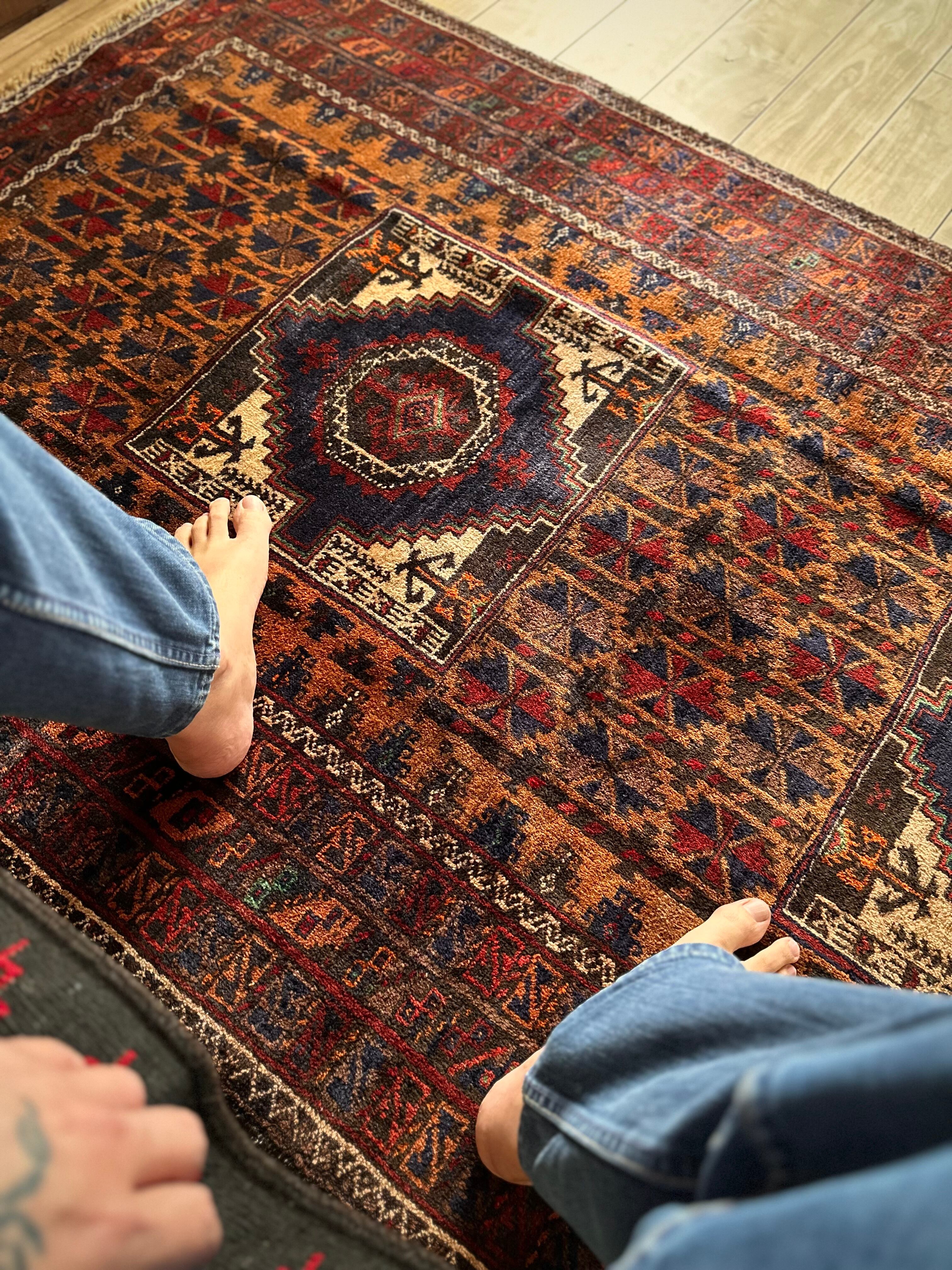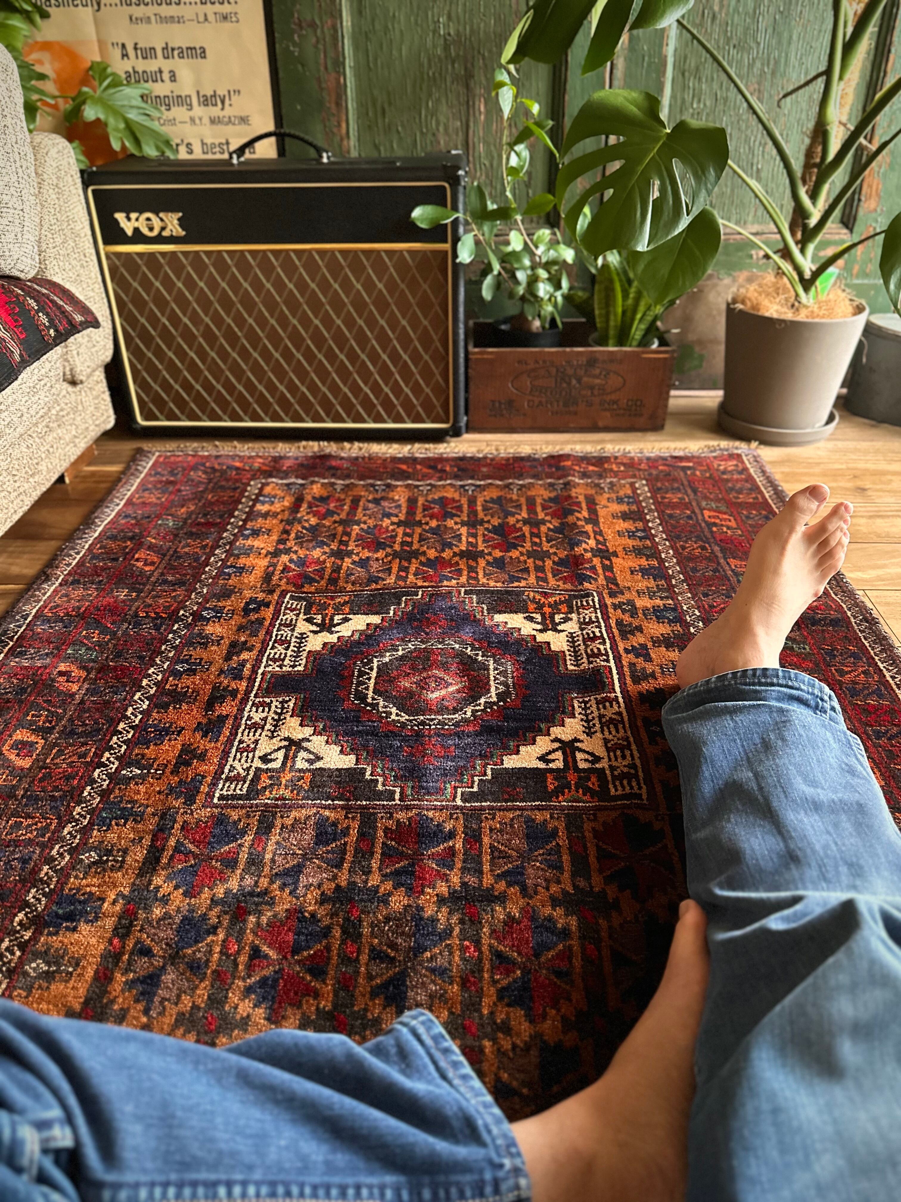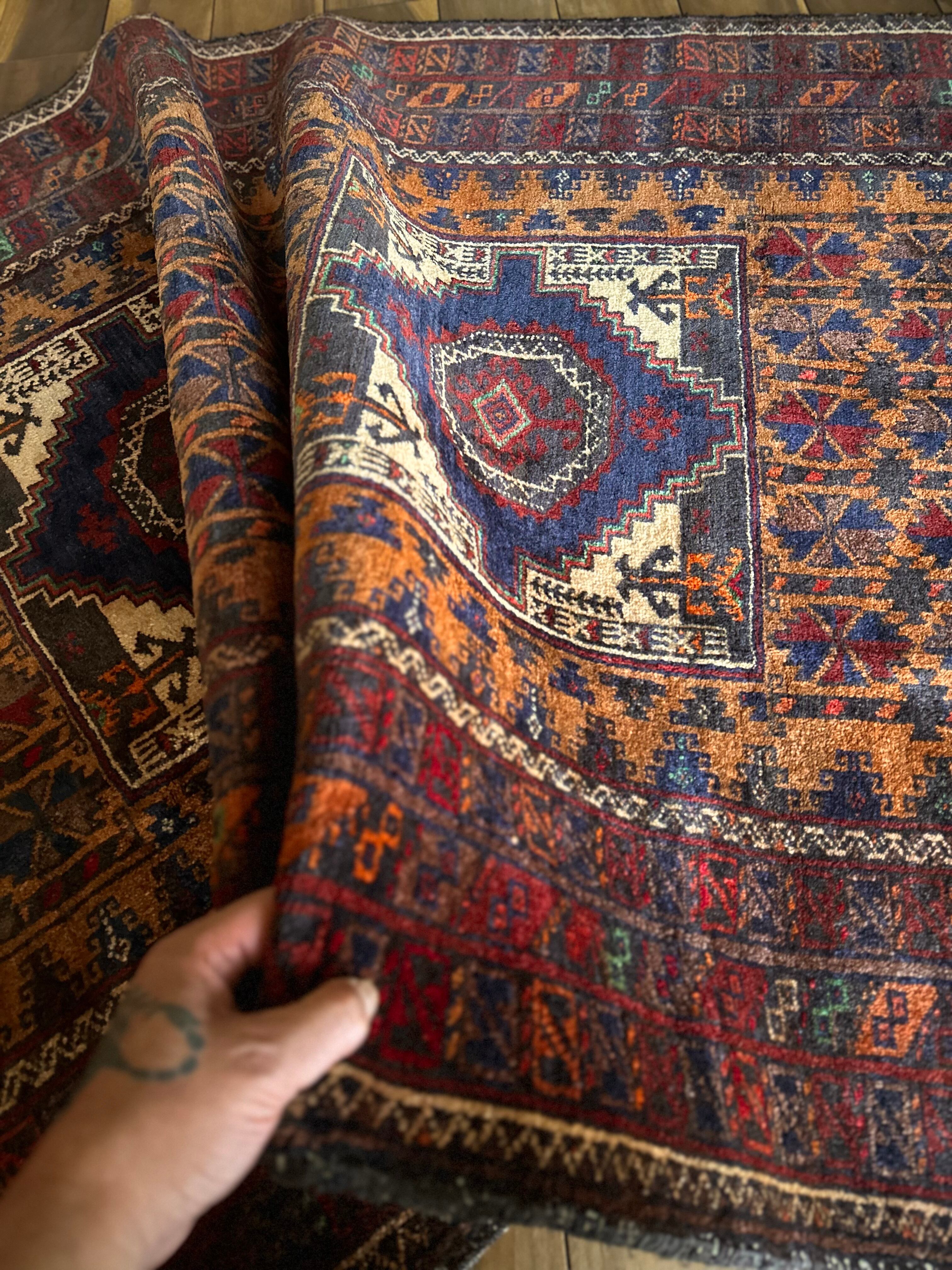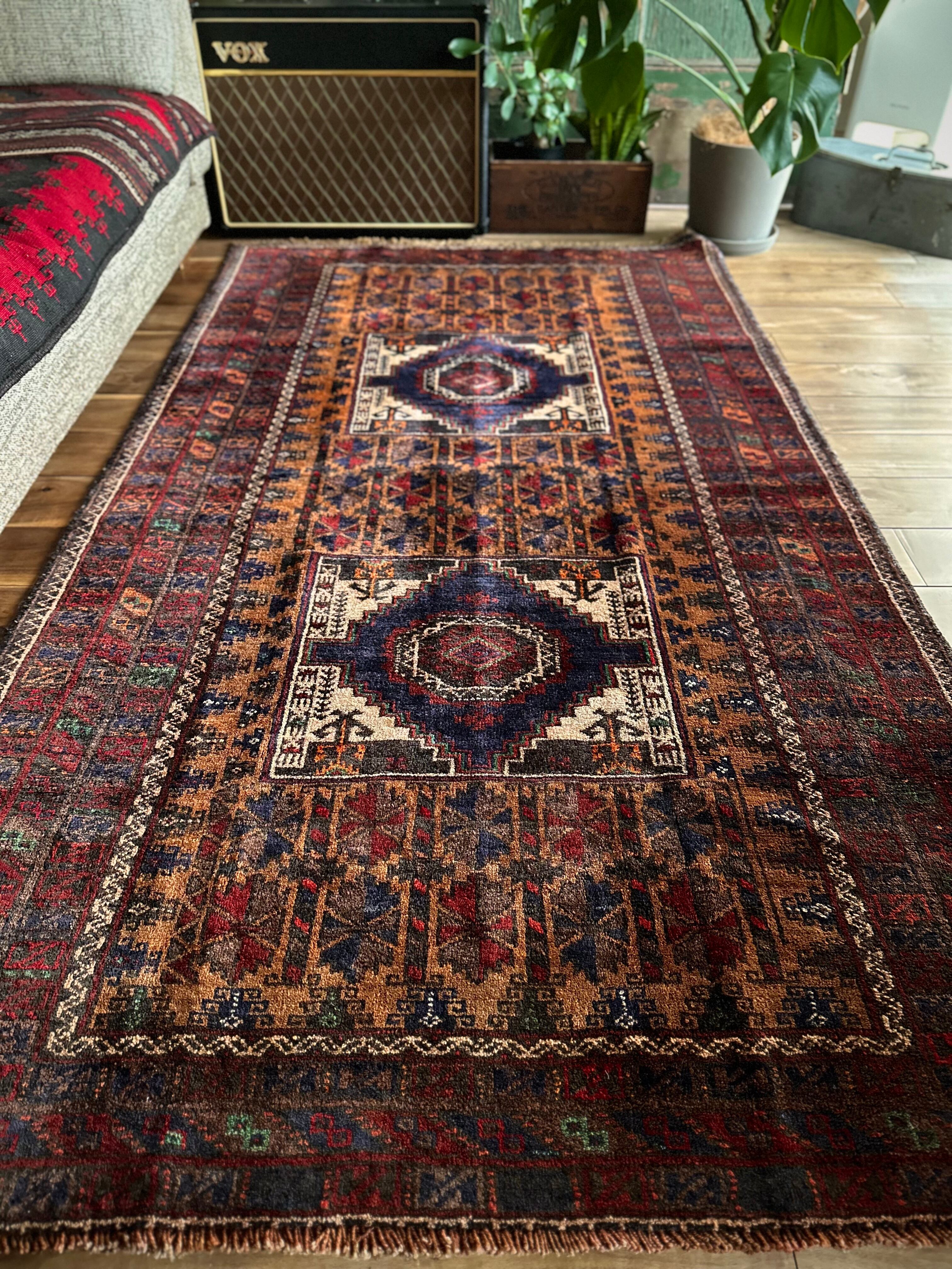 赤を多用に使いながらも全体的には落ち着きのある色合いでまとめられていて、バルーチらしい密度の高い織りでパイルもしっとりと柔らかな質感が気持ち良いでしょうか。大きさ的にも三人掛けソファの前やベッドサイドにもってこいなサイズ感になります。