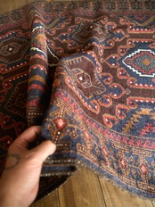 最後にラグそのものに関しては羊毛特有の匂いがあり、採寸は中央付近で計測していますが、手織りならではの歪みによる誤差や水洗いクリーニングによる縮み、また草木染めによる経年劣化の色ムラなどがありますが、それもまたヴィンテージラグの魅力かとご理解ください。