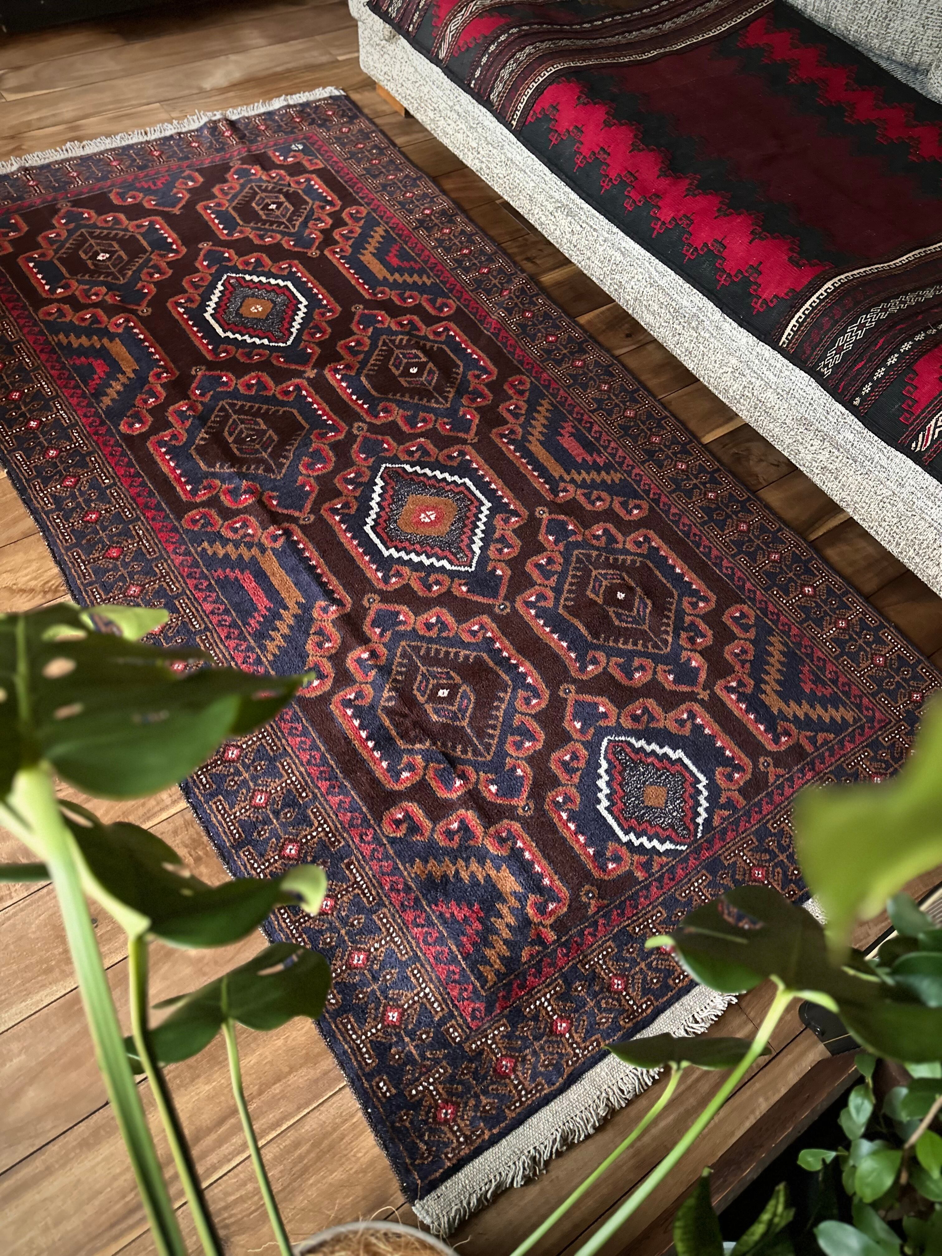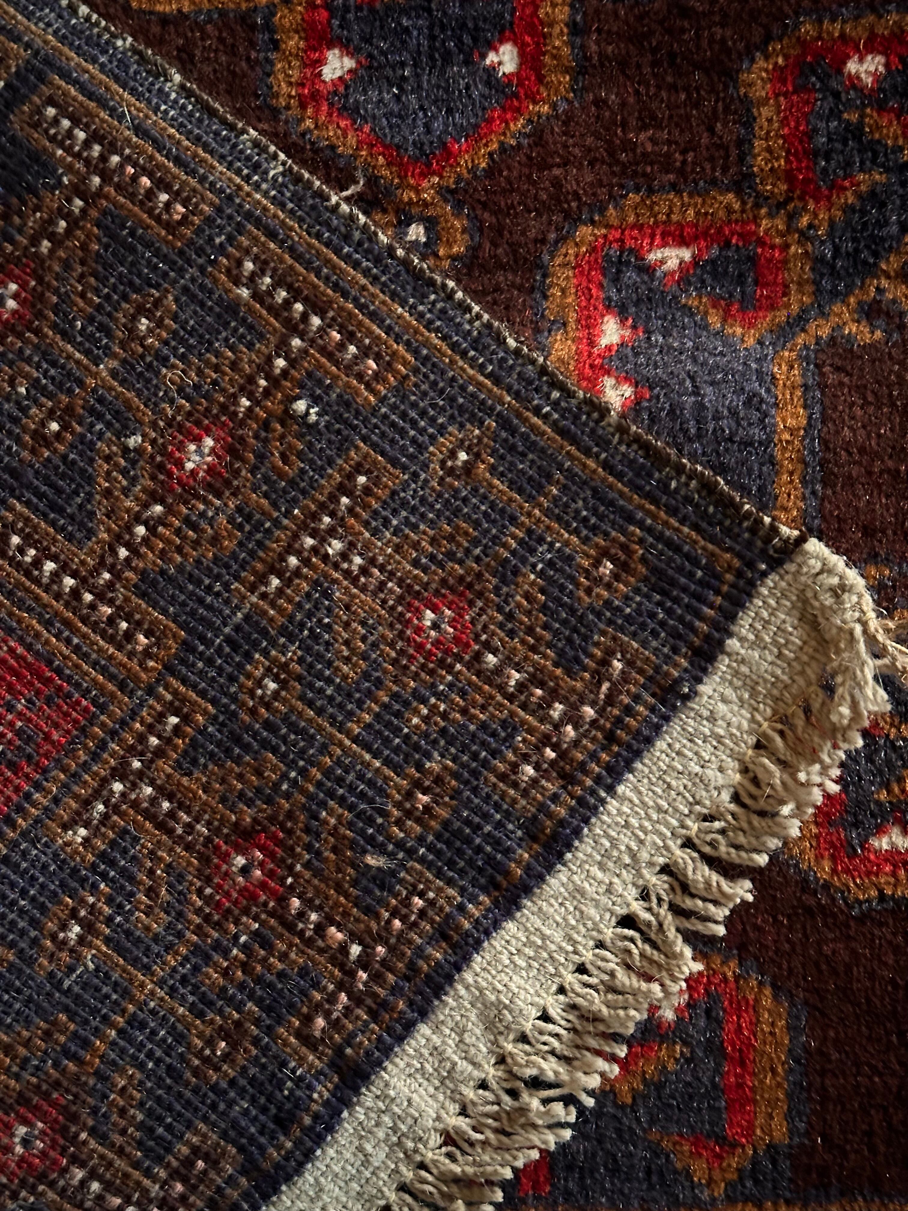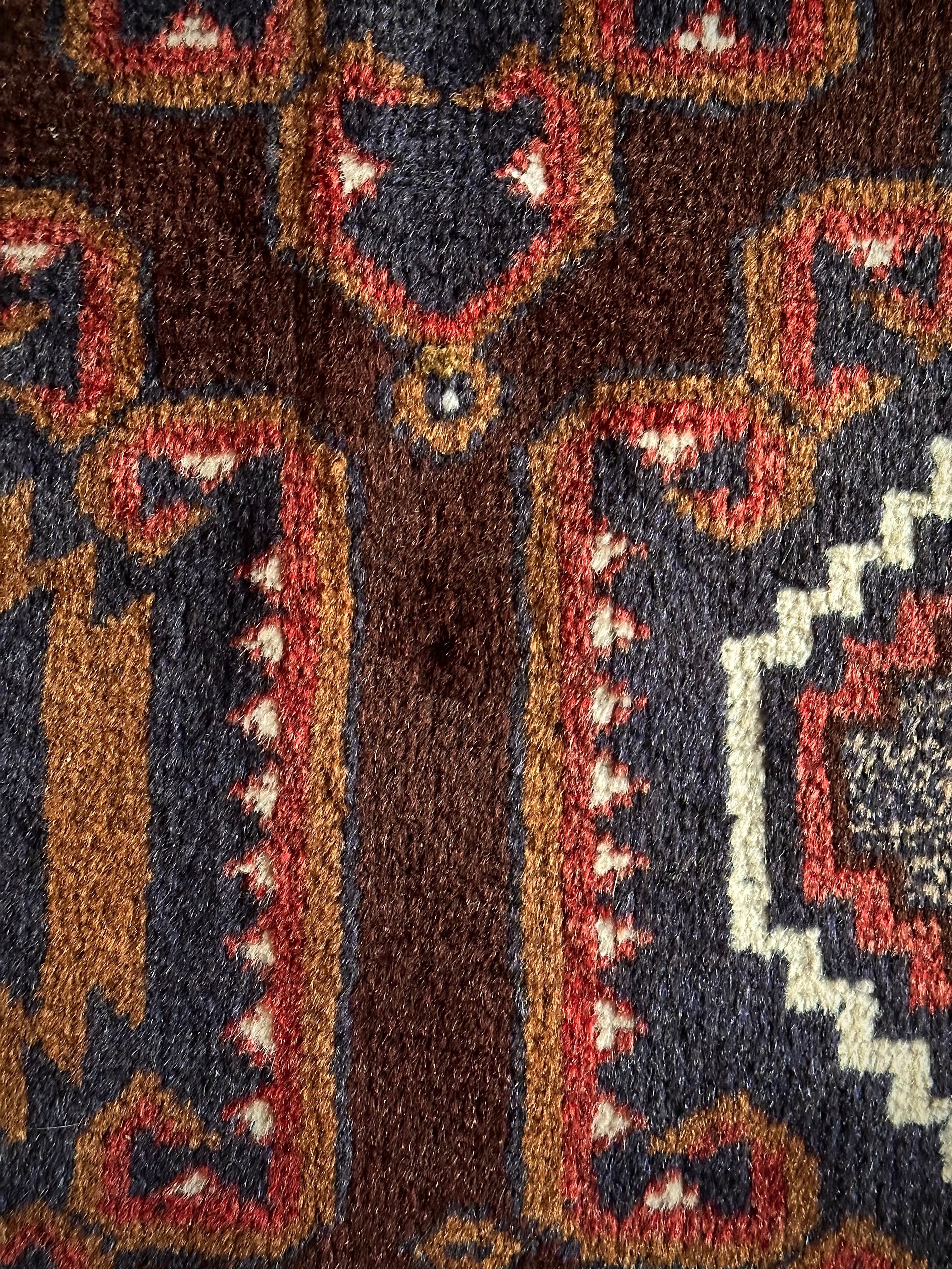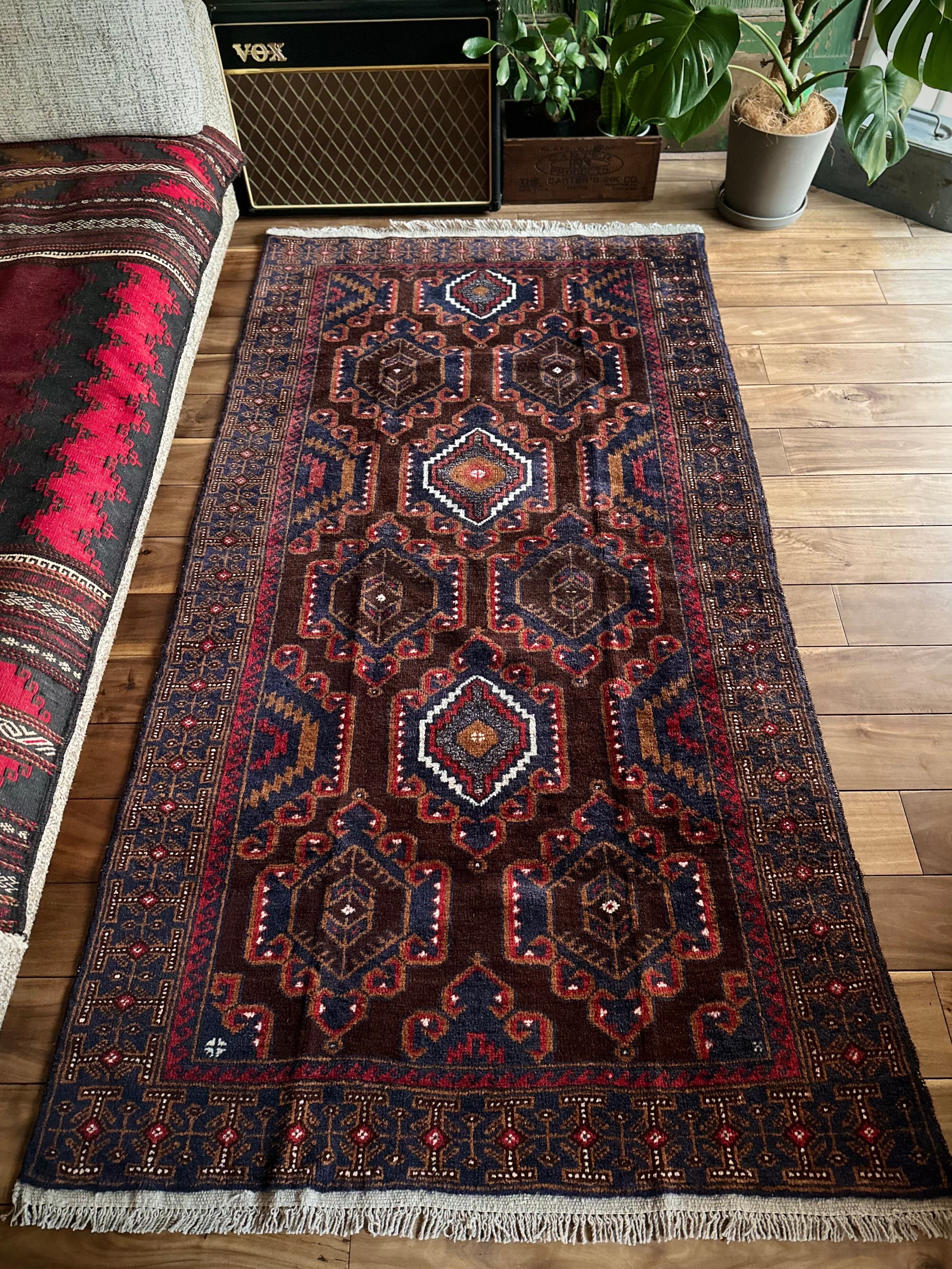 色彩感覚の違いからかマシュハド産バルーチとは一線を画するニュアンスで、織り込まれた紋様からして奇妙でクレイジーなノマディックラグと、個人的見解ながらそう評したくなる奥深さがありますが、遊牧民には国境なんて関係ないようにバルチスタンの大らかさを感じます。