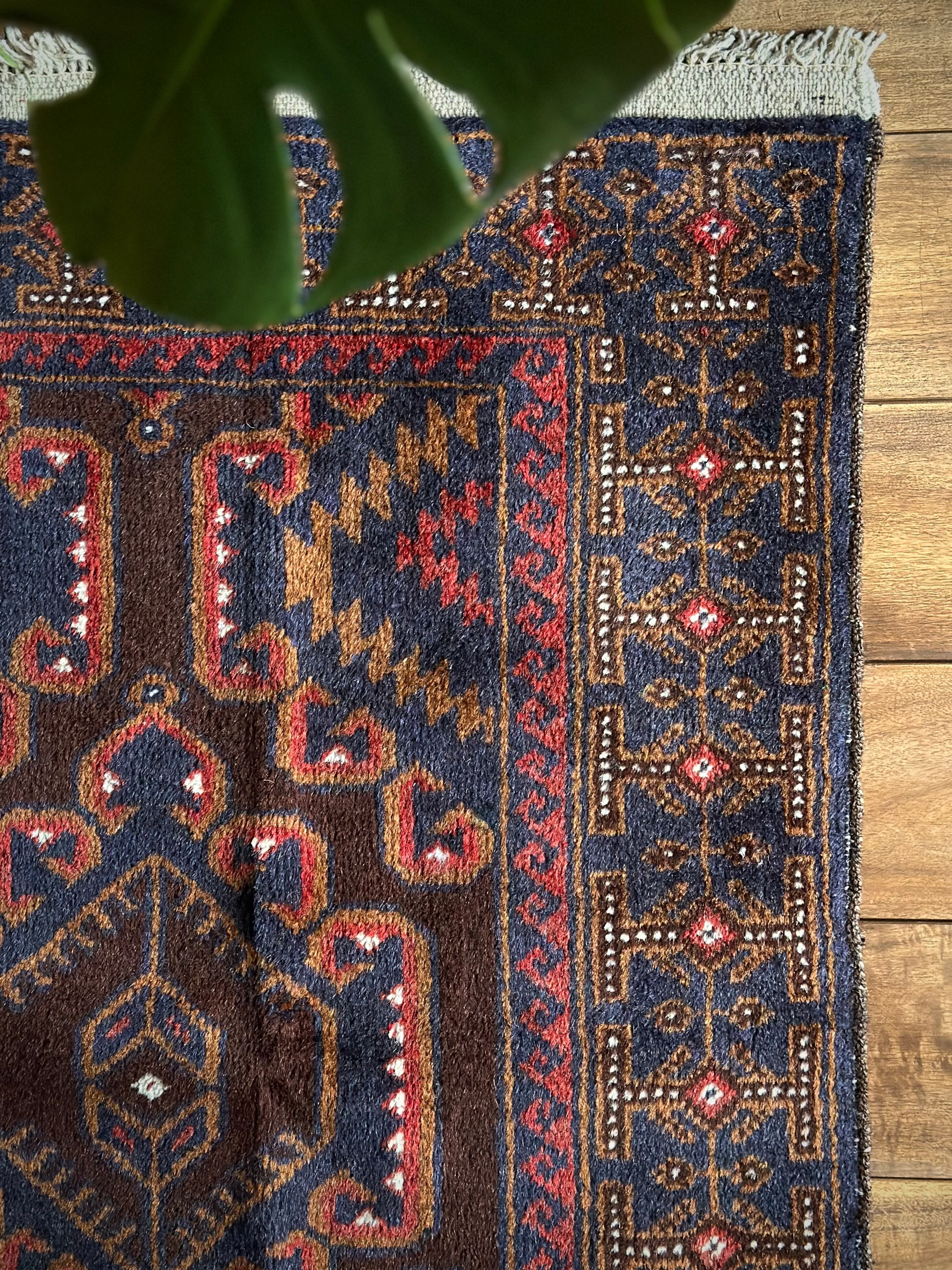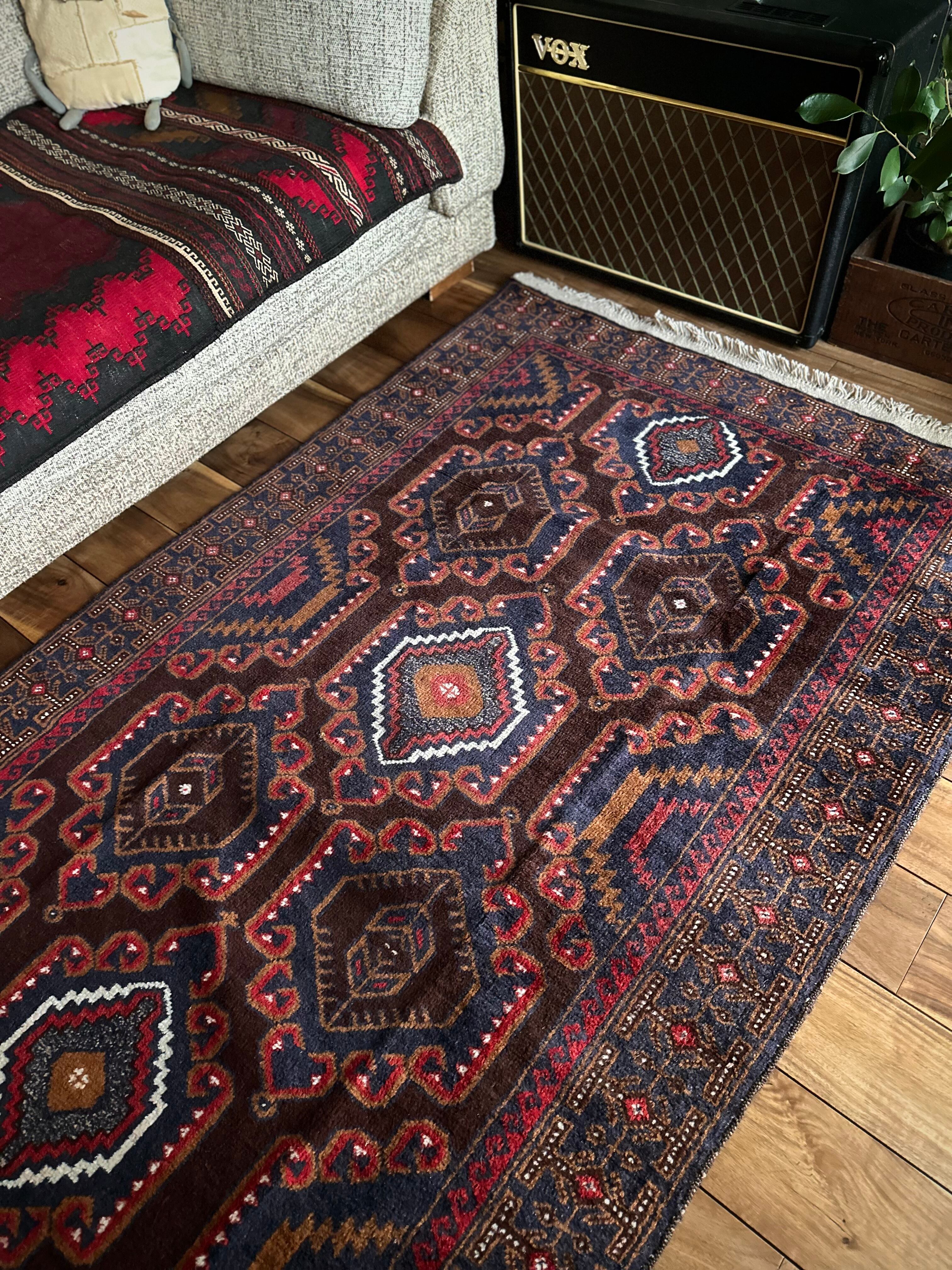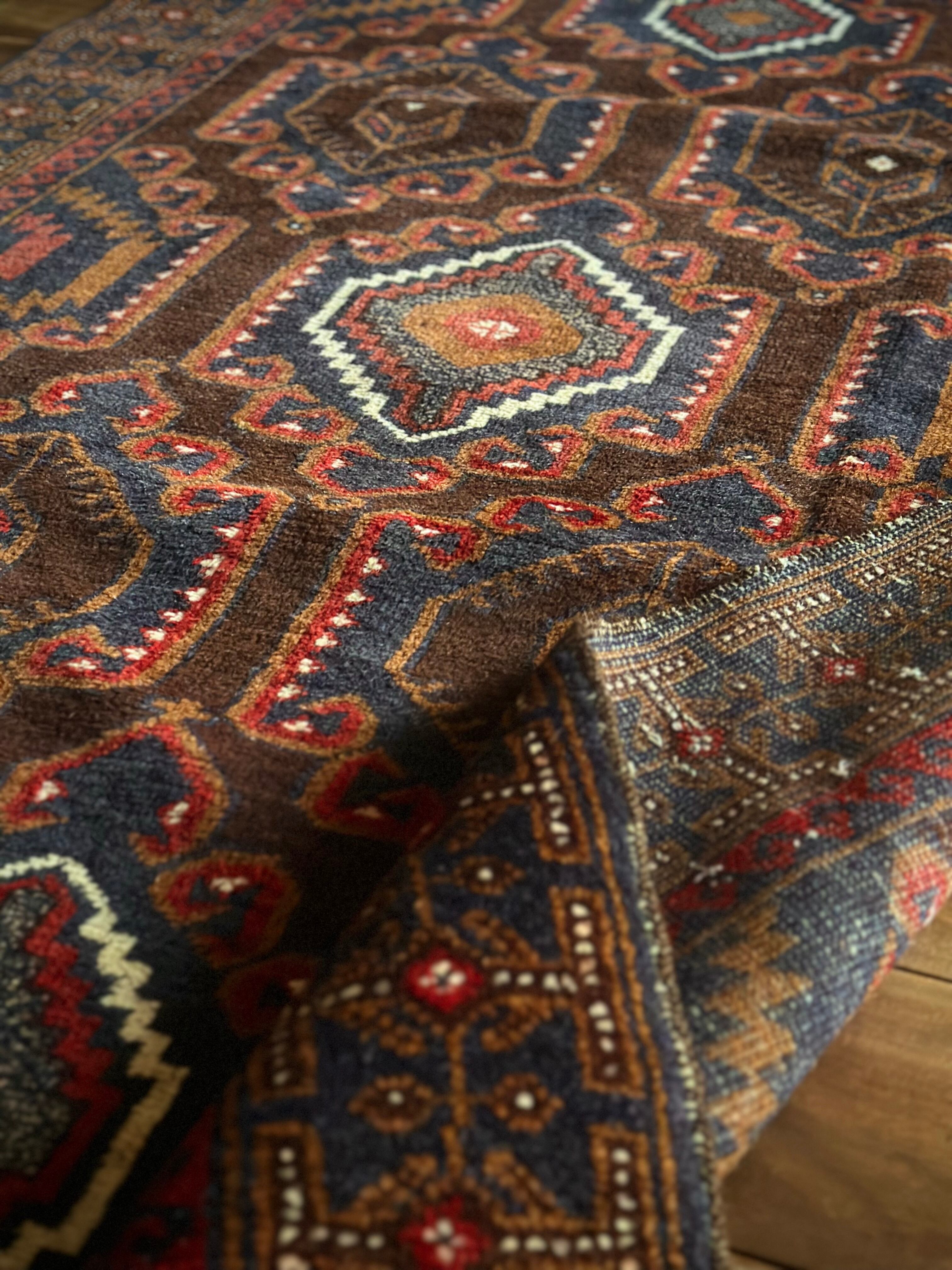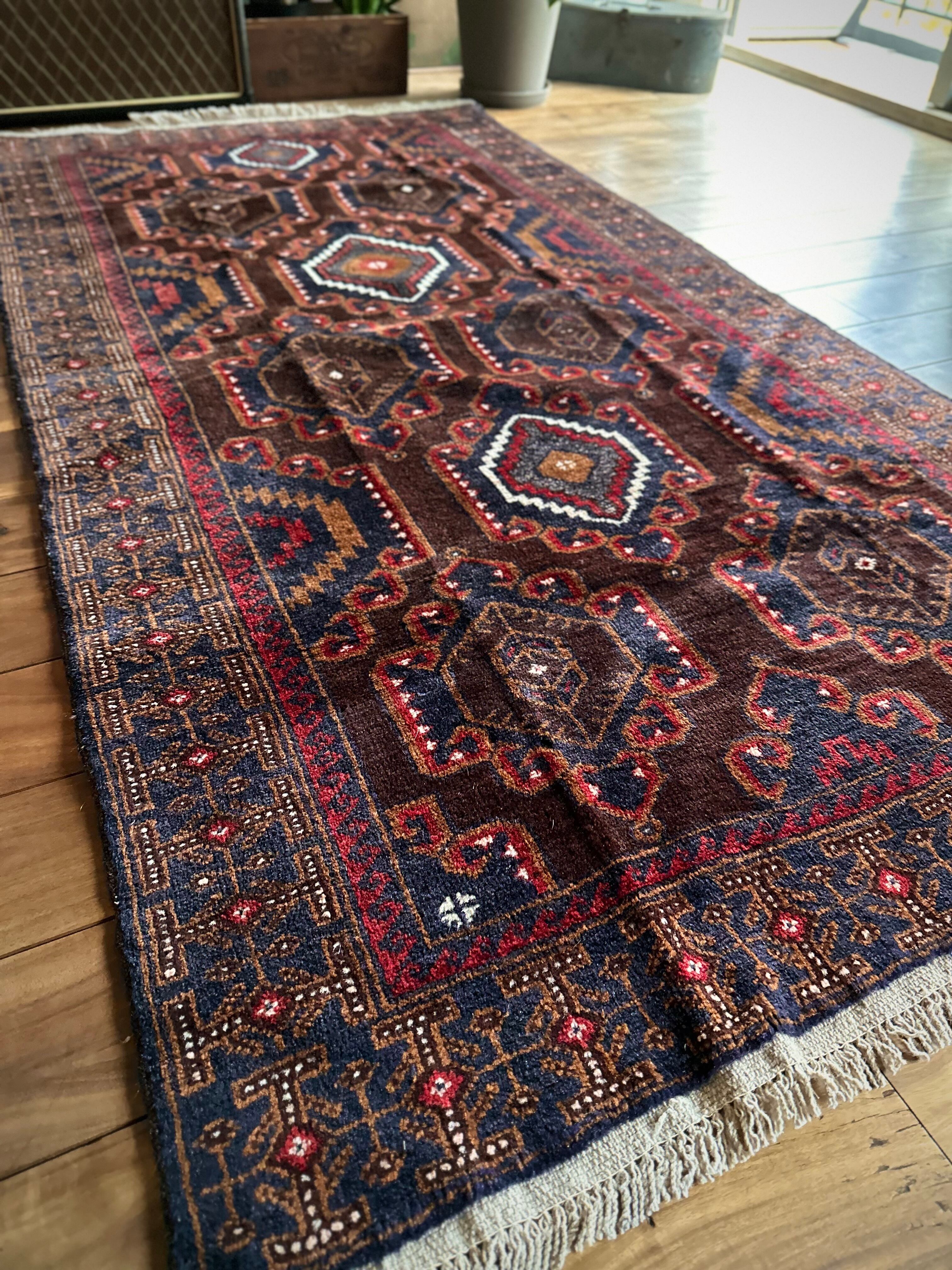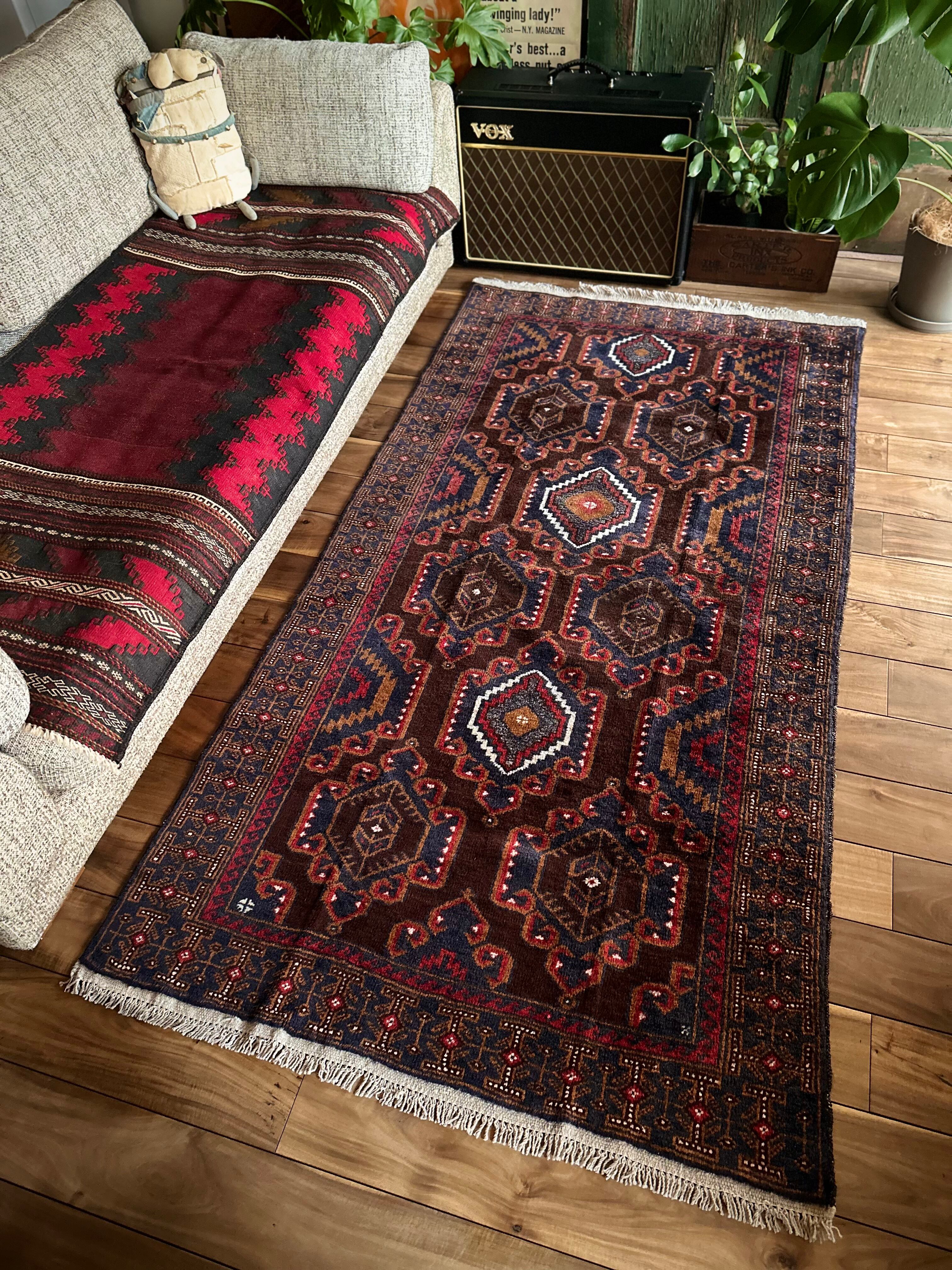 色彩感覚の違いからかマシュハド産バルーチとは一線を画するニュアンスで、織り込まれた紋様からして奇妙でクレイジーなノマディックラグと、個人的見解ながらそう評したくなる奥深さがありますが、遊牧民には国境なんて関係ないようにバルチスタンの大らかさを感じます。