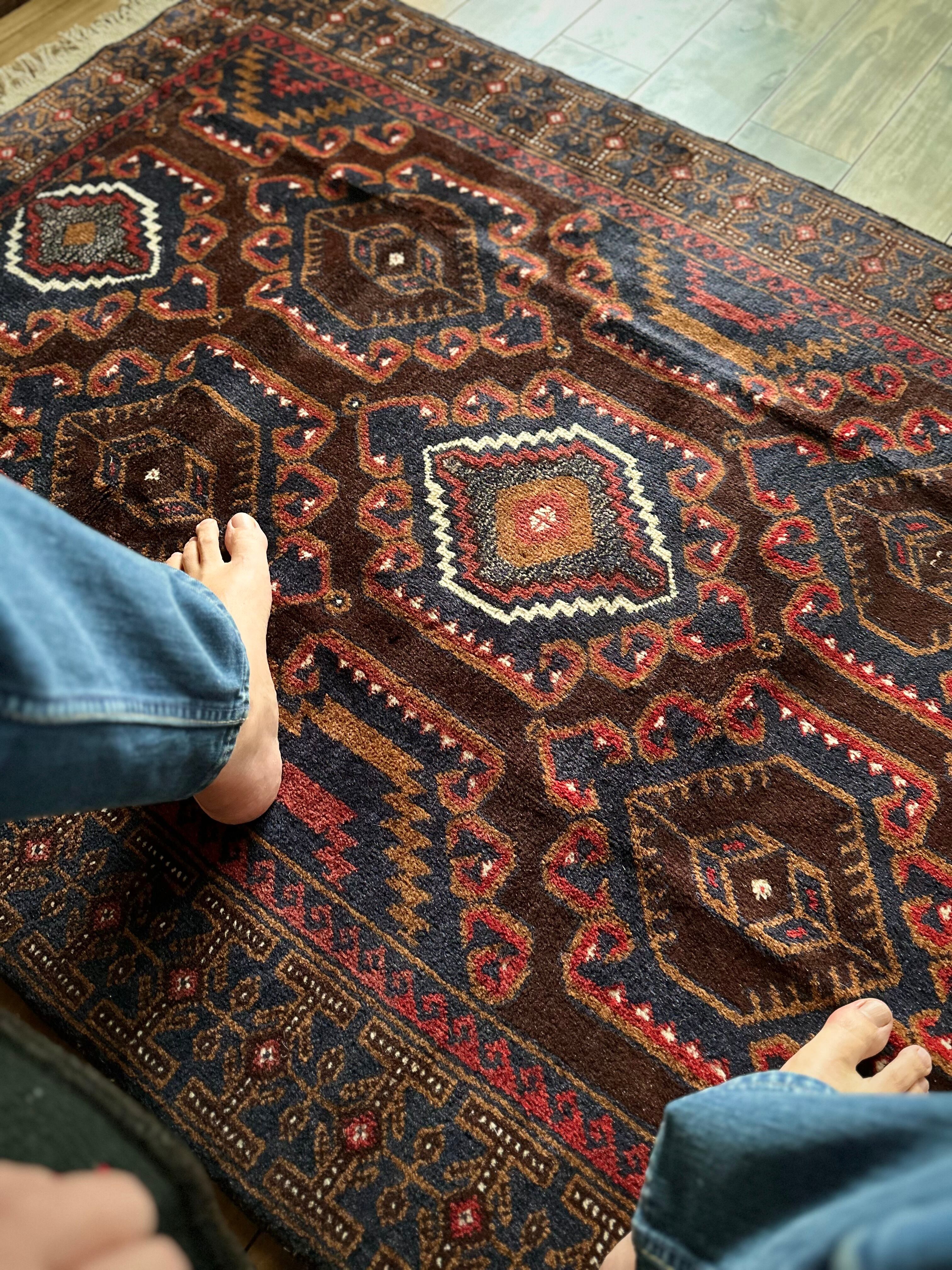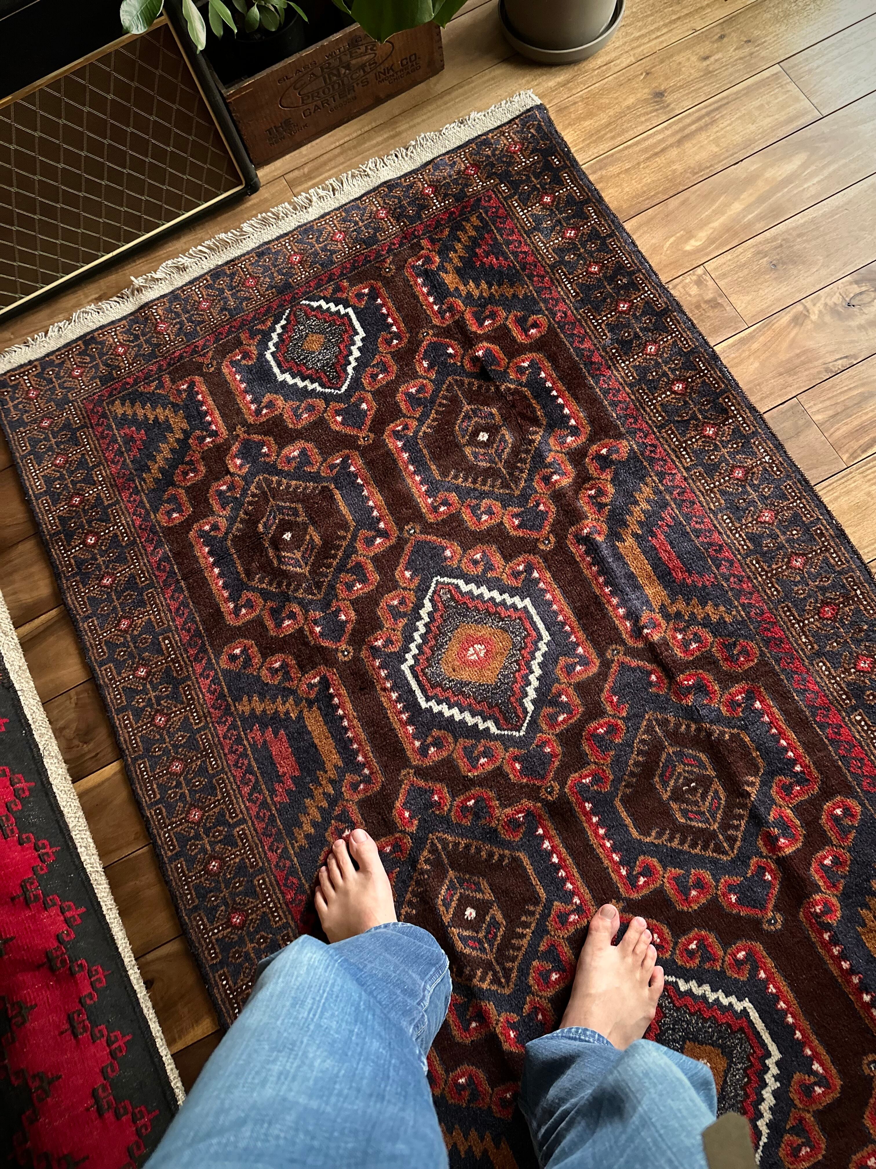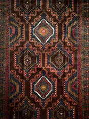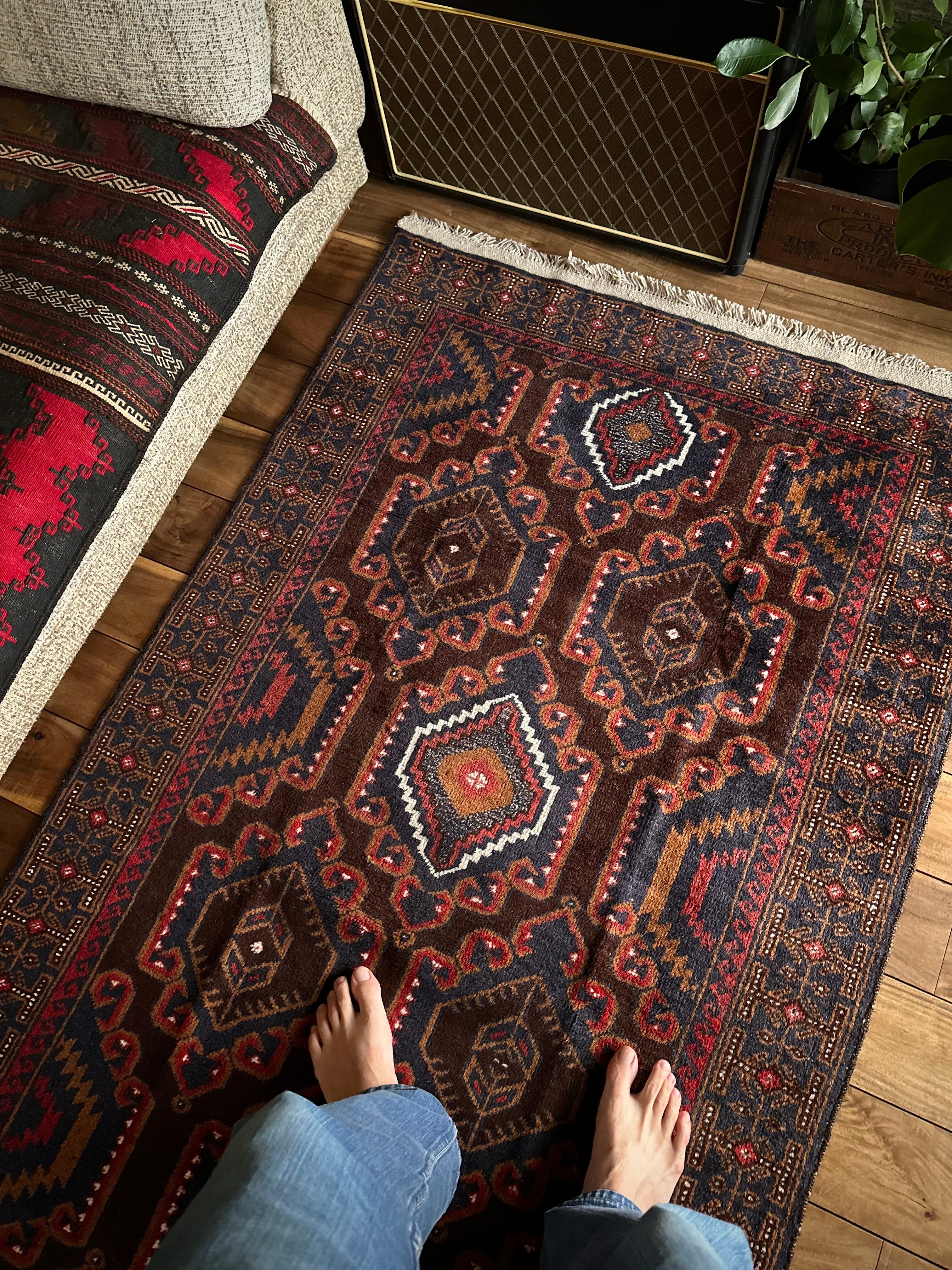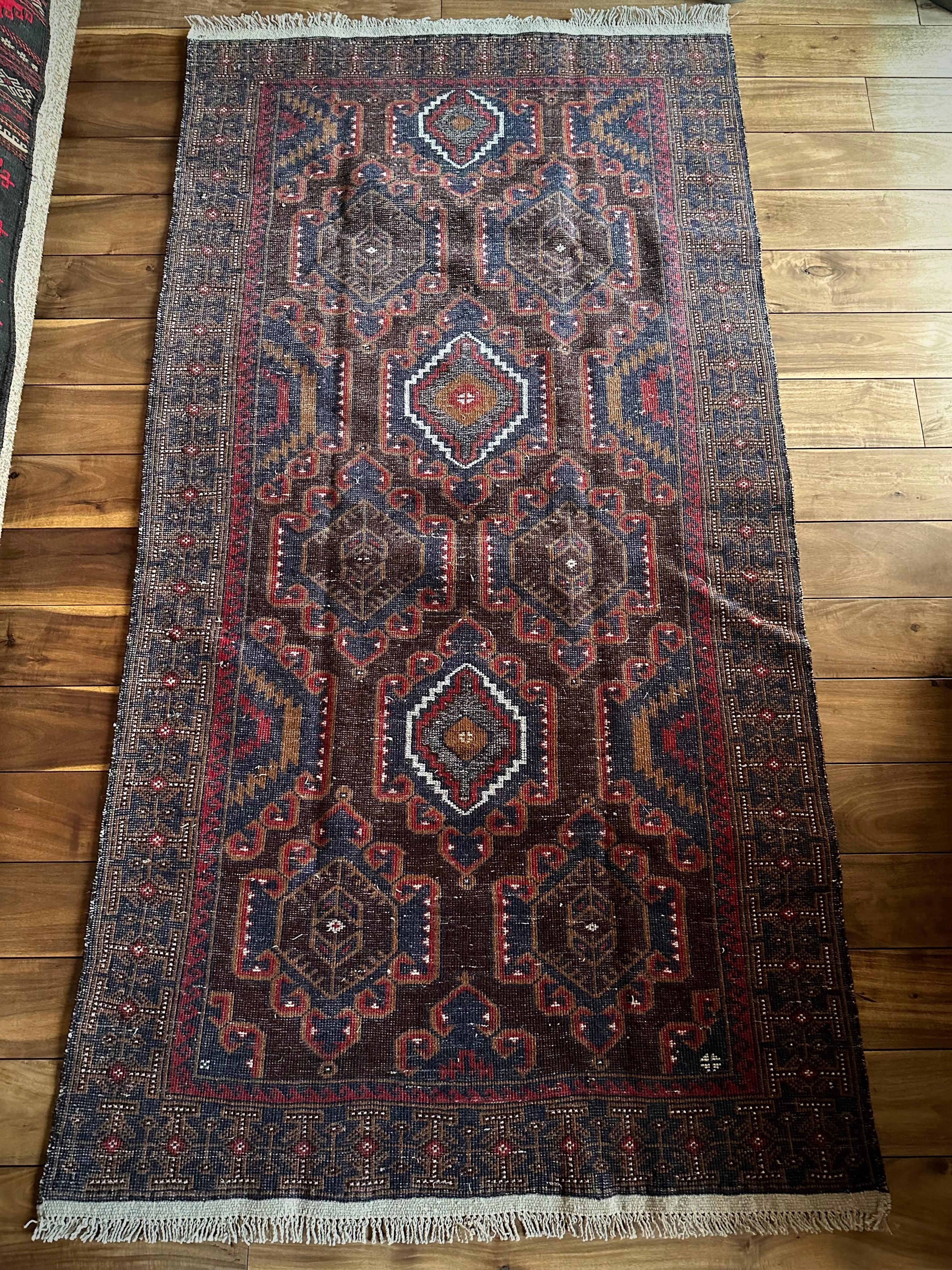 色彩感覚の違いからかマシュハド産バルーチとは一線を画するニュアンスで、織り込まれた紋様からして奇妙でクレイジーなノマディックラグと、個人的見解ながらそう評したくなる奥深さがありますが、遊牧民には国境なんて関係ないようにバルチスタンの大らかさを感じます。