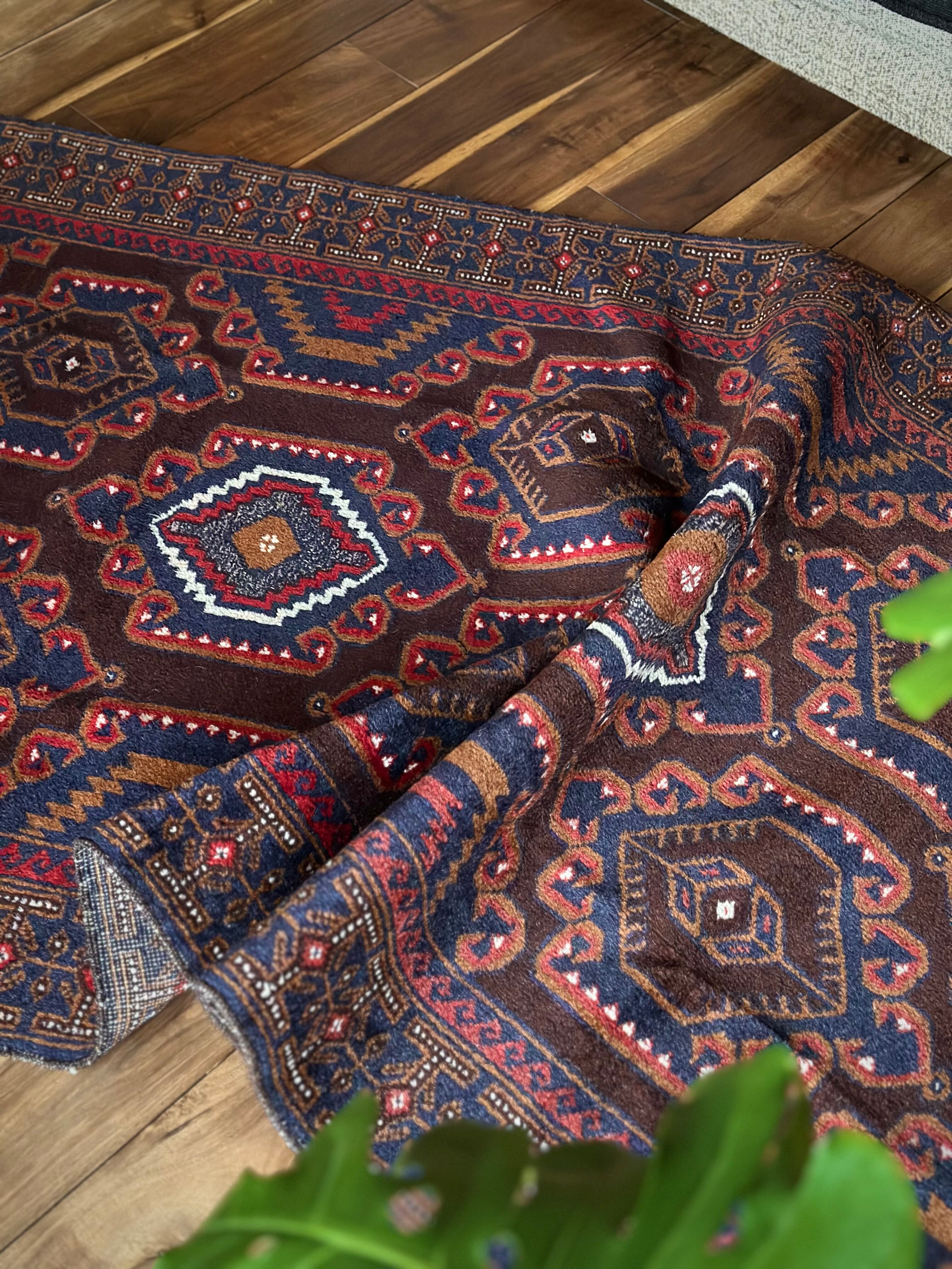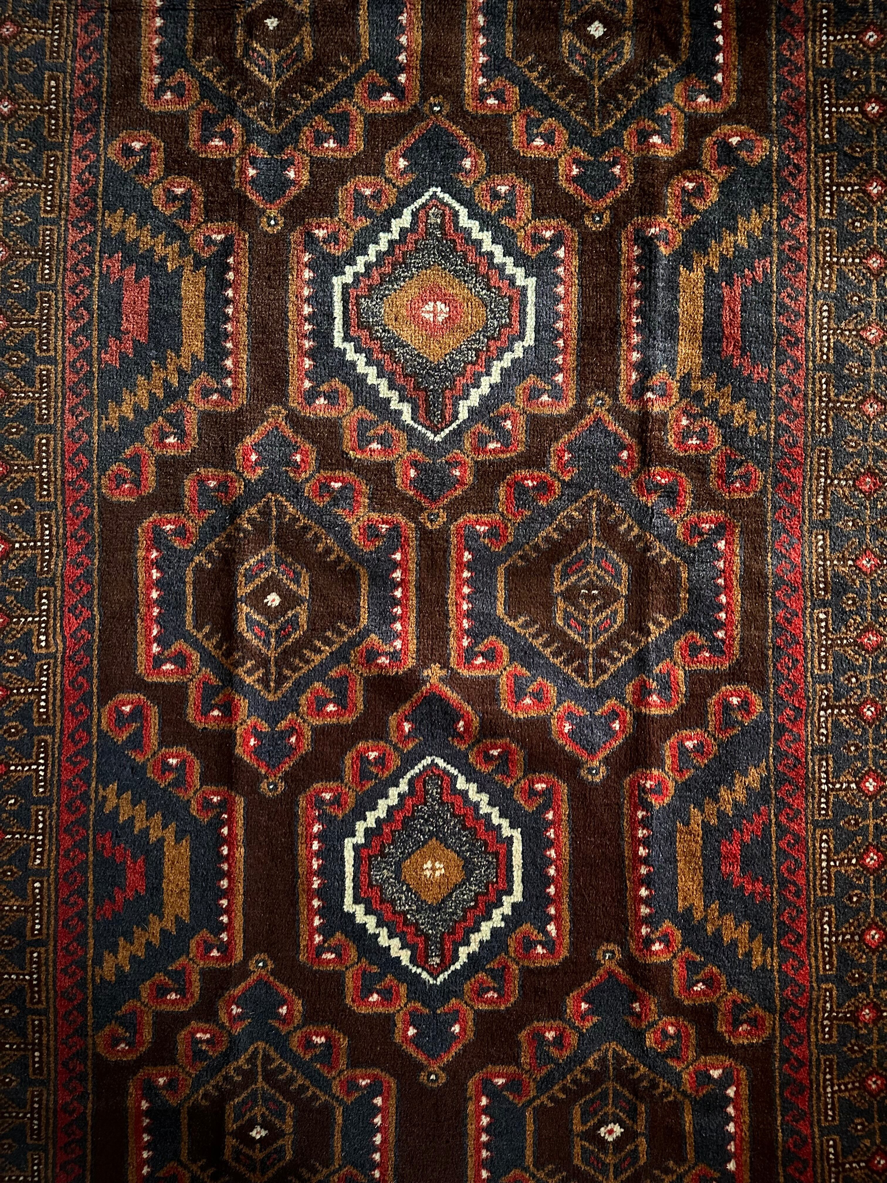 なんともケバい印象が拭えないこちらは、濃い焦げ茶色のブラウンをベースに、ネイビーのボーダーが引き締まった感を与えているヘラート産バルーチ族のトライバルラグで、こういった暗いながらもパキッとした独特な絵柄がアフガンラグの真骨頂だと思わせてくれる1枚になります。