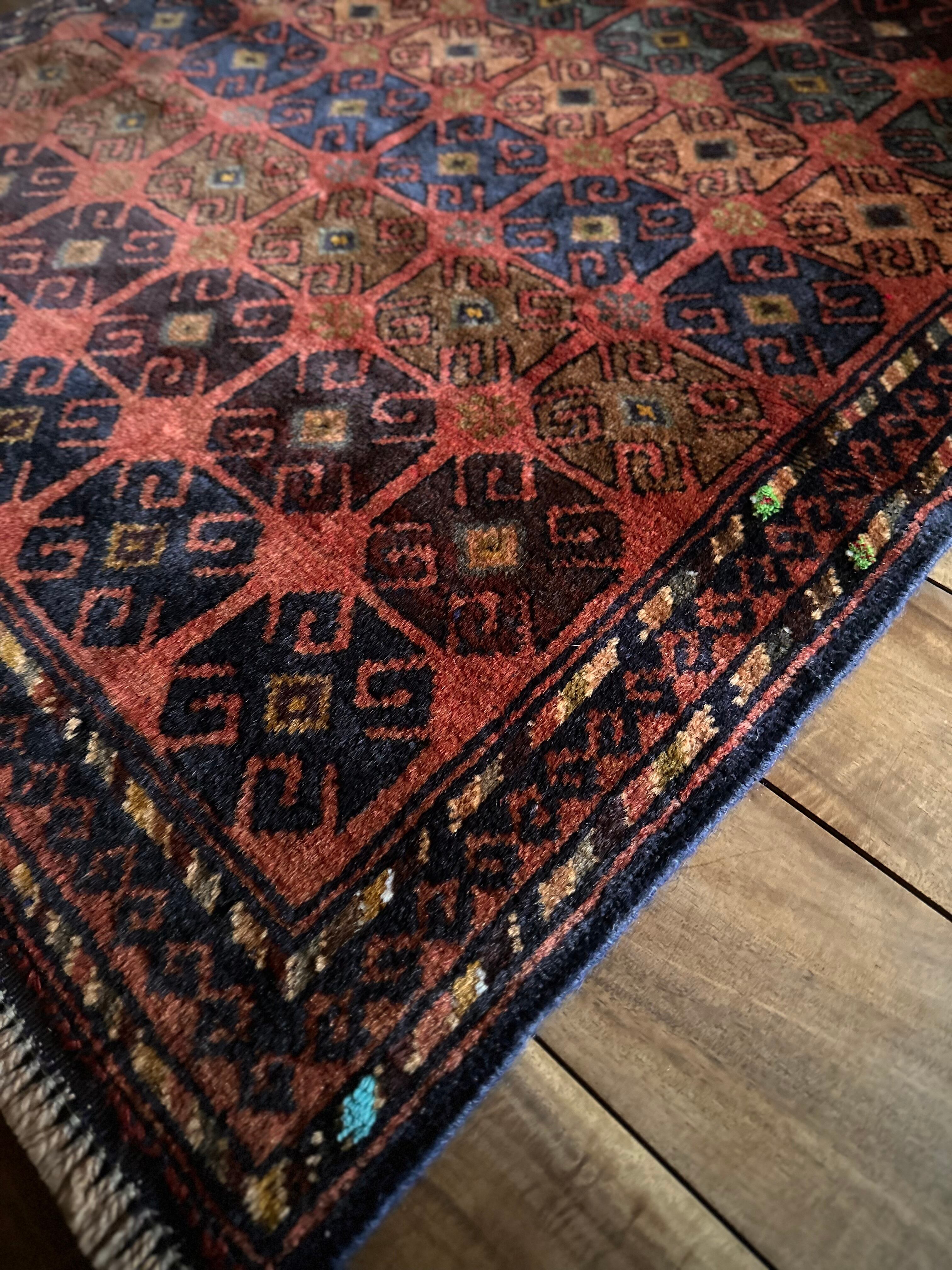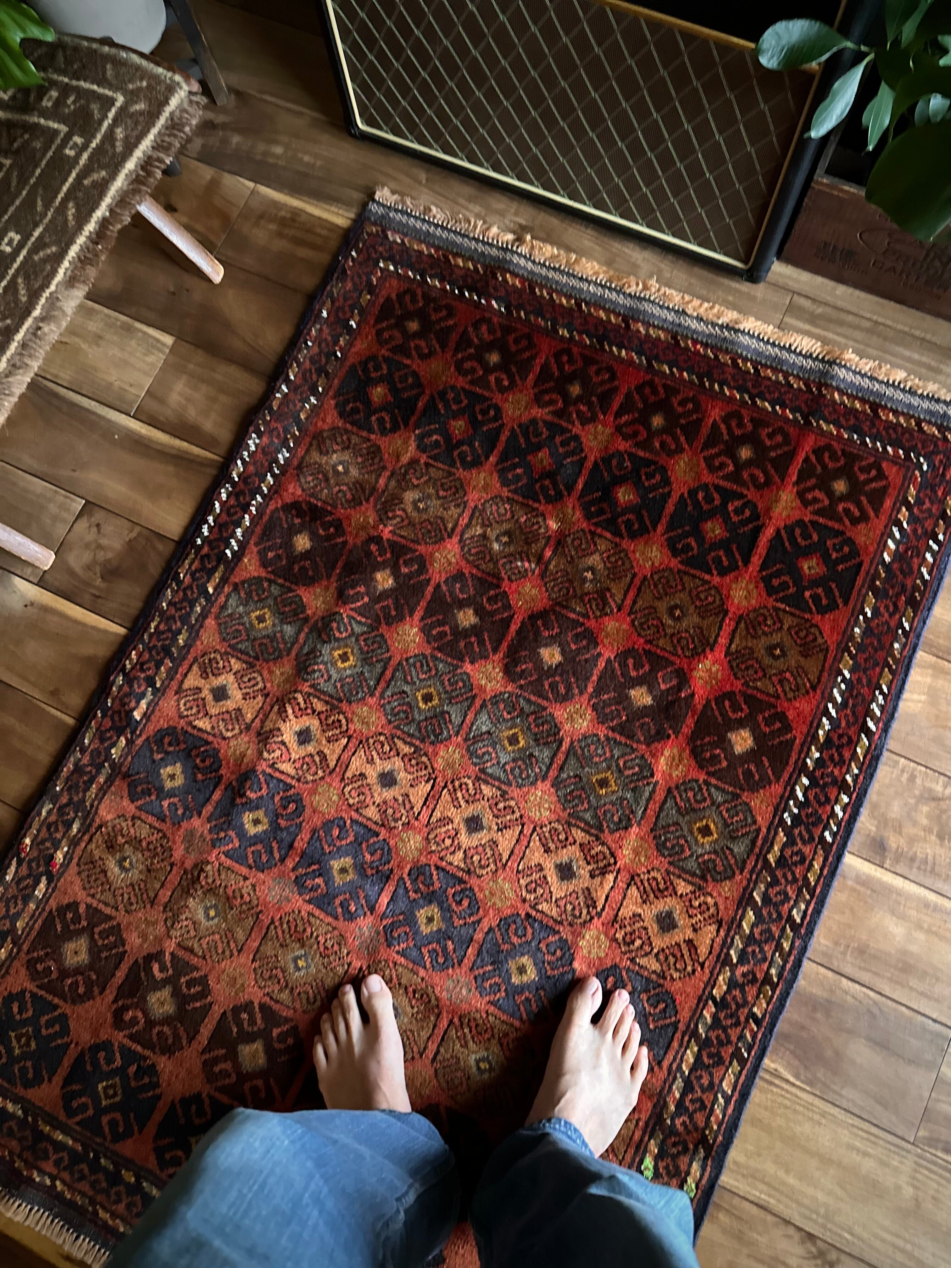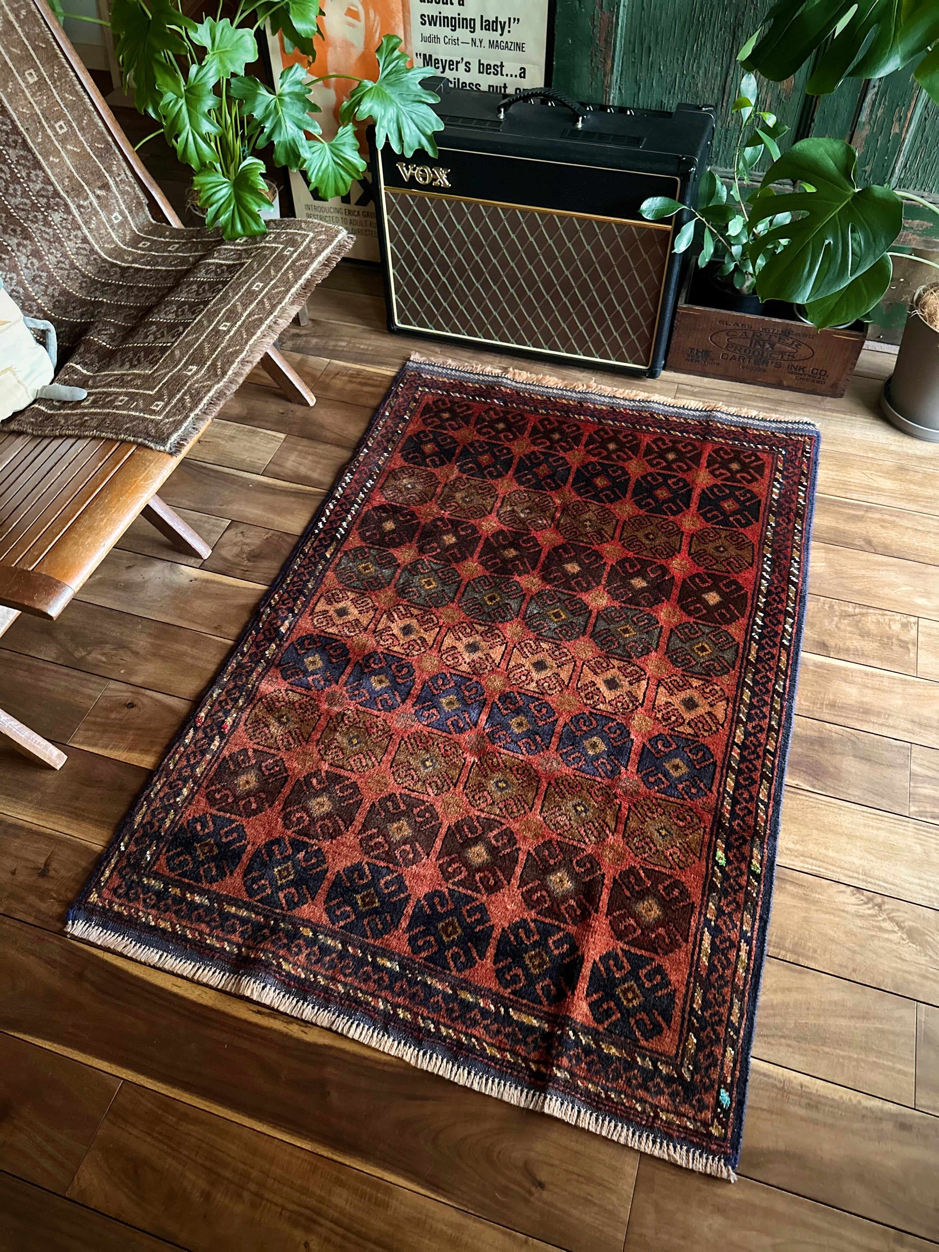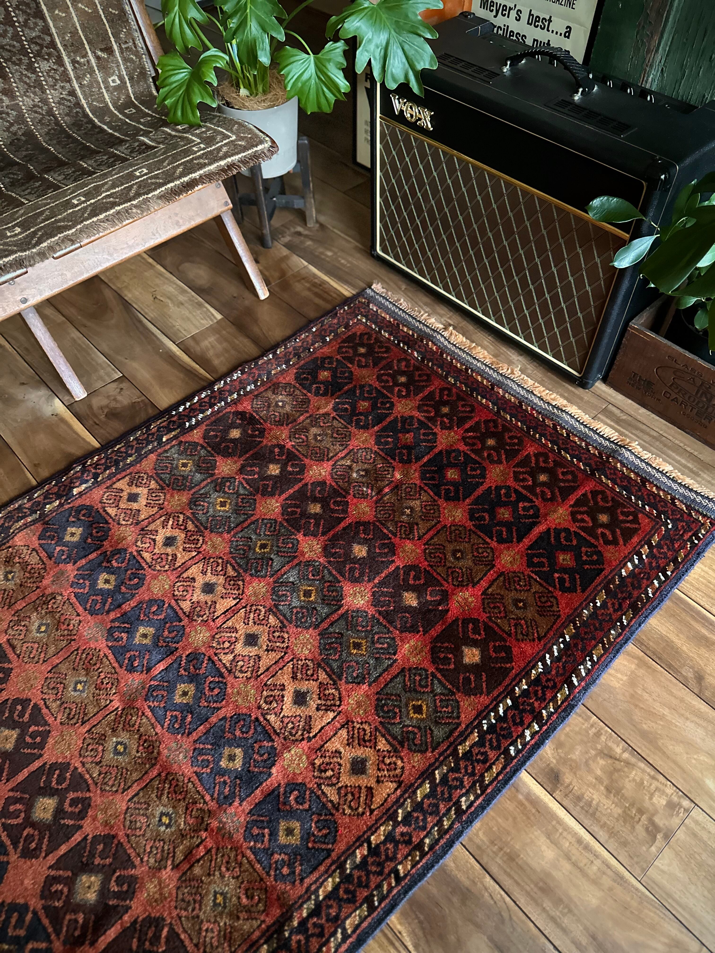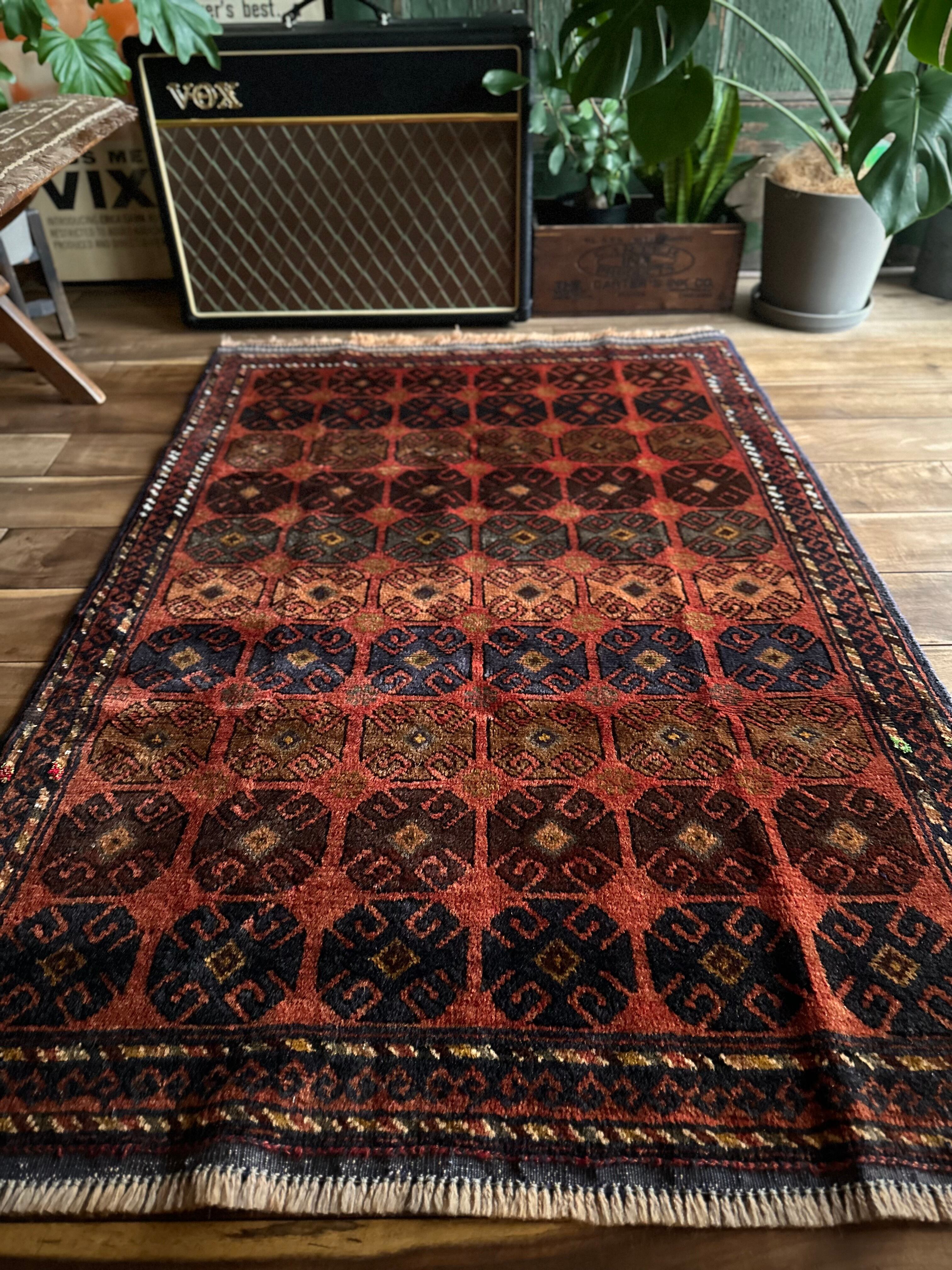 赤レンガ色のテラコッタをベースに、シンプルながらも部族らしい連続紋様がびっしりと並んだかっこいいラグで、アフガニスタン西部のヘラート近郊で半遊牧生活を送るマルダリ・バルーチ族のトライバルラグになります。