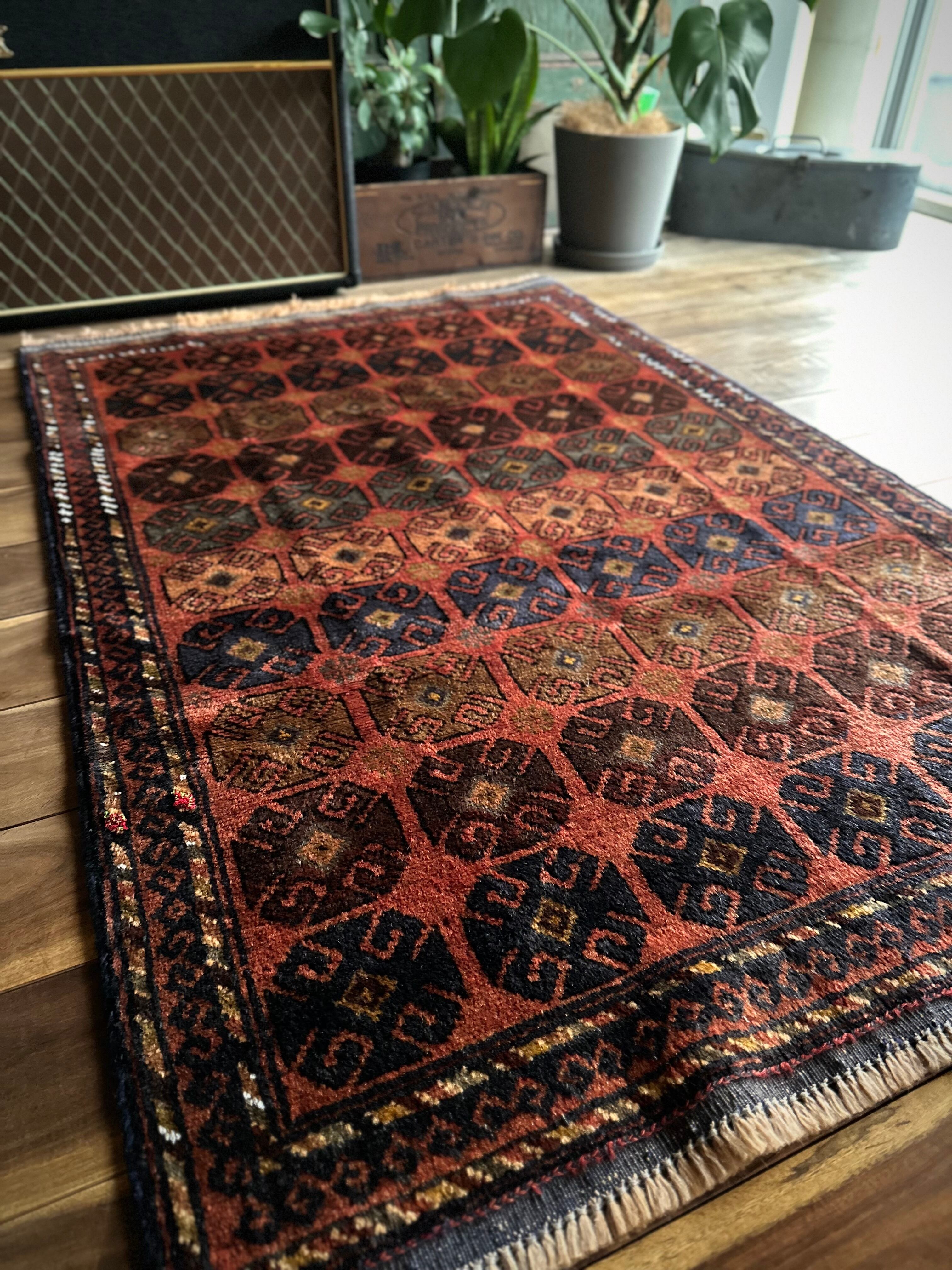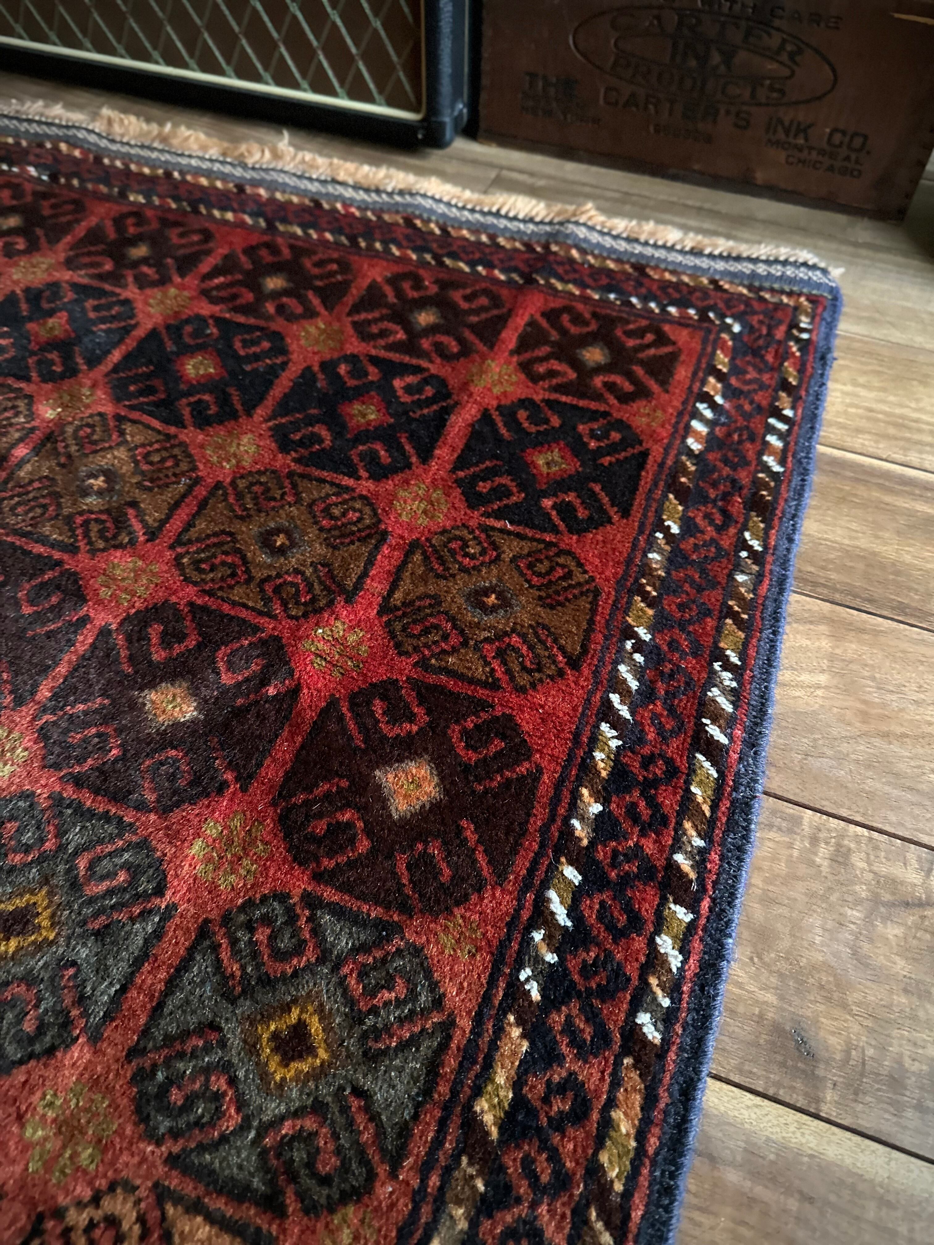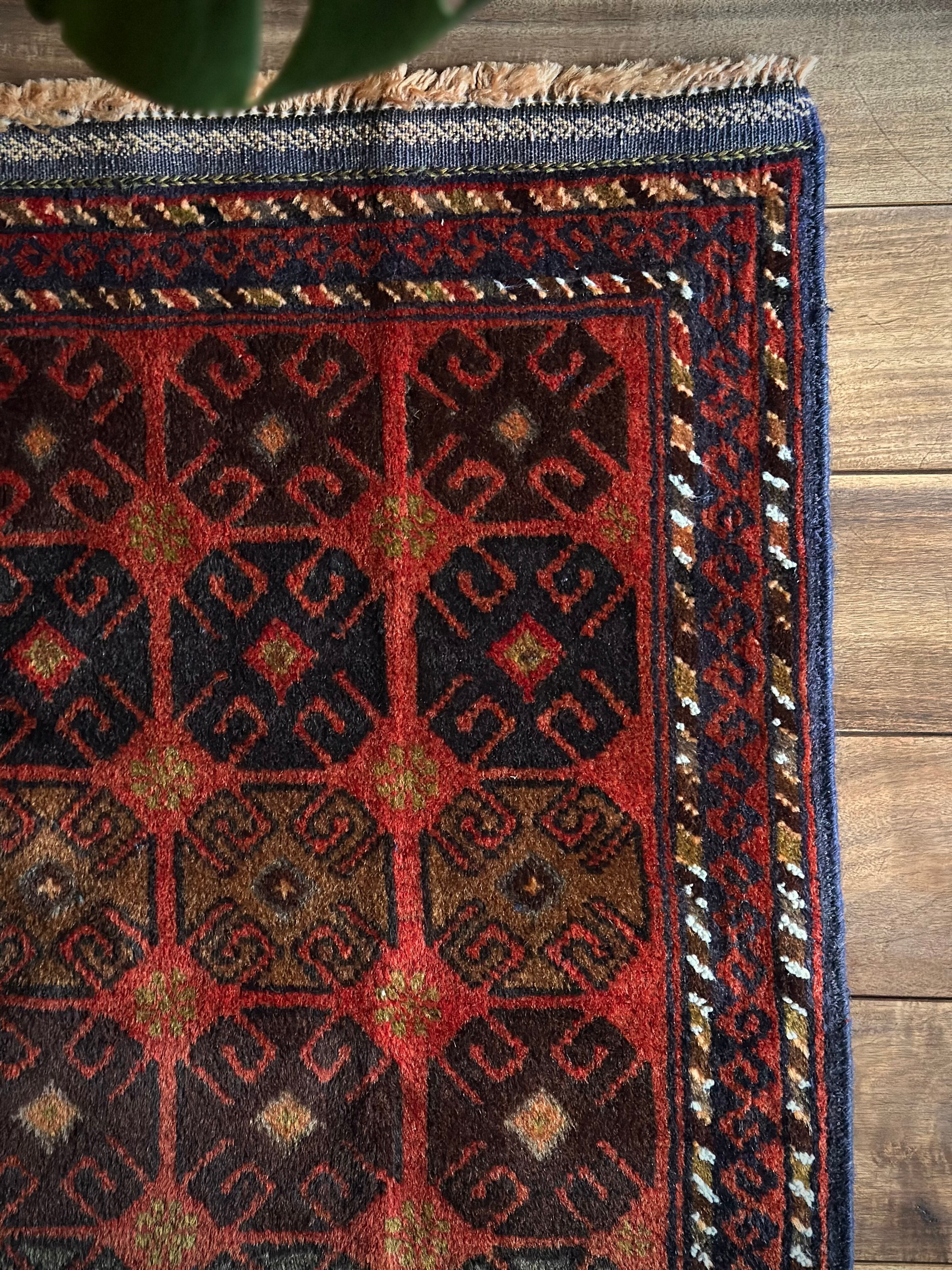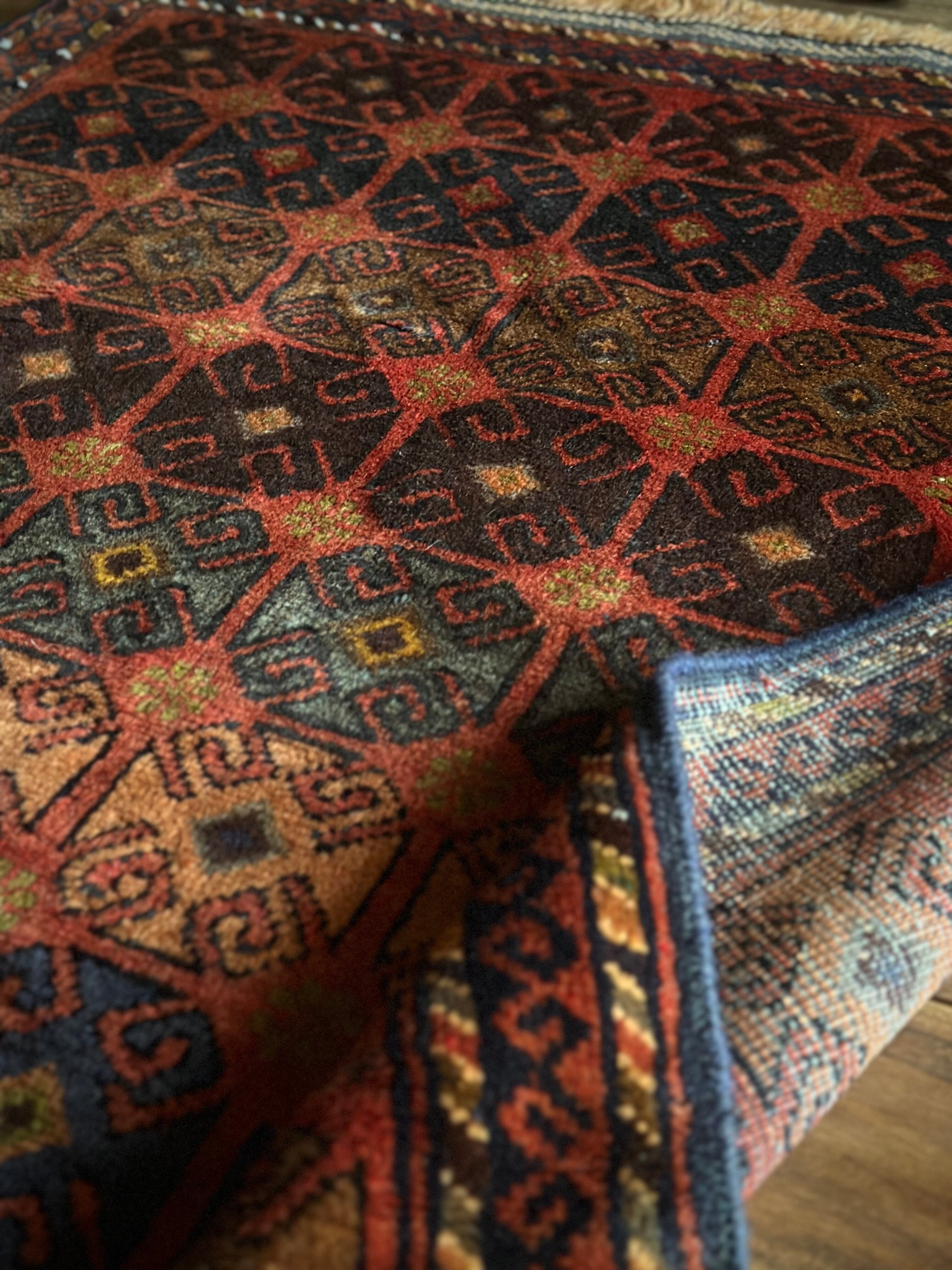 赤レンガ色のテラコッタをベースに、シンプルながらも部族らしい連続紋様がびっしりと並んだかっこいいラグで、アフガニスタン西部のヘラート近郊で半遊牧生活を送るマルダリ・バルーチ族のトライバルラグになります。