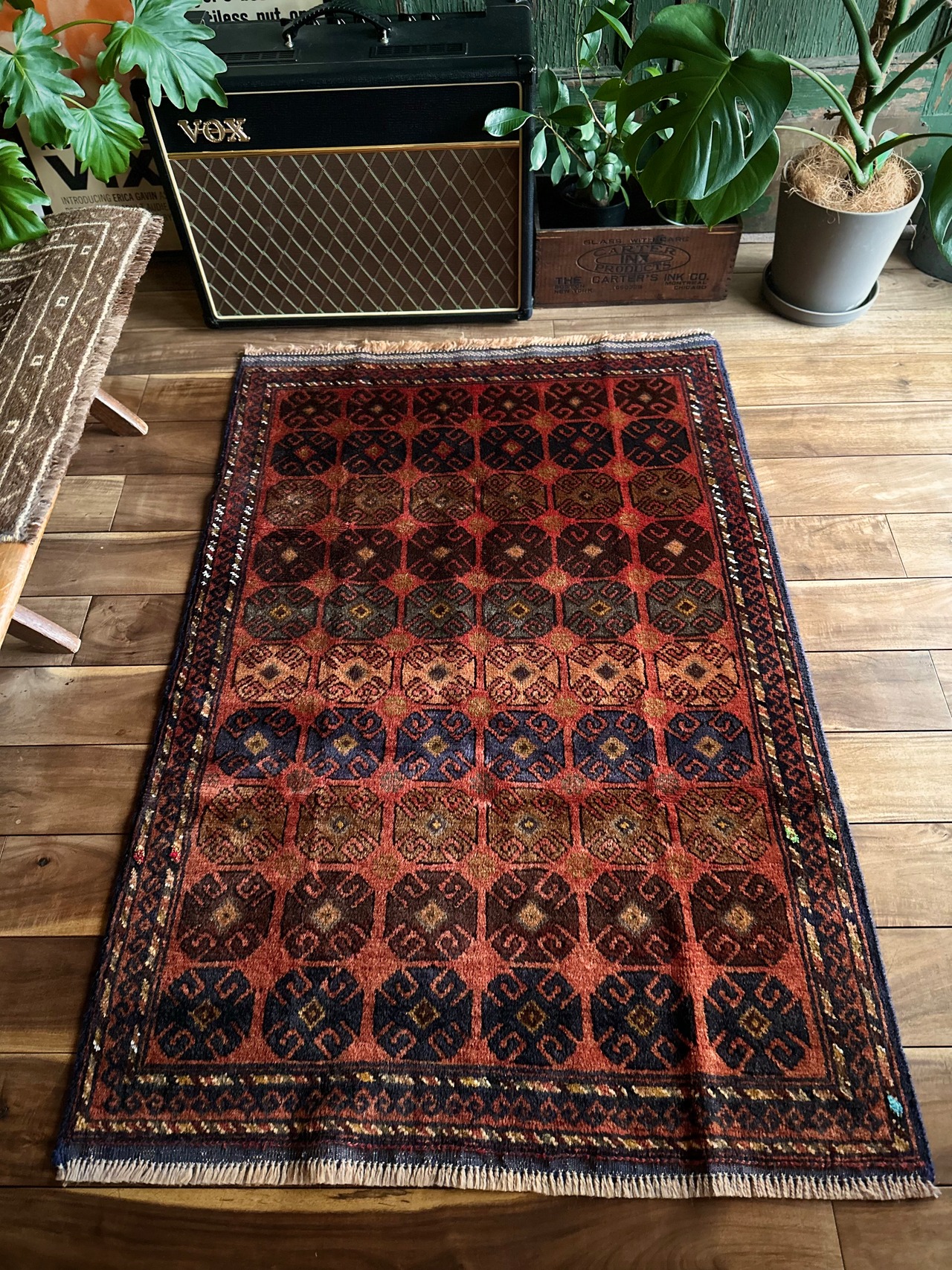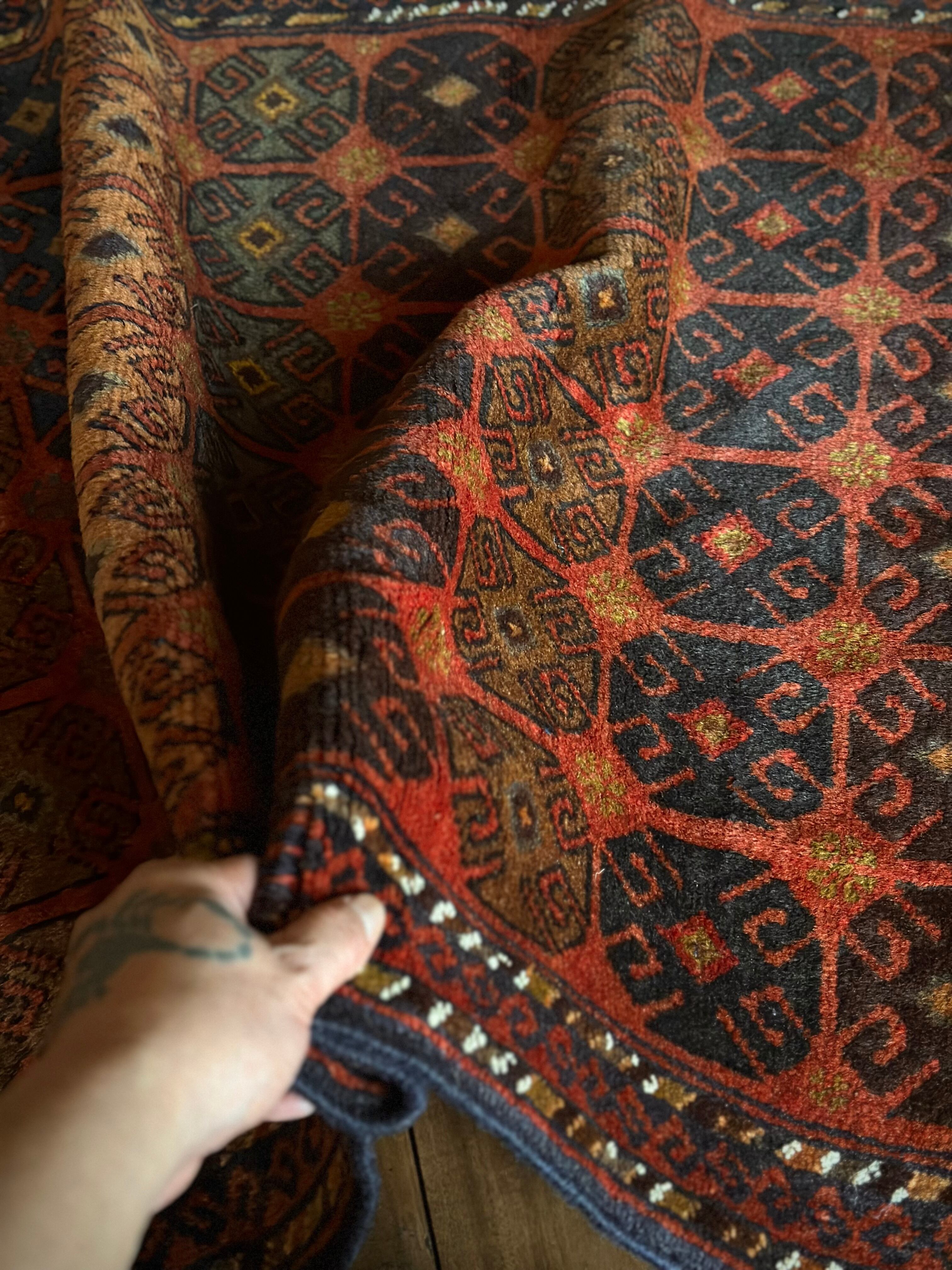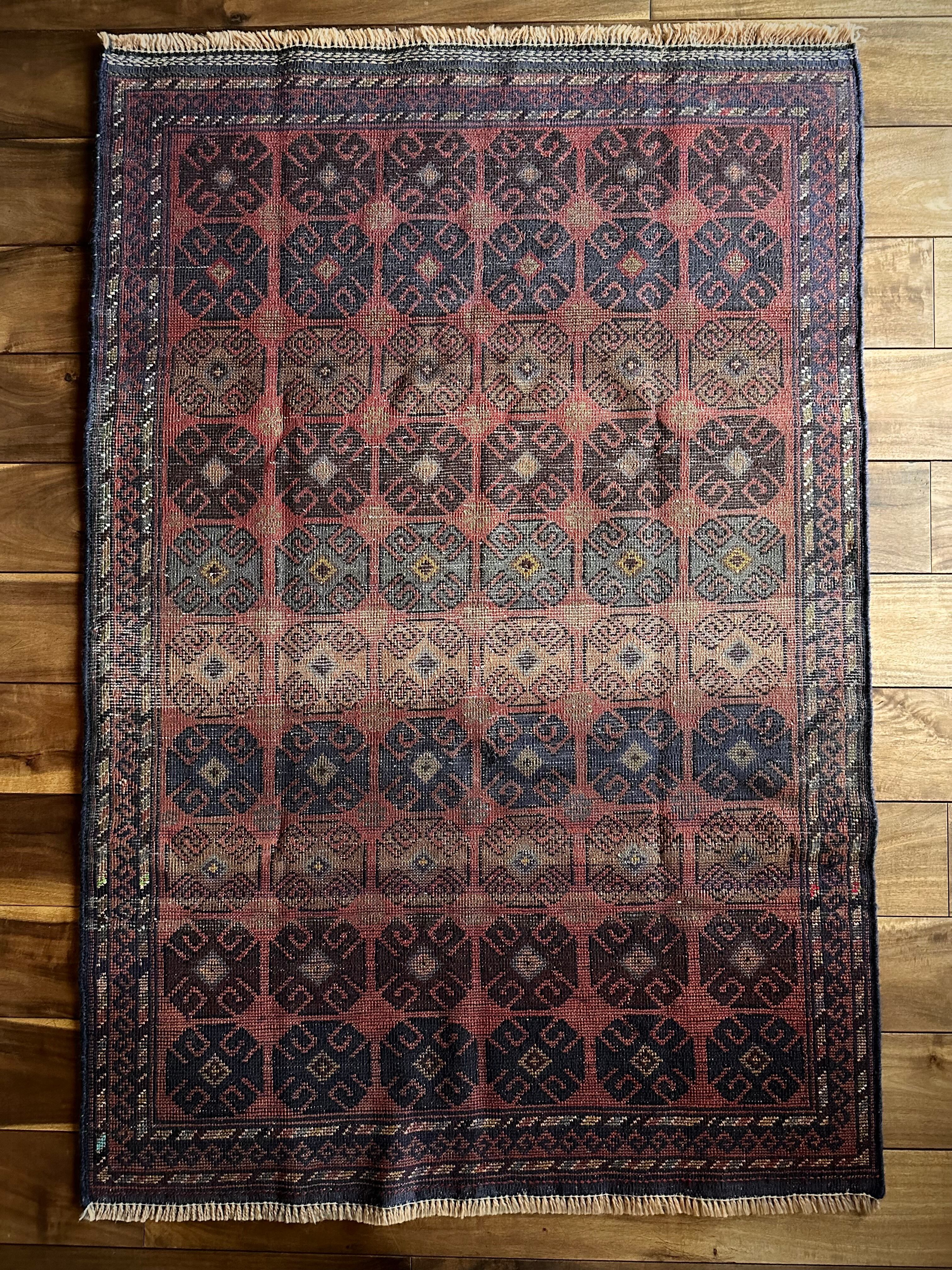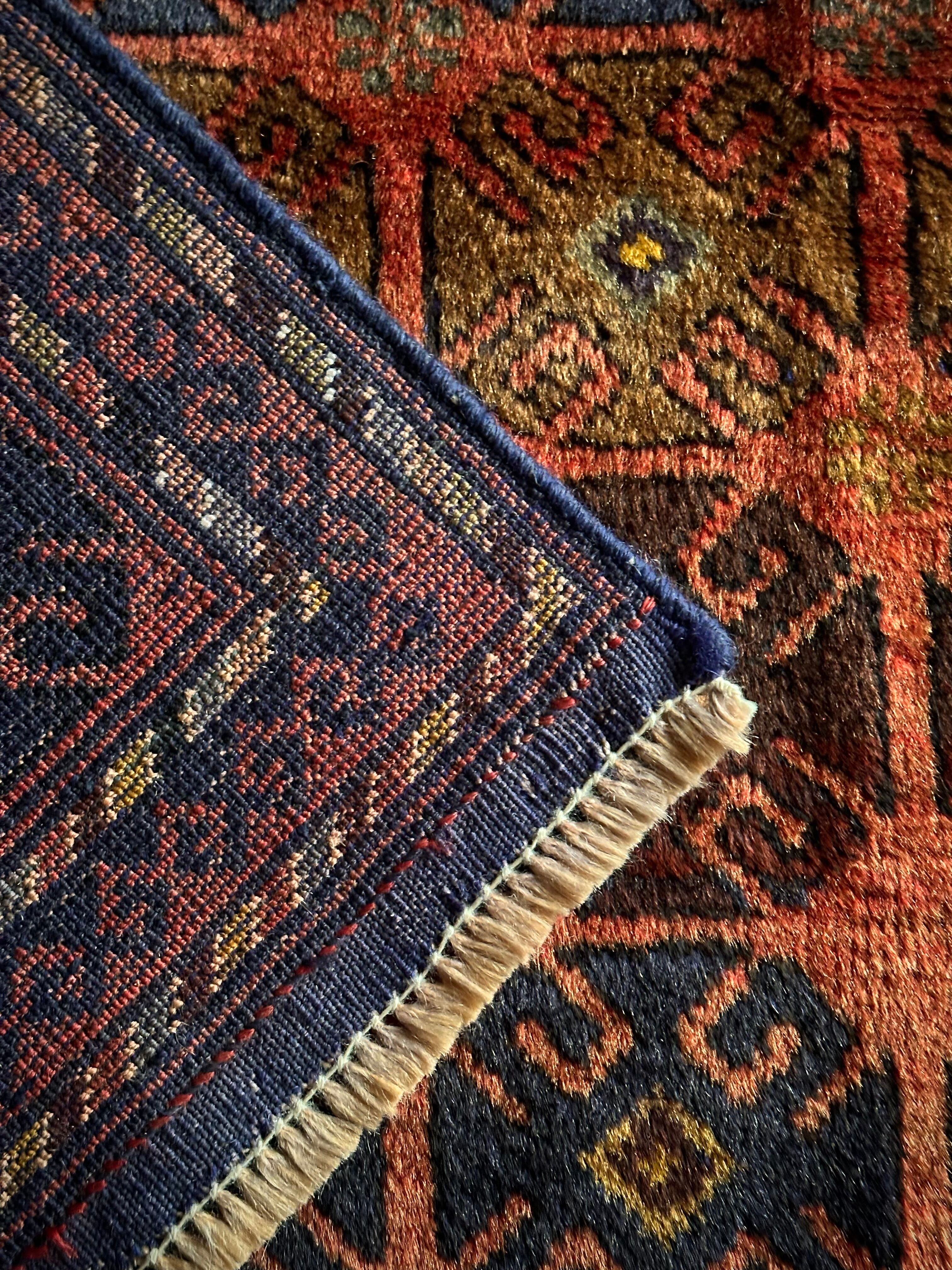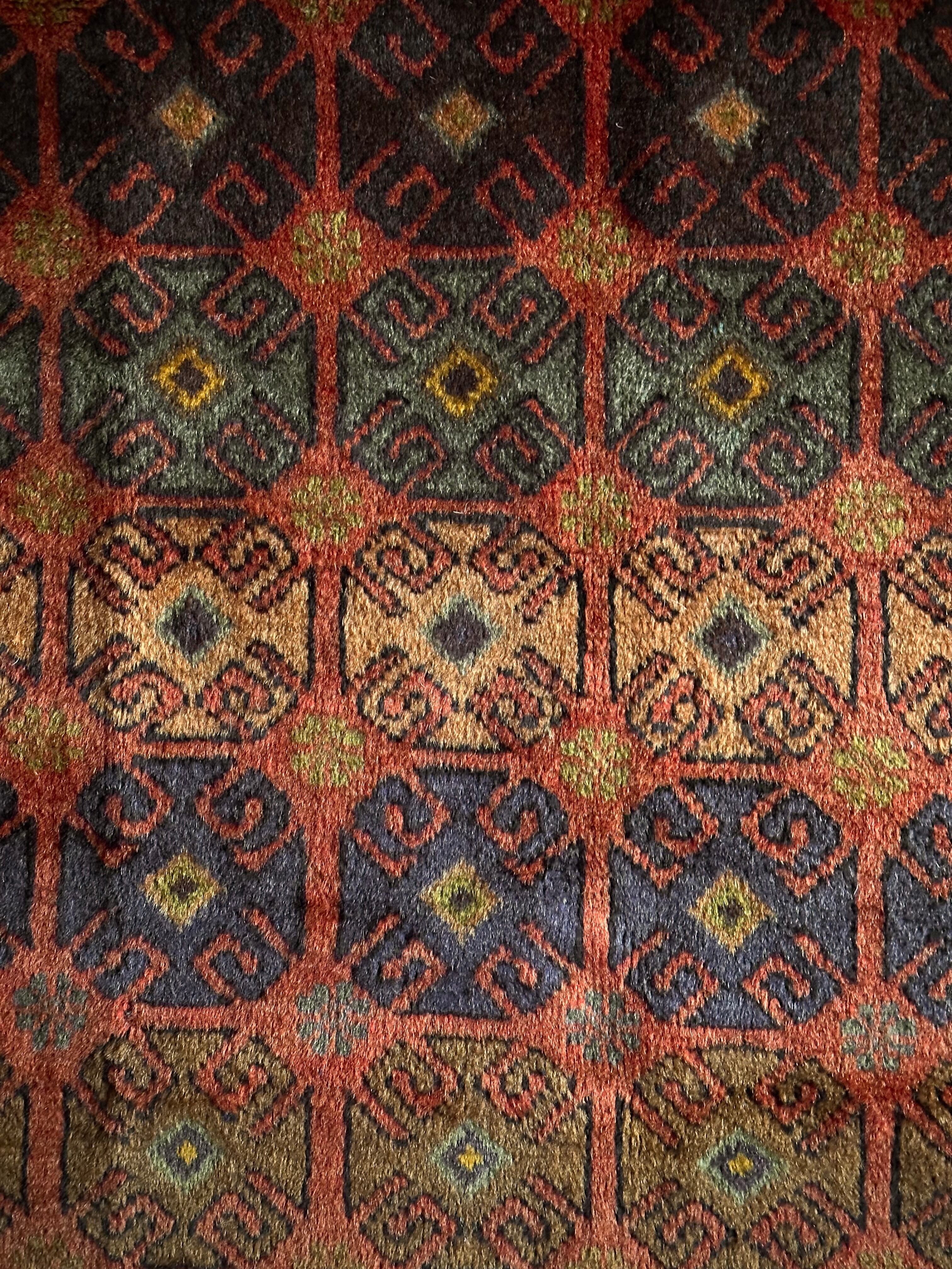 赤レンガ色のテラコッタをベースに、シンプルながらも部族らしい連続紋様がびっしりと並んだかっこいいラグで、アフガニスタン西部のヘラート近郊で半遊牧生活を送るマルダリ・バルーチ族のトライバルラグになります。