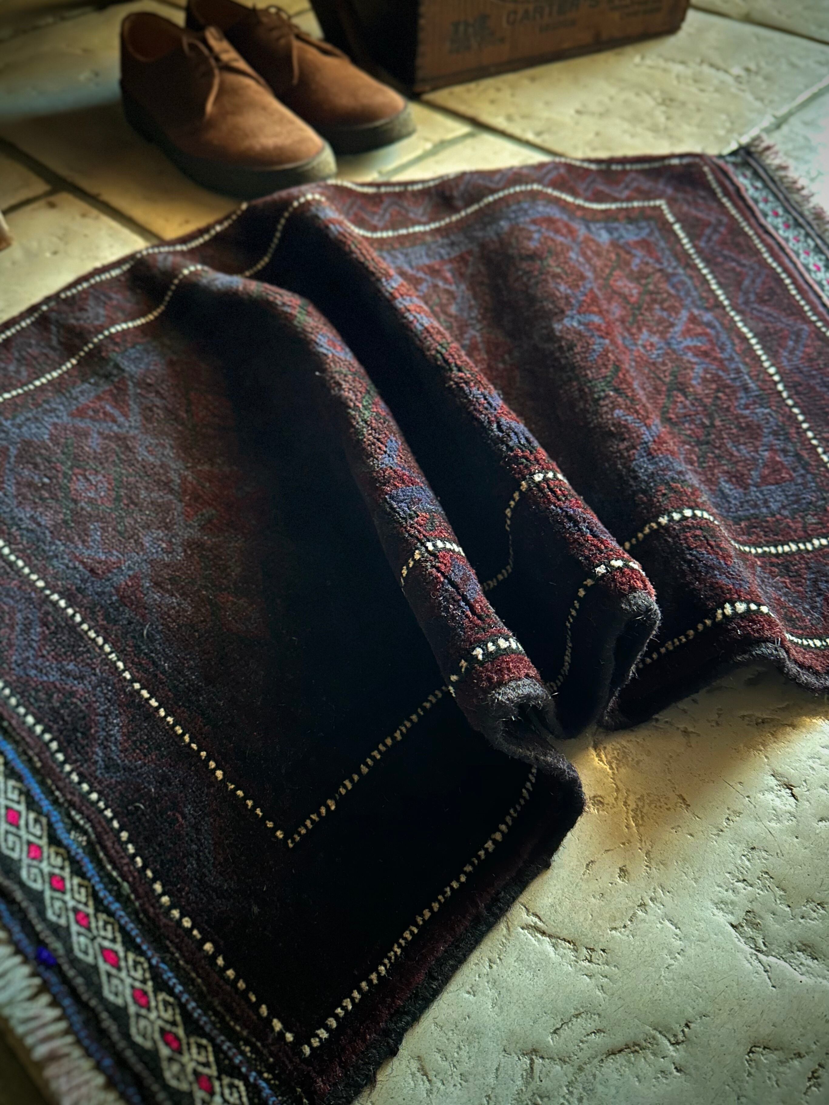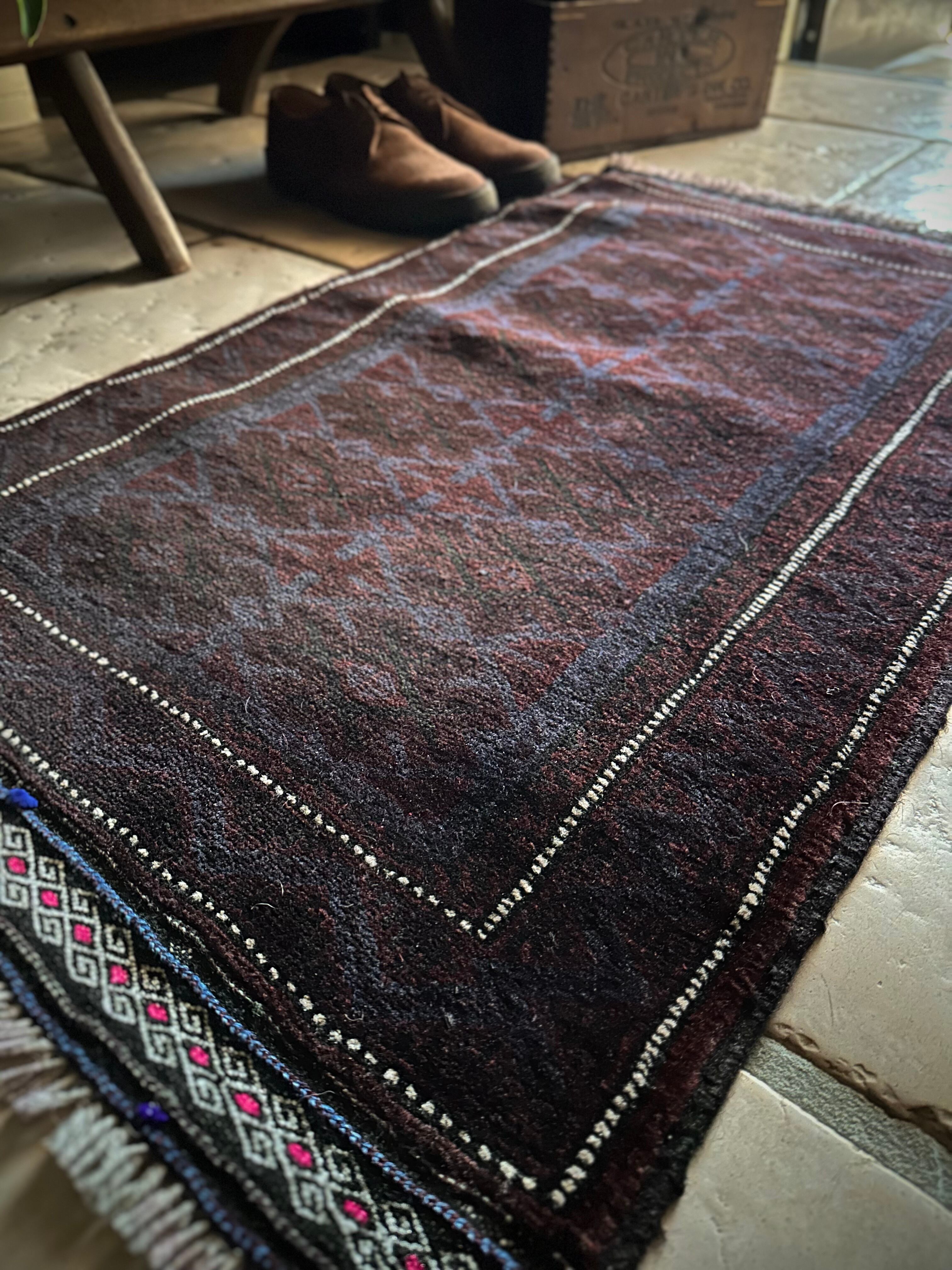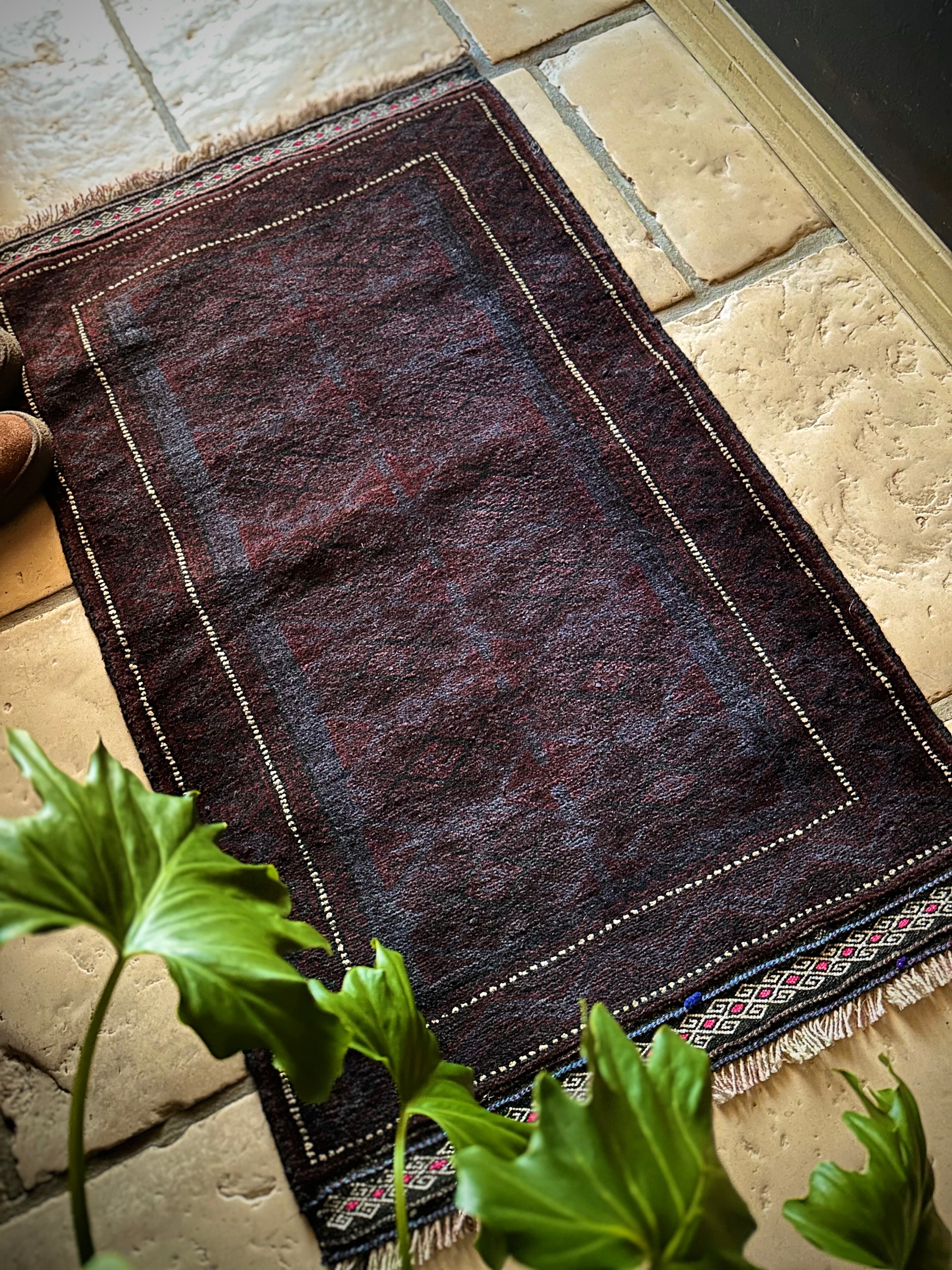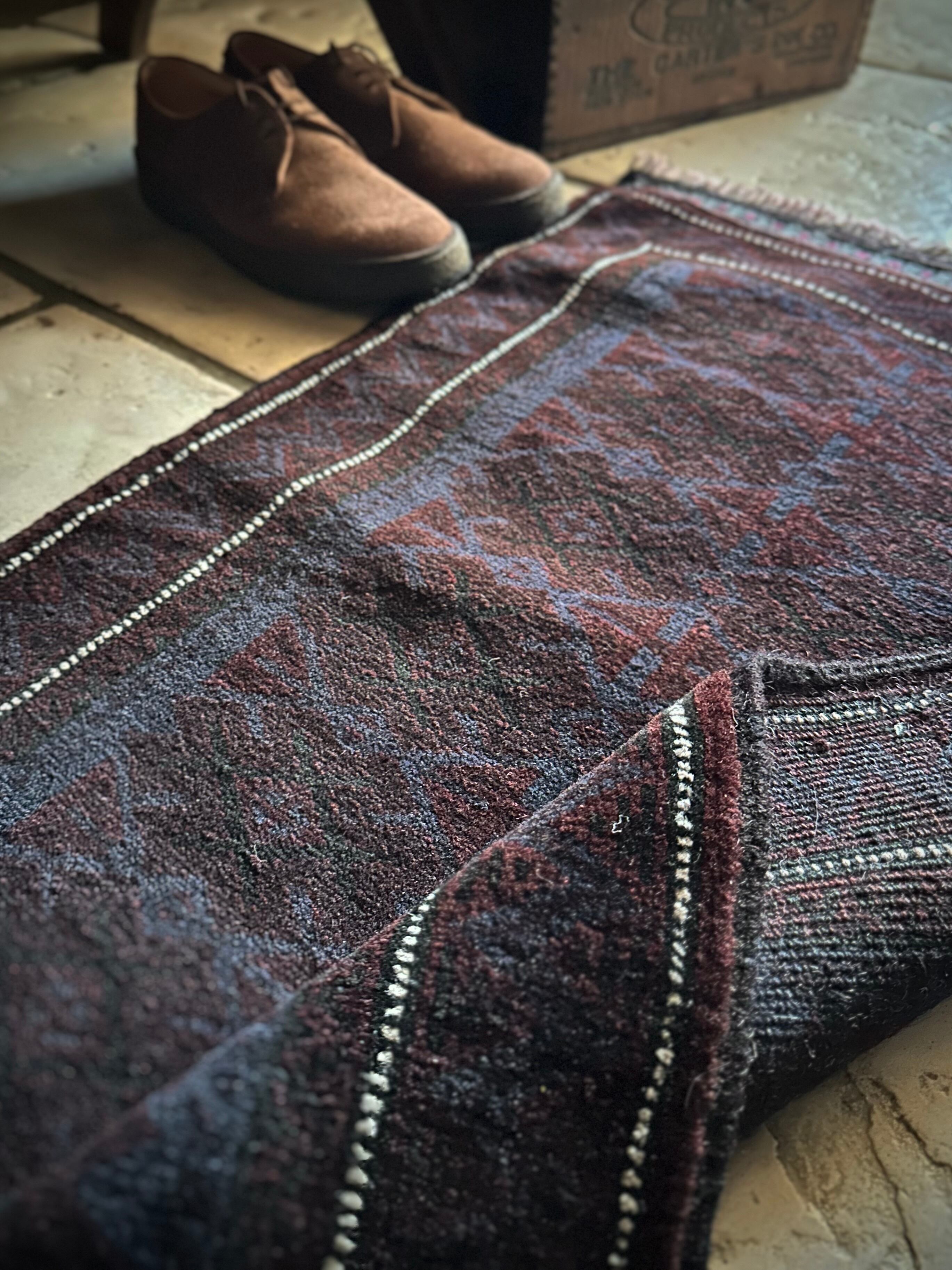 かなり深みのあるアメジストな葡萄色をベースに、ヌルッと浮かび上がるネイビーにブラックがかっこいいヘラート産バルーチ族のトライバルラグで、小さめな織物によく見られるバルーチならではの色使いが、砂漠の日差しではよく映える配色に驚きが隠せないラグになります。