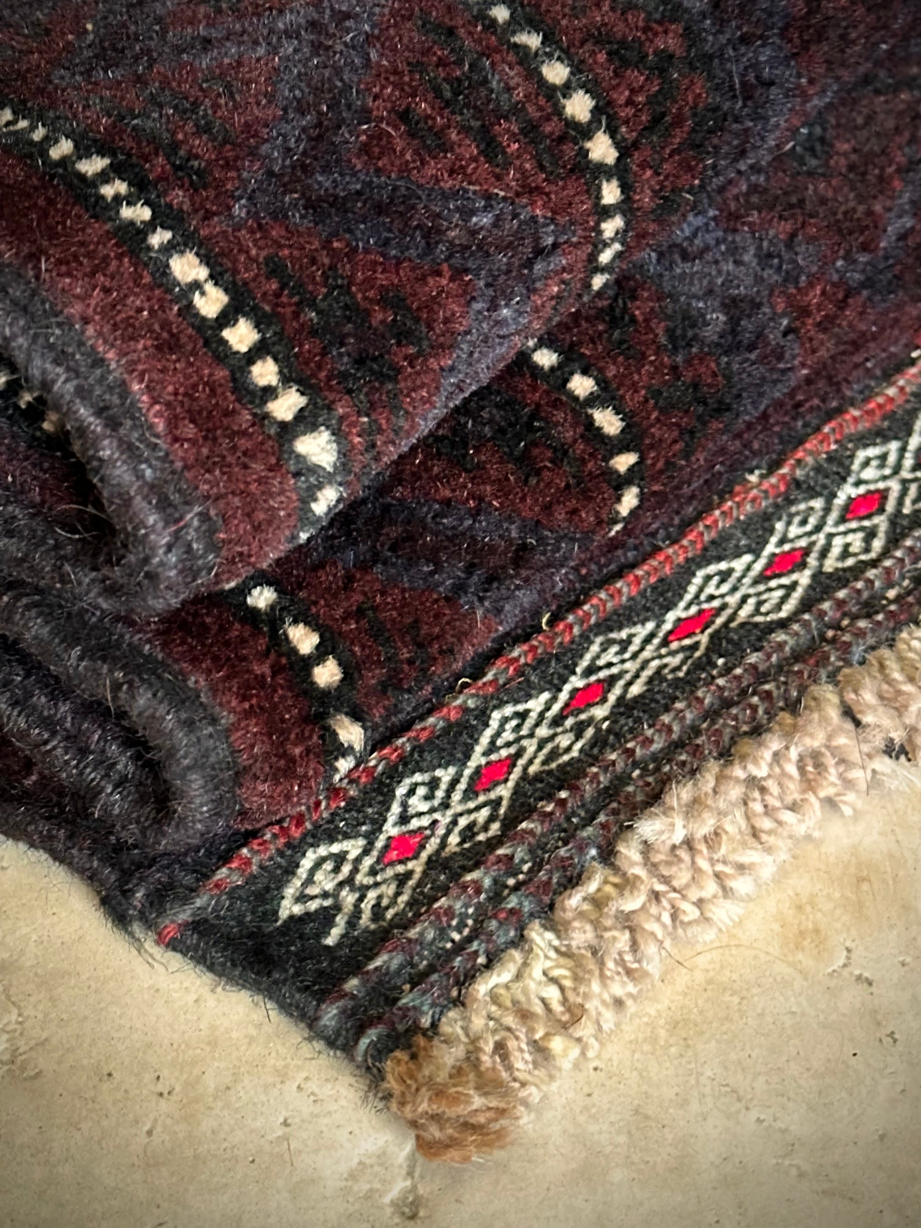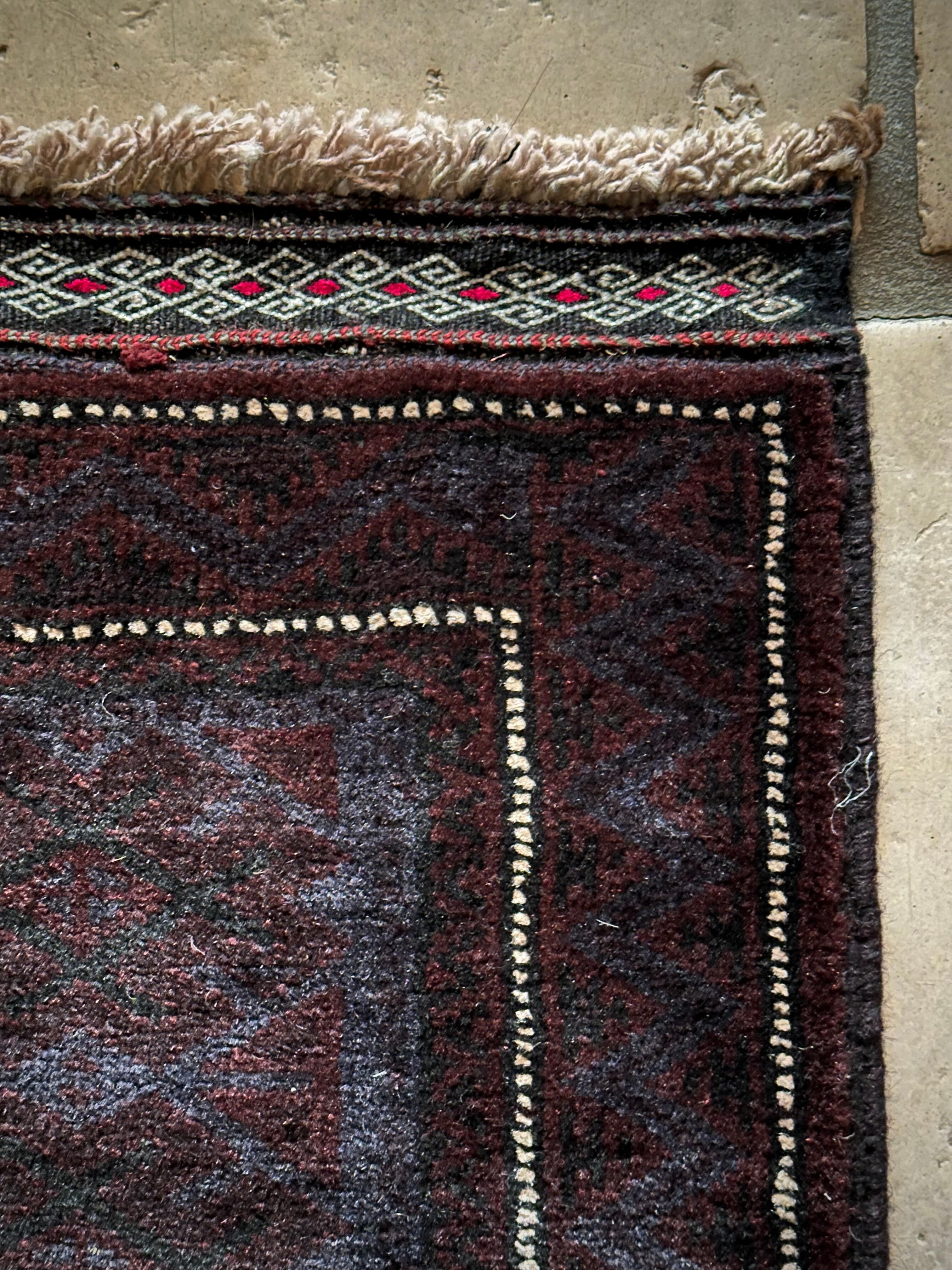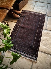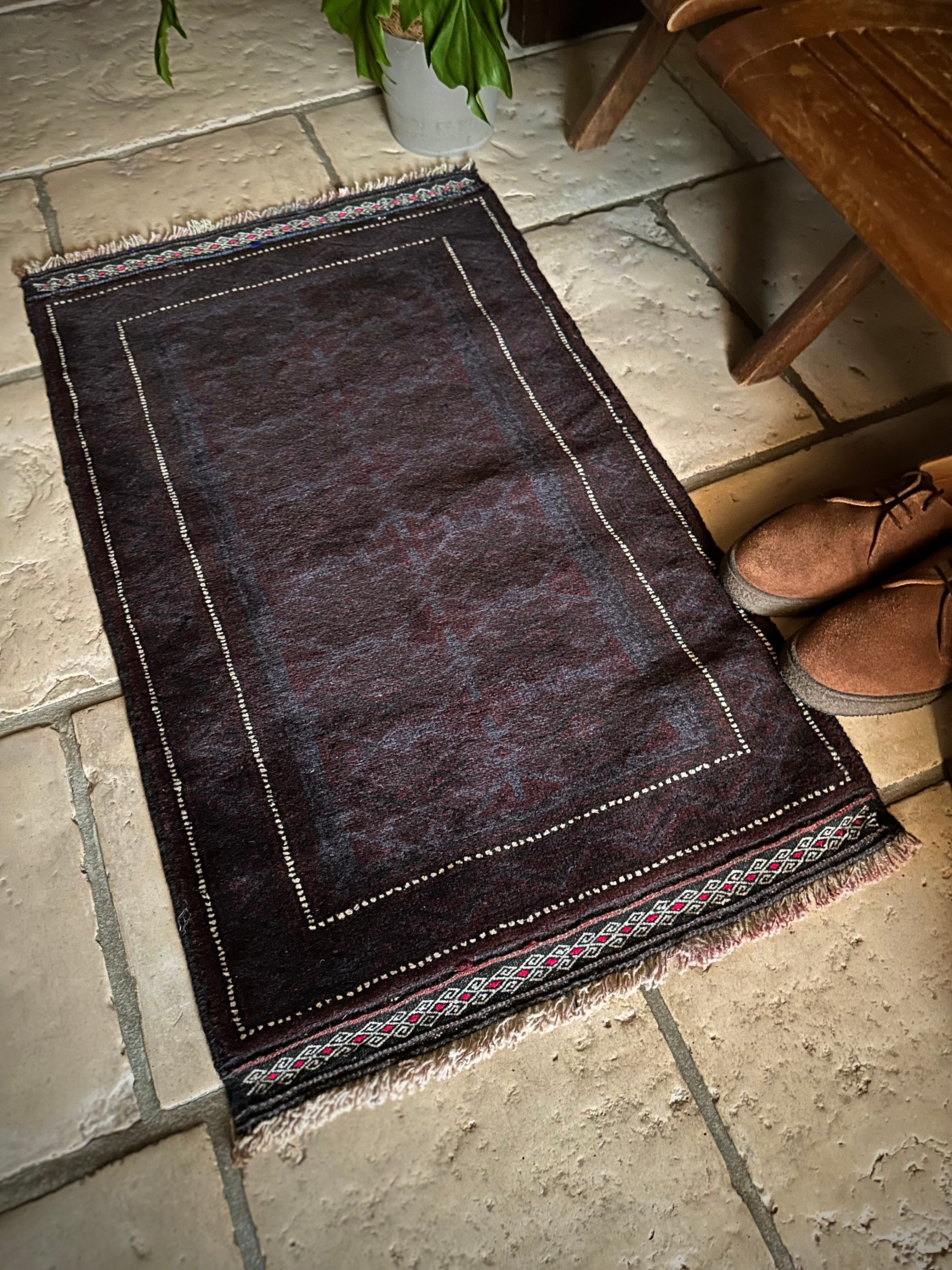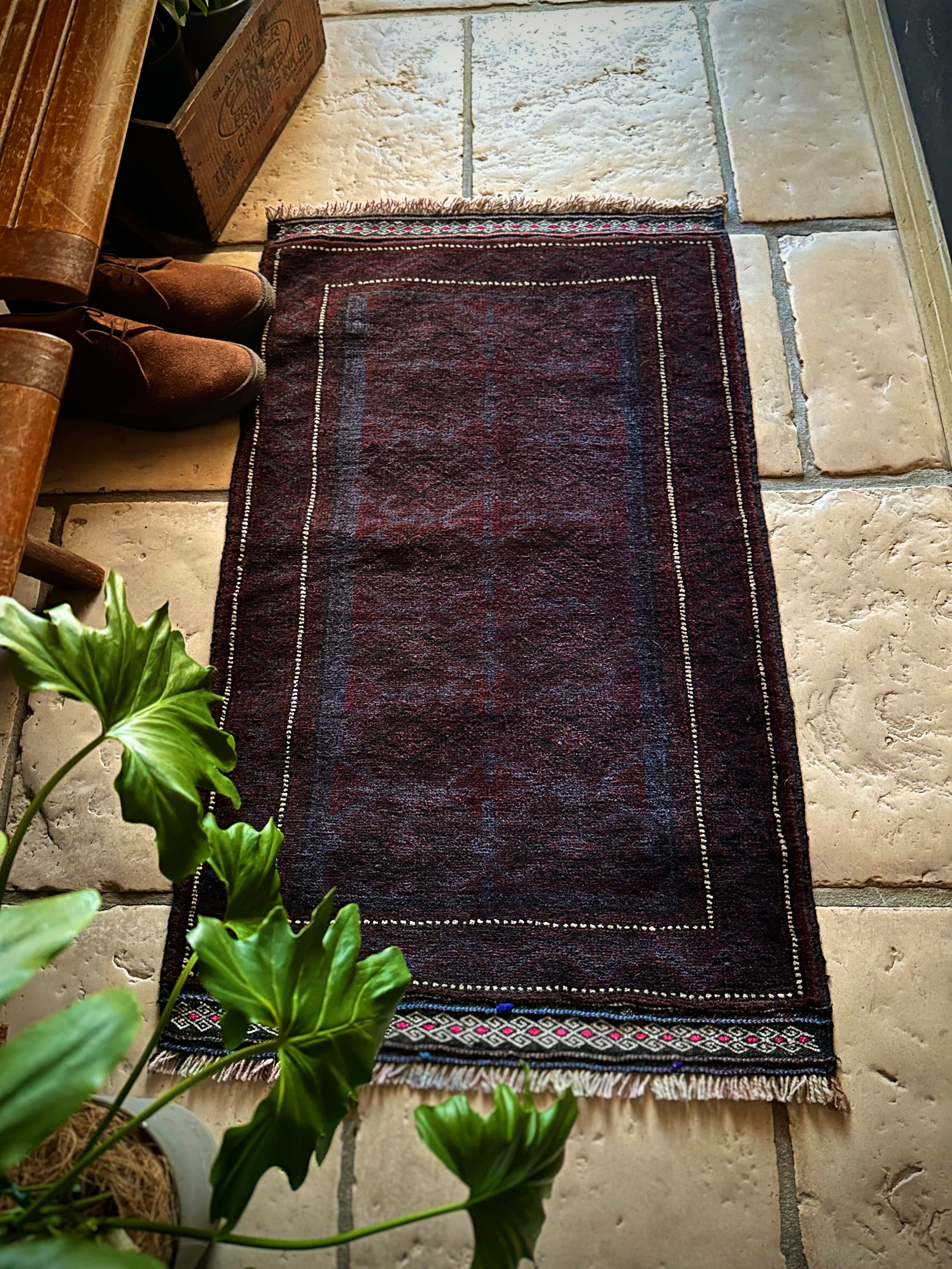 かなり深みのあるアメジストな葡萄色をベースに、ヌルッと浮かび上がるネイビーにブラックがかっこいいヘラート産バルーチ族のトライバルラグで、小さめな織物によく見られるバルーチならではの色使いが、砂漠の日差しではよく映える配色に驚きが隠せないラグになります。