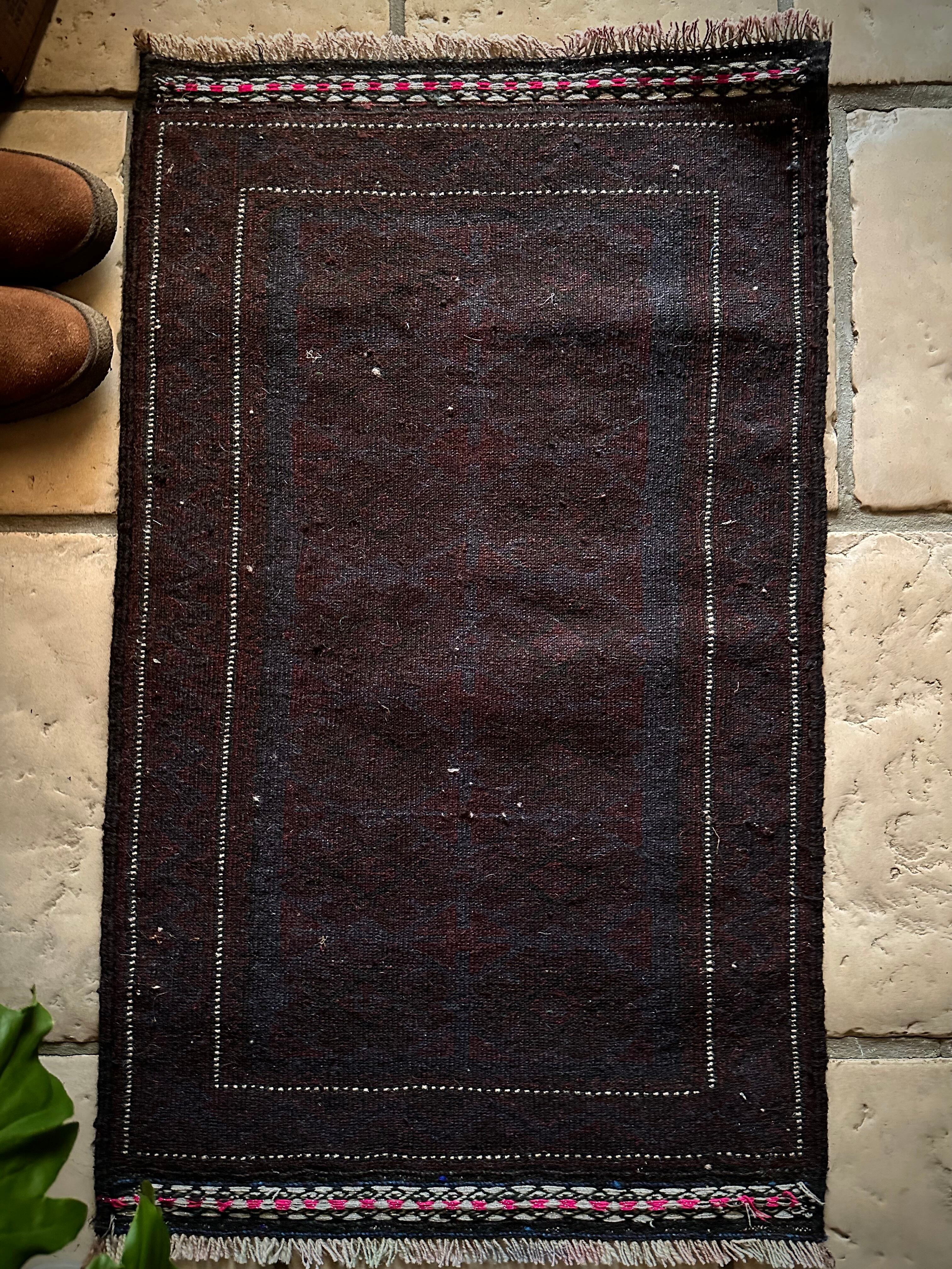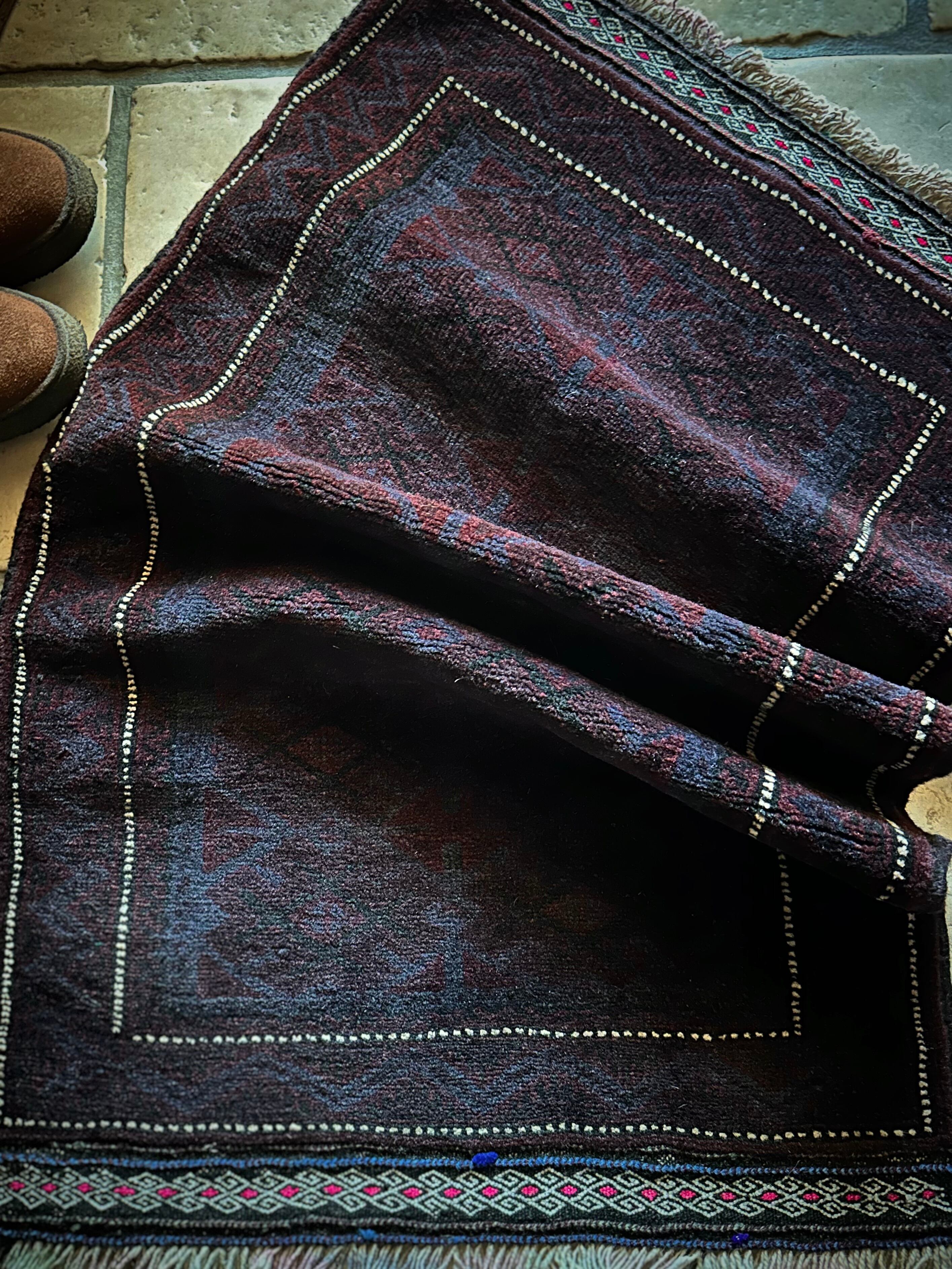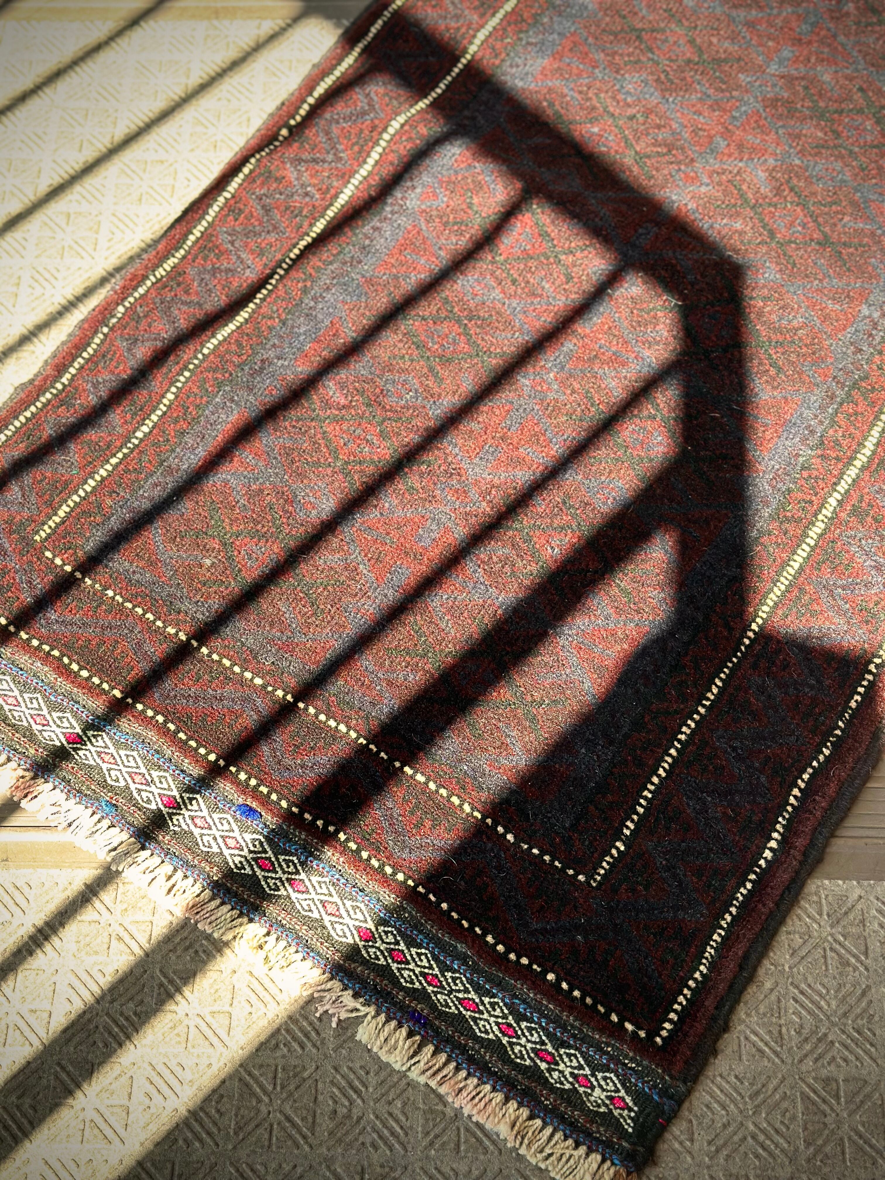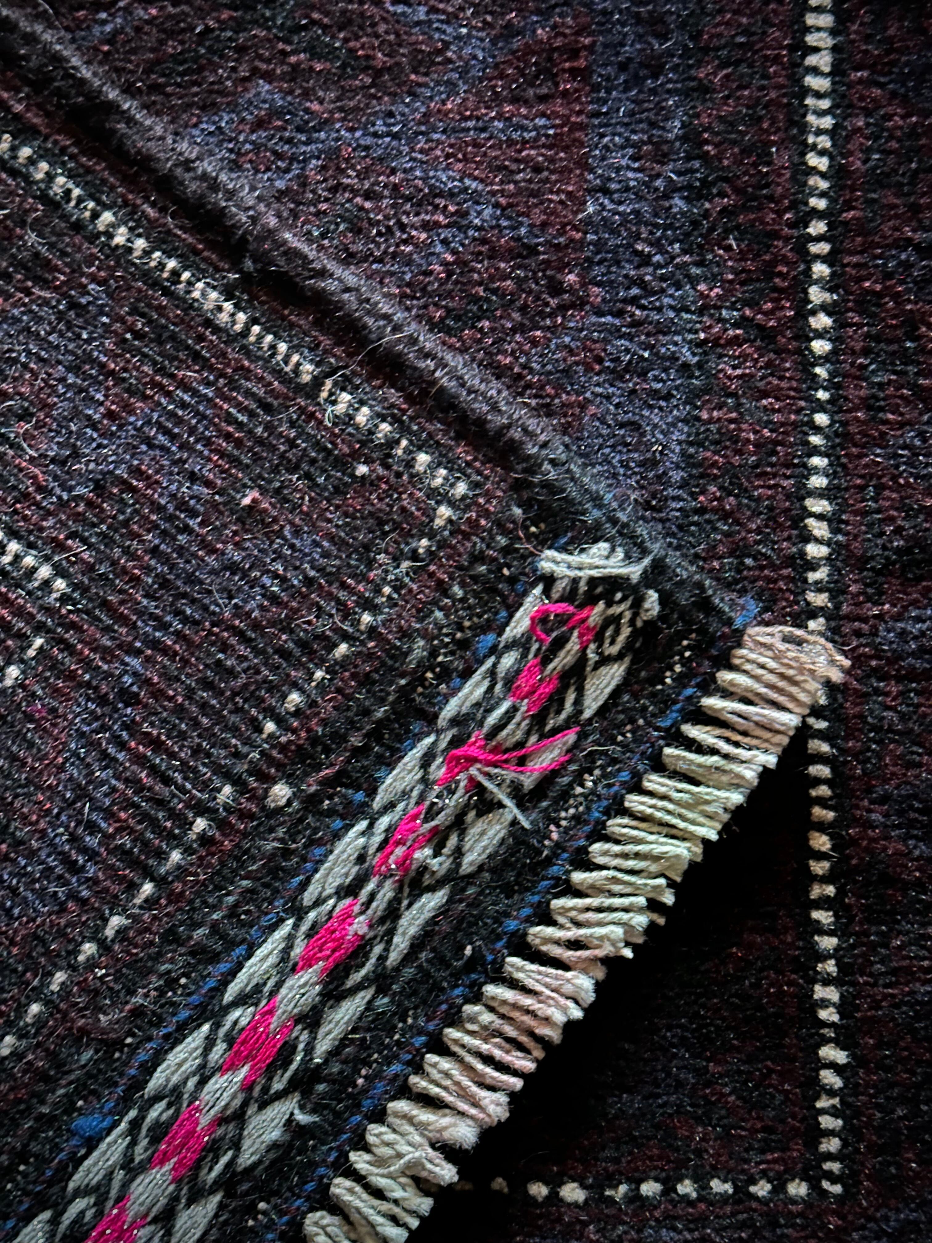 かなり深みのあるアメジストな葡萄色をベースに、ヌルッと浮かび上がるネイビーにブラックがかっこいいヘラート産バルーチ族のトライバルラグで、小さめな織物によく見られるバルーチならではの色使いが、砂漠の日差しではよく映える配色に驚きが隠せないラグになります。