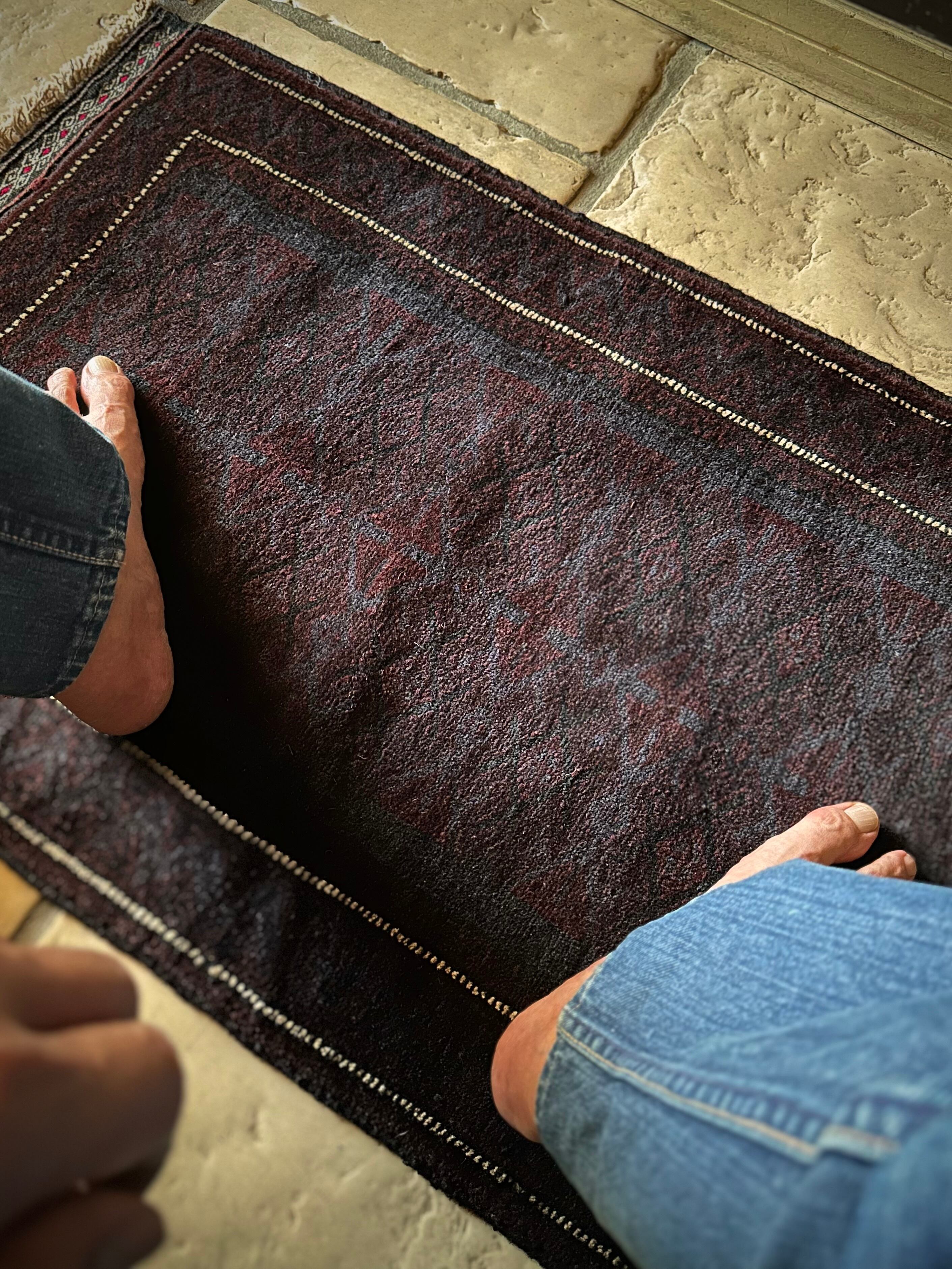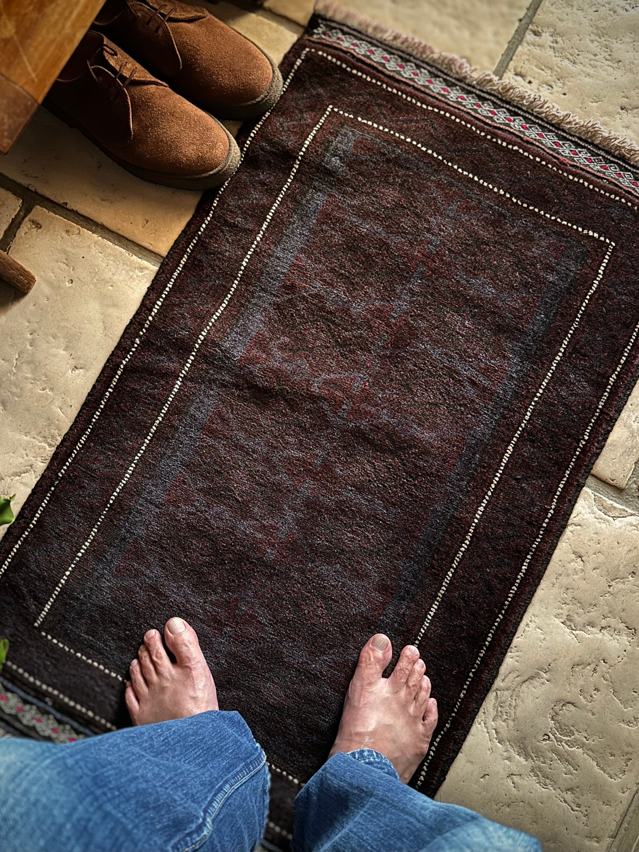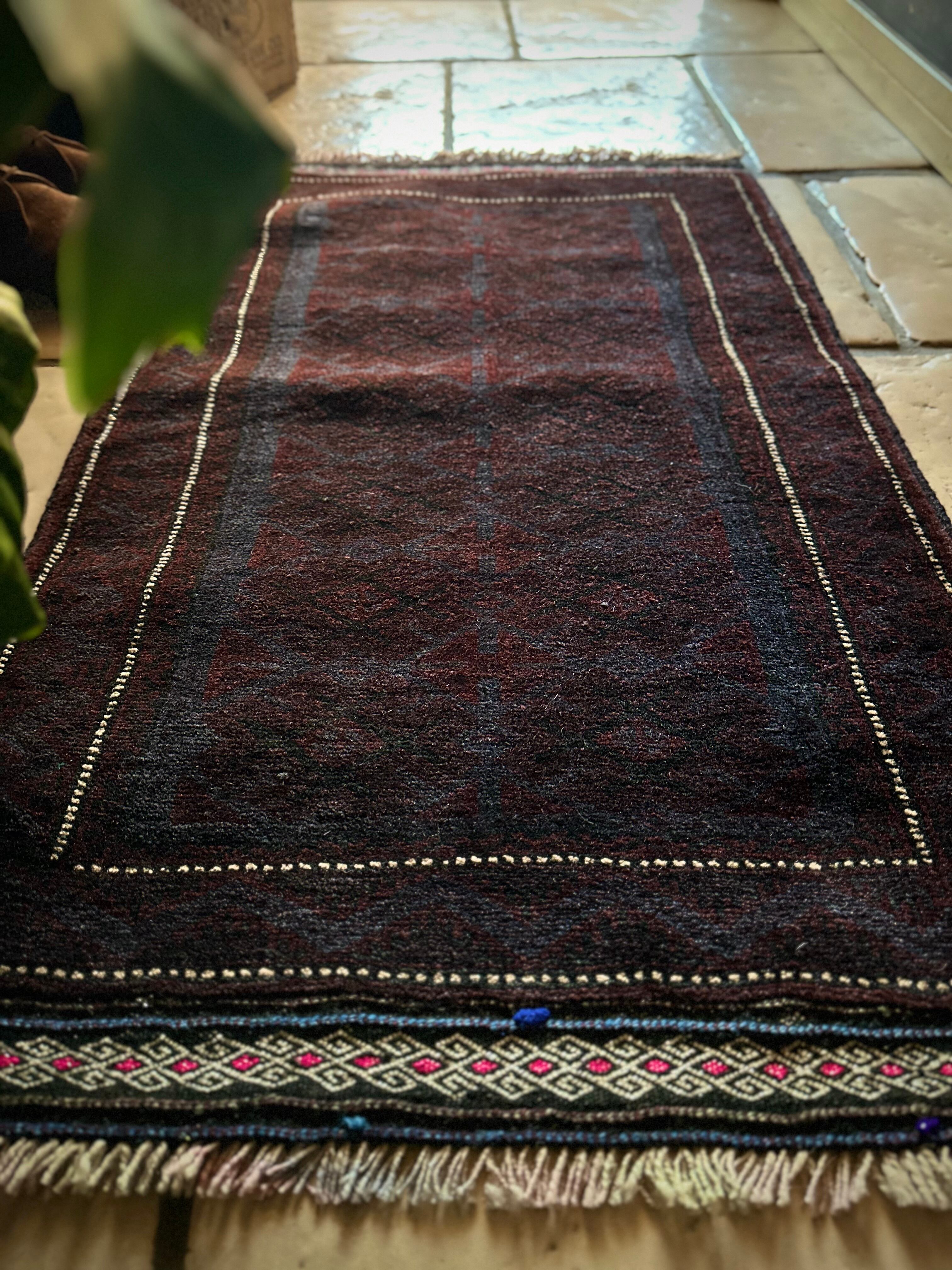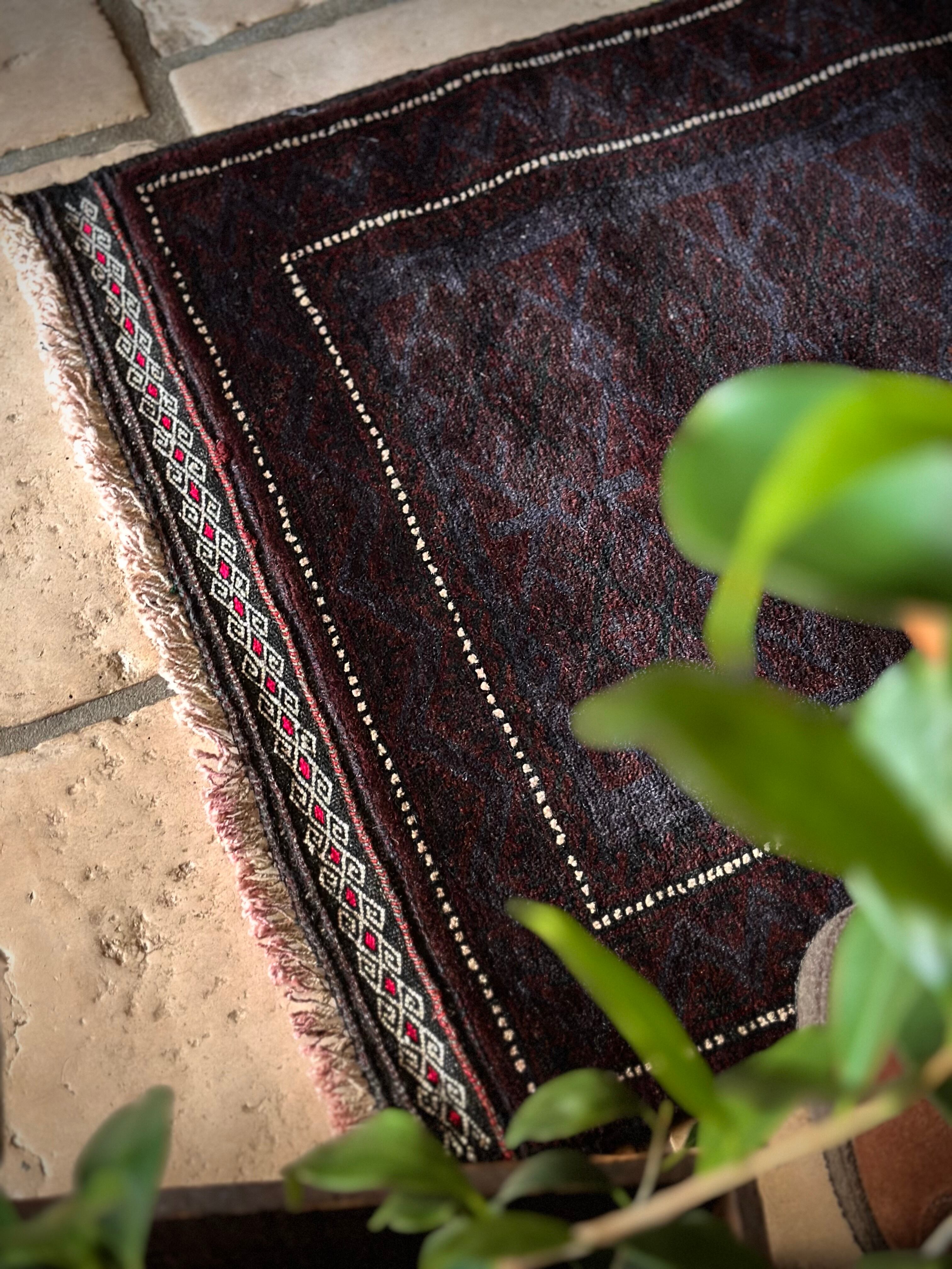 かなり深みのあるアメジストな葡萄色をベースに、ヌルッと浮かび上がるネイビーにブラックがかっこいいヘラート産バルーチ族のトライバルラグで、小さめな織物によく見られるバルーチならではの色使いが、砂漠の日差しではよく映える配色に驚きが隠せないラグになります。