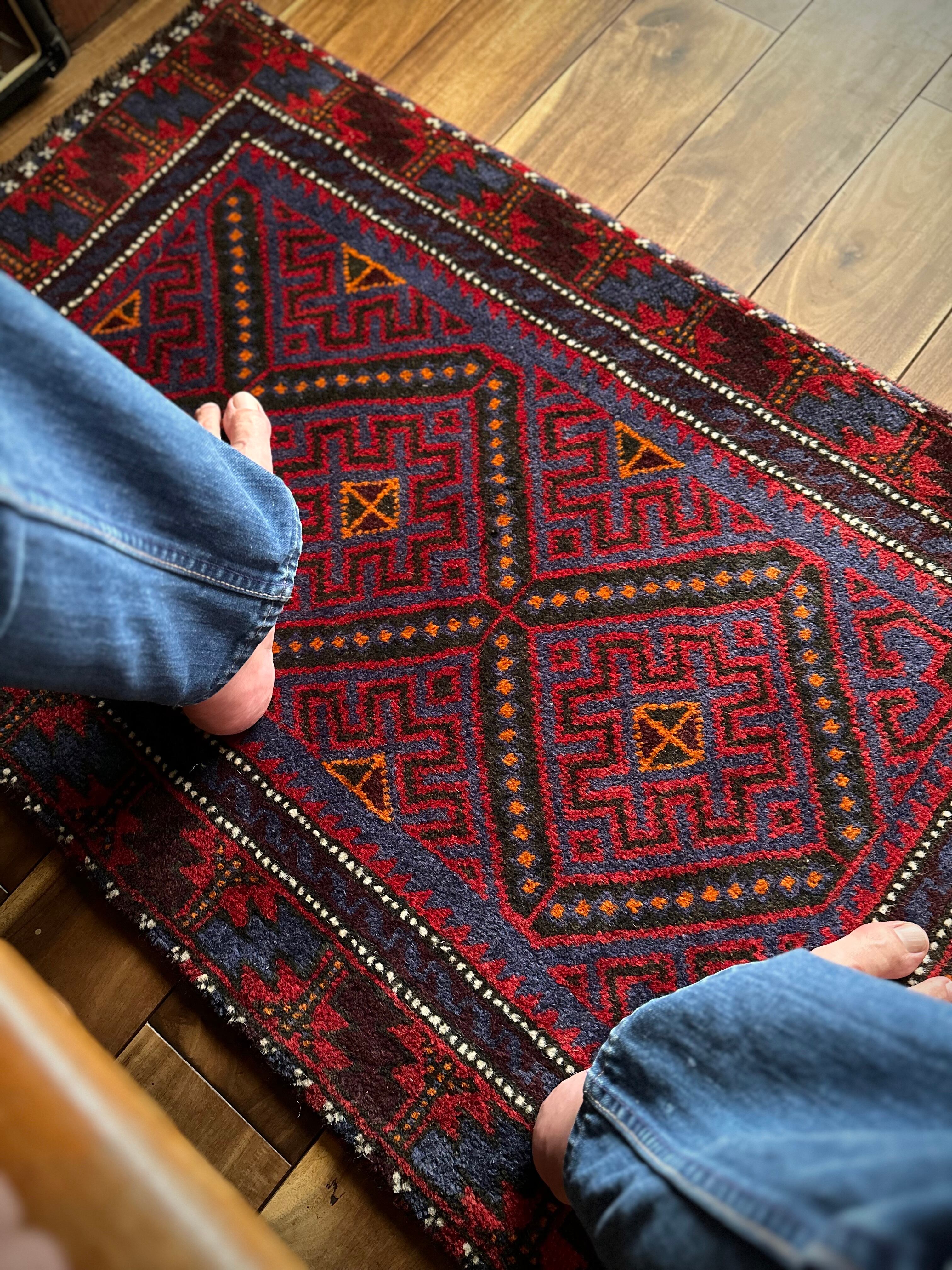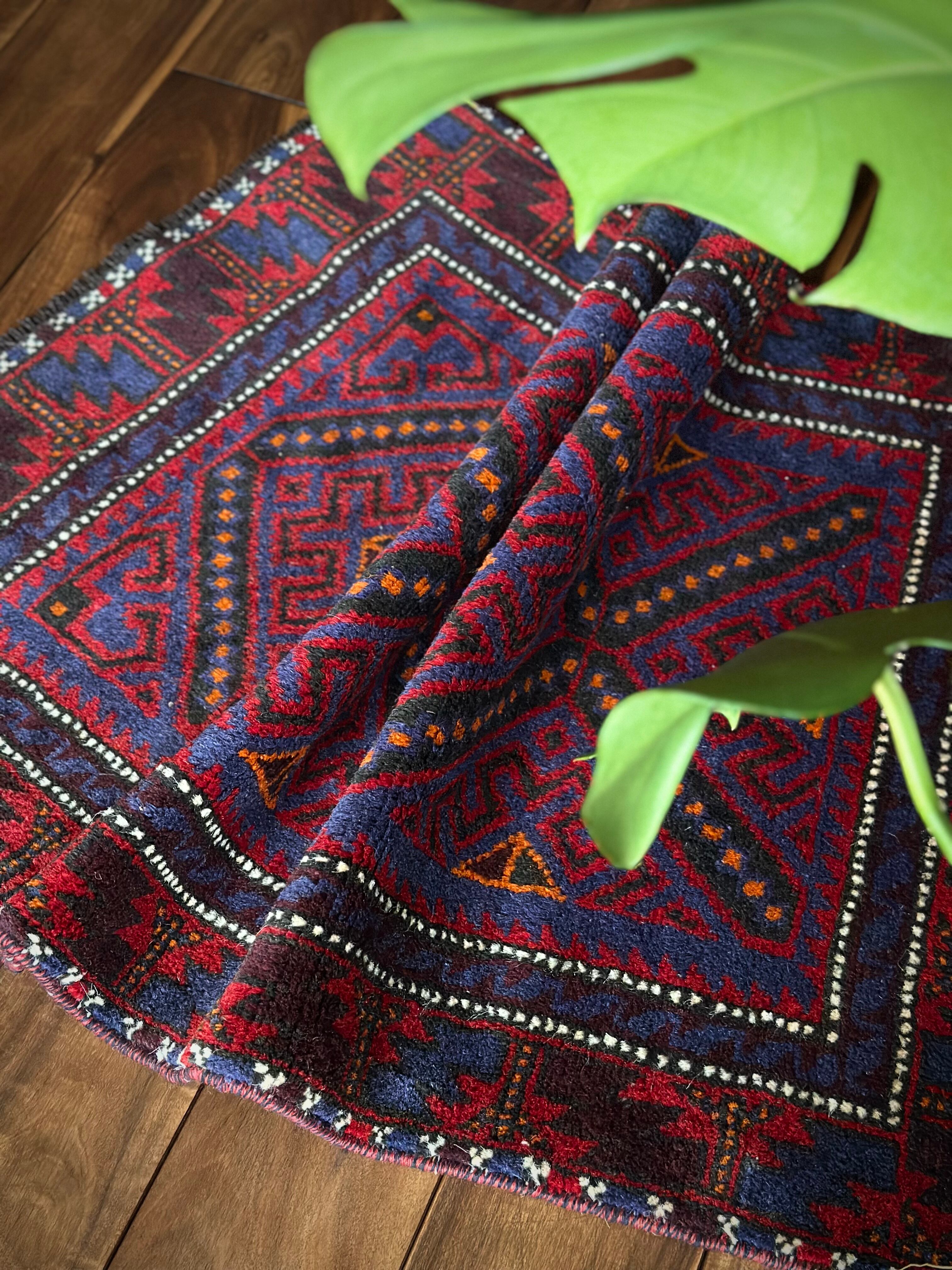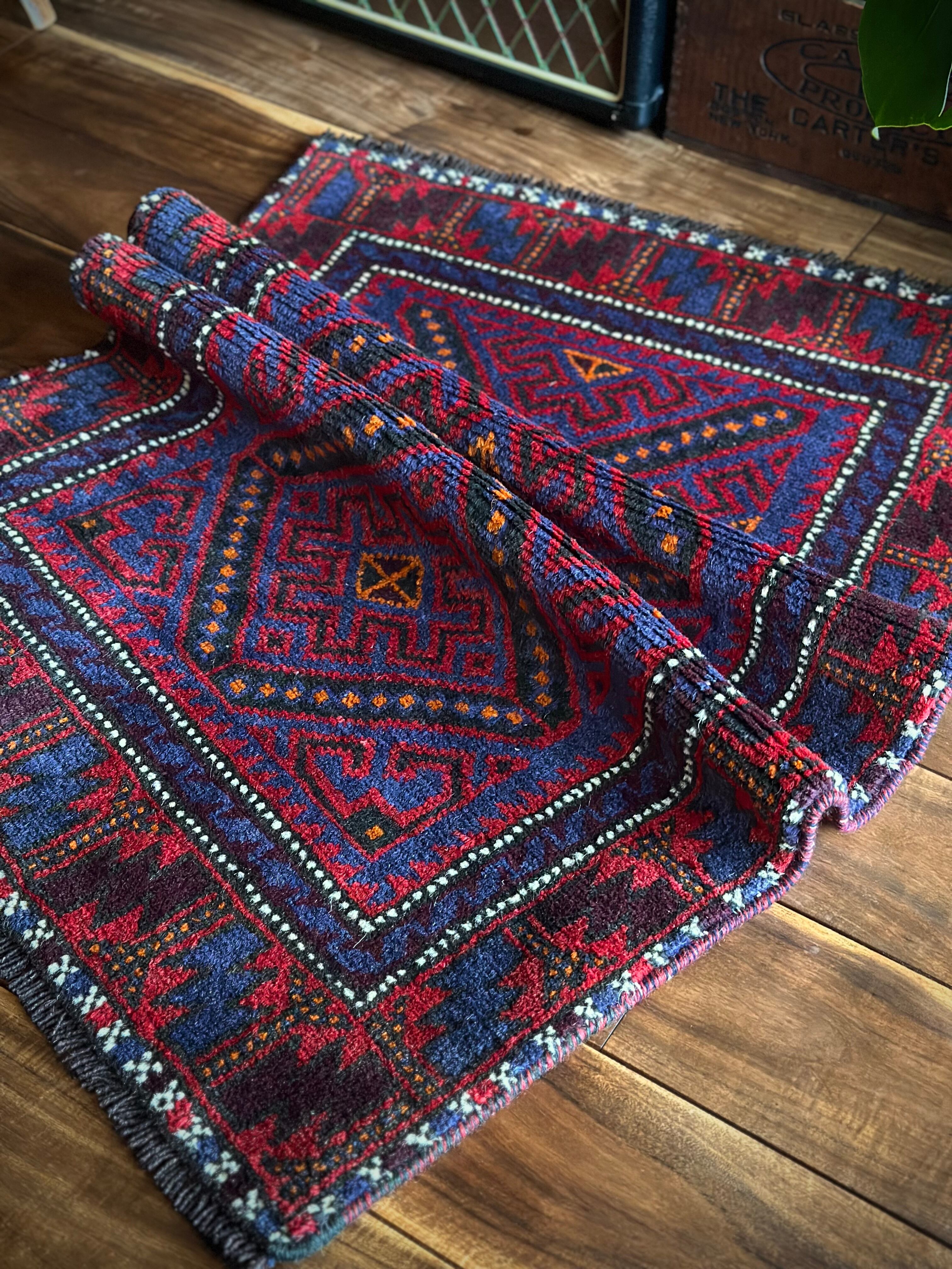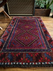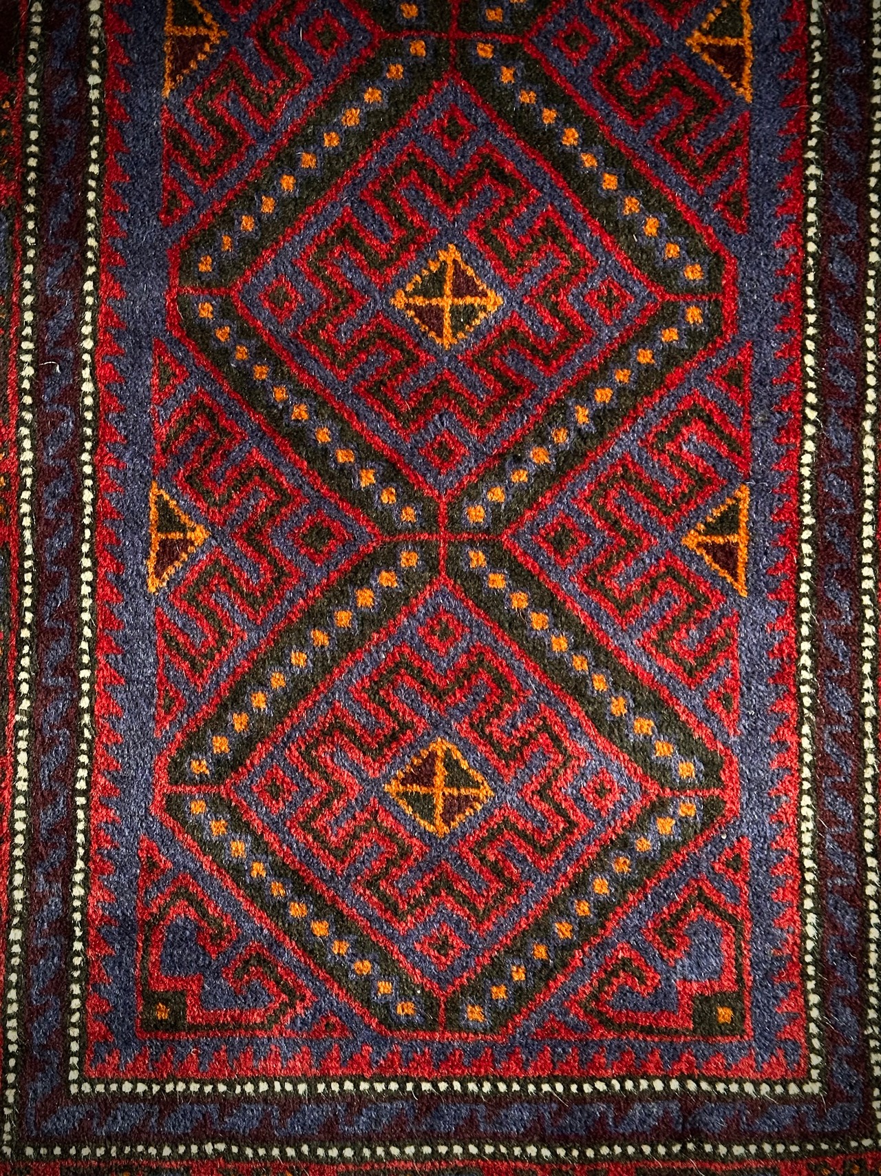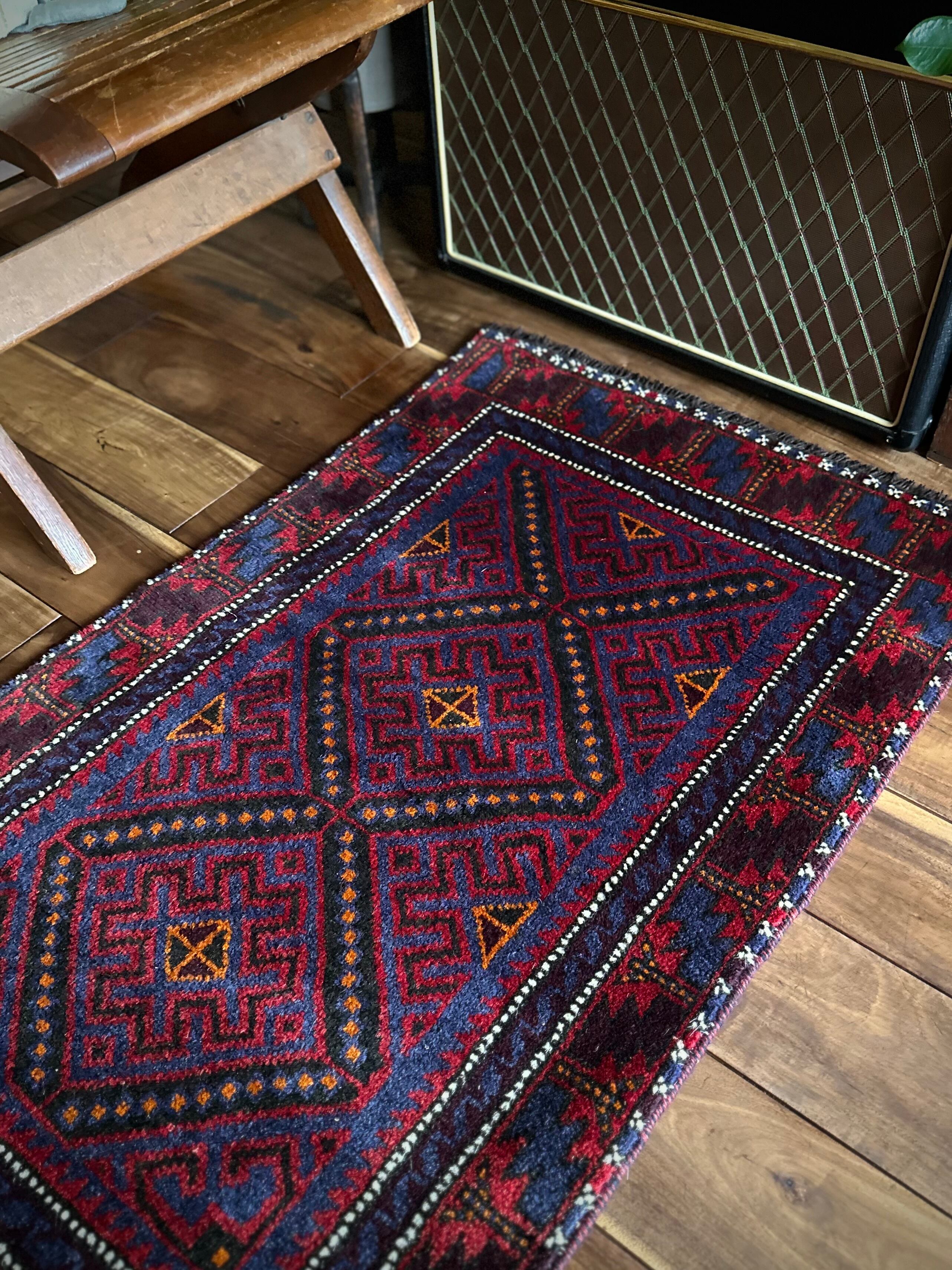 ヘラート産バルーチによく見られる井戸の井の様な紋様が何の意味かは不明ですが、まるでガンダムを連想させるカラーリングが面白いでしょうか。パイル自体は程よい長さで油分を含んだしっとりした手触りが心地良く、大きさ的にも敷く場所を選ばないアクセントラグとして、明るくポップな彩りを与えてくれるでしょう。