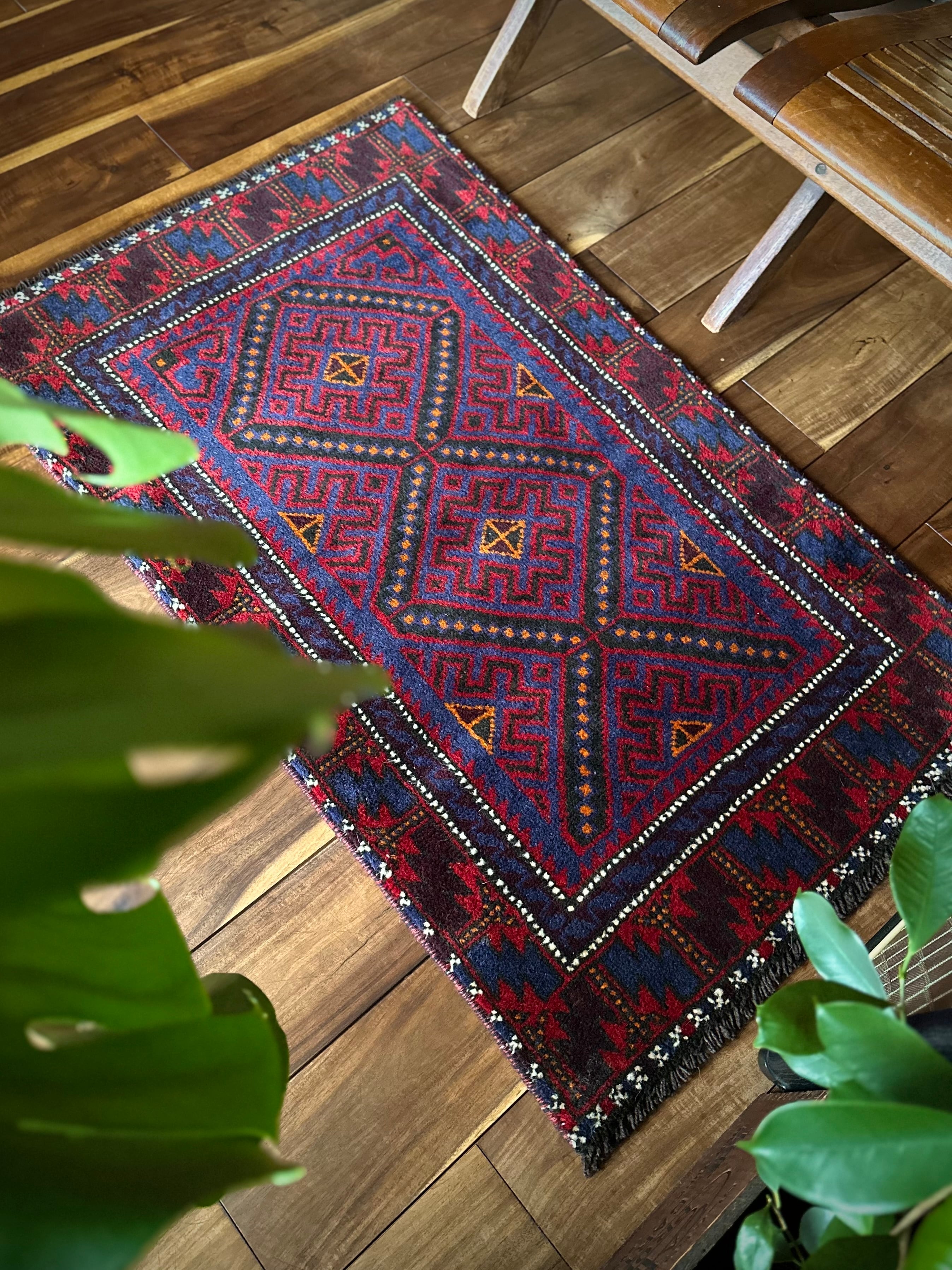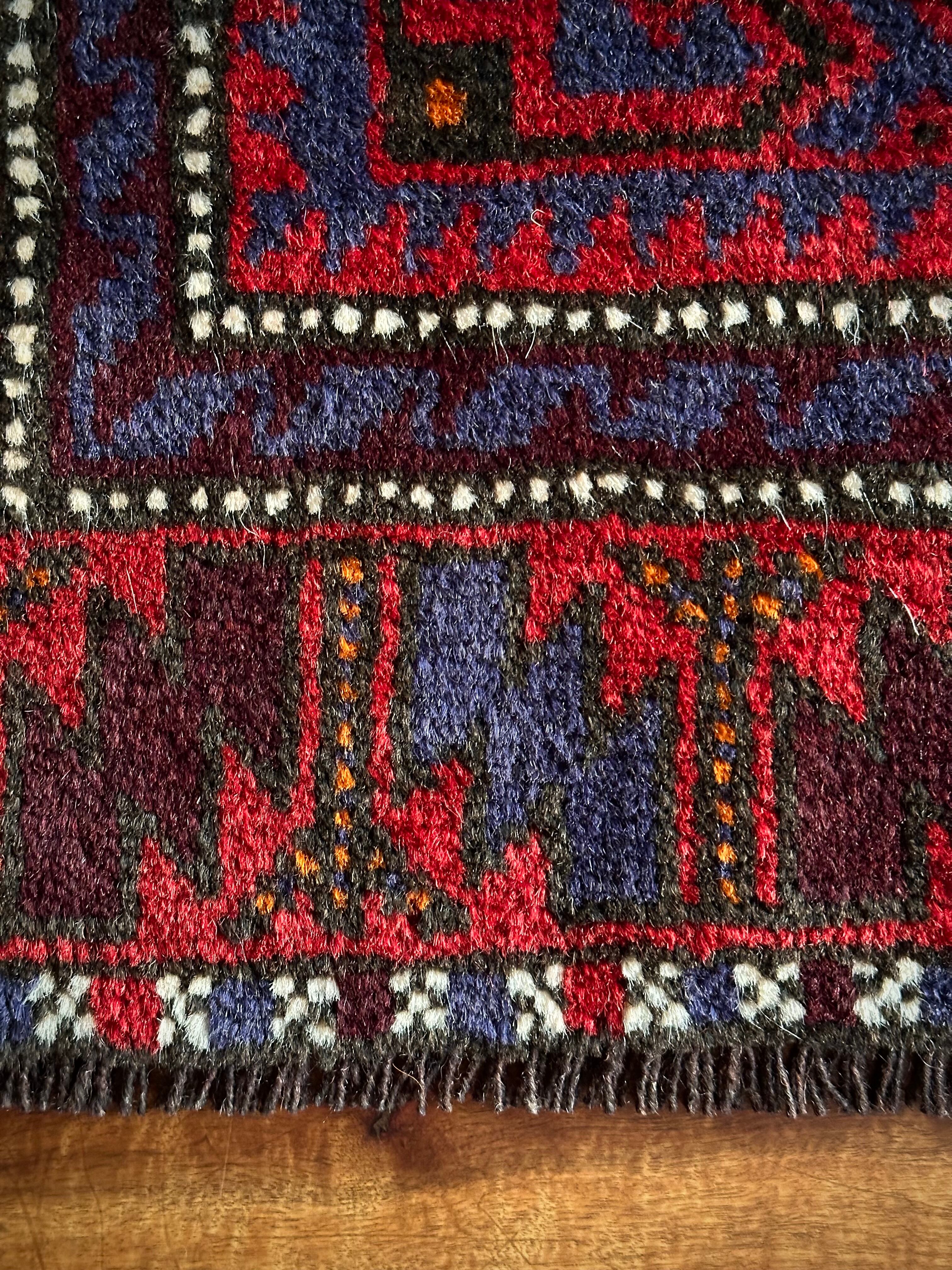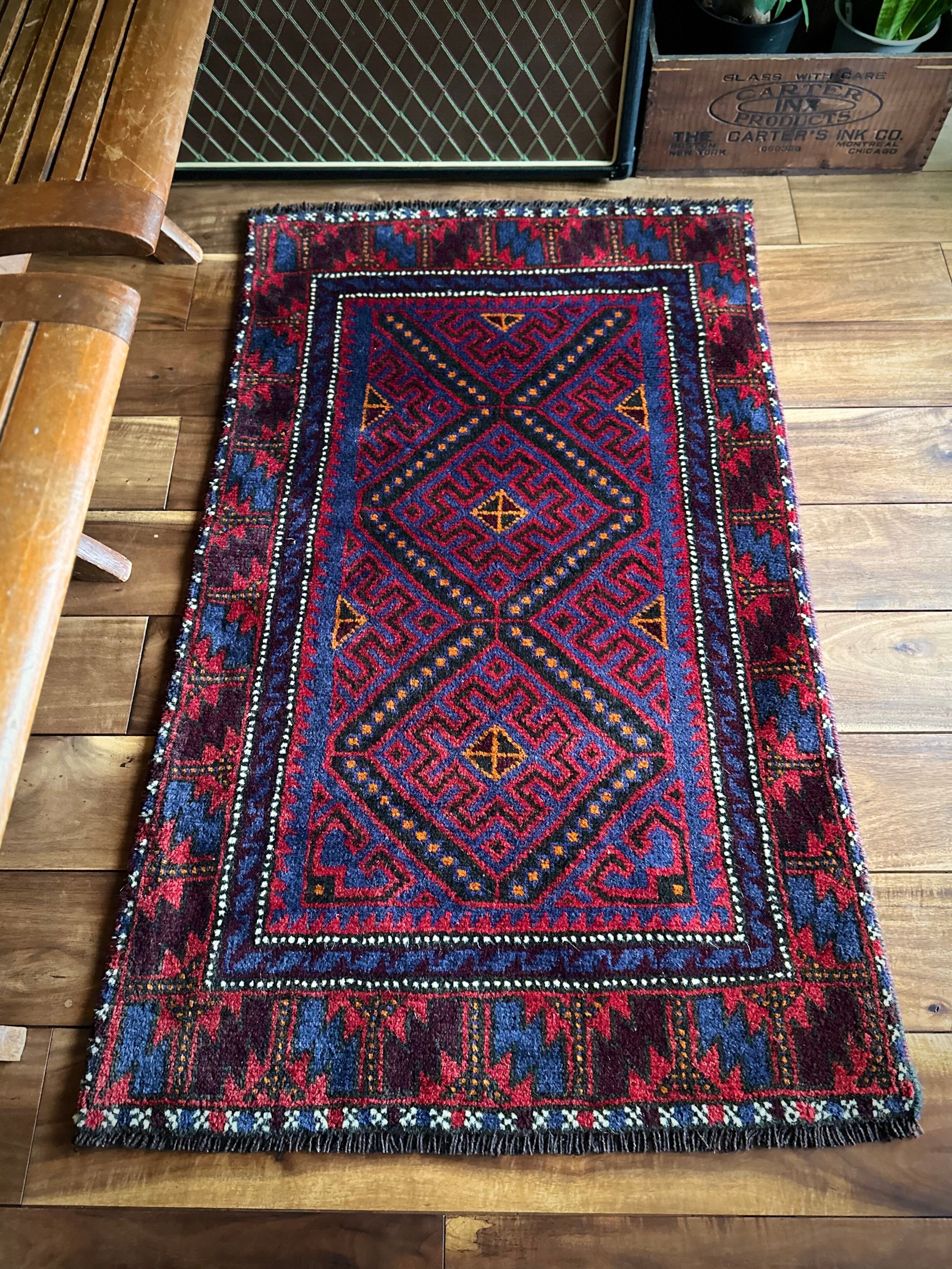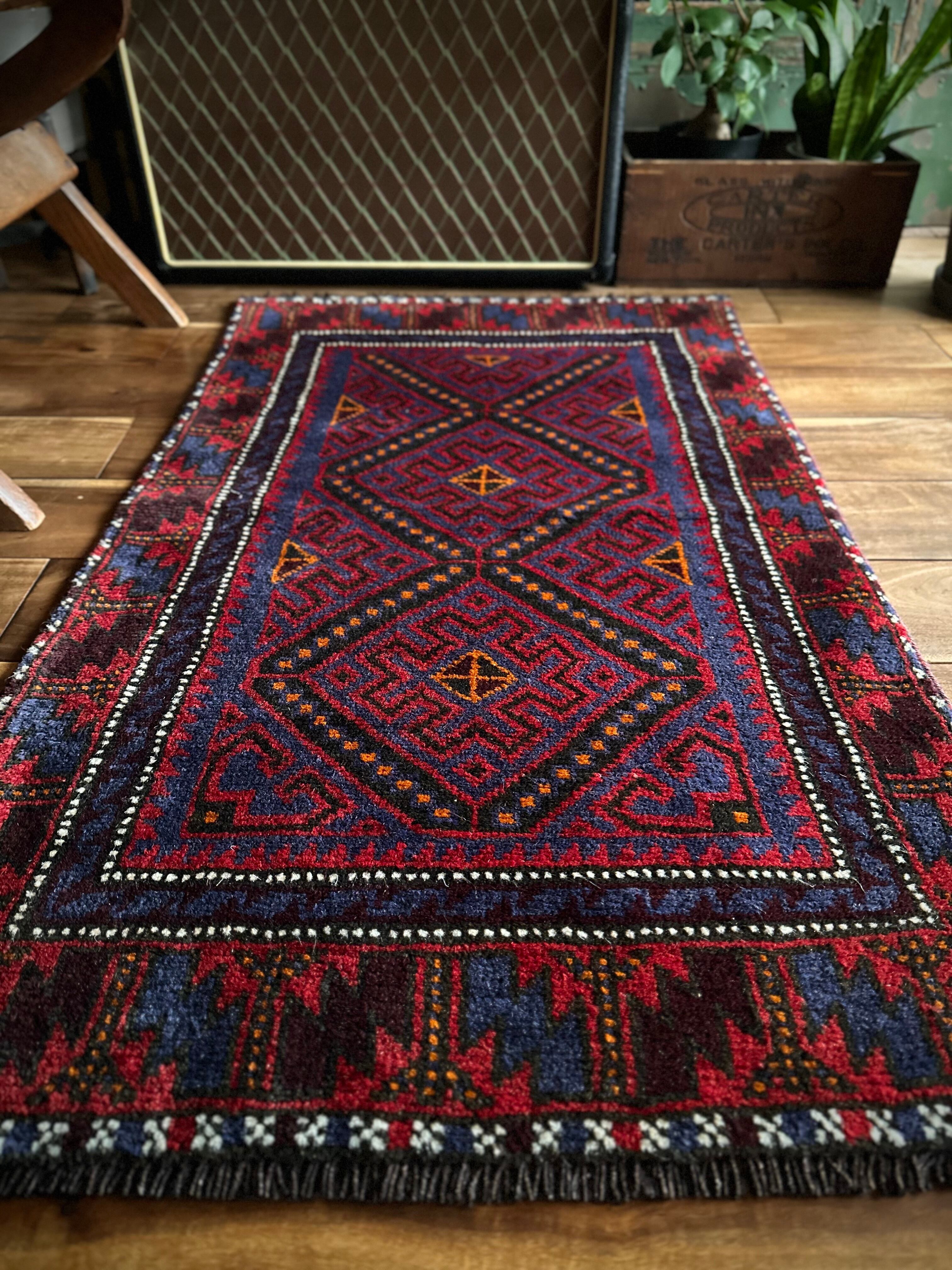 なんとも鮮やかな赤と青のポップな色合いが目を惹く1枚で、ポイントとしてオレンジを配した輪郭に白いラインが浮き出て見える、アフガニスタン西部のヘラート州に居住するバルーチ族のトライバルラグになります。