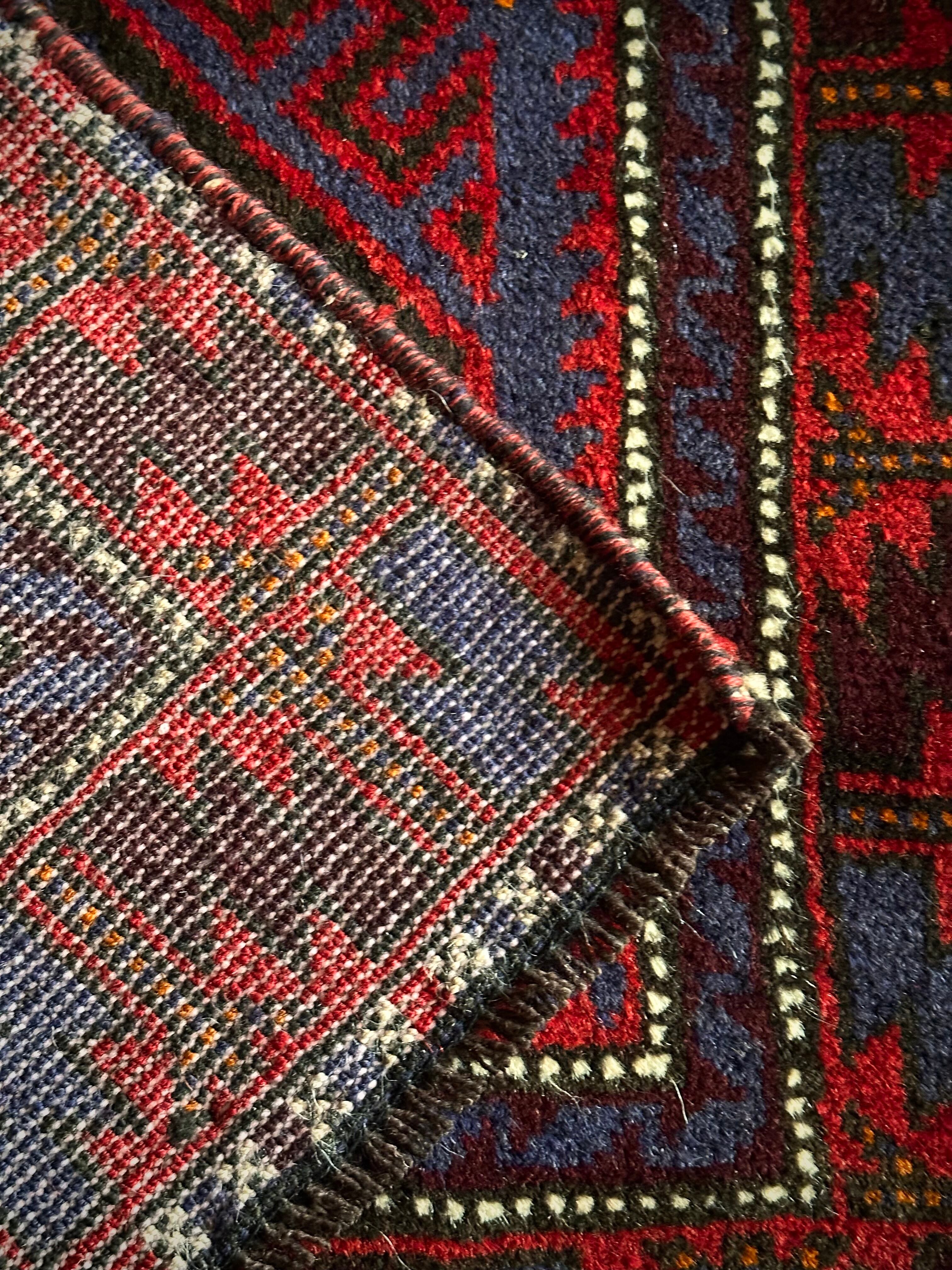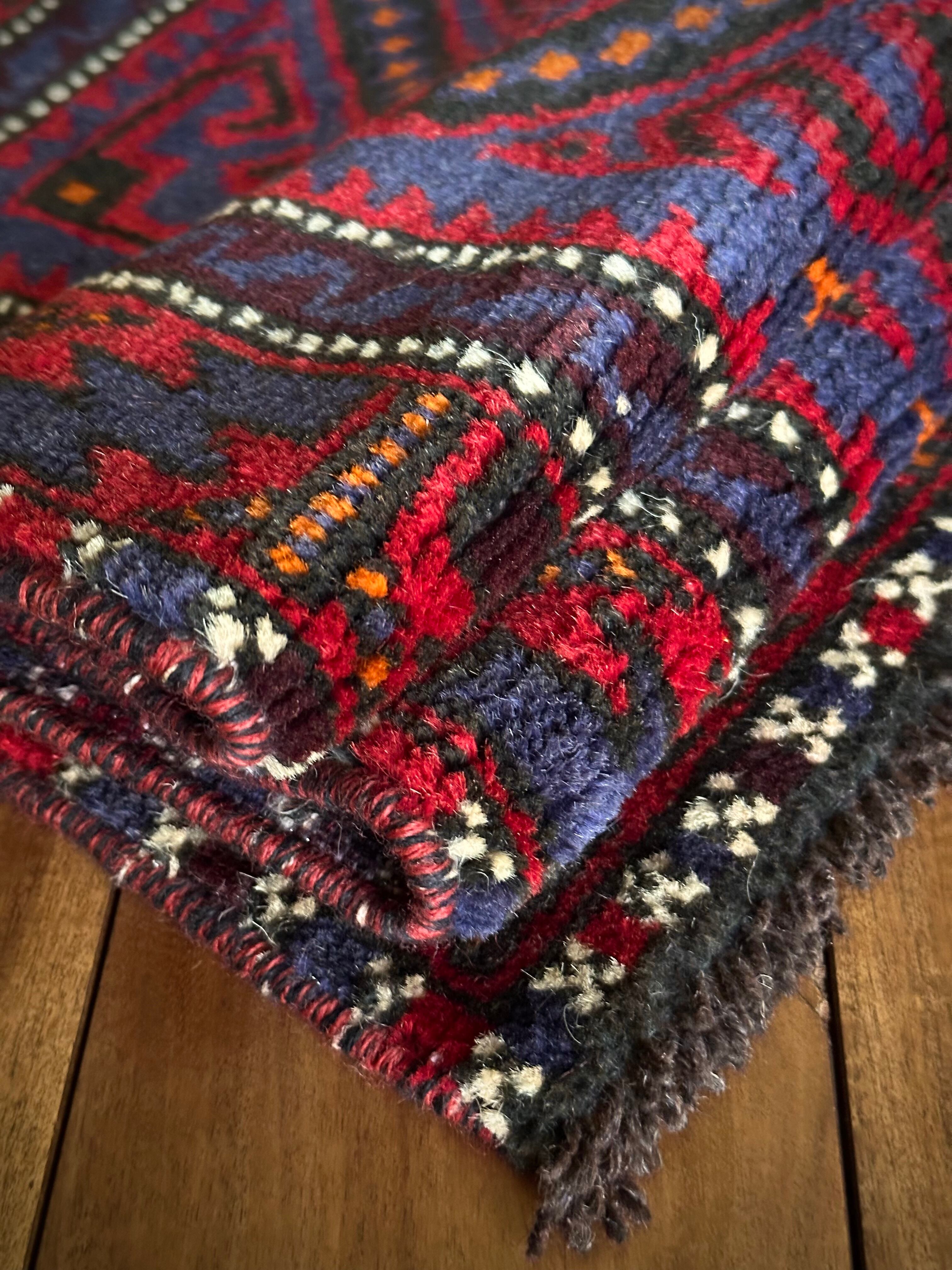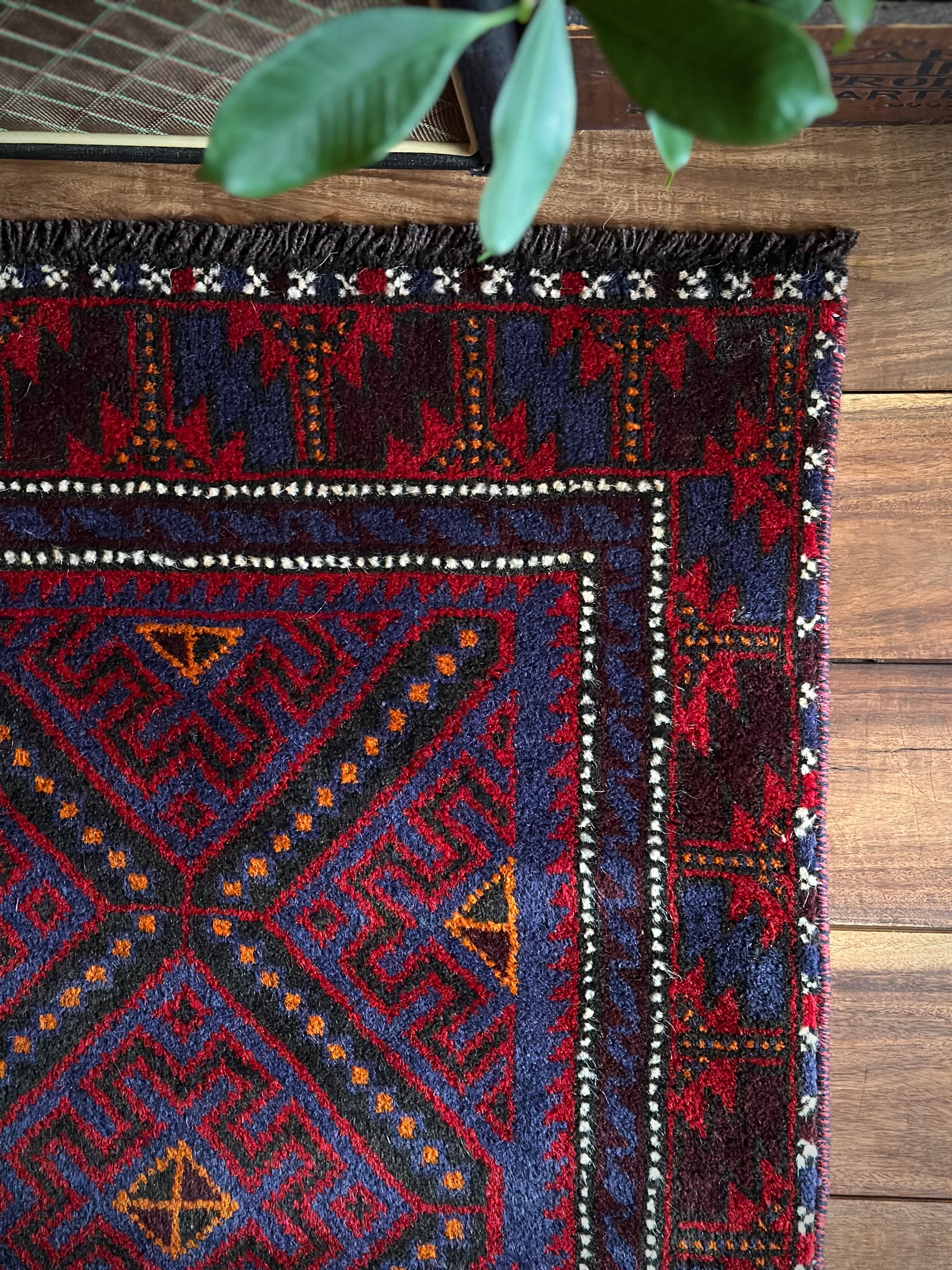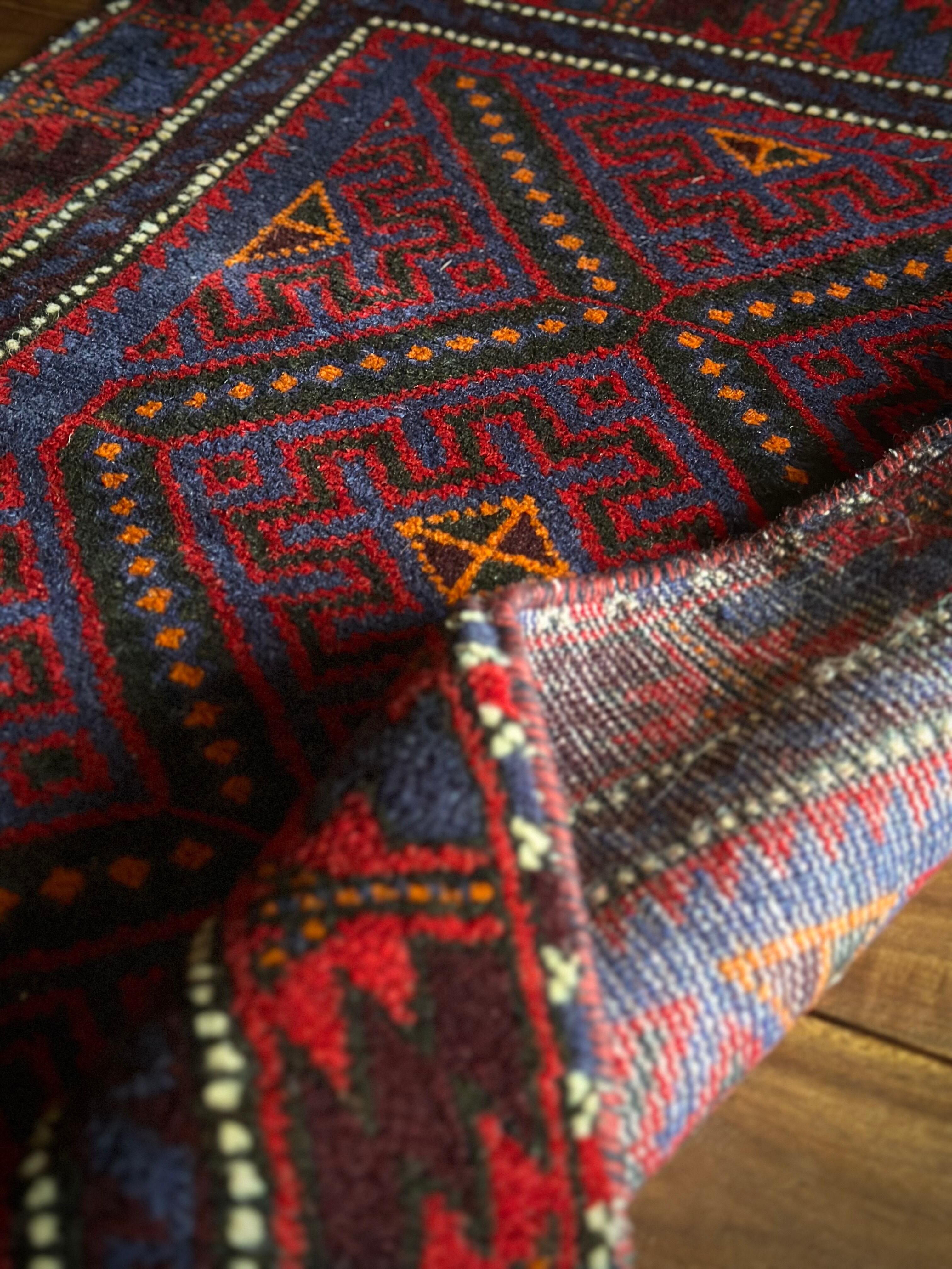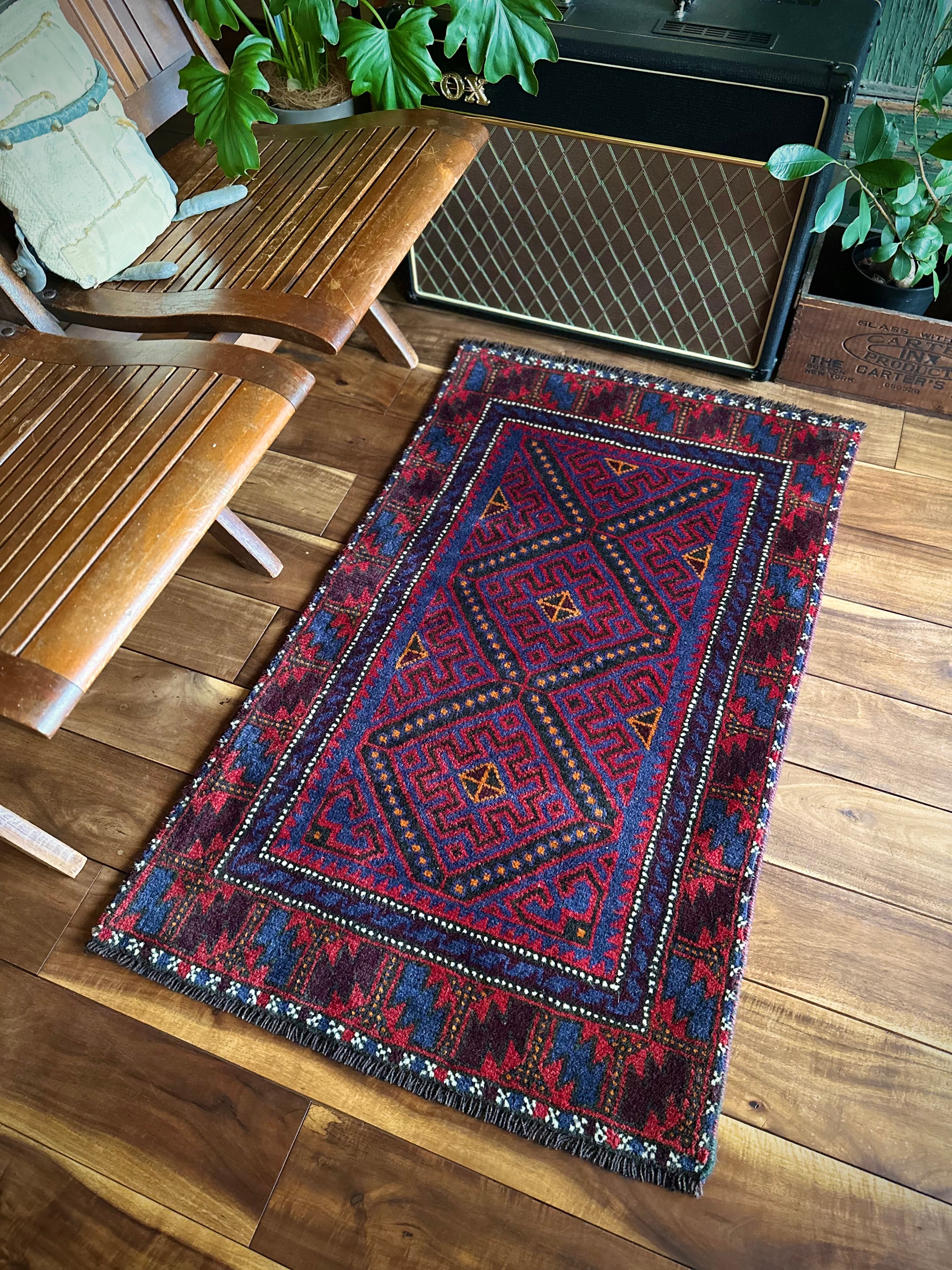 なんとも鮮やかな赤と青のポップな色合いが目を惹く1枚で、ポイントとしてオレンジを配した輪郭に白いラインが浮き出て見える、アフガニスタン西部のヘラート州に居住するバルーチ族のトライバルラグになります。