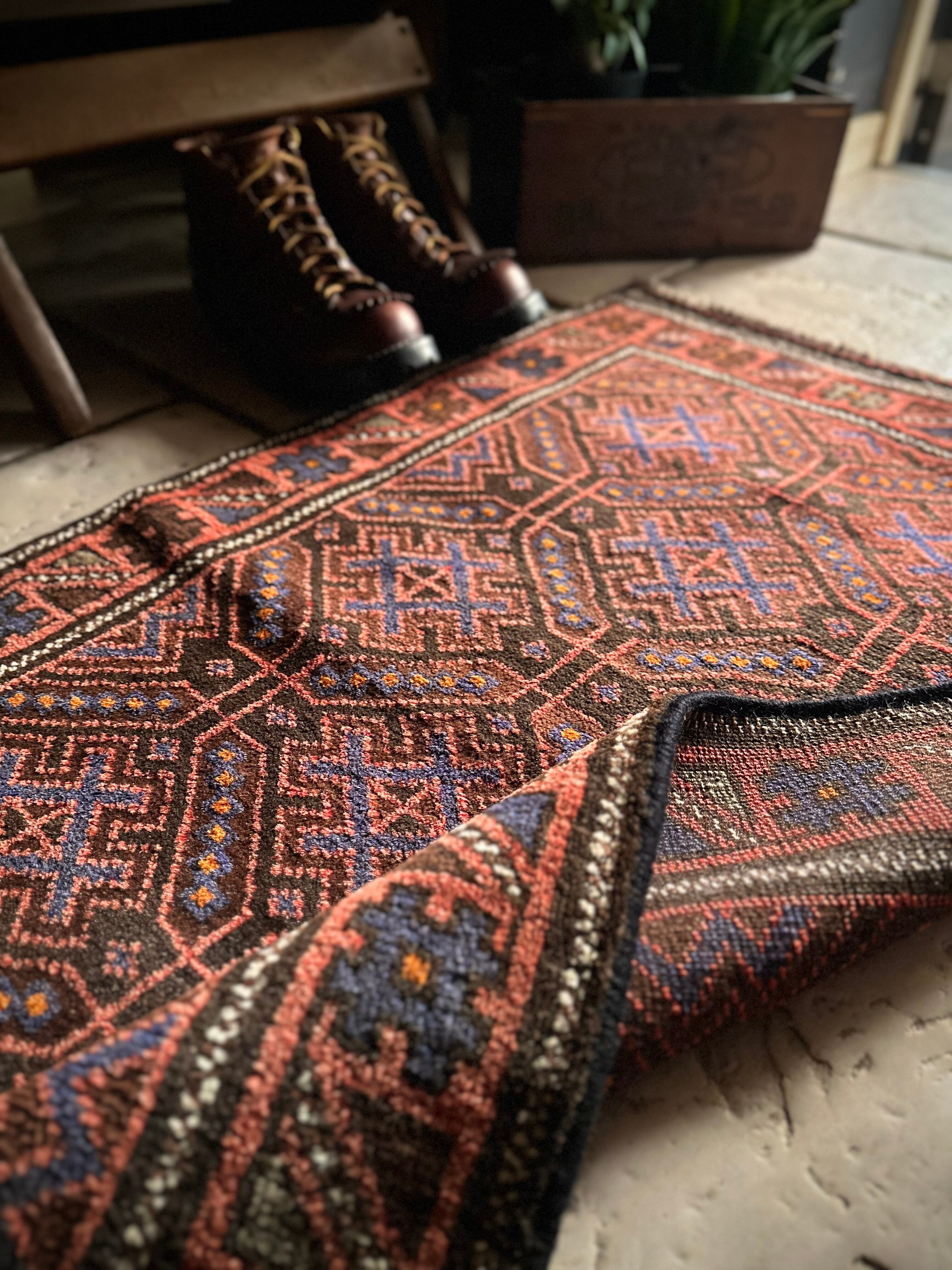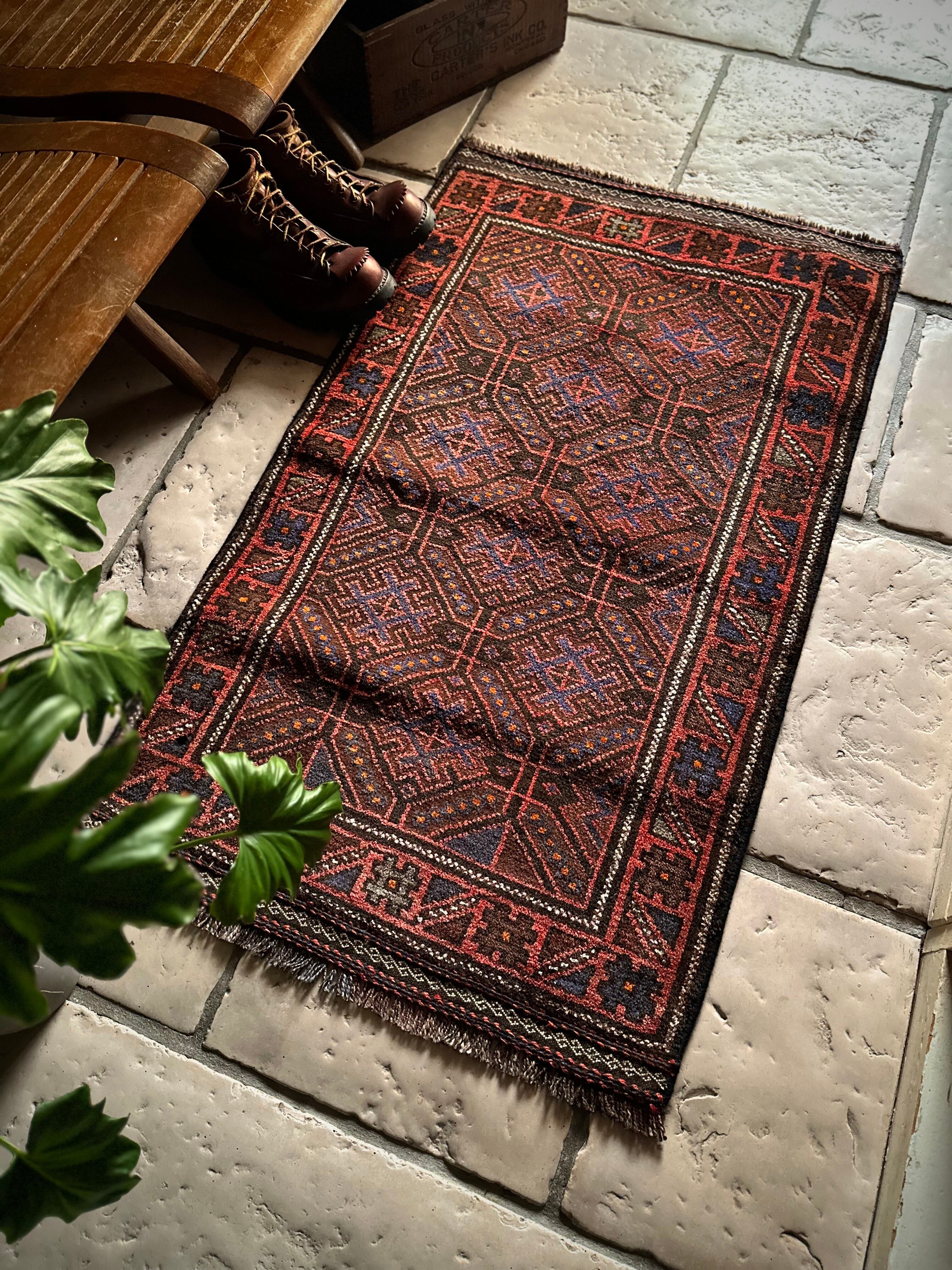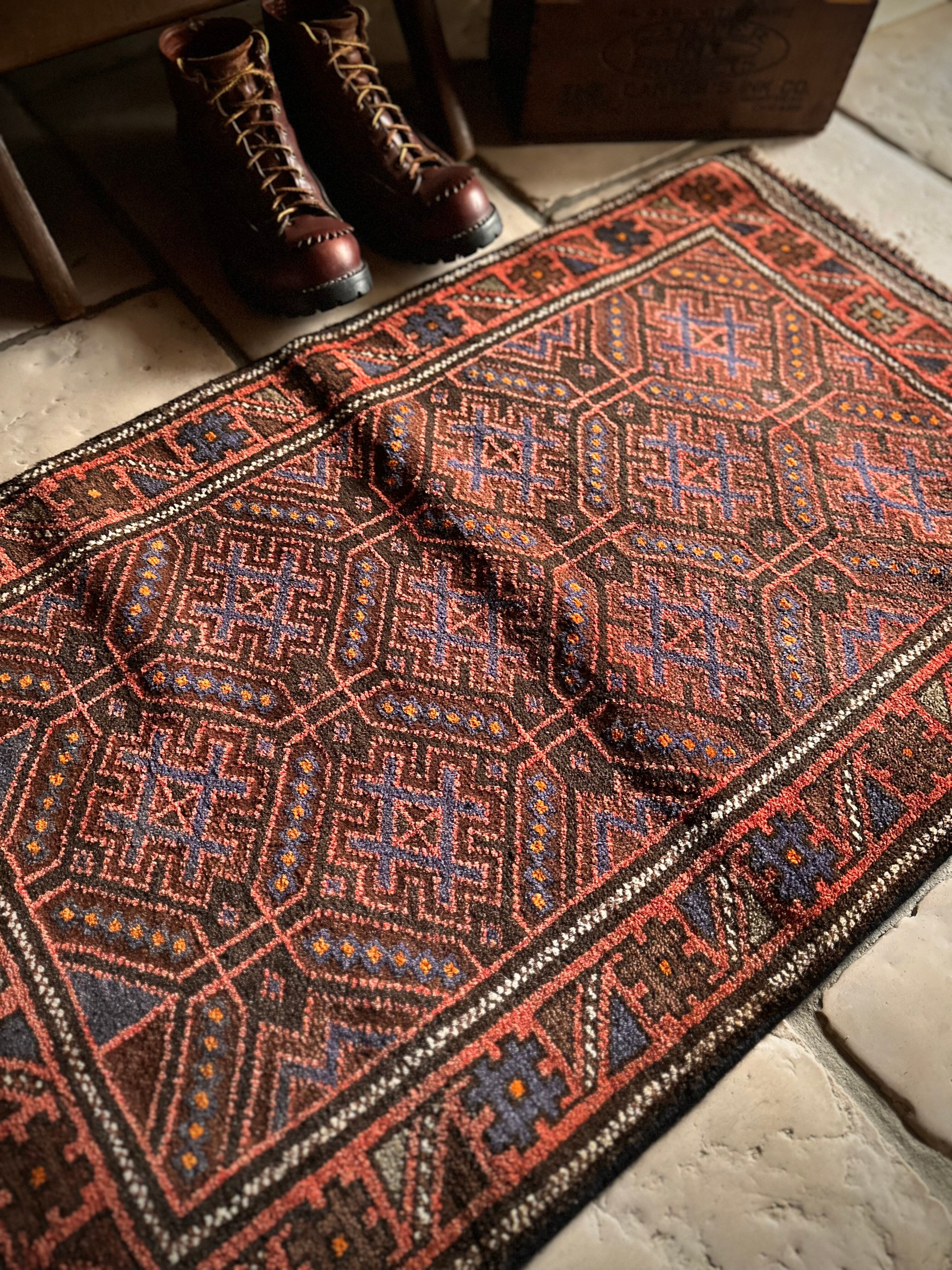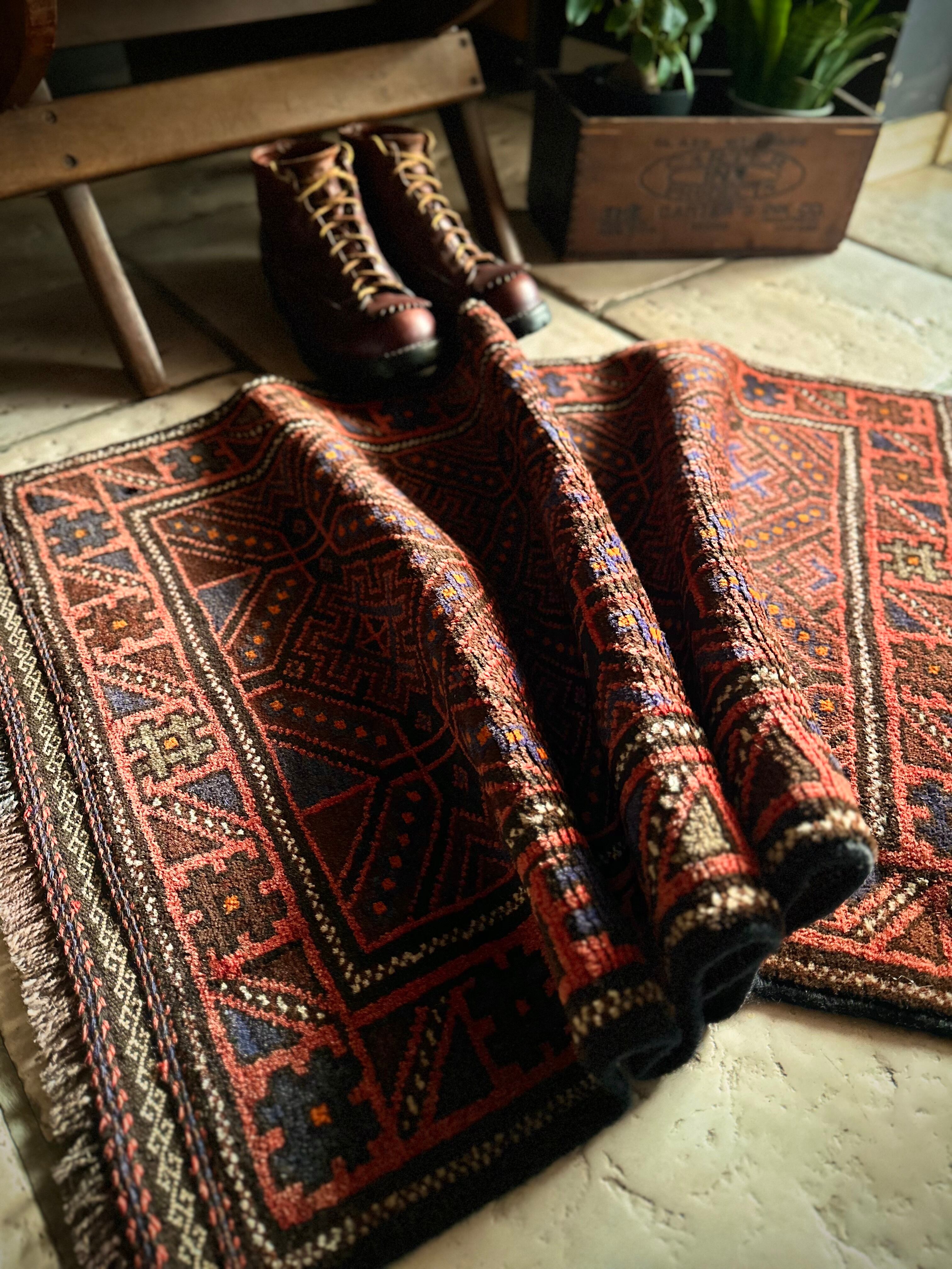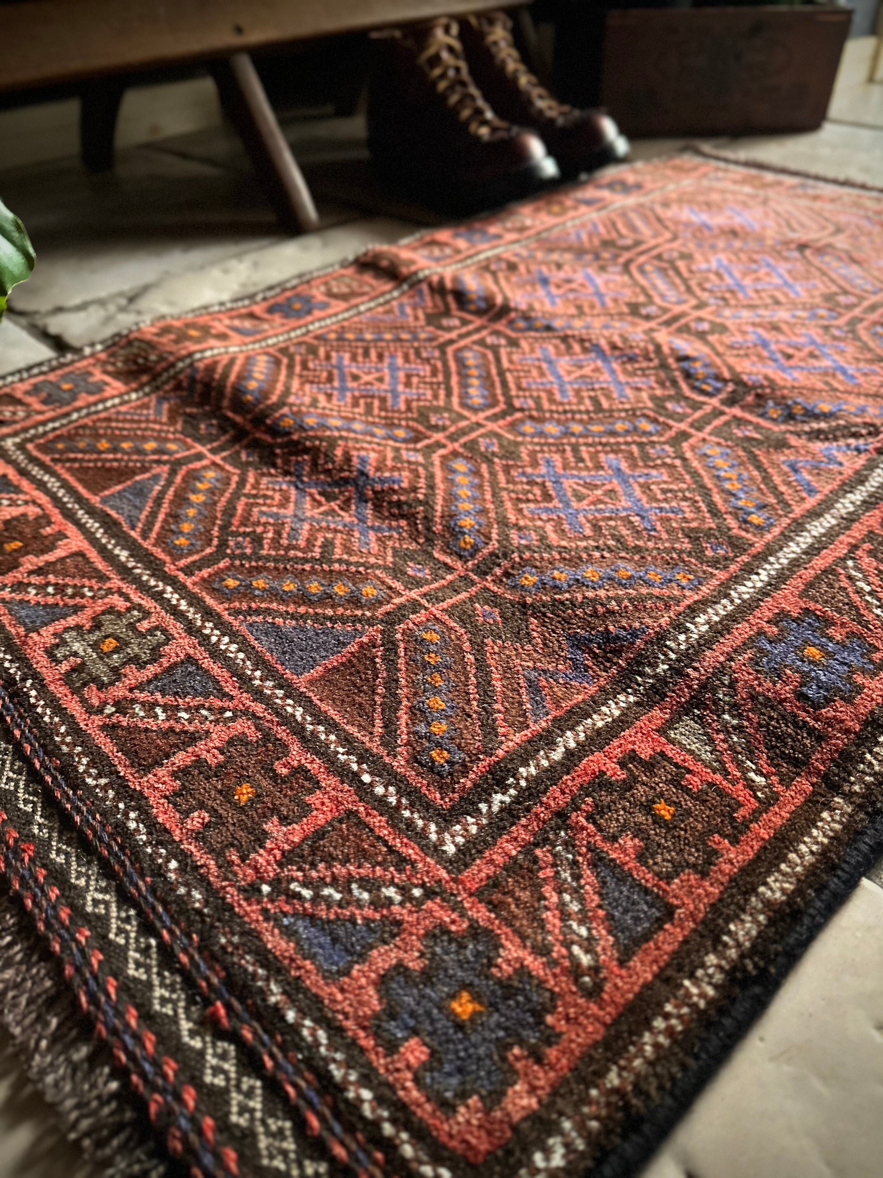レンガ色したテラコッタをベースカラーに、ブルーグレーの紋様が落ち着いた色合いを引き立てる、アフガニスタン西部のヘラート州に居住するバルーチ族のトライバルラグになります。