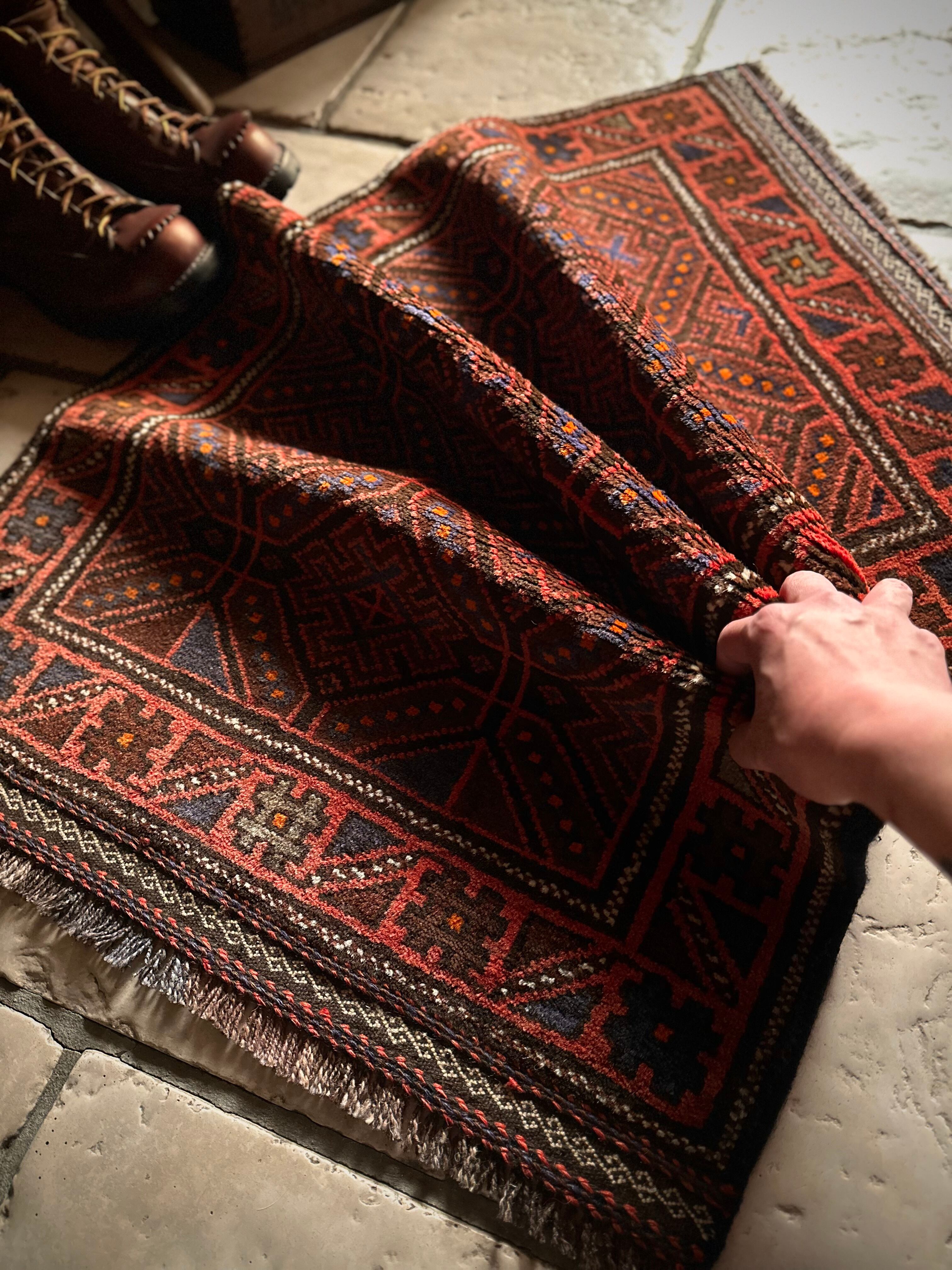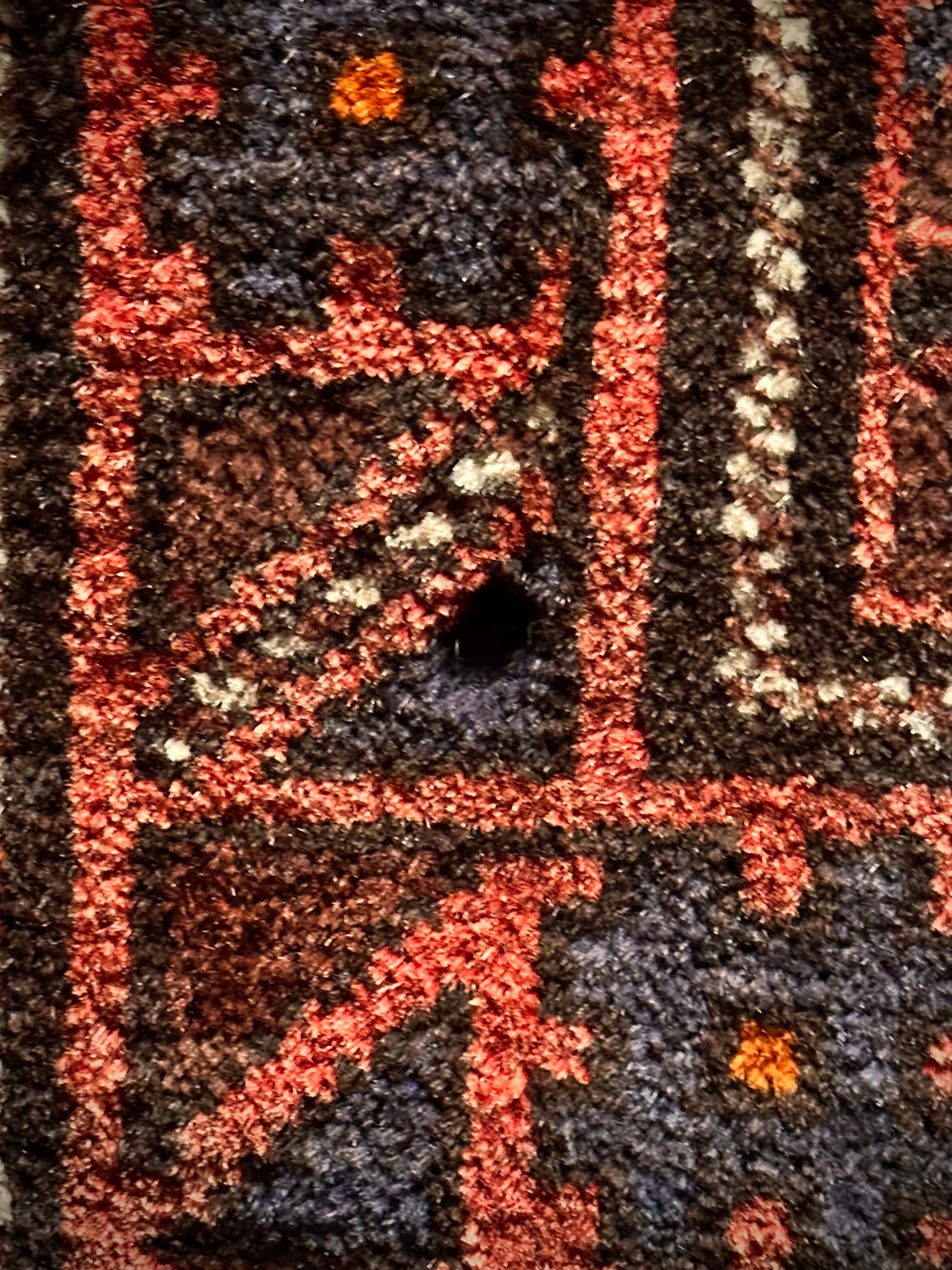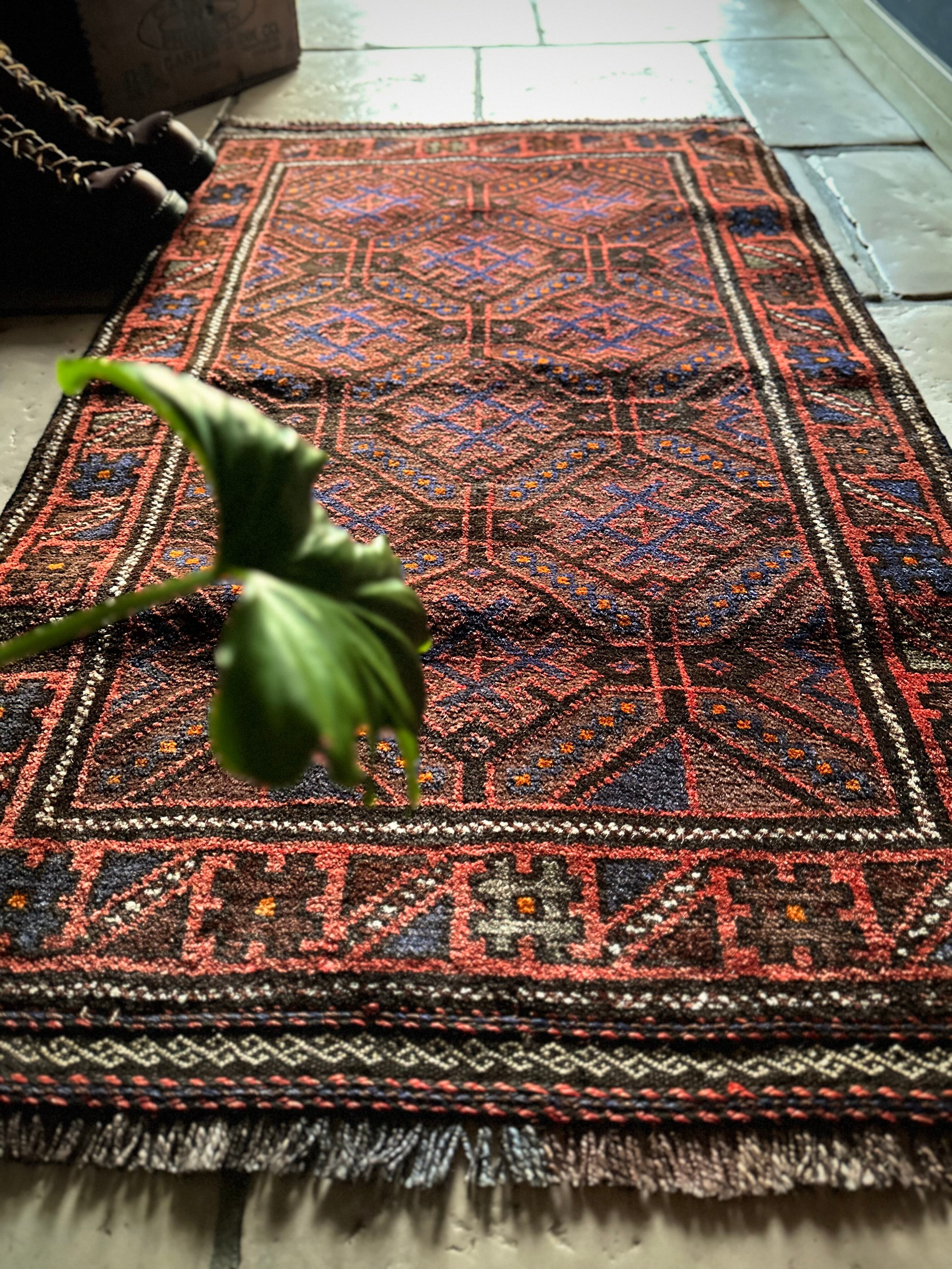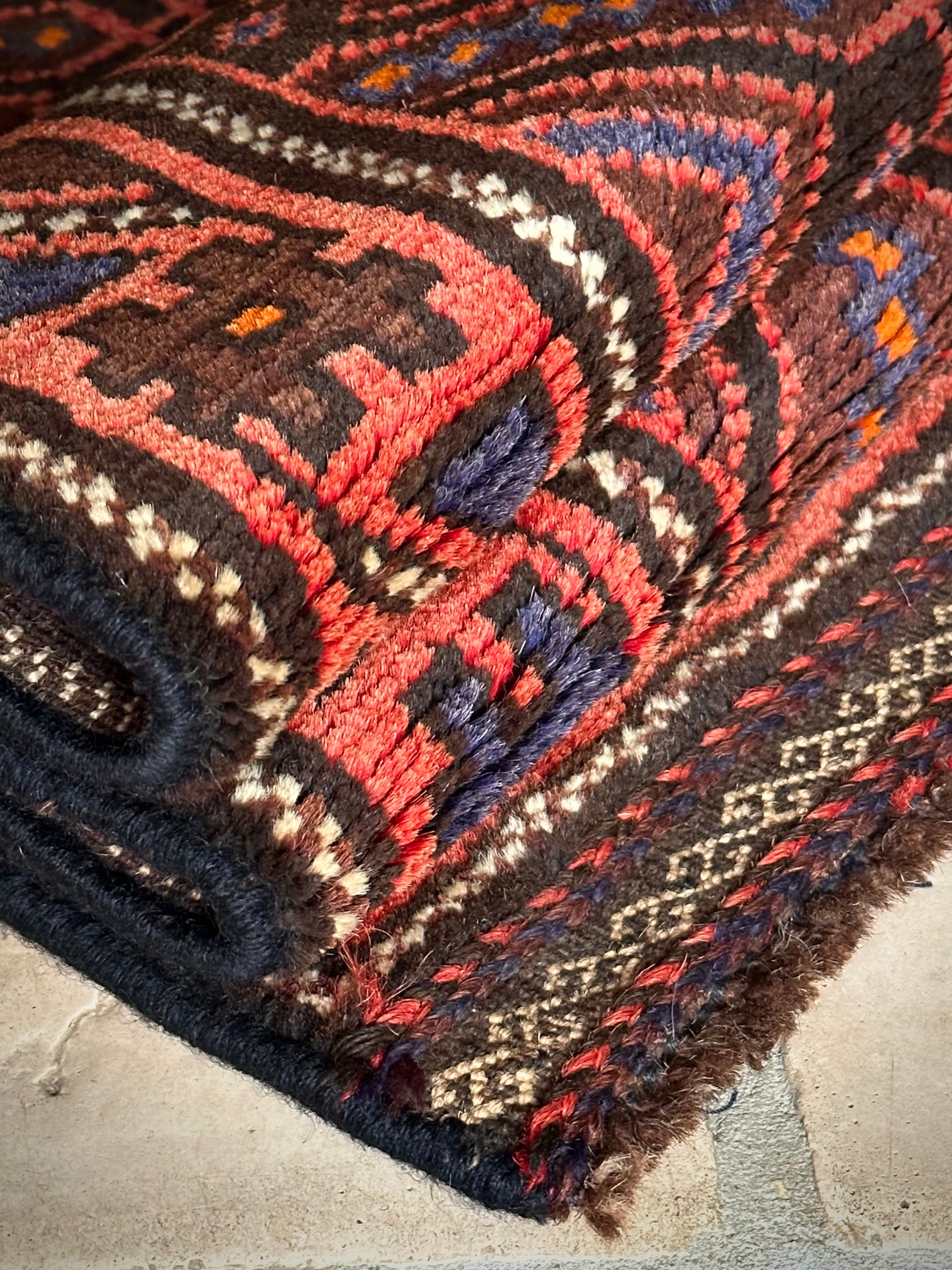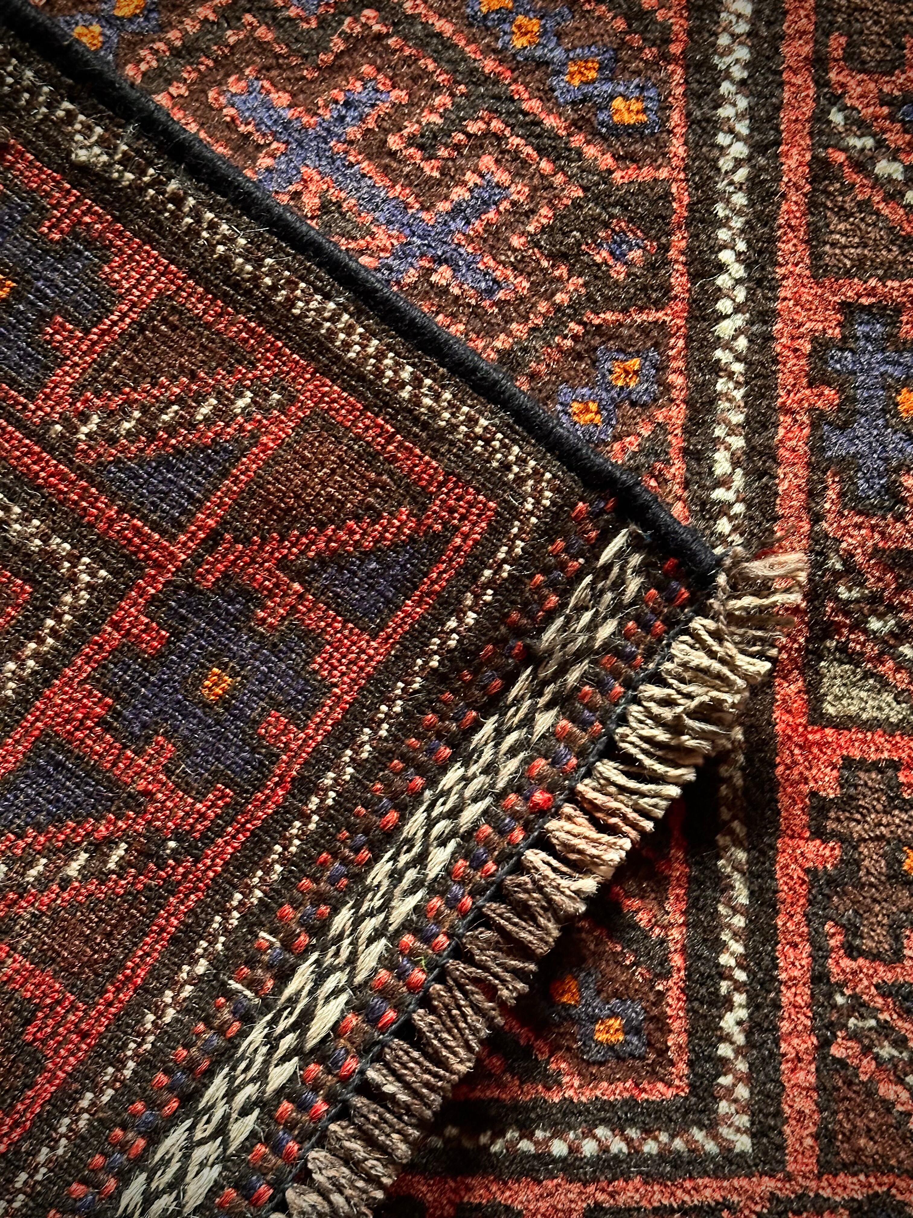 レンガ色したテラコッタをベースカラーに、ブルーグレーの紋様が落ち着いた色合いを引き立てる、アフガニスタン西部のヘラート州に居住するバルーチ族のトライバルラグになります。