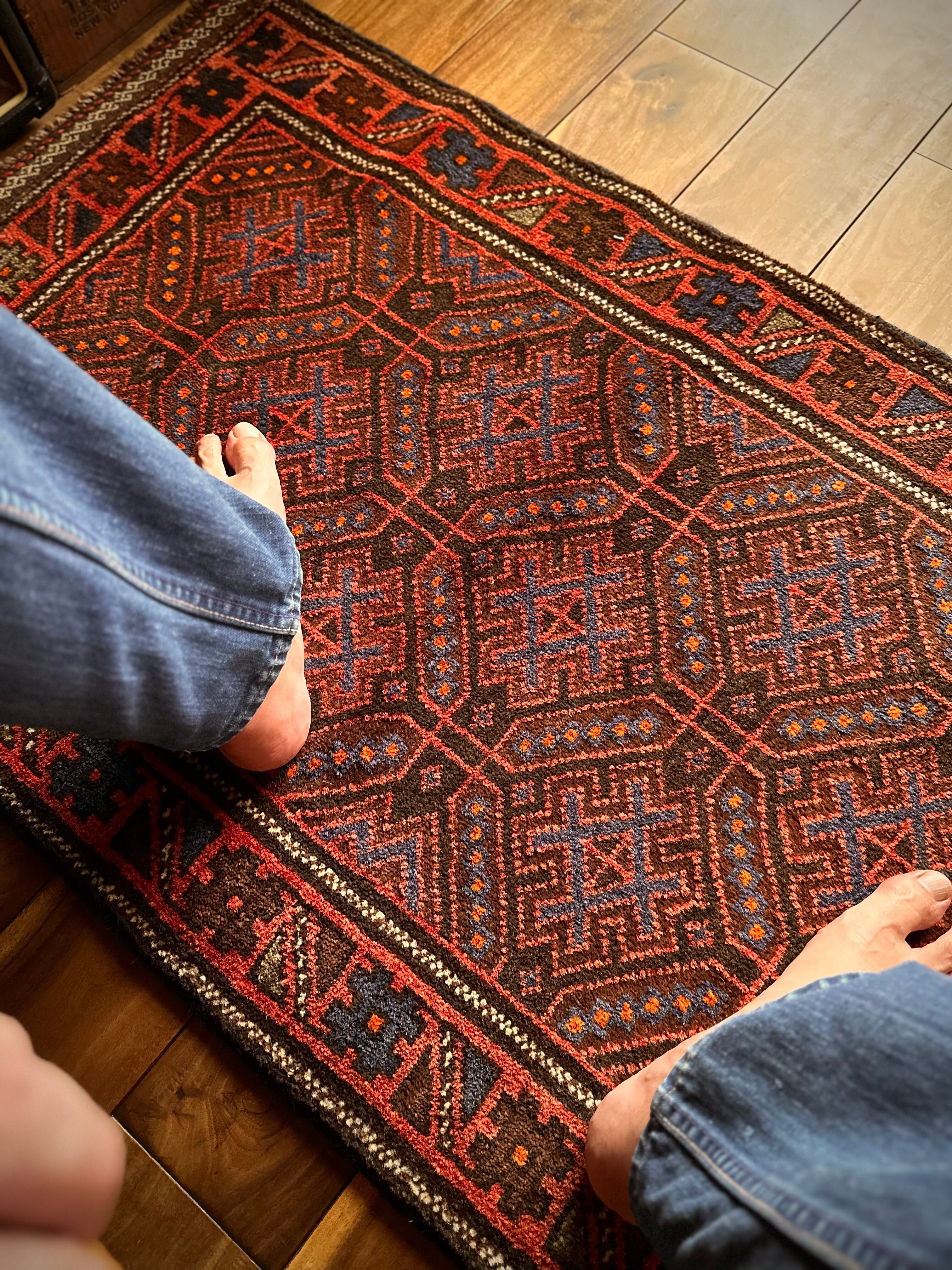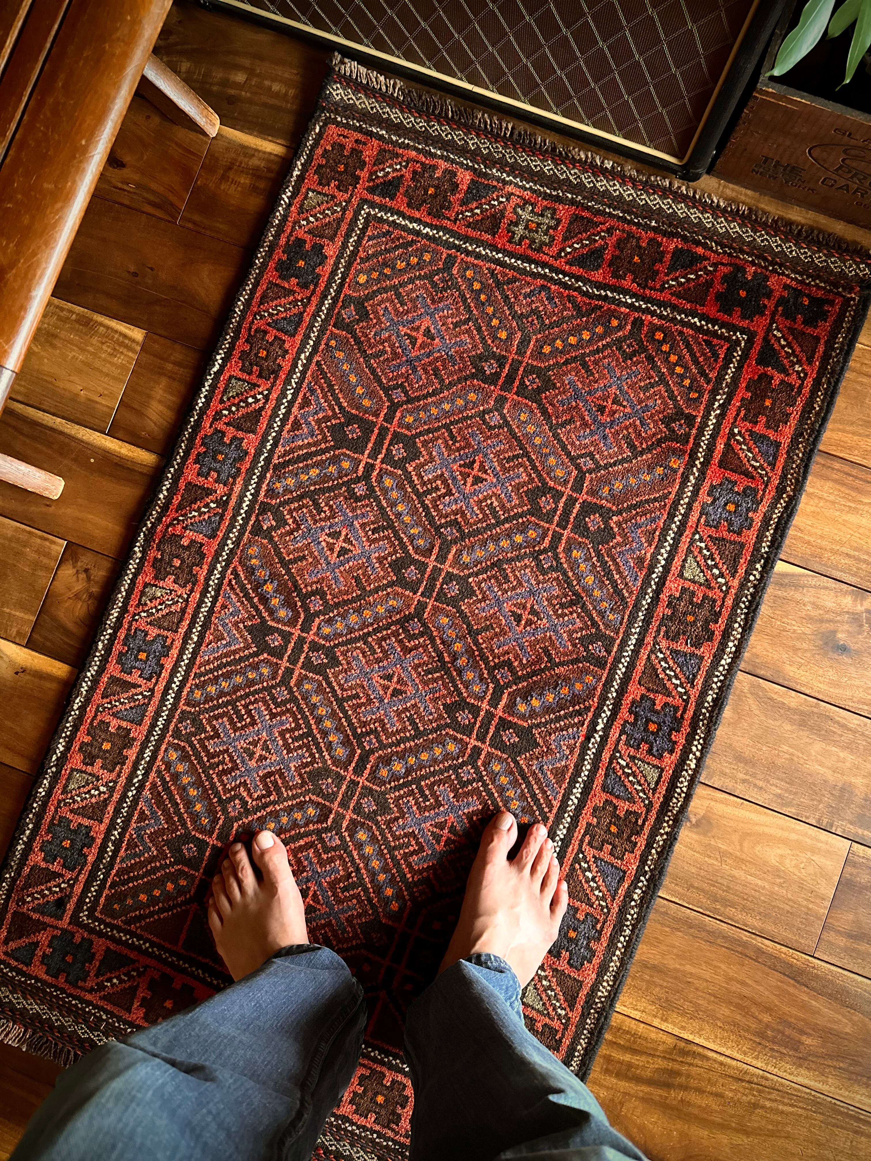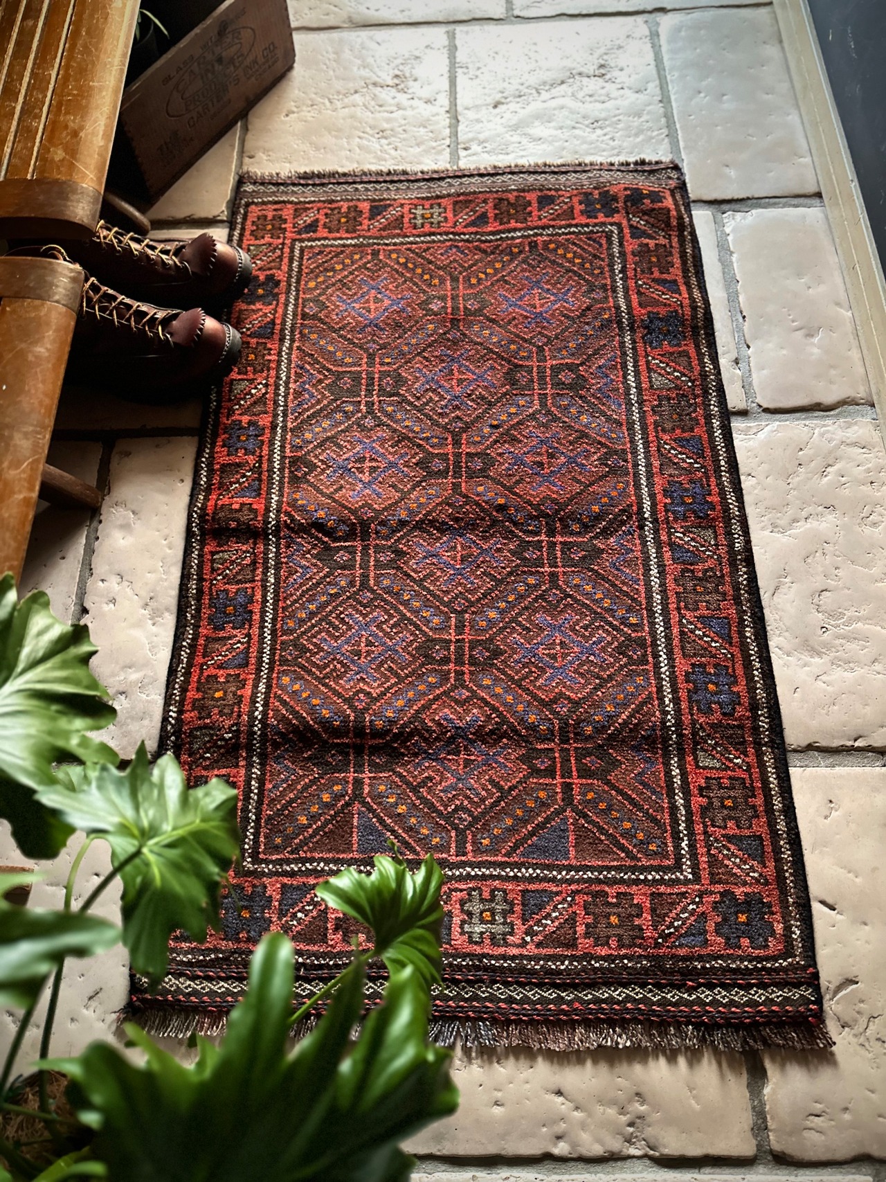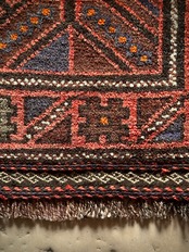 ヘラート産バルーチによく見られる井戸の井の紋様がシンプルで馴染みやすく、しっとりとした毛足の長いパイル織りで8ミリという厚さに足裏も大満足かと。個人的には手抜かりのない見事なキリムエンドの装飾がポイント高しな1枚になります。