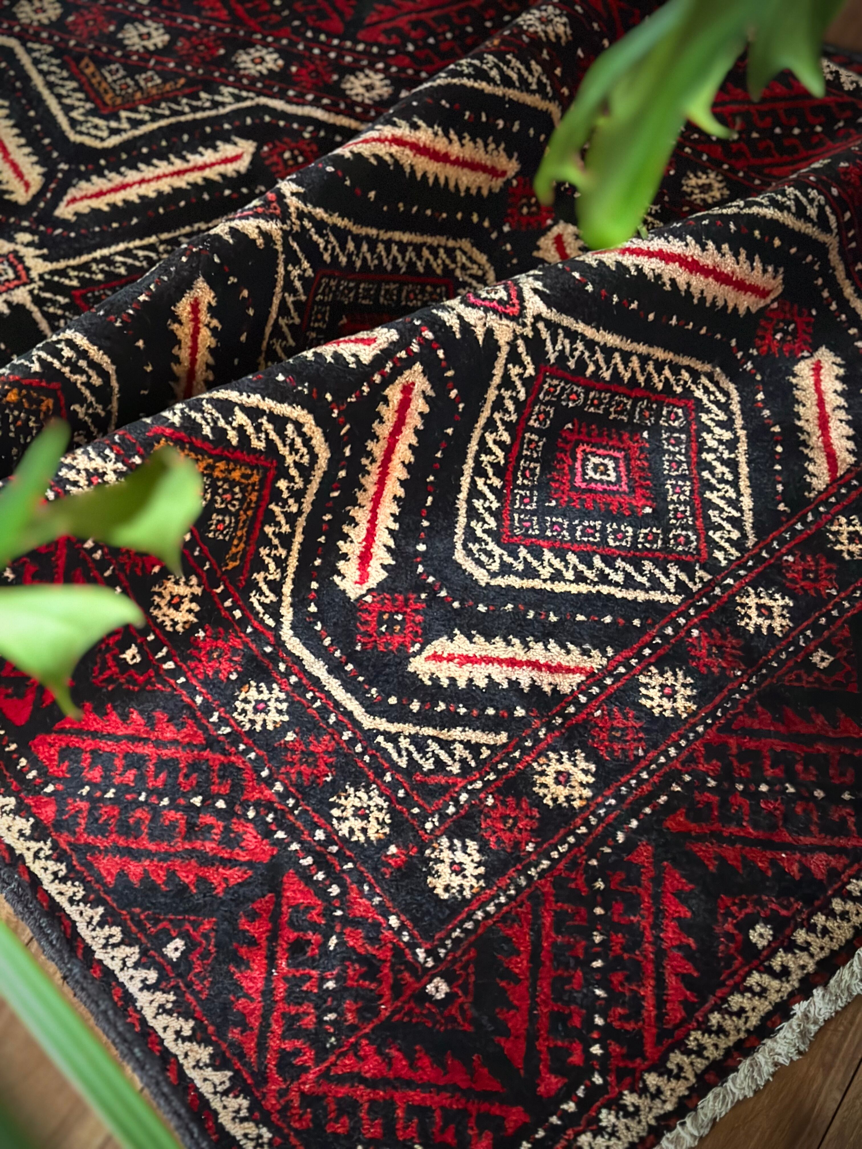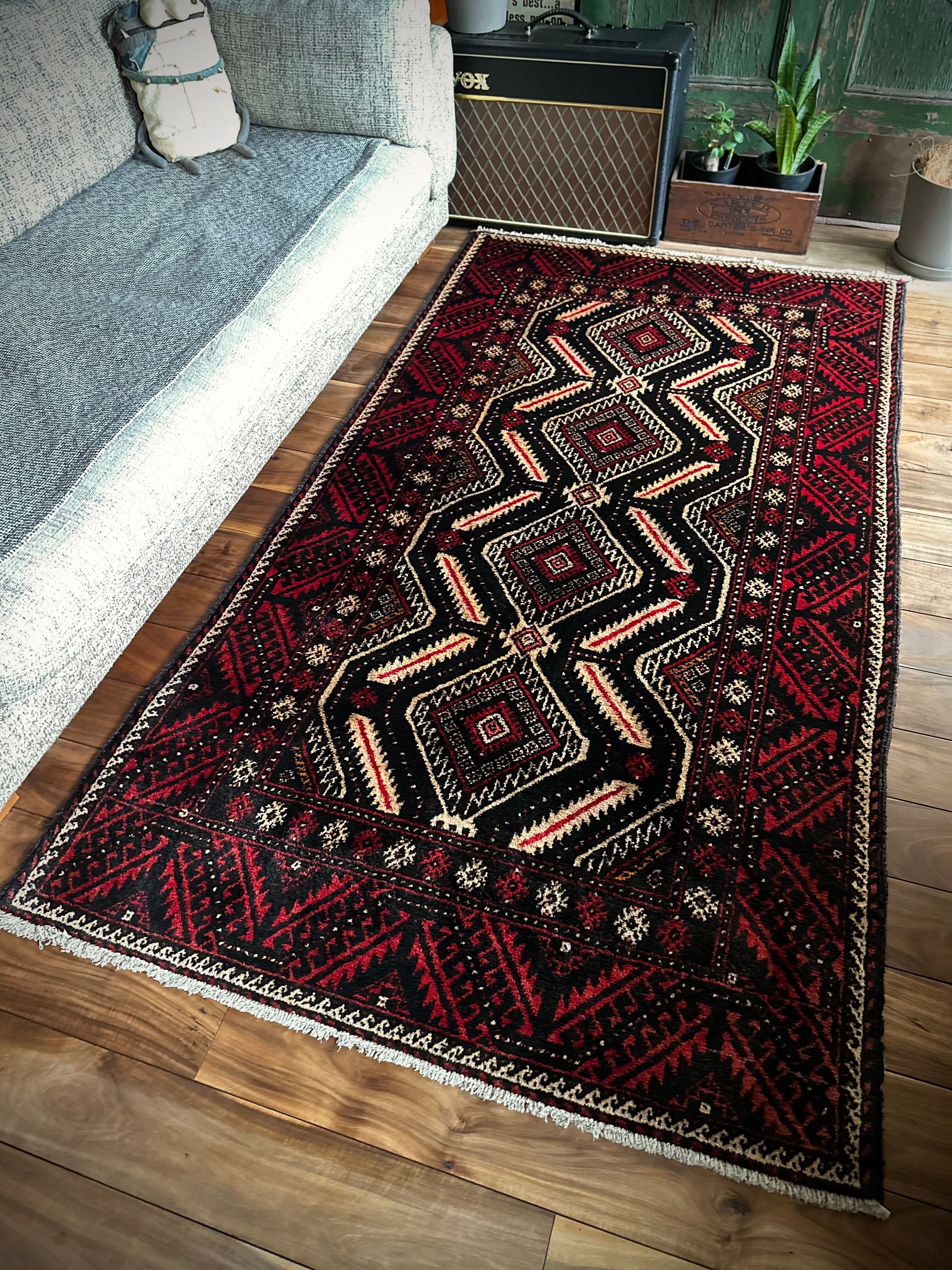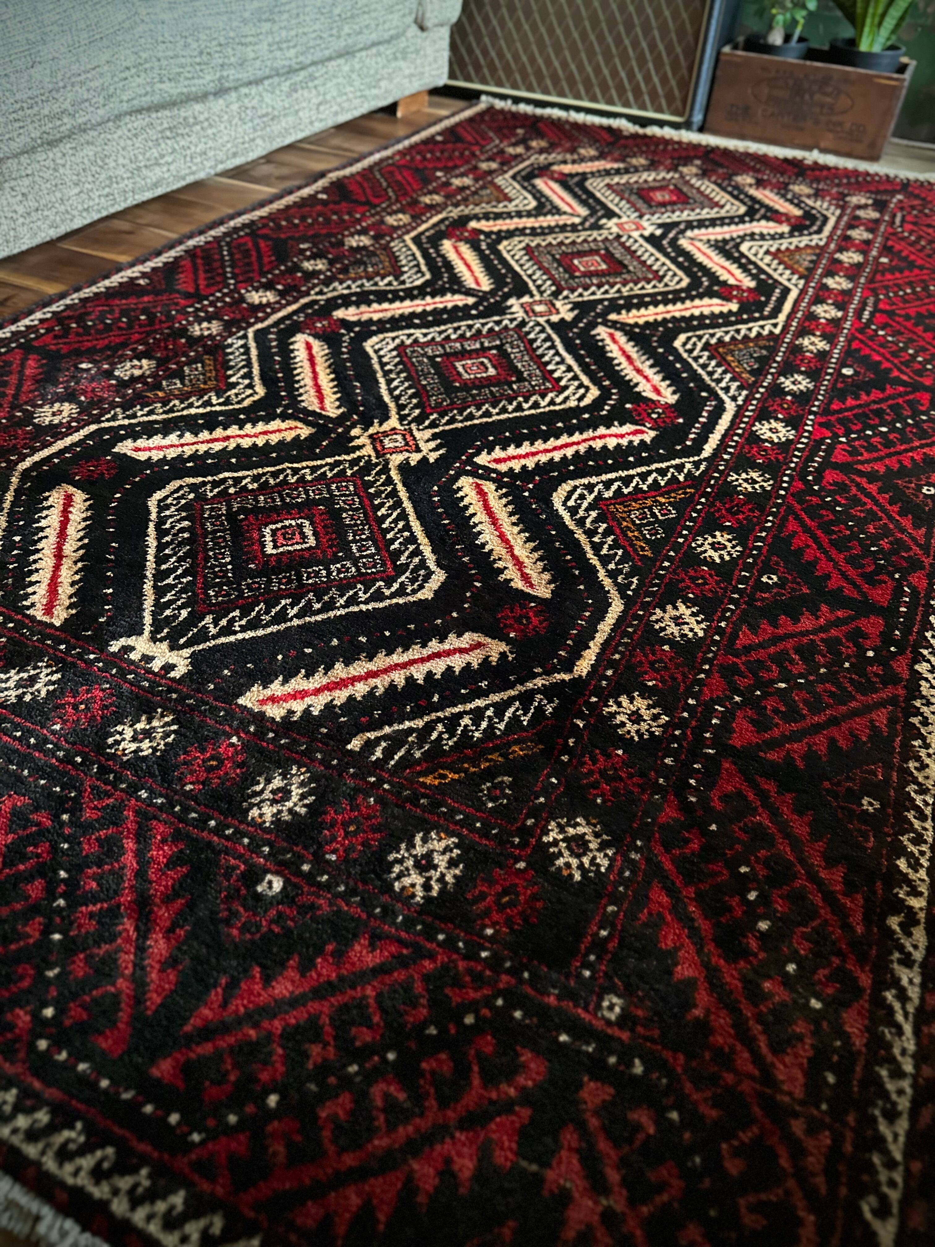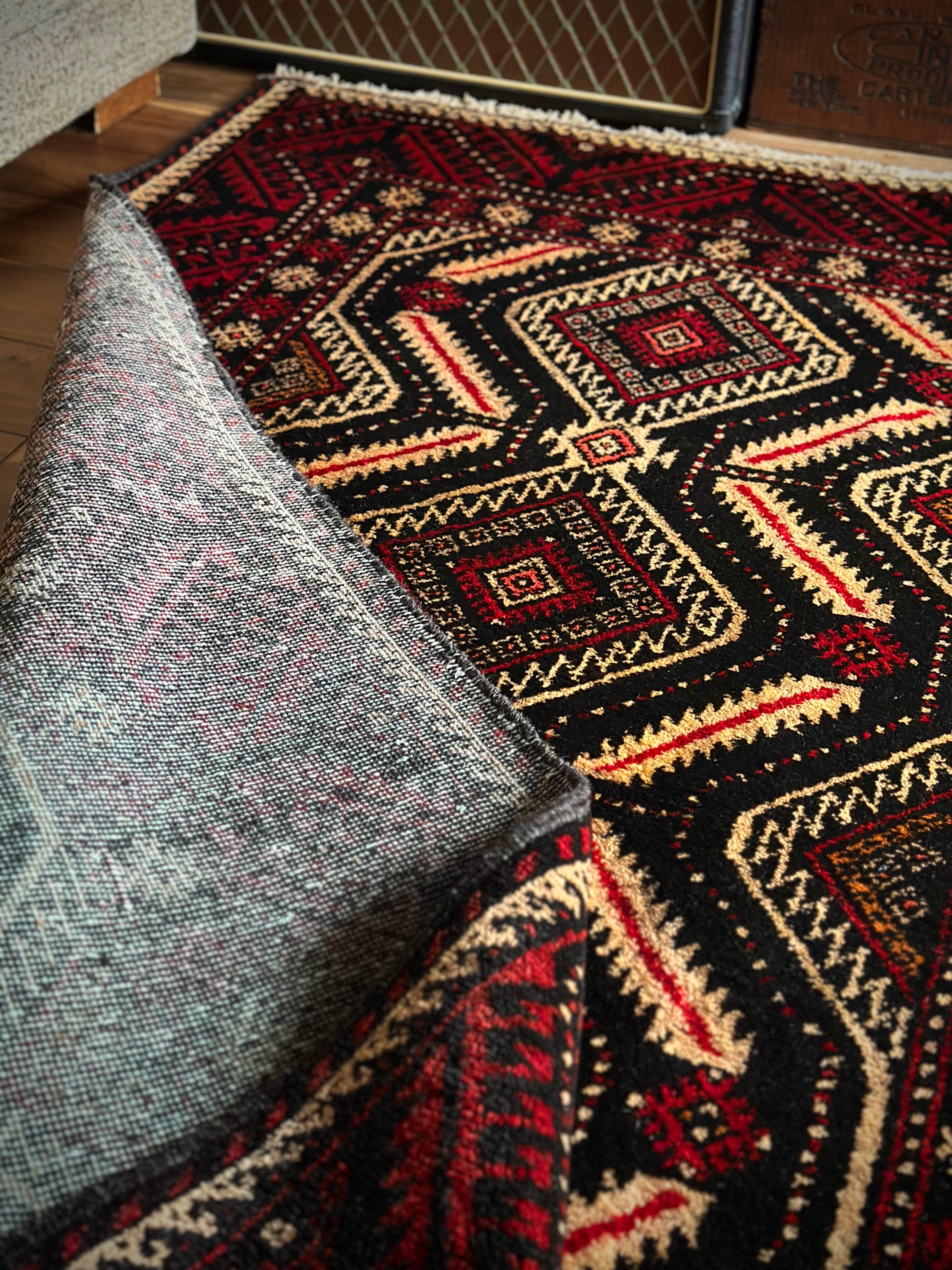 見た目のインパクトからしてめちゃくちゃにカッコいいマシュハド系バルーチ族のトライバルラグで、ブラック&レッドを基調にしながらベージュの輪郭がパキッと浮き彫りにされた、これぞトライバルラグという貫禄を印象づける1枚になります。