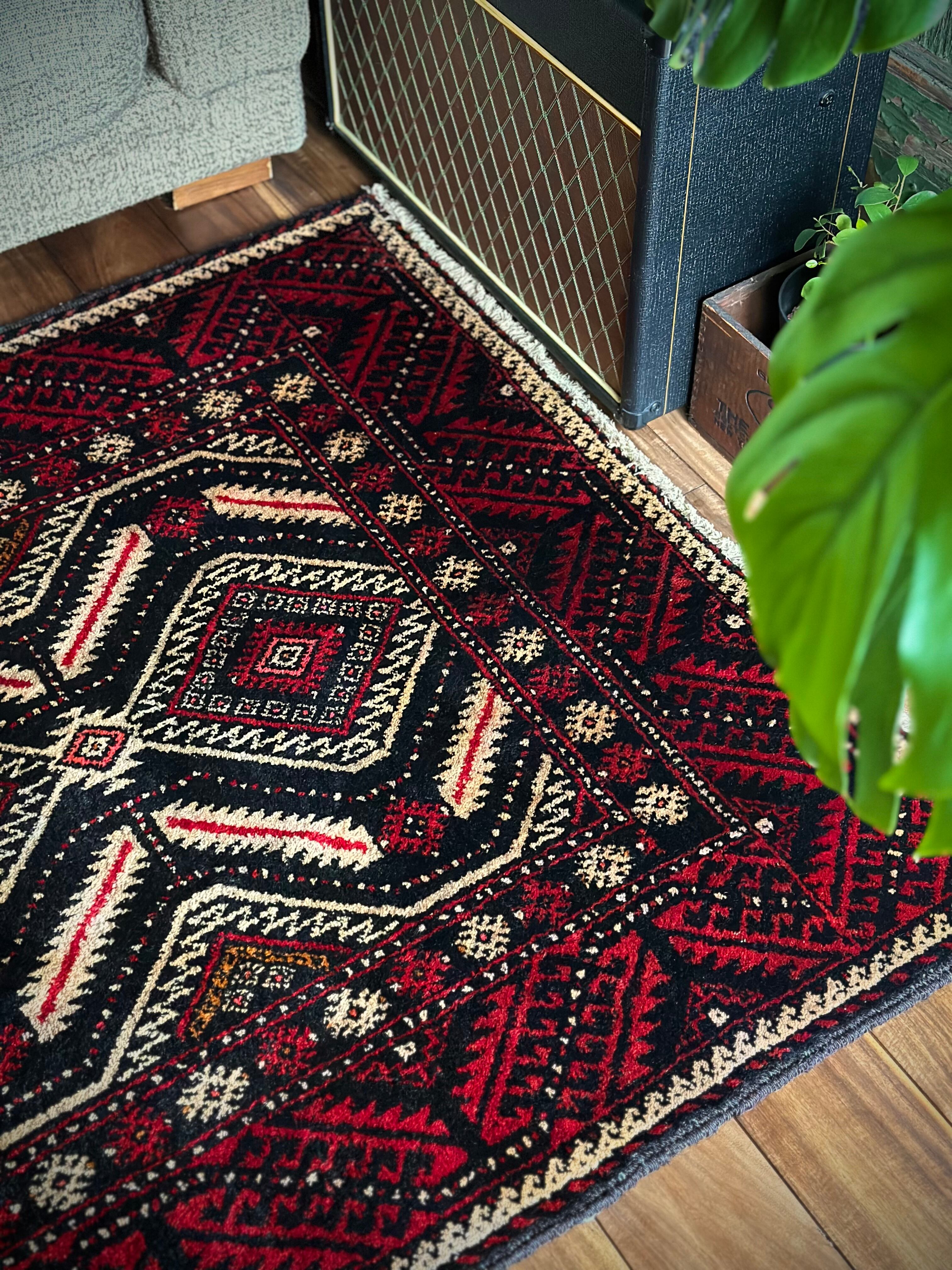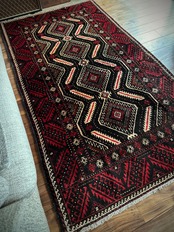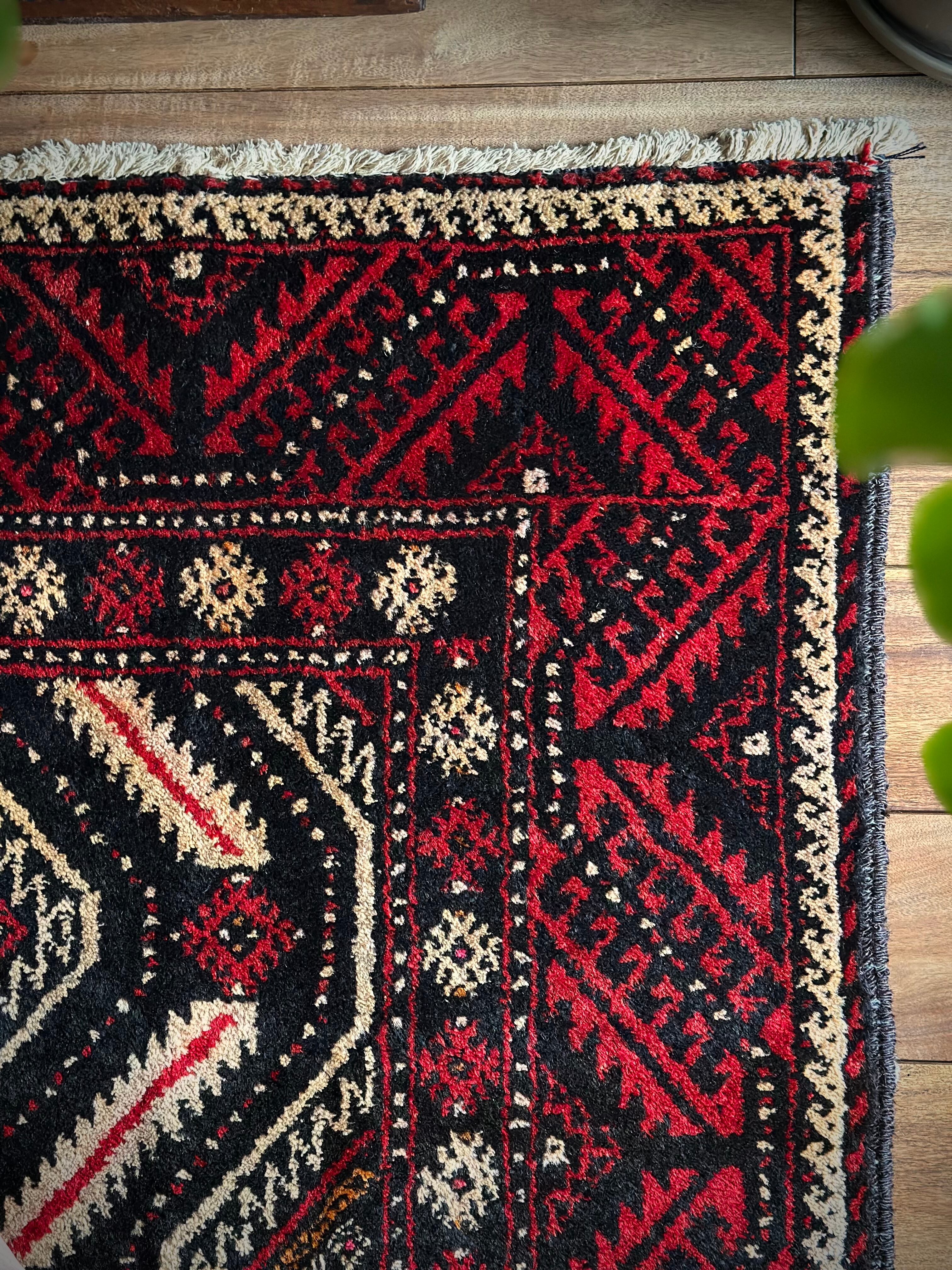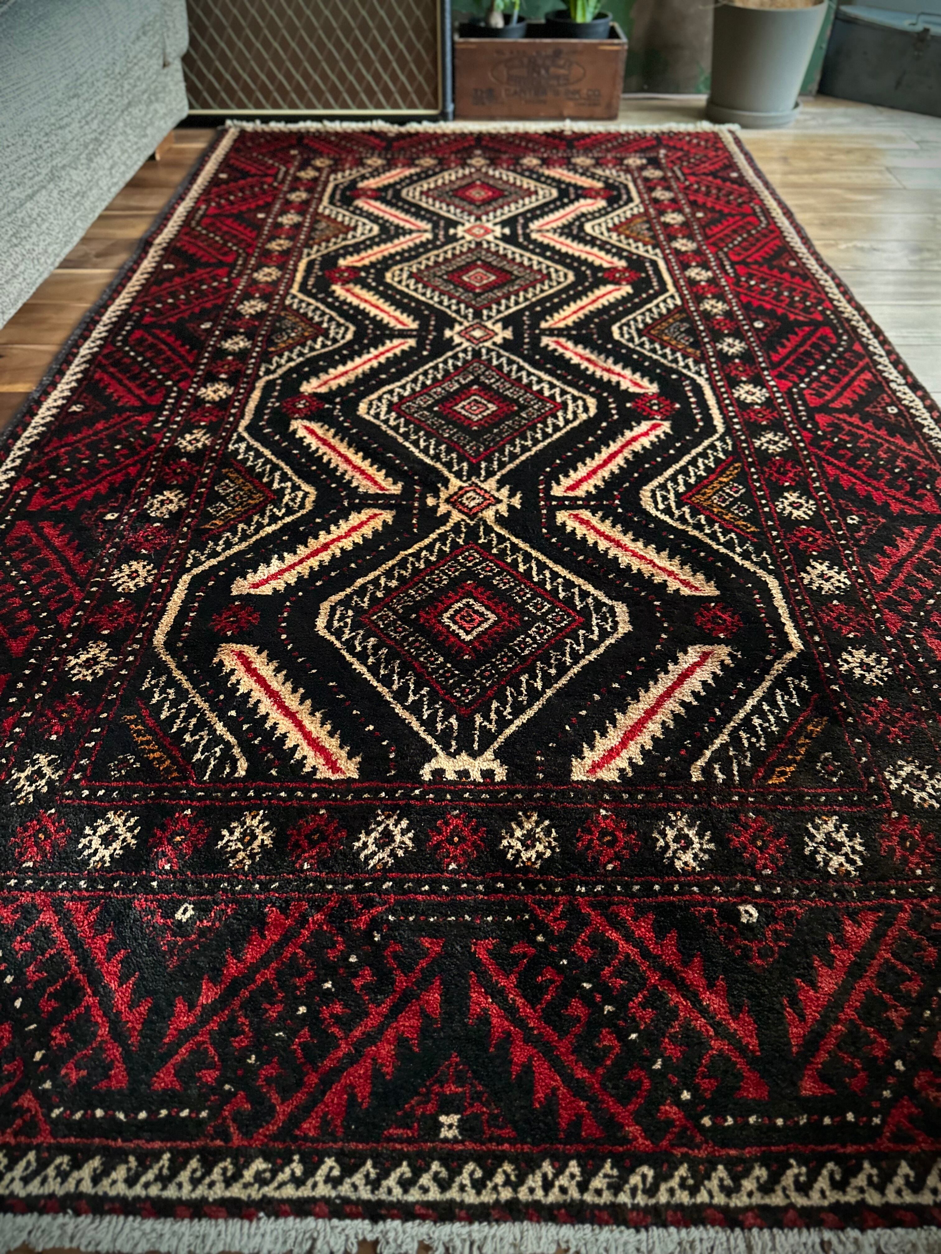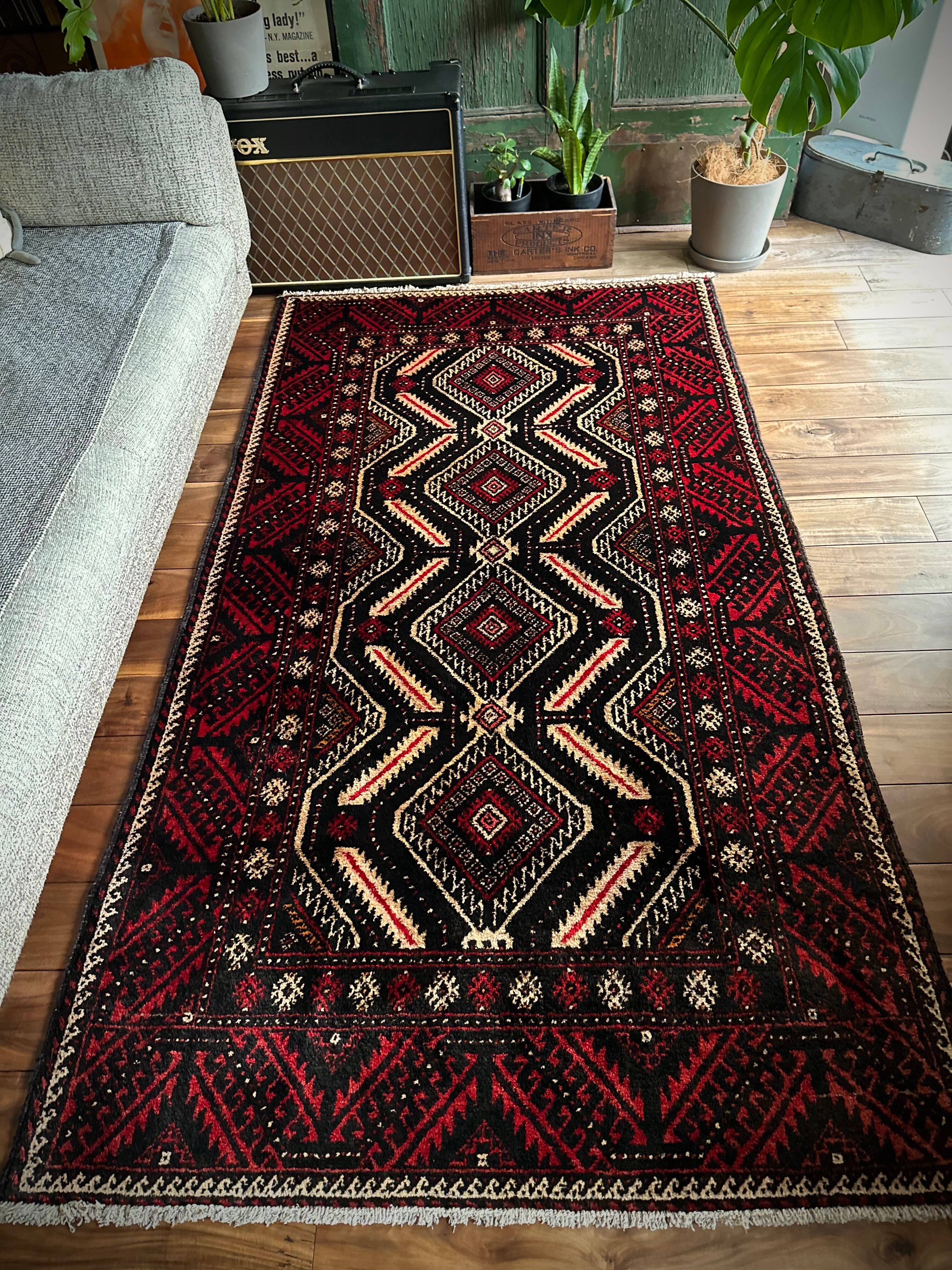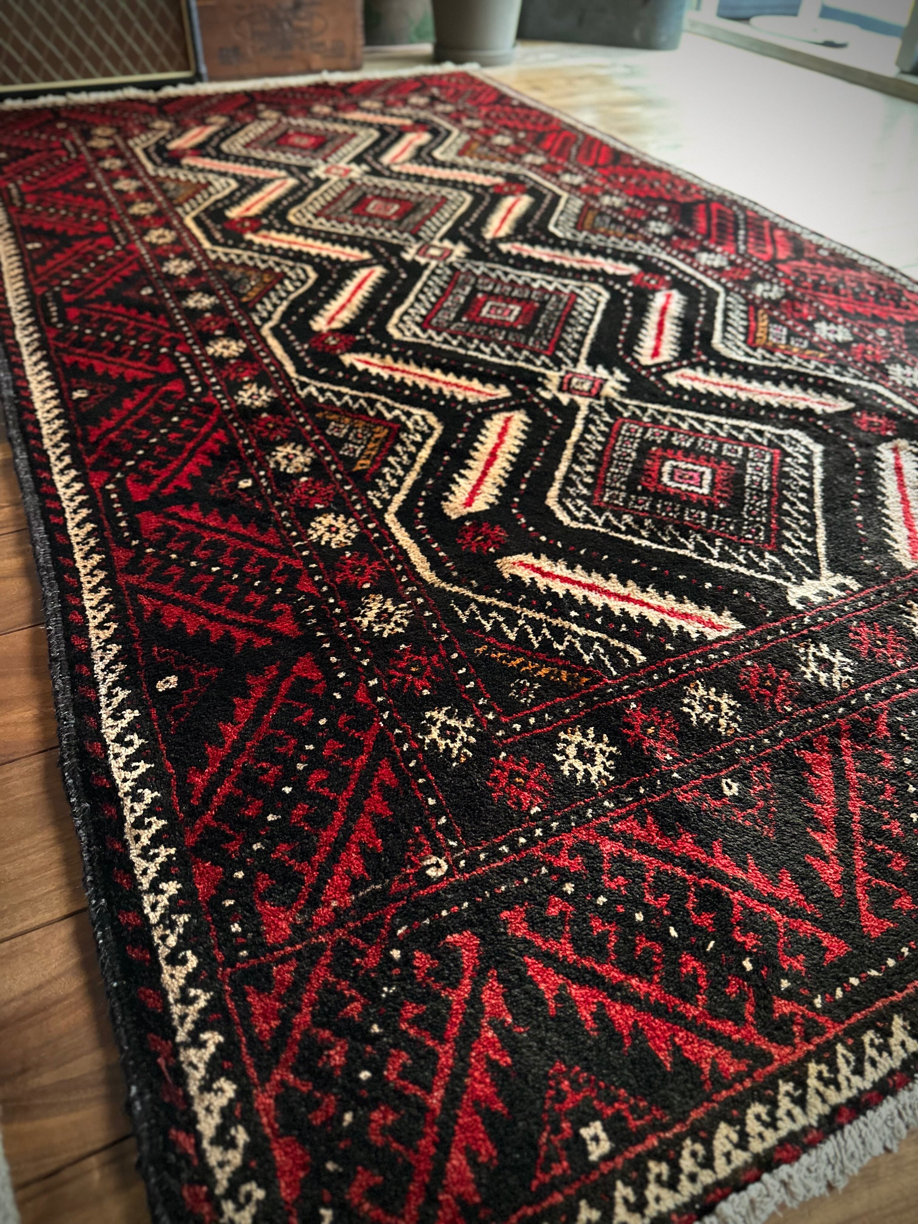 見た目のインパクトからしてめちゃくちゃにカッコいいマシュハド系バルーチ族のトライバルラグで、ブラック&レッドを基調にしながらベージュの輪郭がパキッと浮き彫りにされた、これぞトライバルラグという貫禄を印象づける1枚になります。