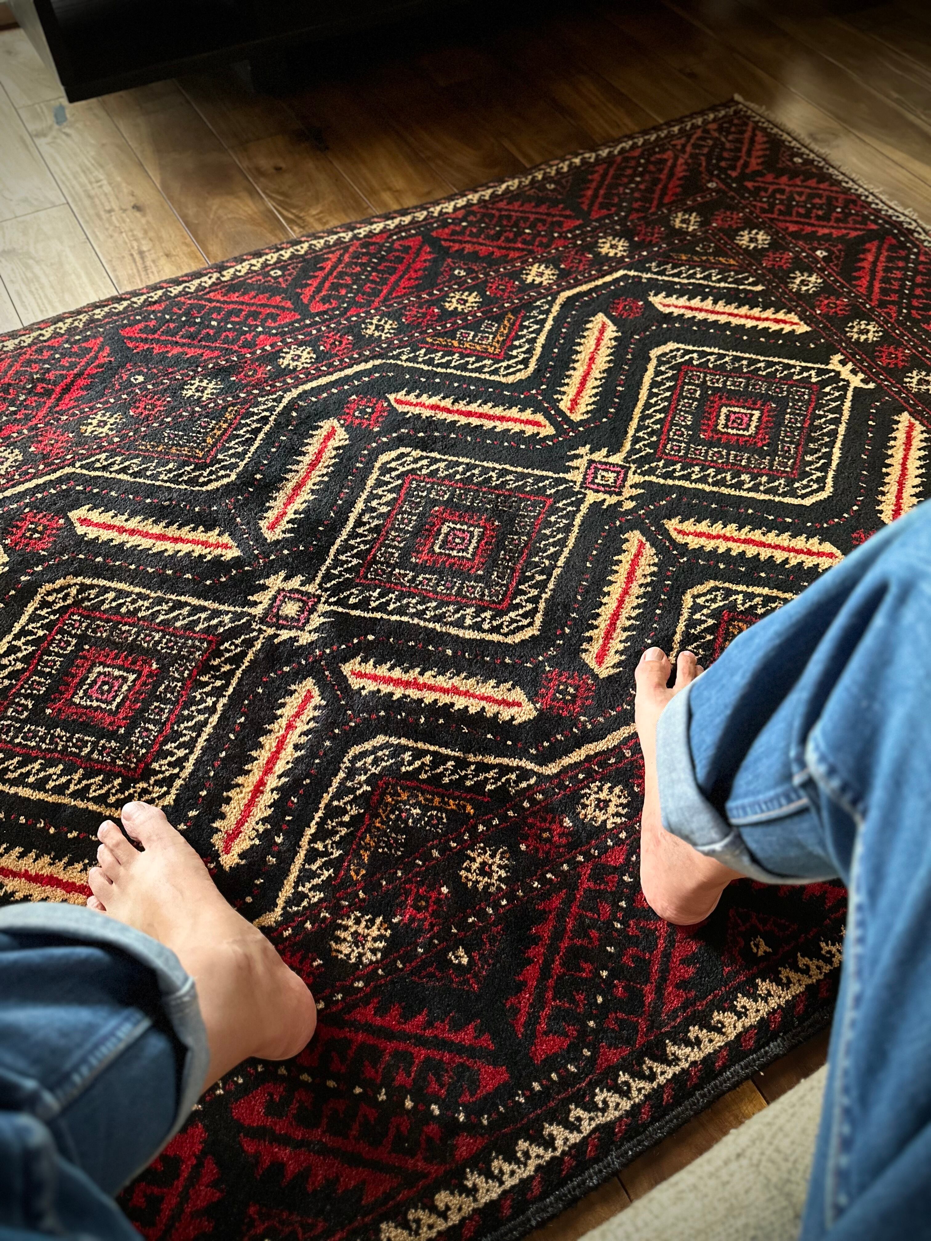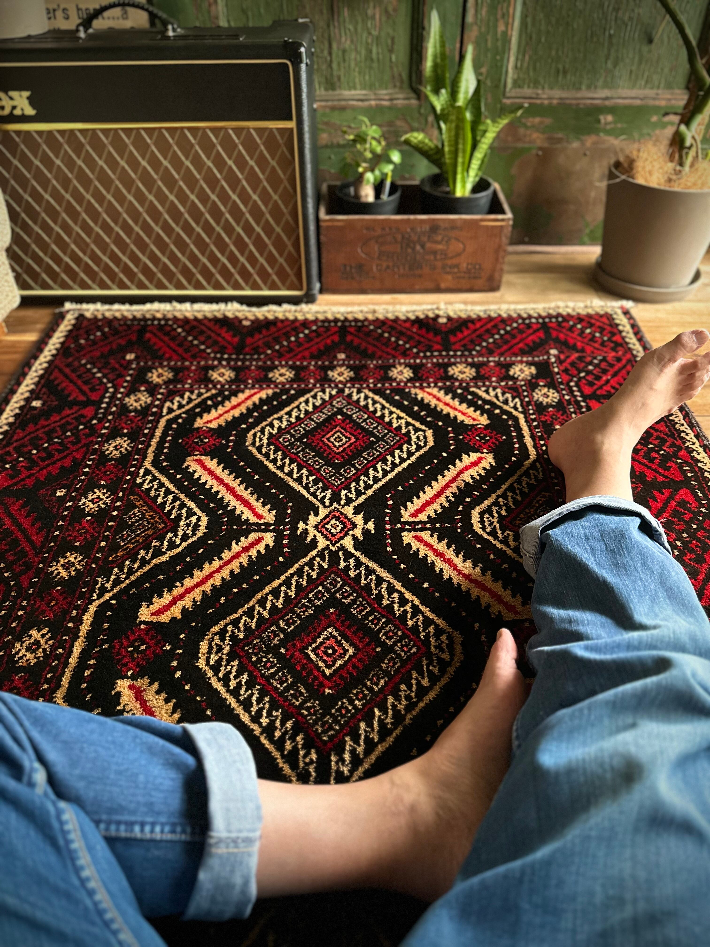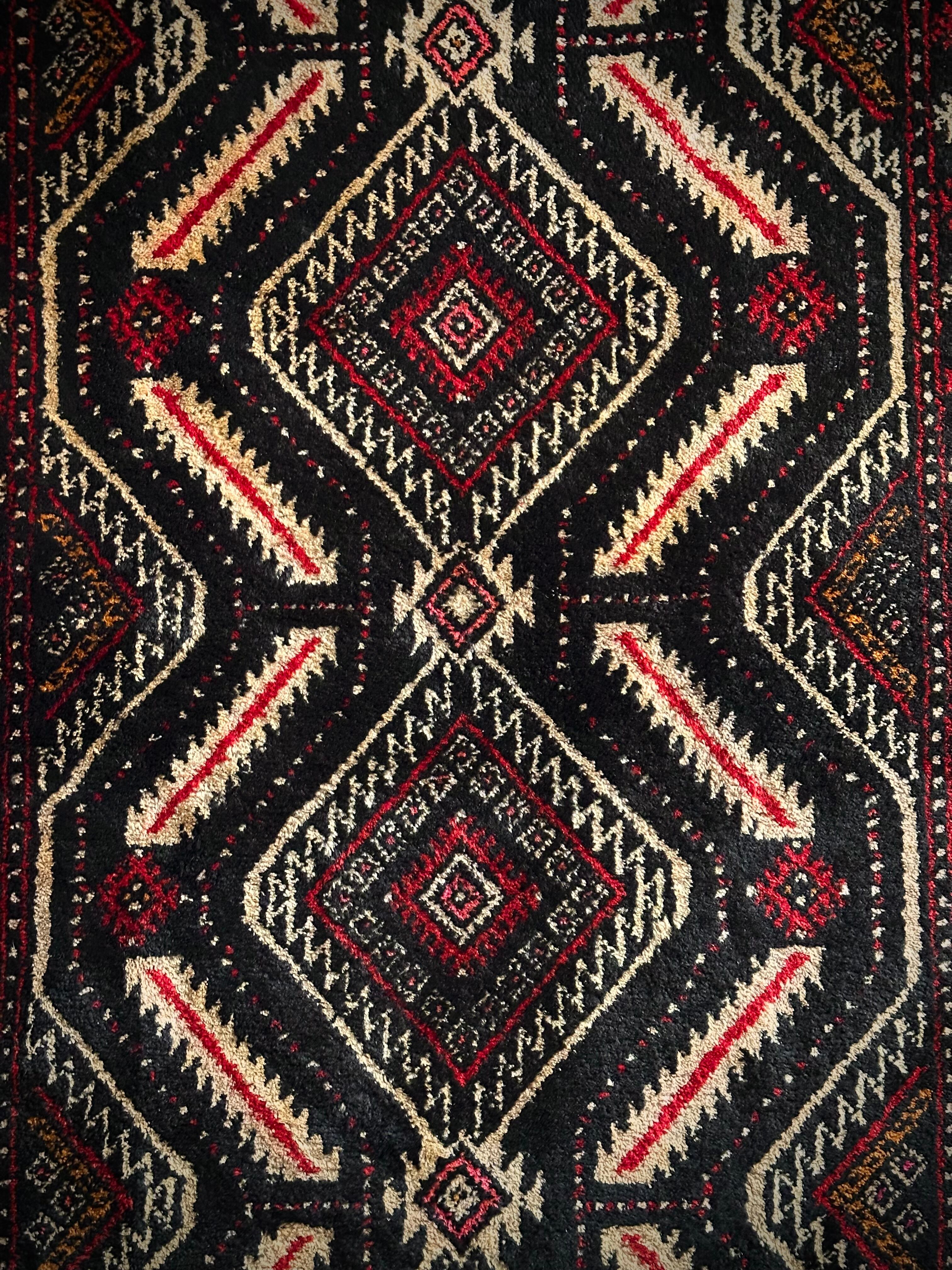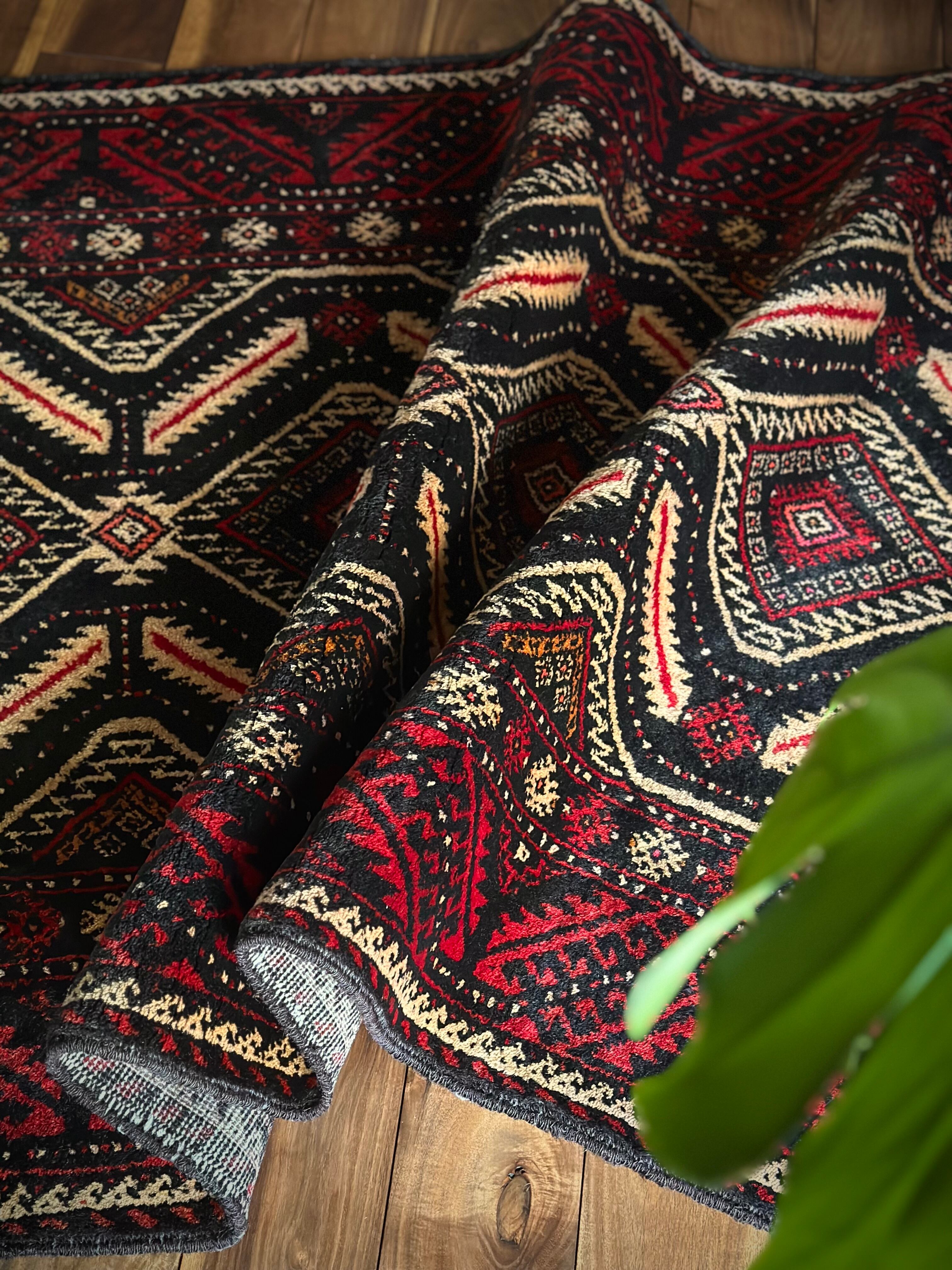見た目のインパクトからしてめちゃくちゃにカッコいいマシュハド系バルーチ族のトライバルラグで、ブラック&レッドを基調にしながらベージュの輪郭がパキッと浮き彫りにされた、これぞトライバルラグという貫禄を印象づける1枚になります。