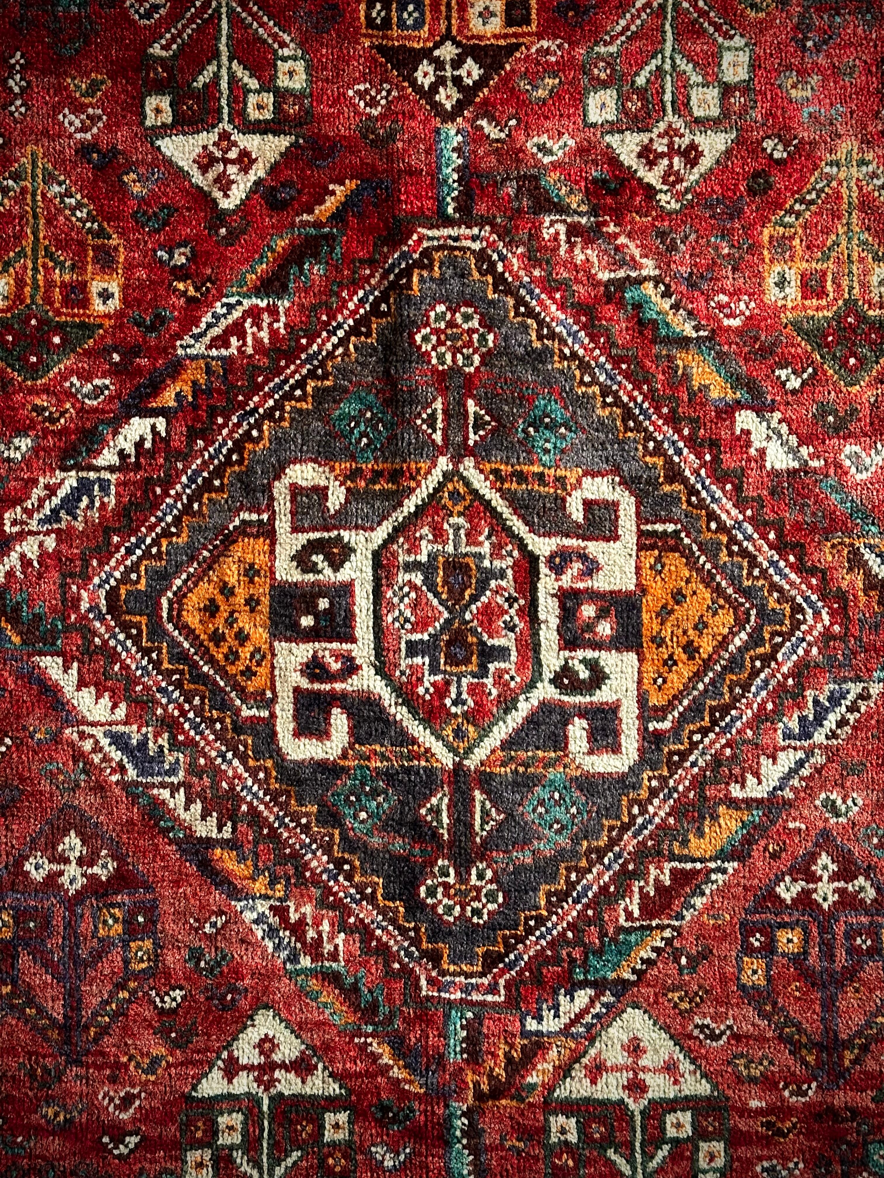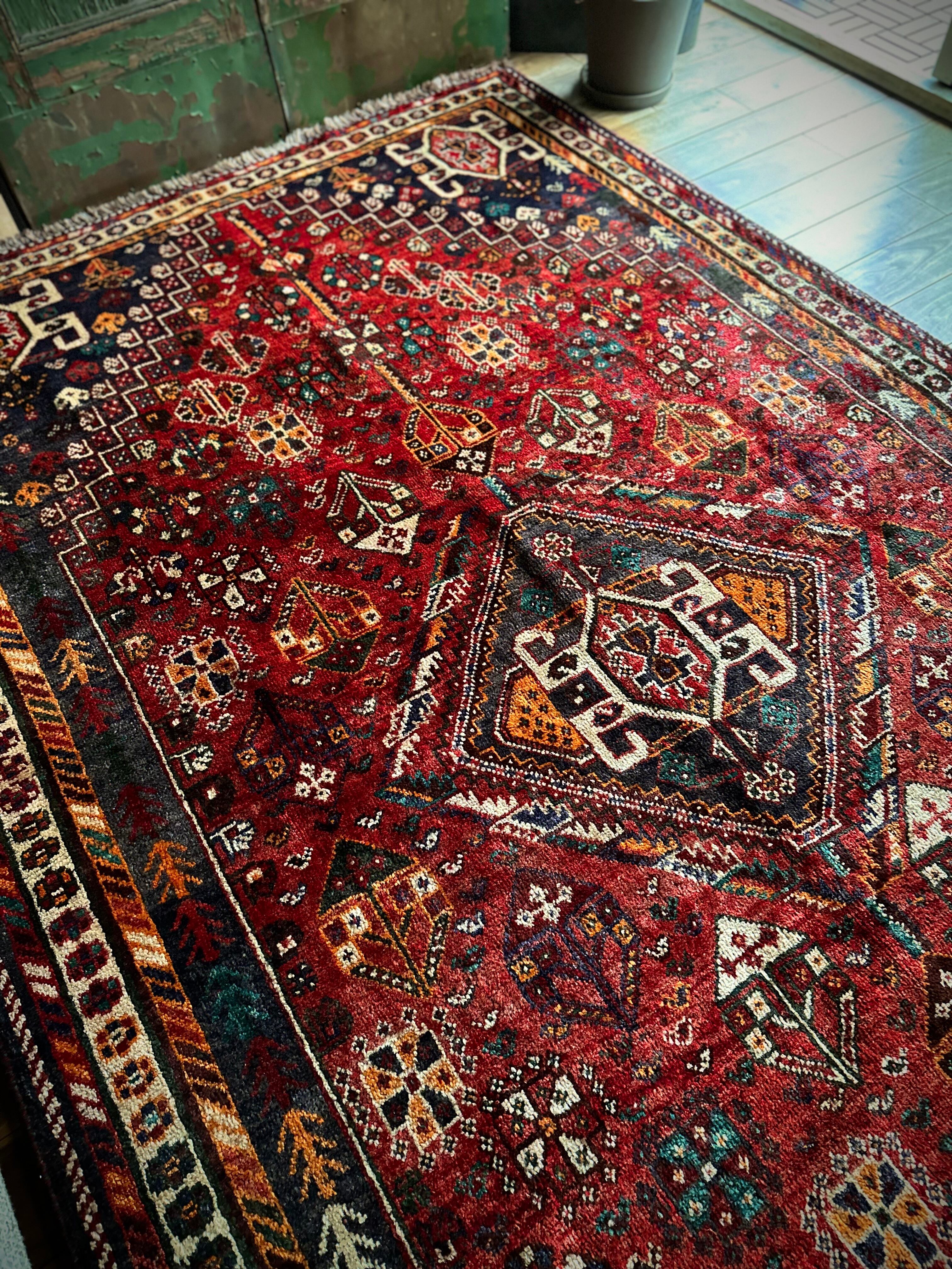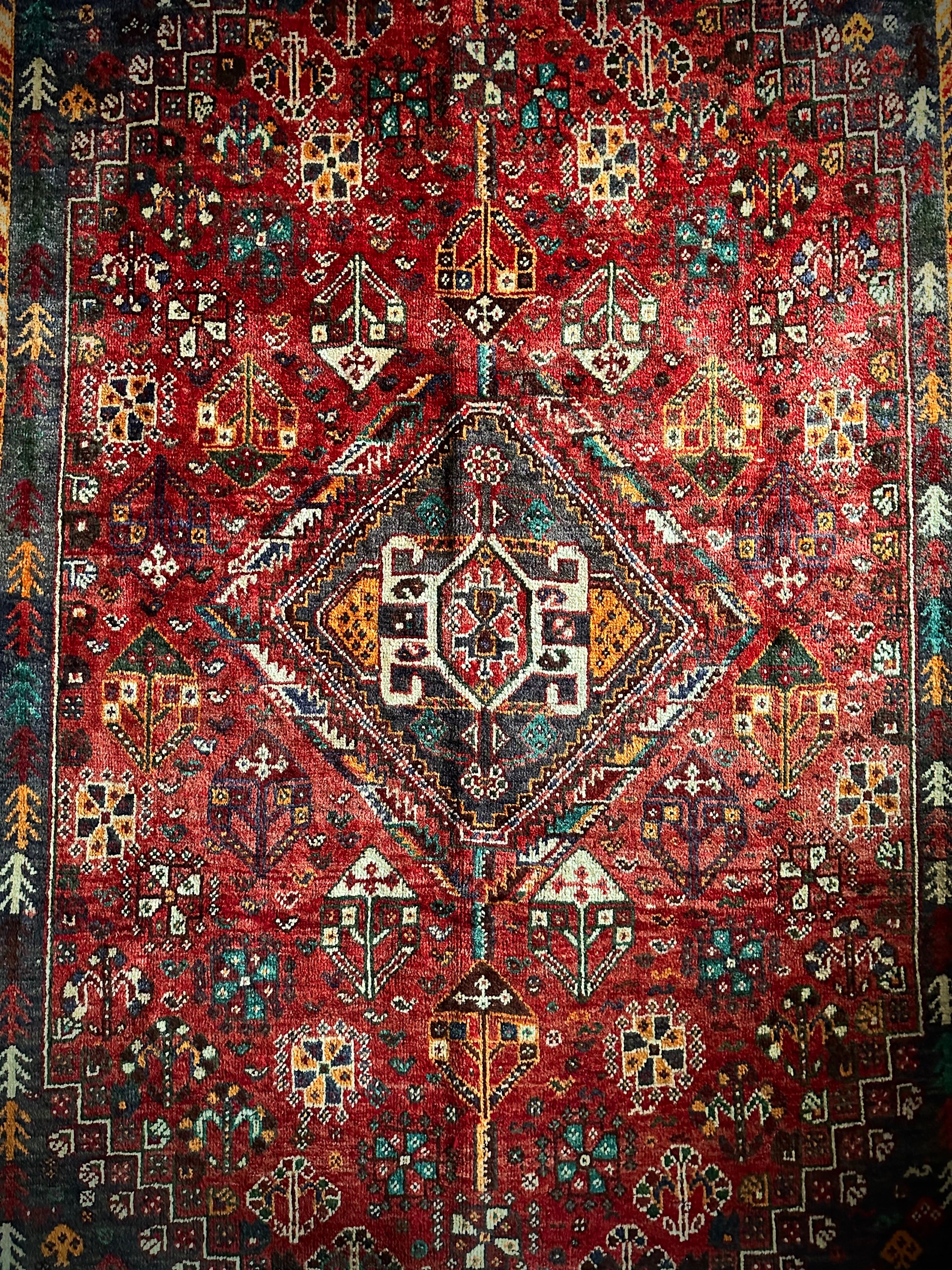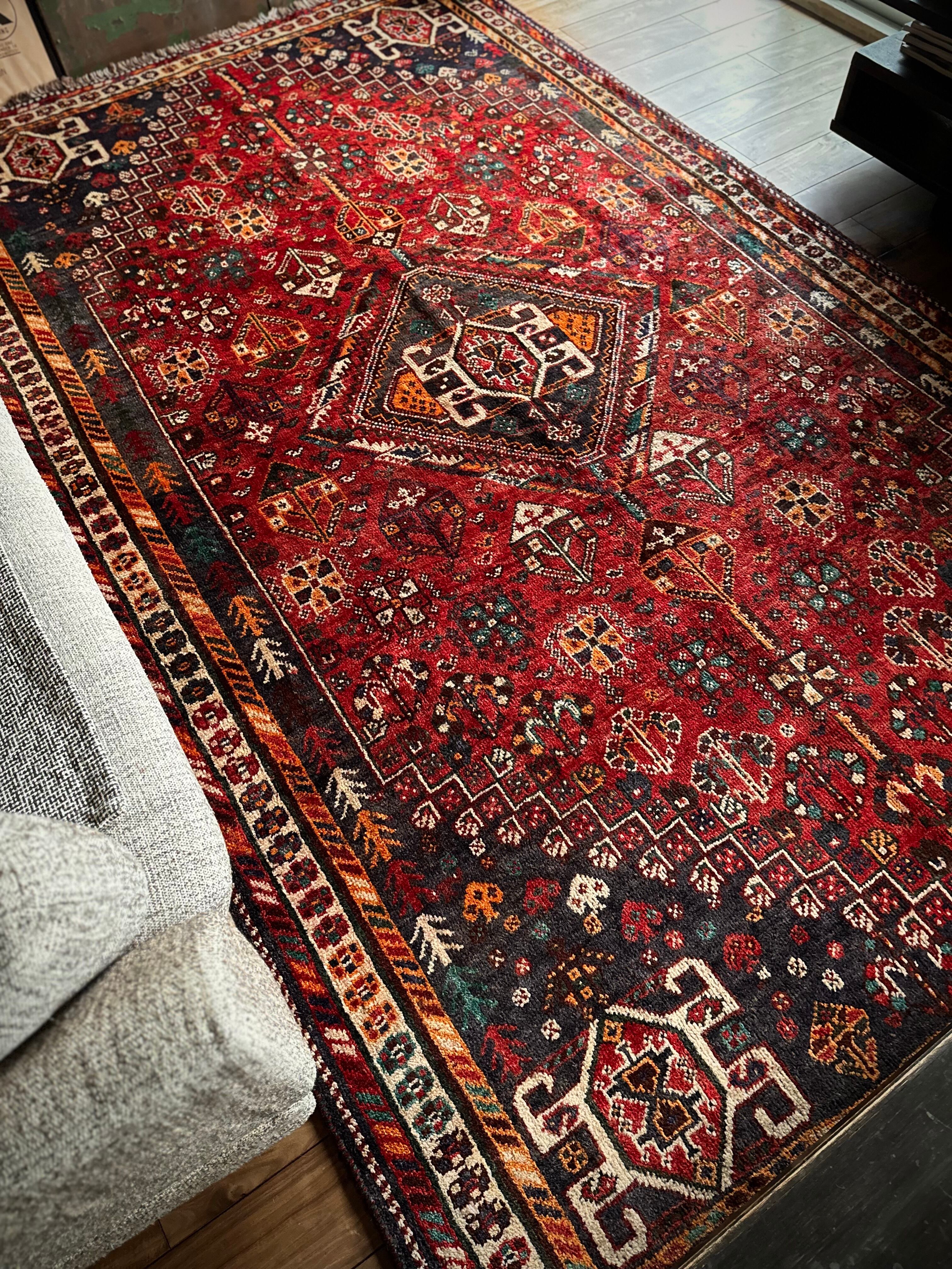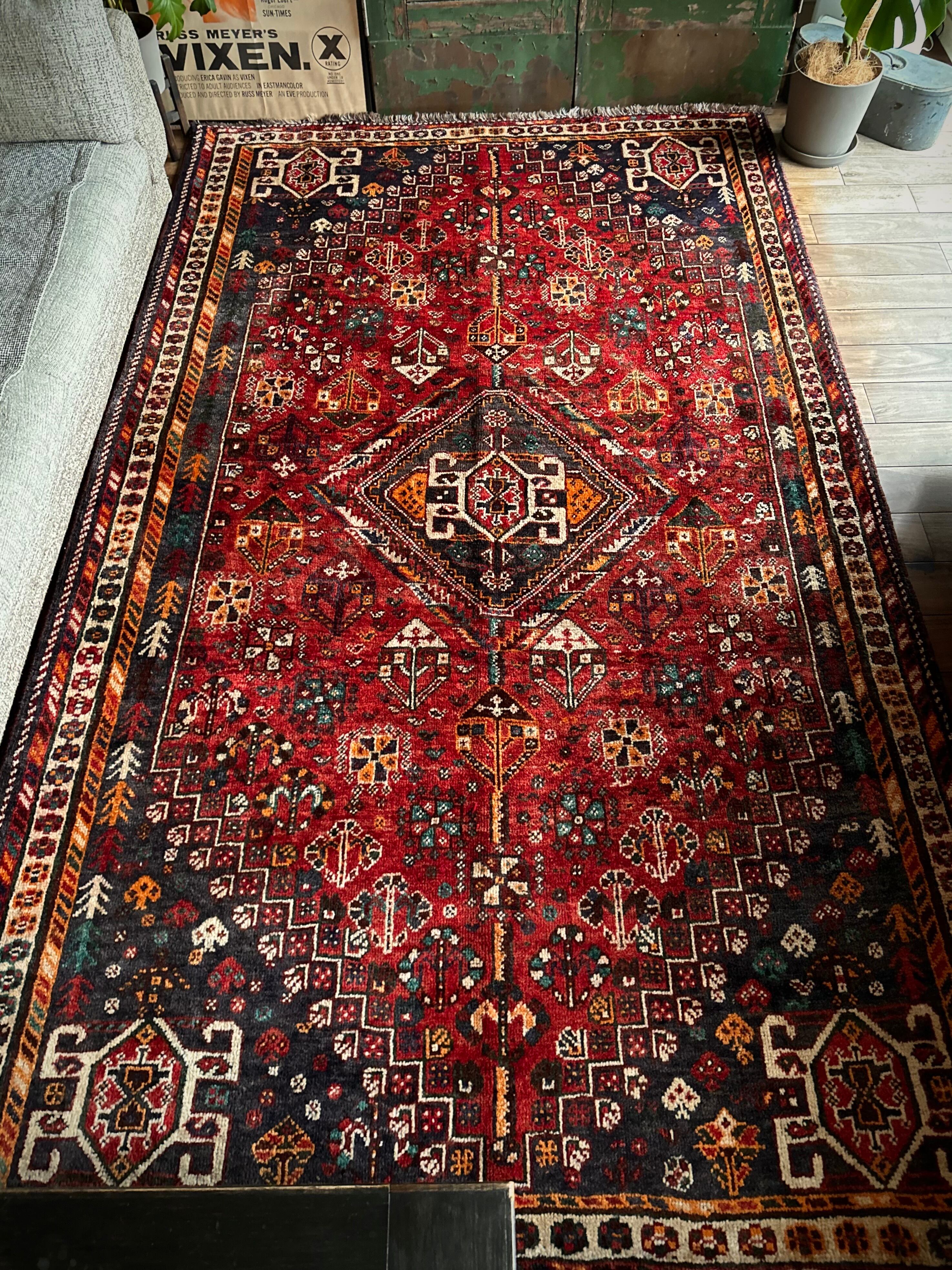 自宅で撮影するにはこれが限界ですと言わんばかりのフルスクリーンな画像になりますが、まるで宝石箱をひっくり返したようなという喩えがよく当てはまるイラン南西部の街シラーズから、細かな模様を散りばめたカシュガイ族の大判サイズなトライバルラグになります。