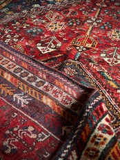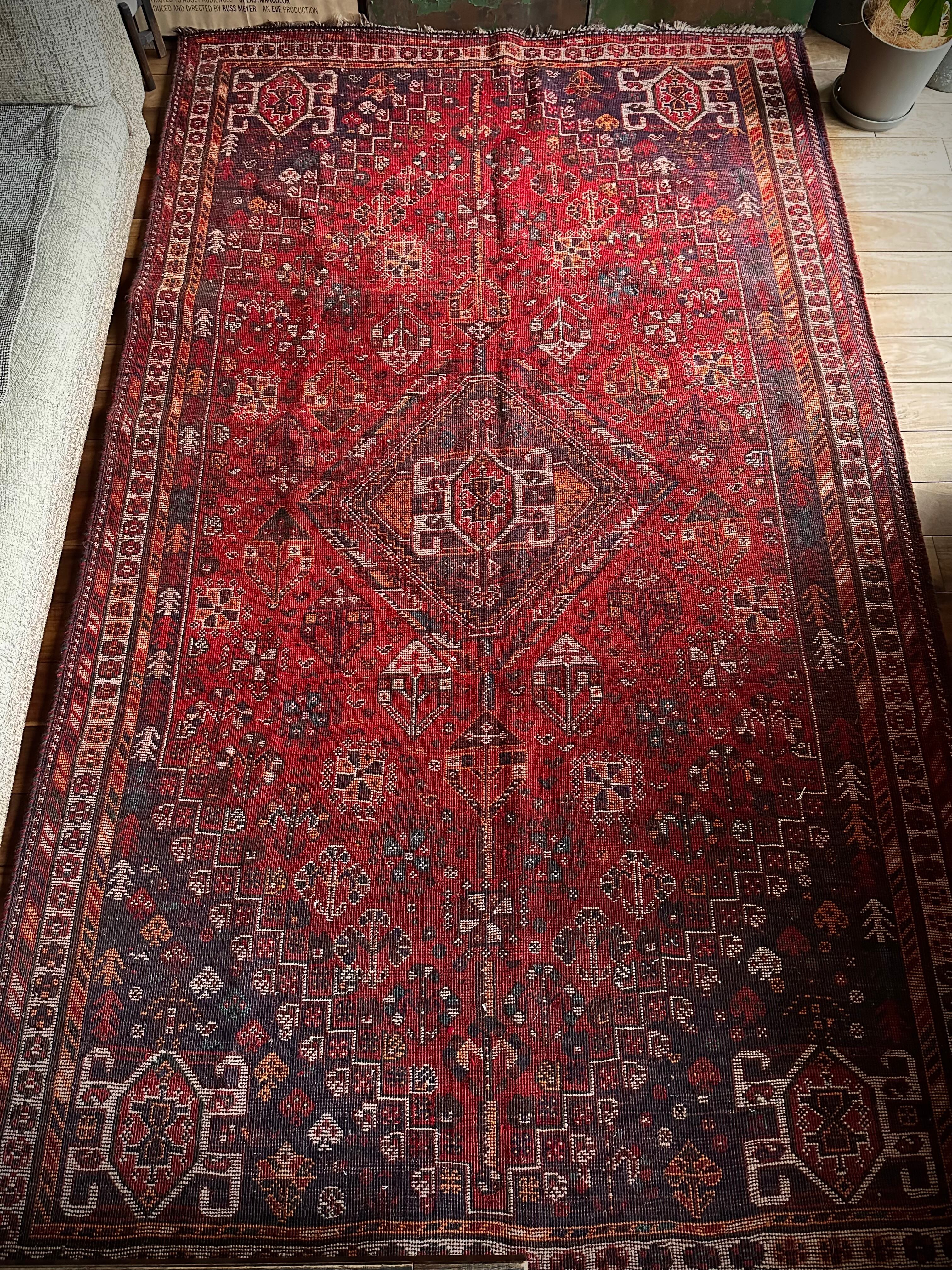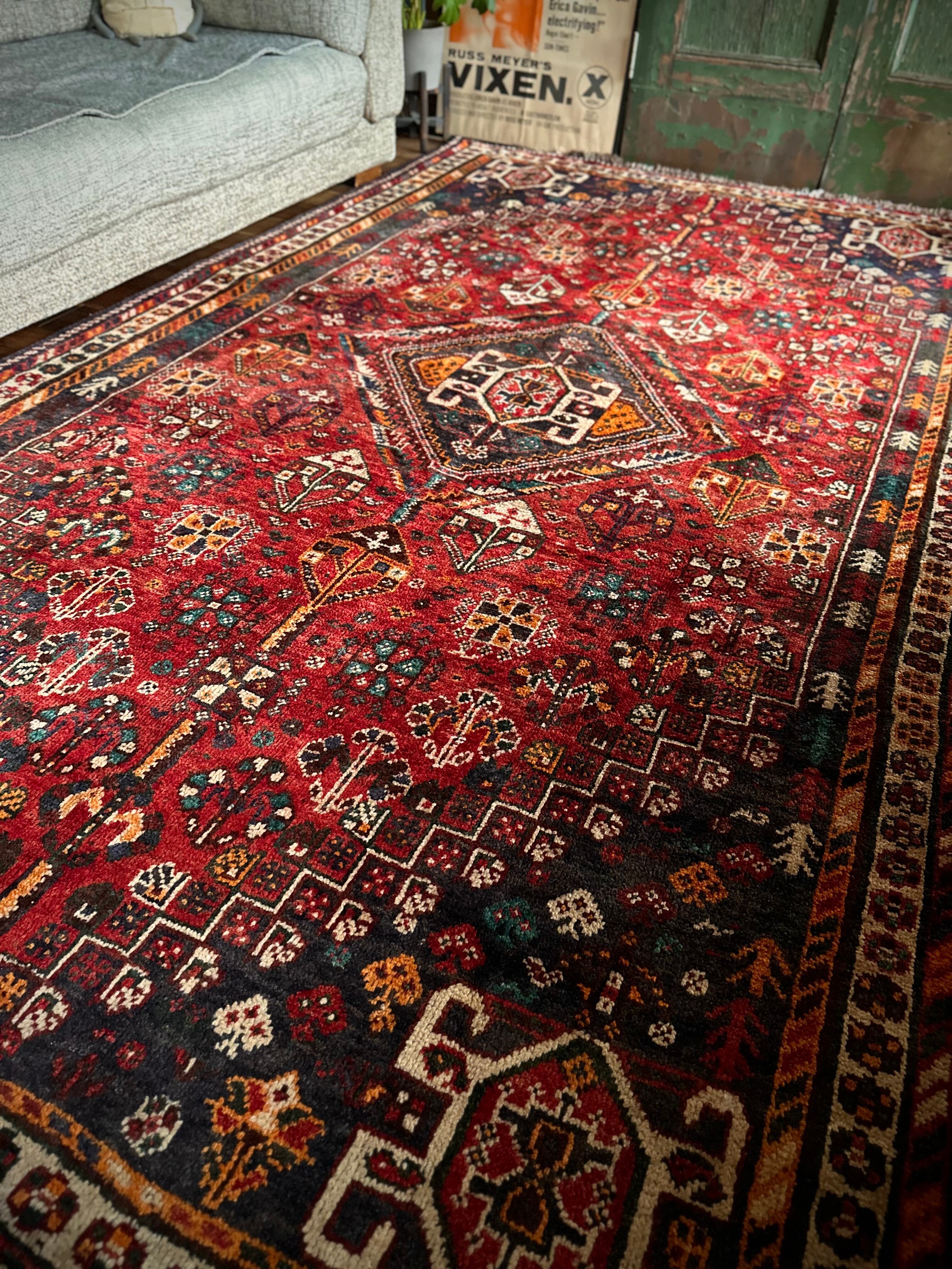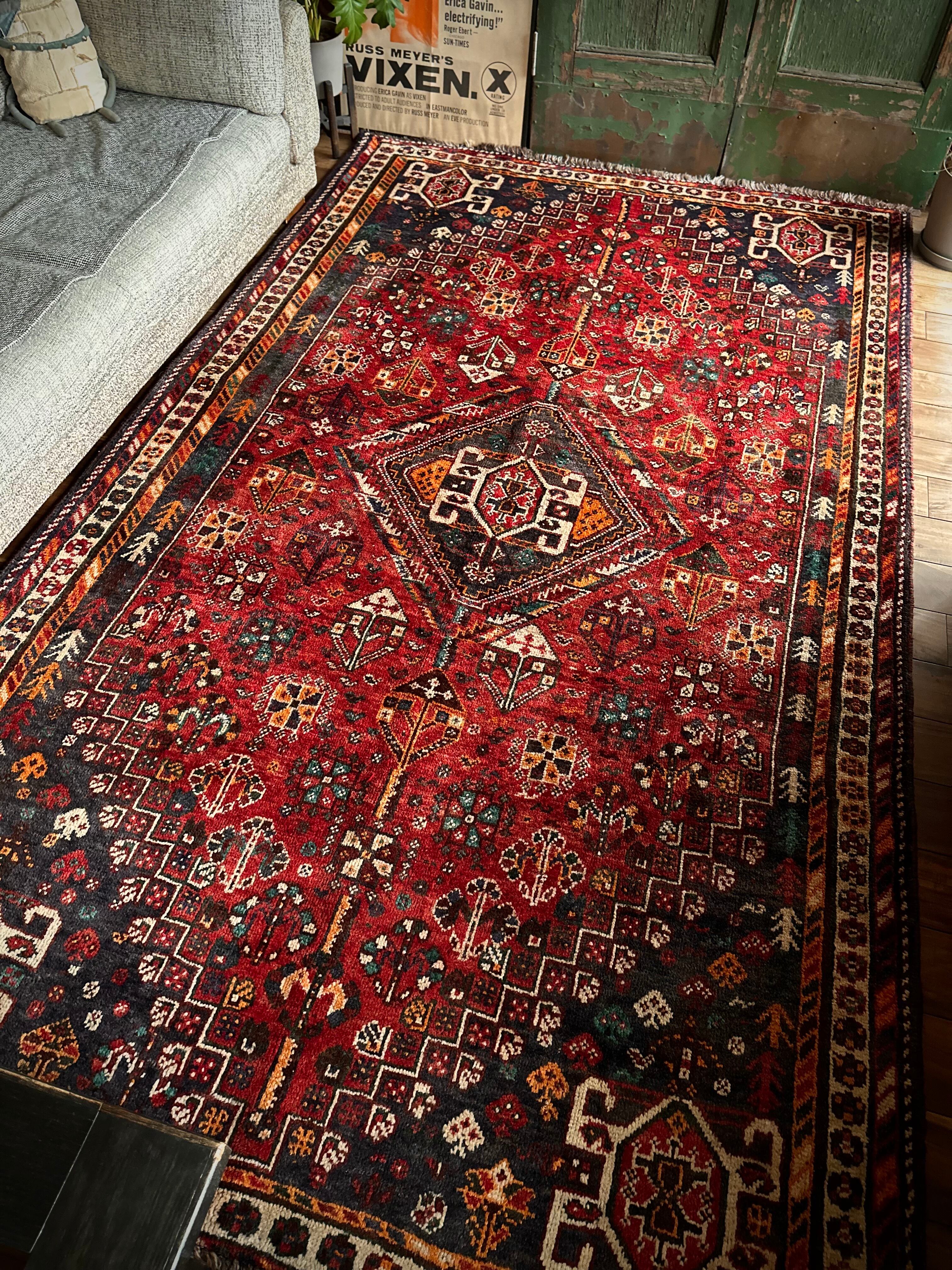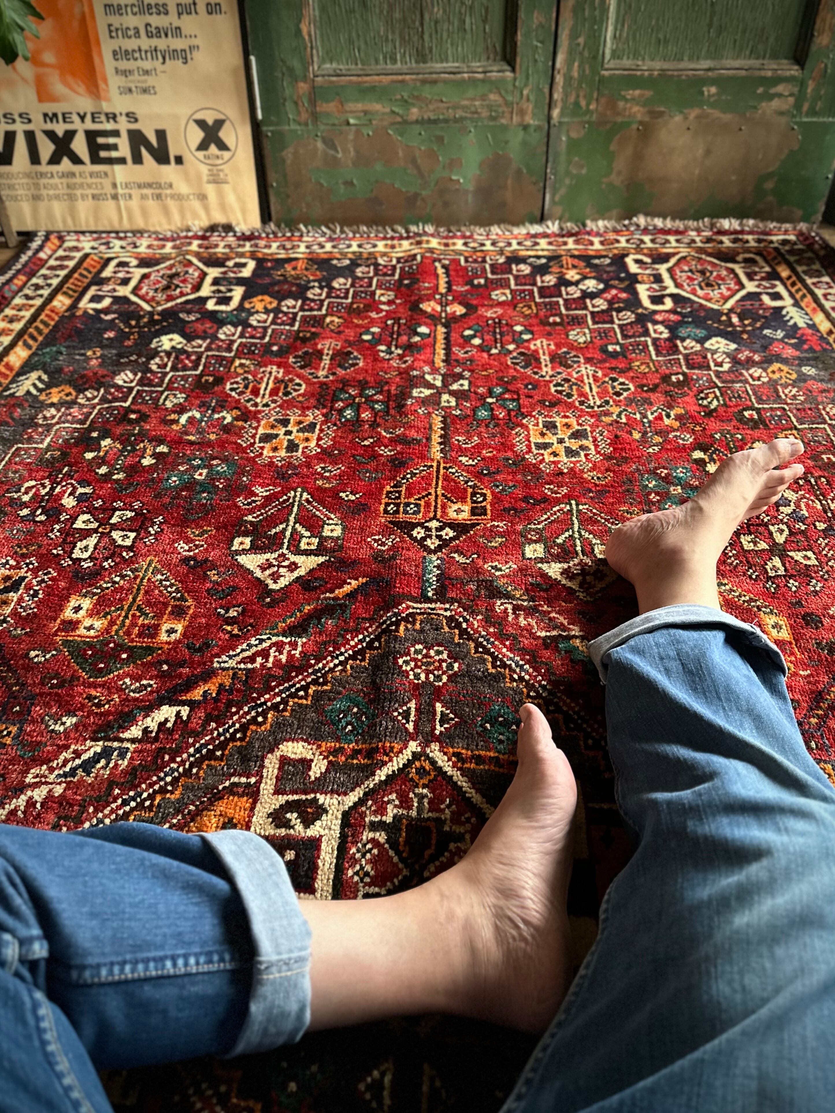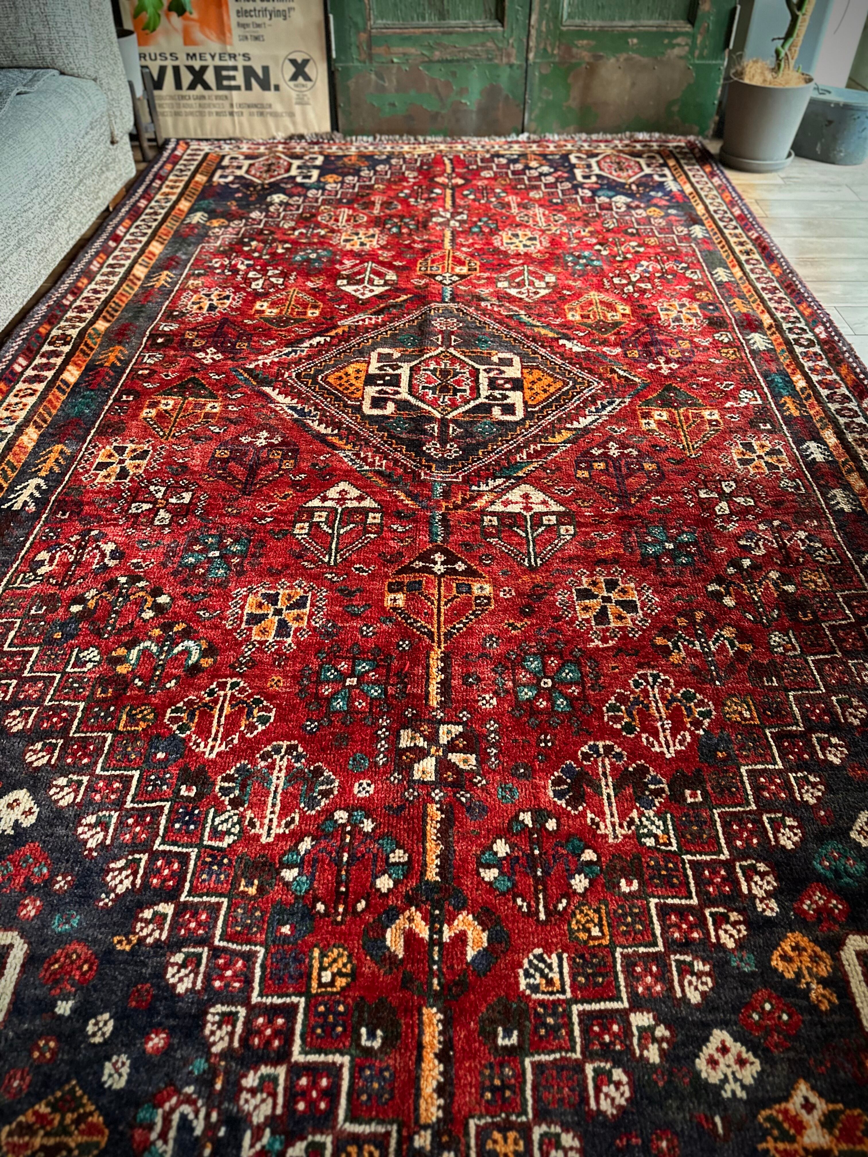 自宅で撮影するにはこれが限界ですと言わんばかりのフルスクリーンな画像になりますが、まるで宝石箱をひっくり返したようなという喩えがよく当てはまるイラン南西部の街シラーズから、細かな模様を散りばめたカシュガイ族の大判サイズなトライバルラグになります。