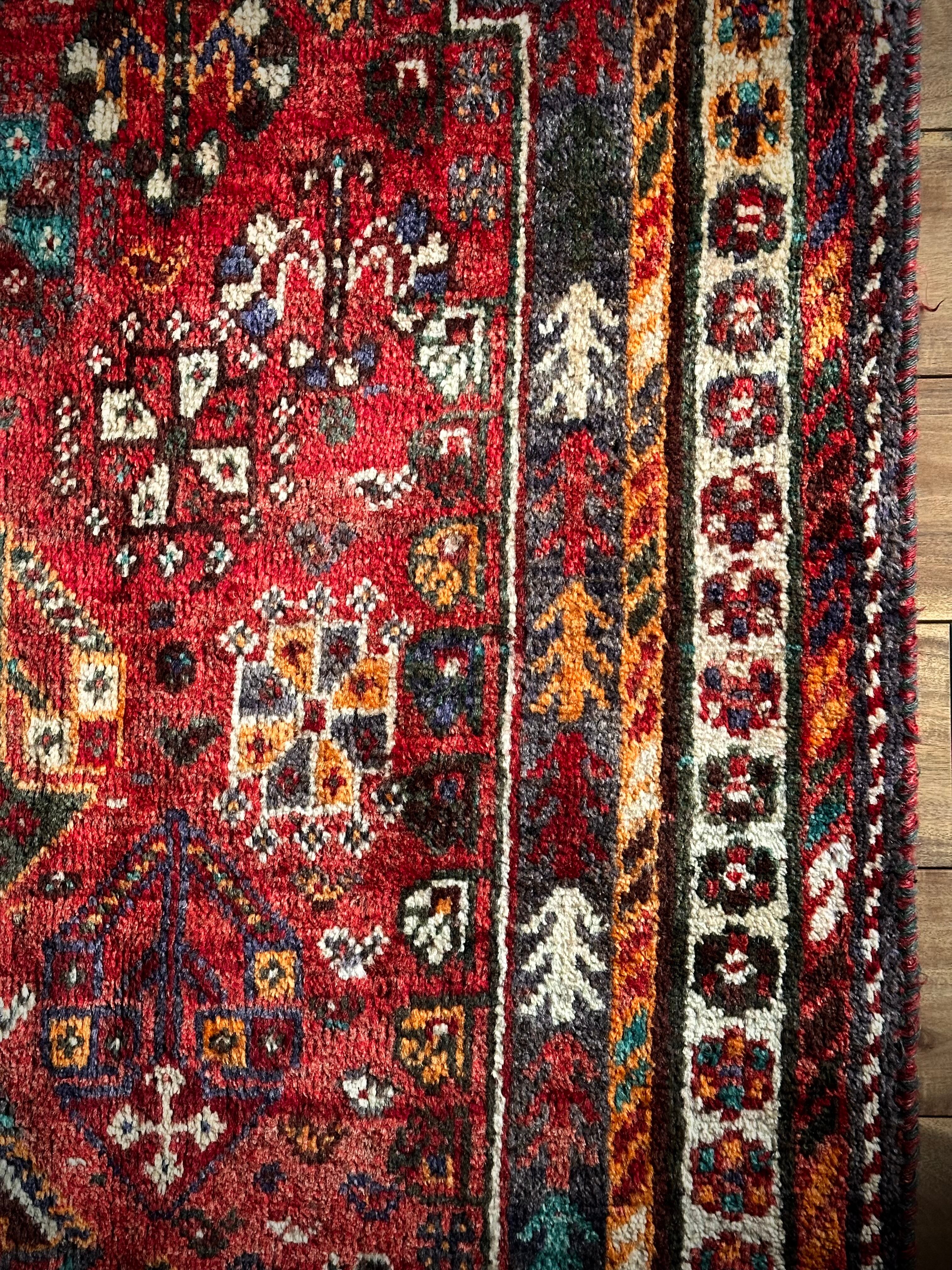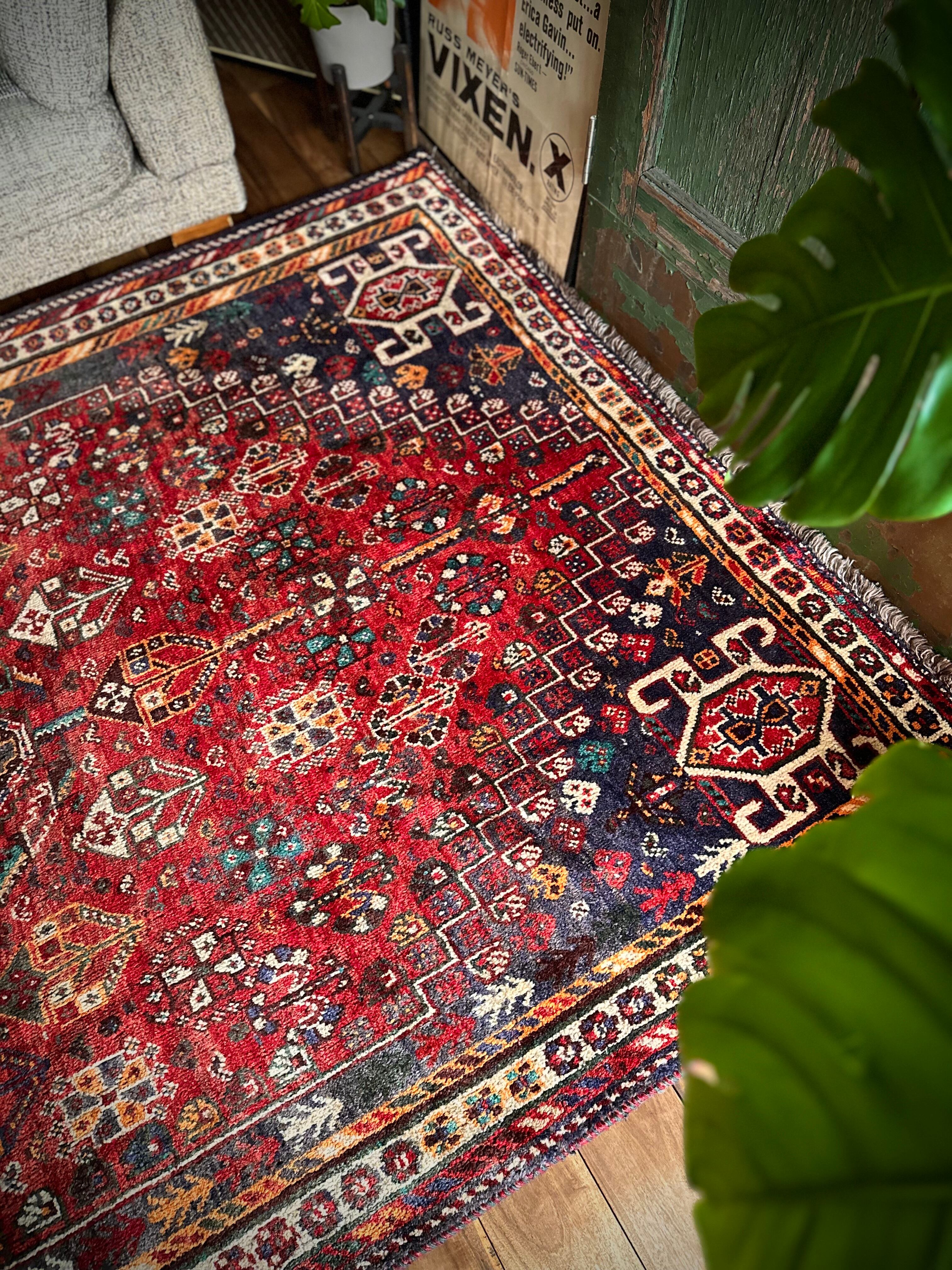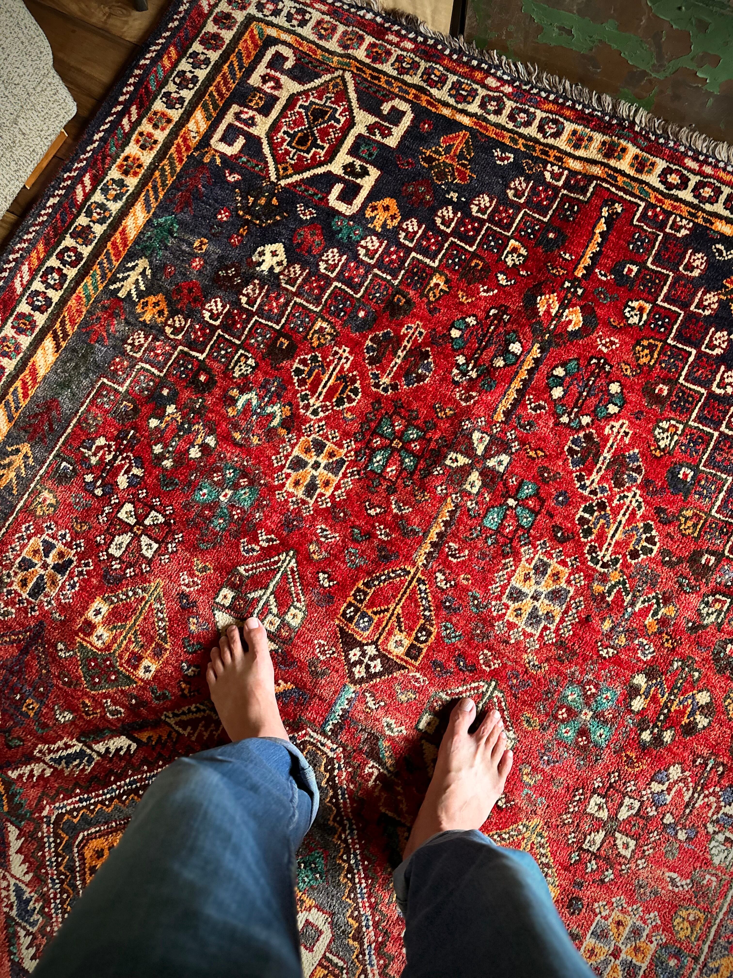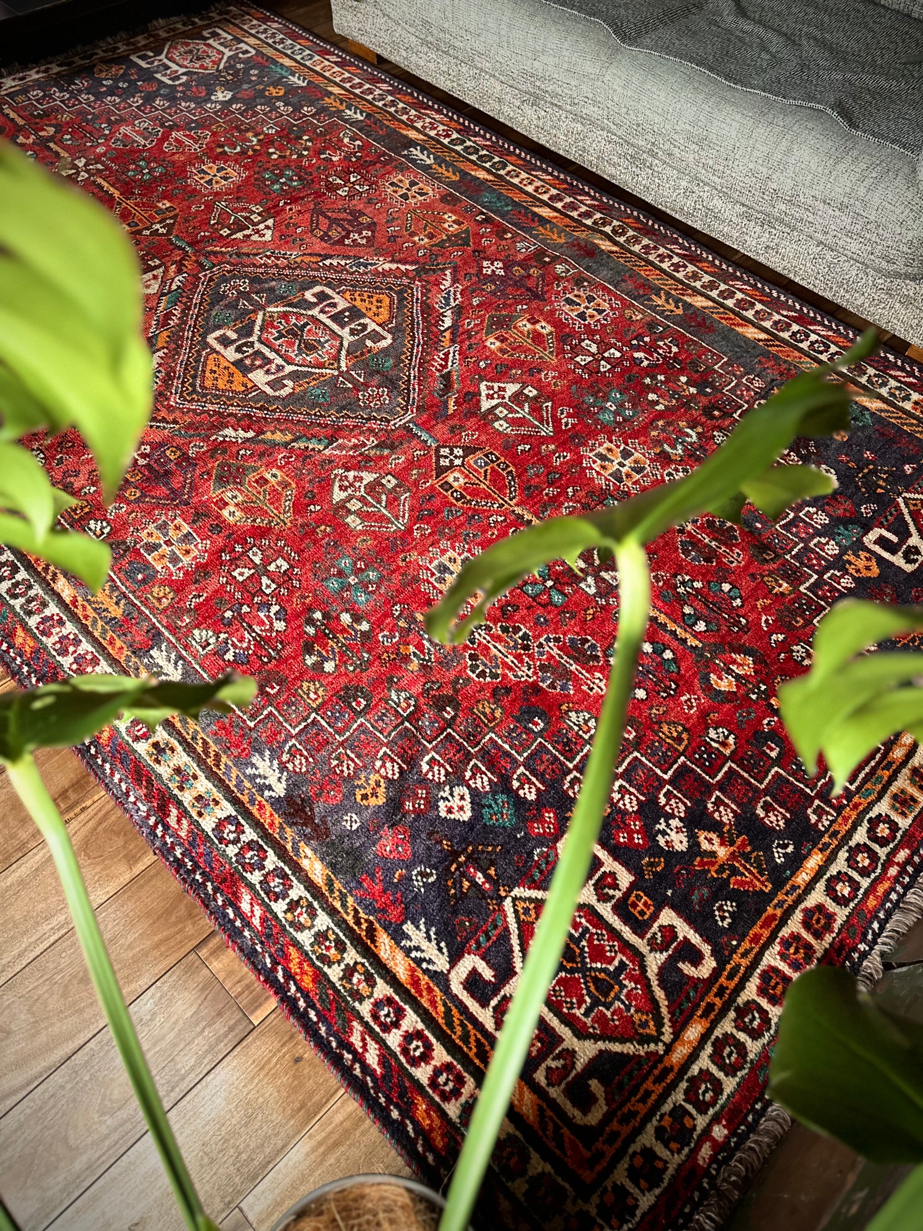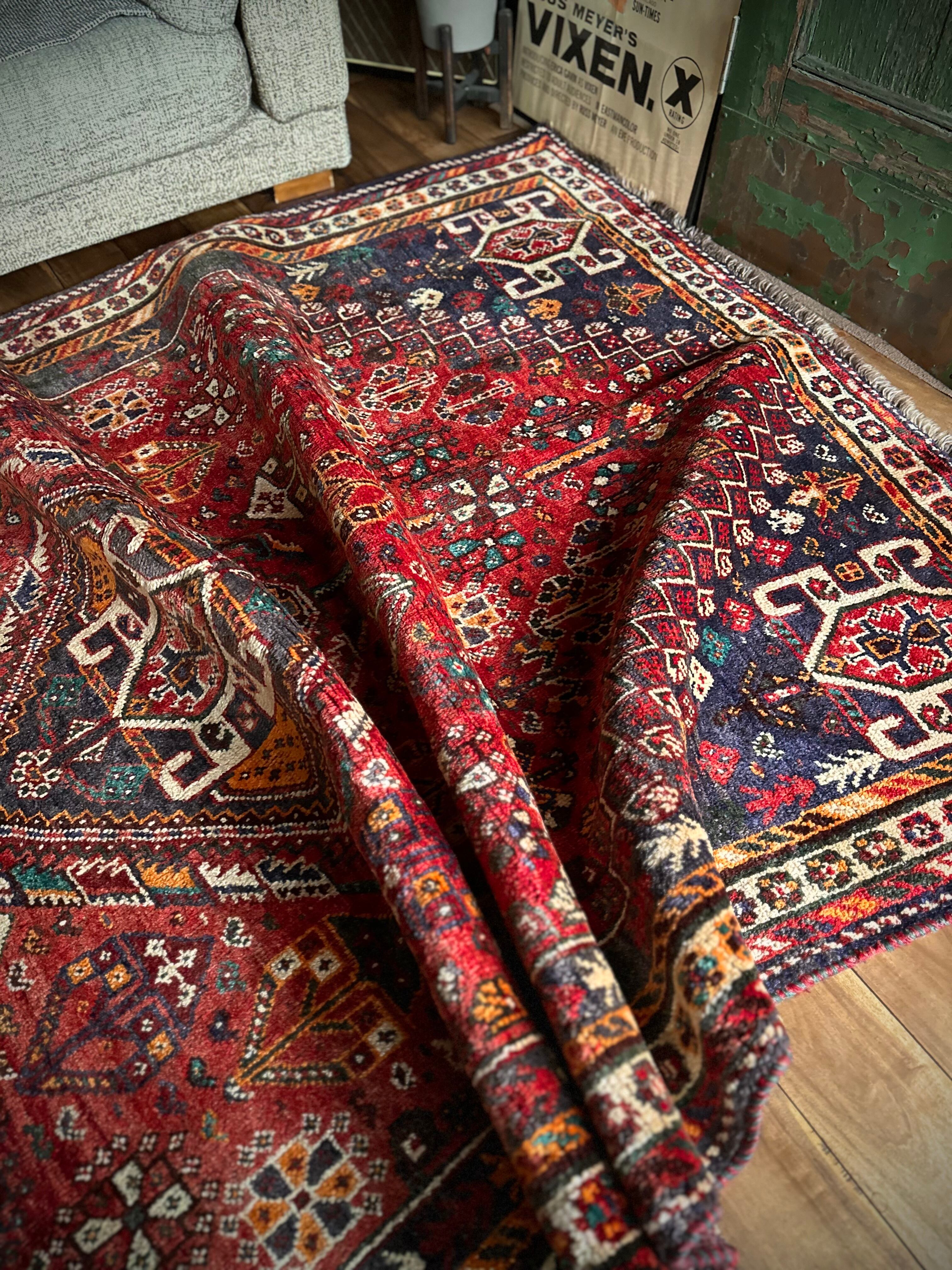 自宅で撮影するにはこれが限界ですと言わんばかりのフルスクリーンな画像になりますが、まるで宝石箱をひっくり返したようなという喩えがよく当てはまるイラン南西部の街シラーズから、細かな模様を散りばめたカシュガイ族の大判サイズなトライバルラグになります。