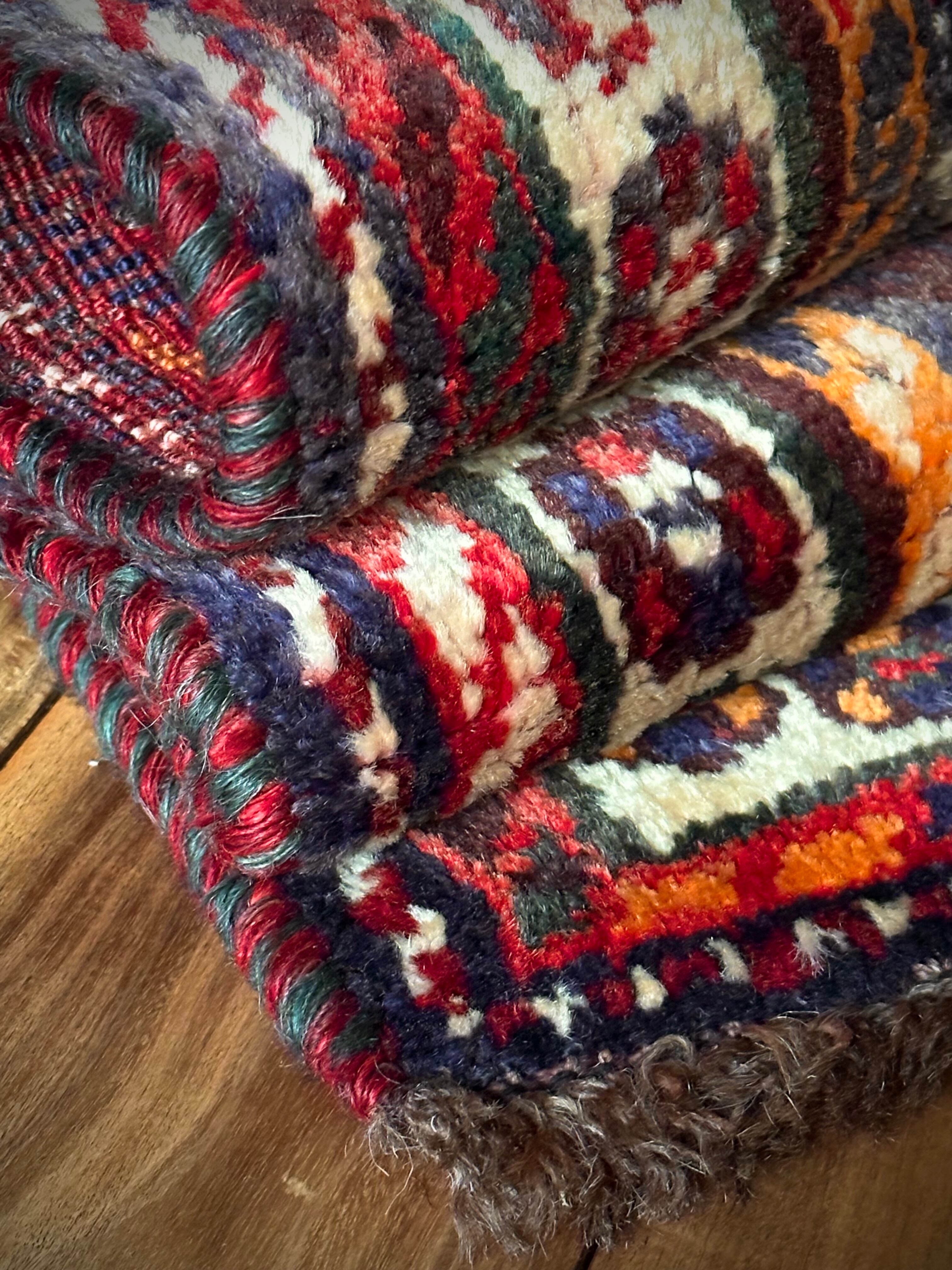 経年としては50年と店主と同じくらいのいい歳のとり方で、加齢臭の代わりにいいツヤが出始めているでしょうか。特に目立つ汚れやリペア箇所は見当たらないグッドなコンディションで、一部経糸が表面に表れている箇所がありますが切っても問題なさそうな具合で、パイルもフカフカと気持ちいいことこの上なく、こんな大判サイズを敷けるリビングが羨ましい限りの1枚になります。