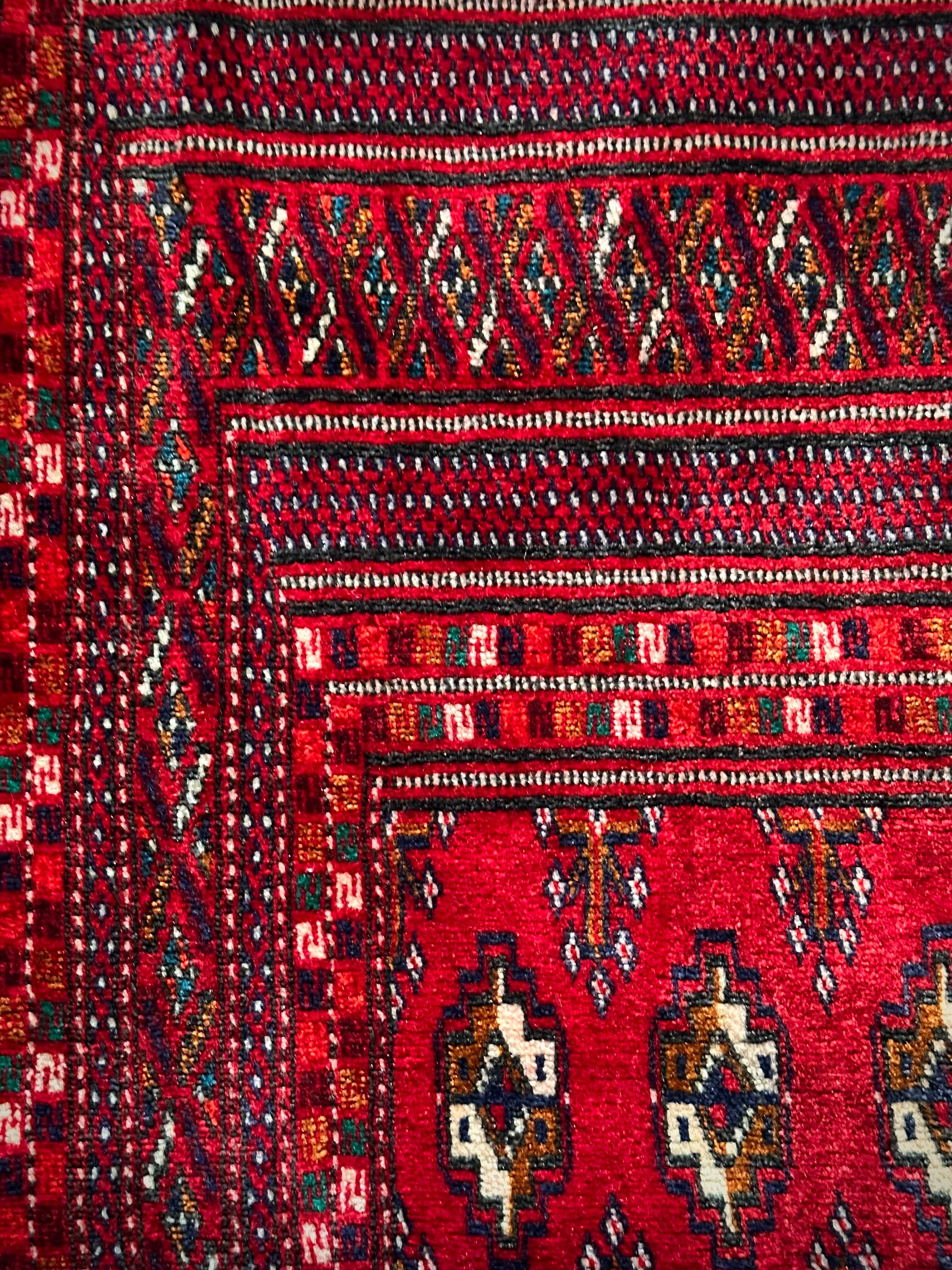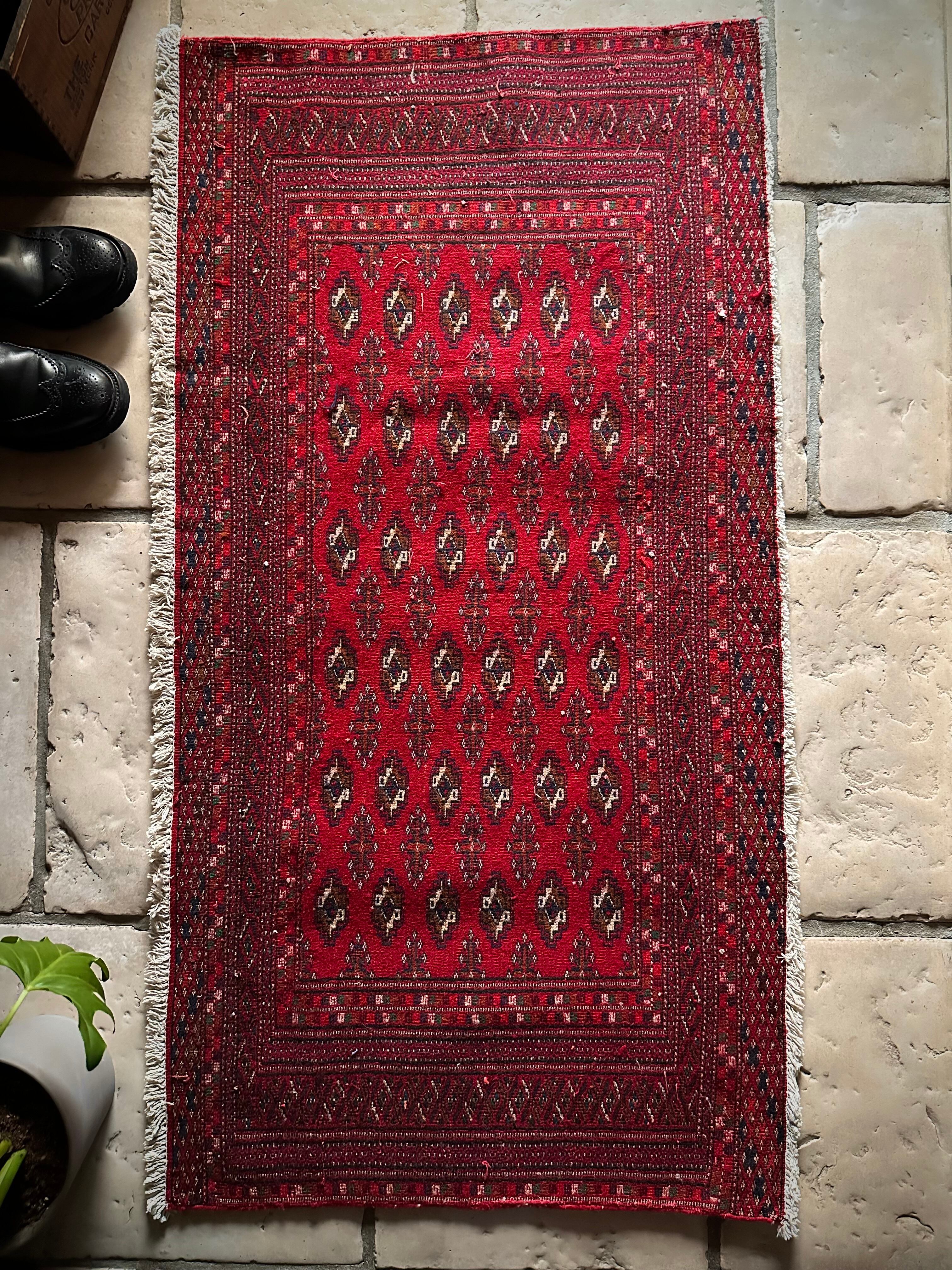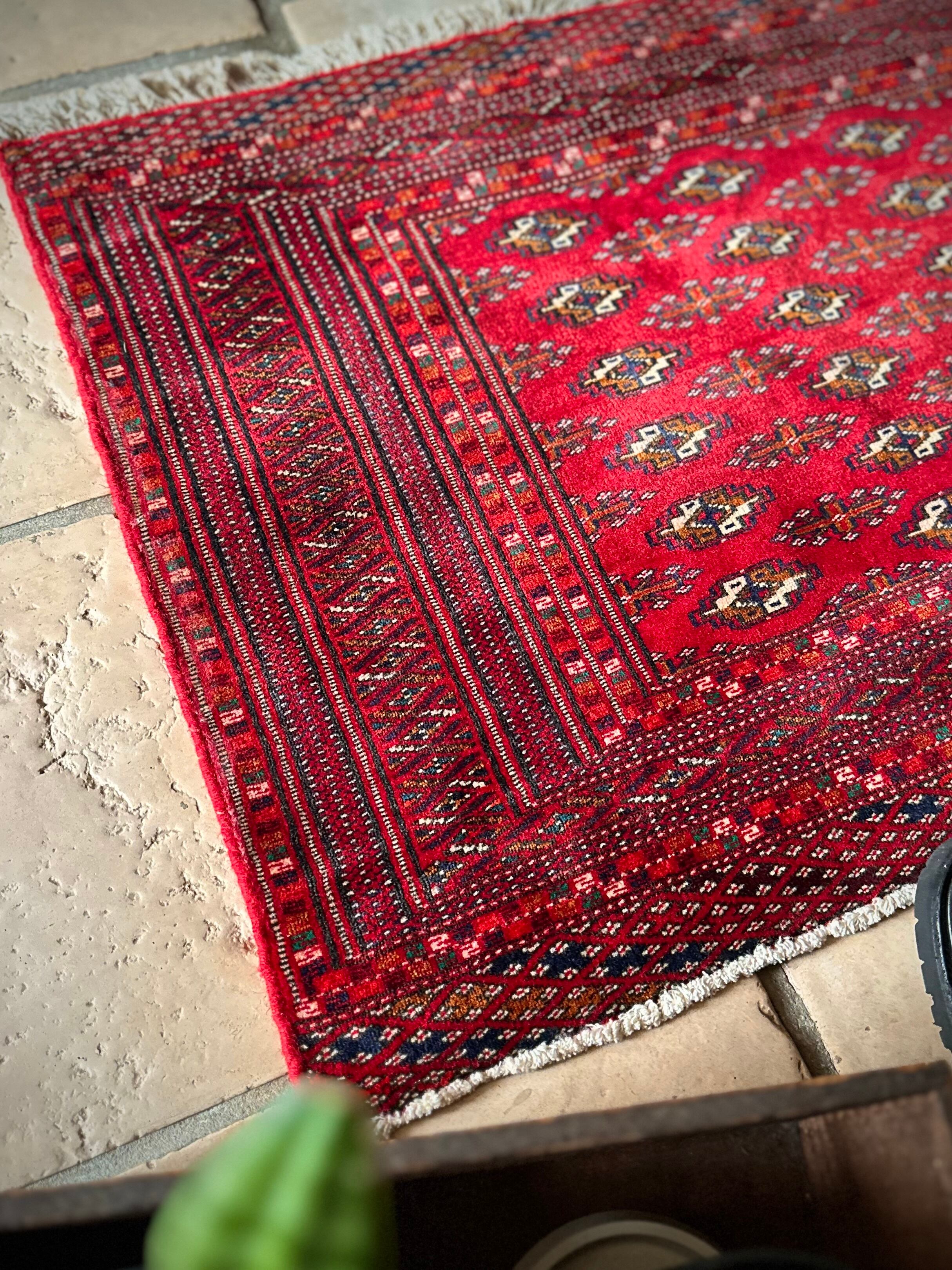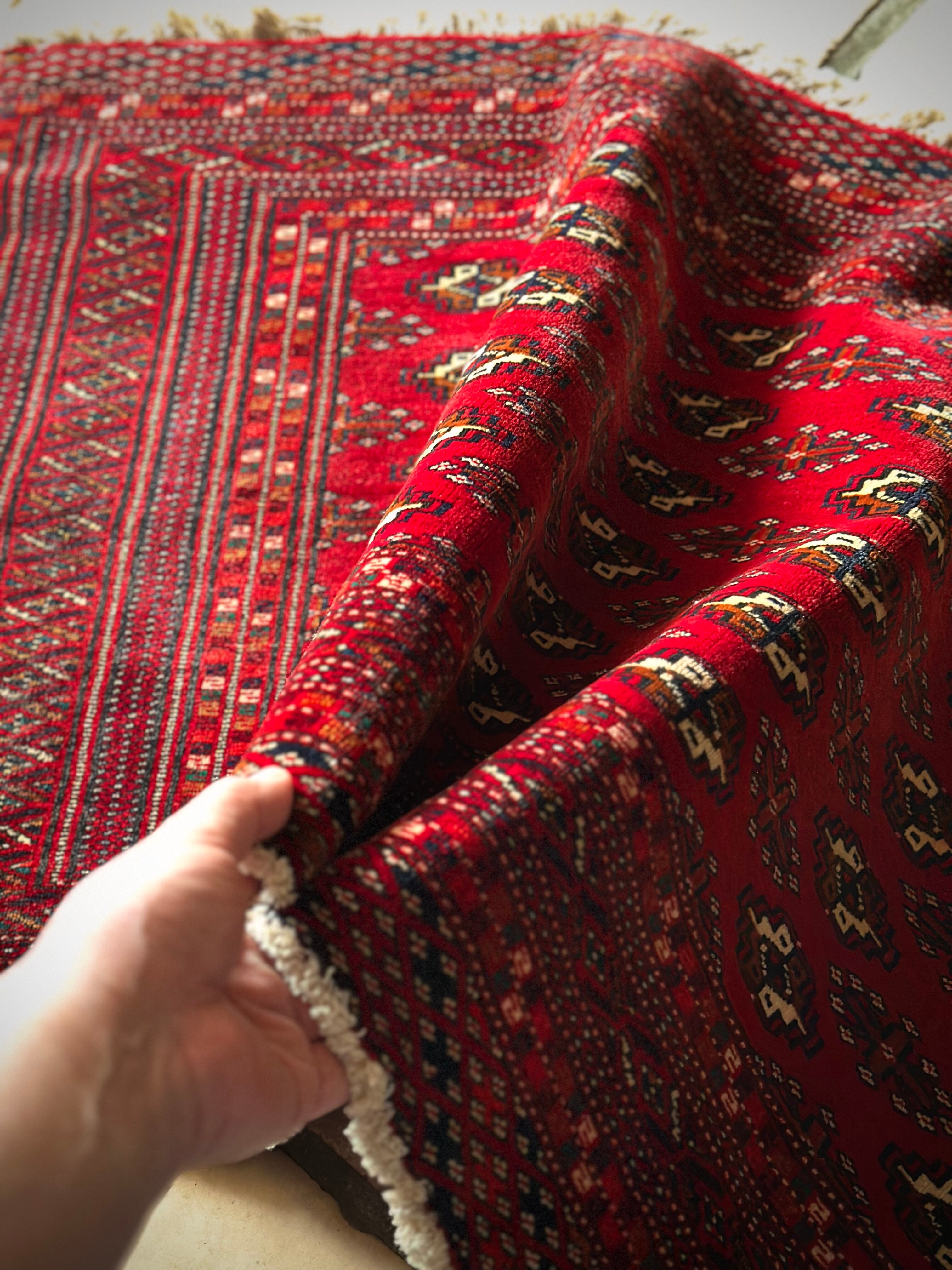 真っ赤な絨毯を代表するトルクメンから、こちらは細かな織りの模様に深みのある赤がヴィンテージ然としたトライバルラグになります。