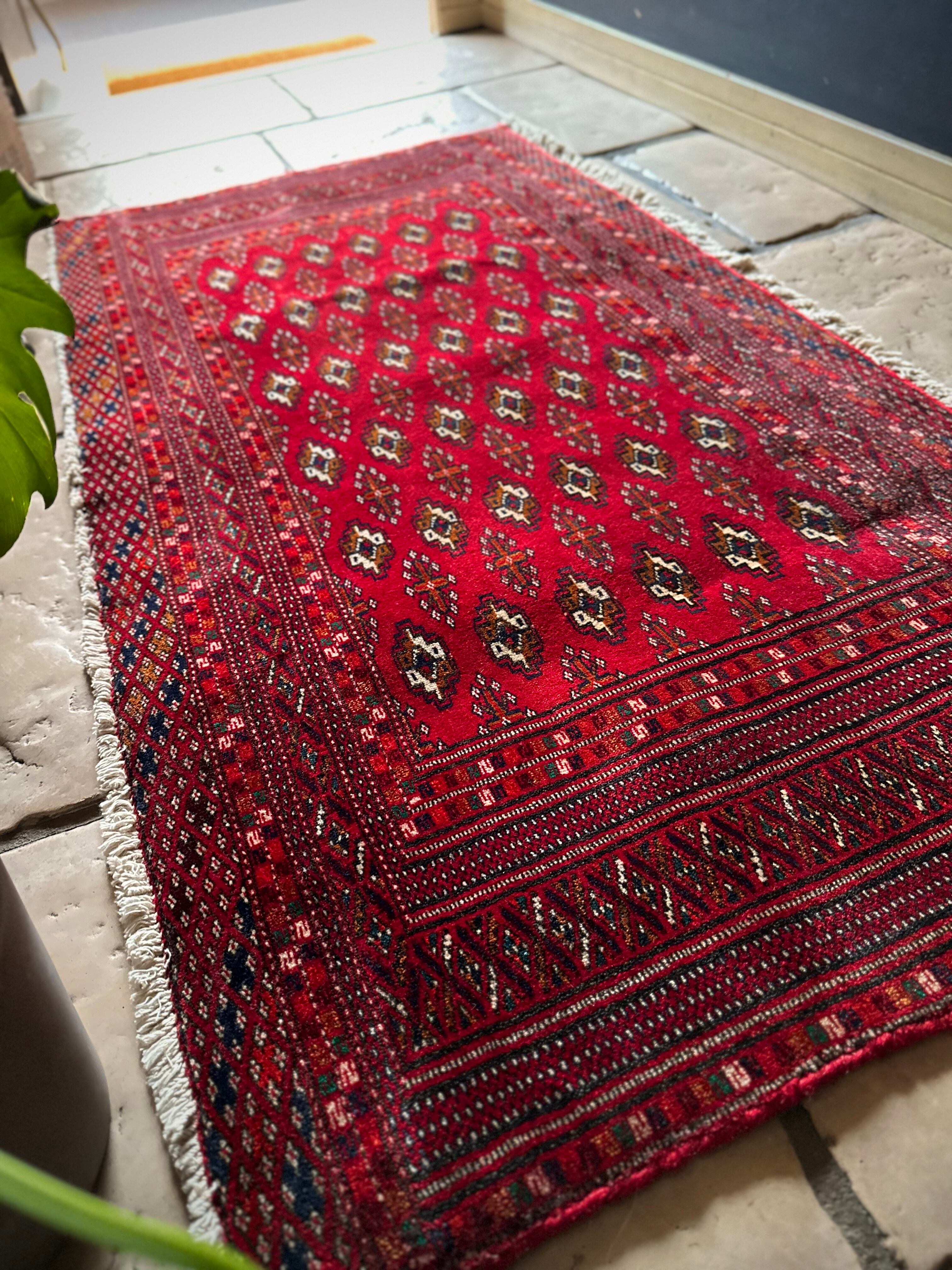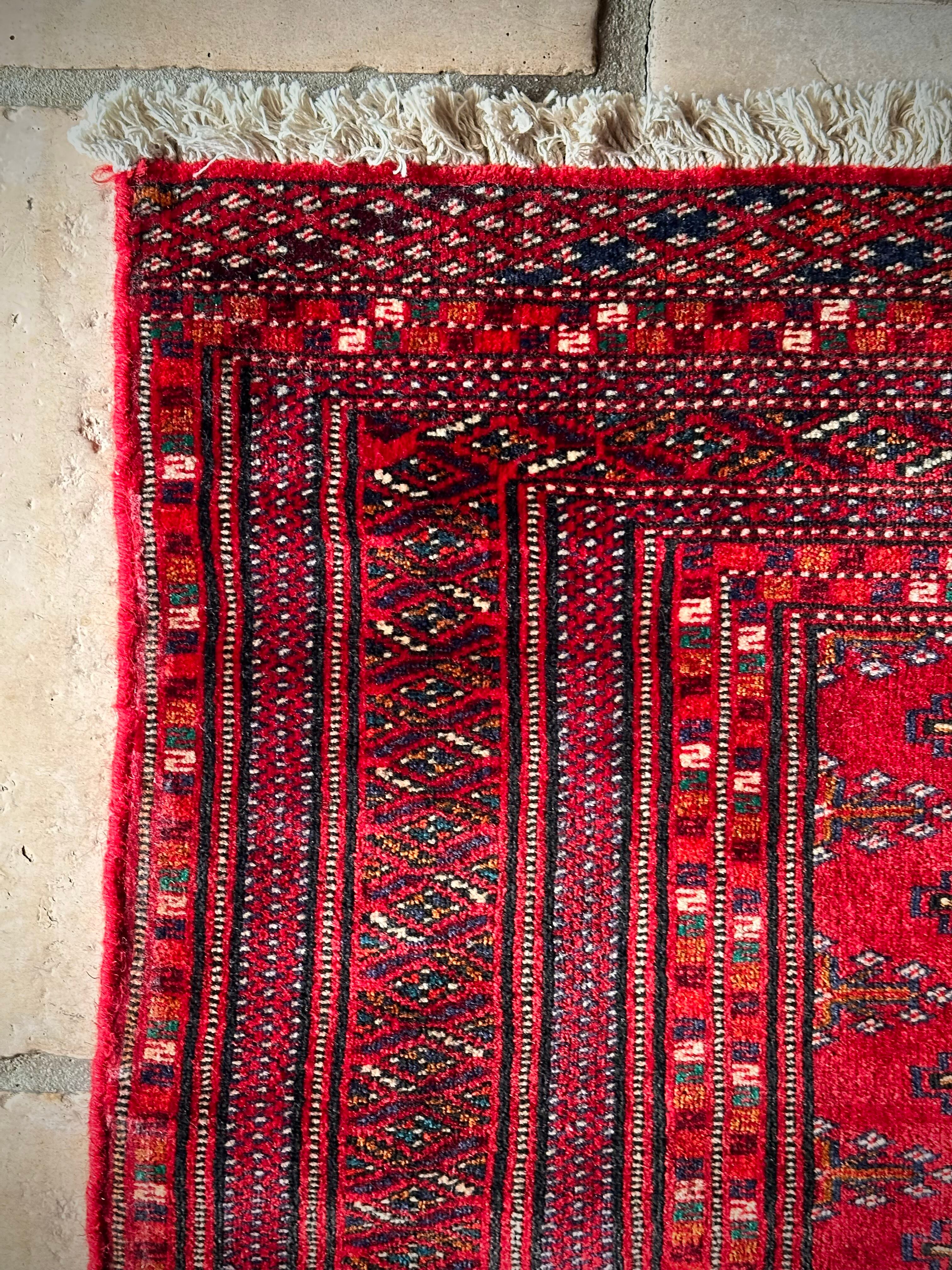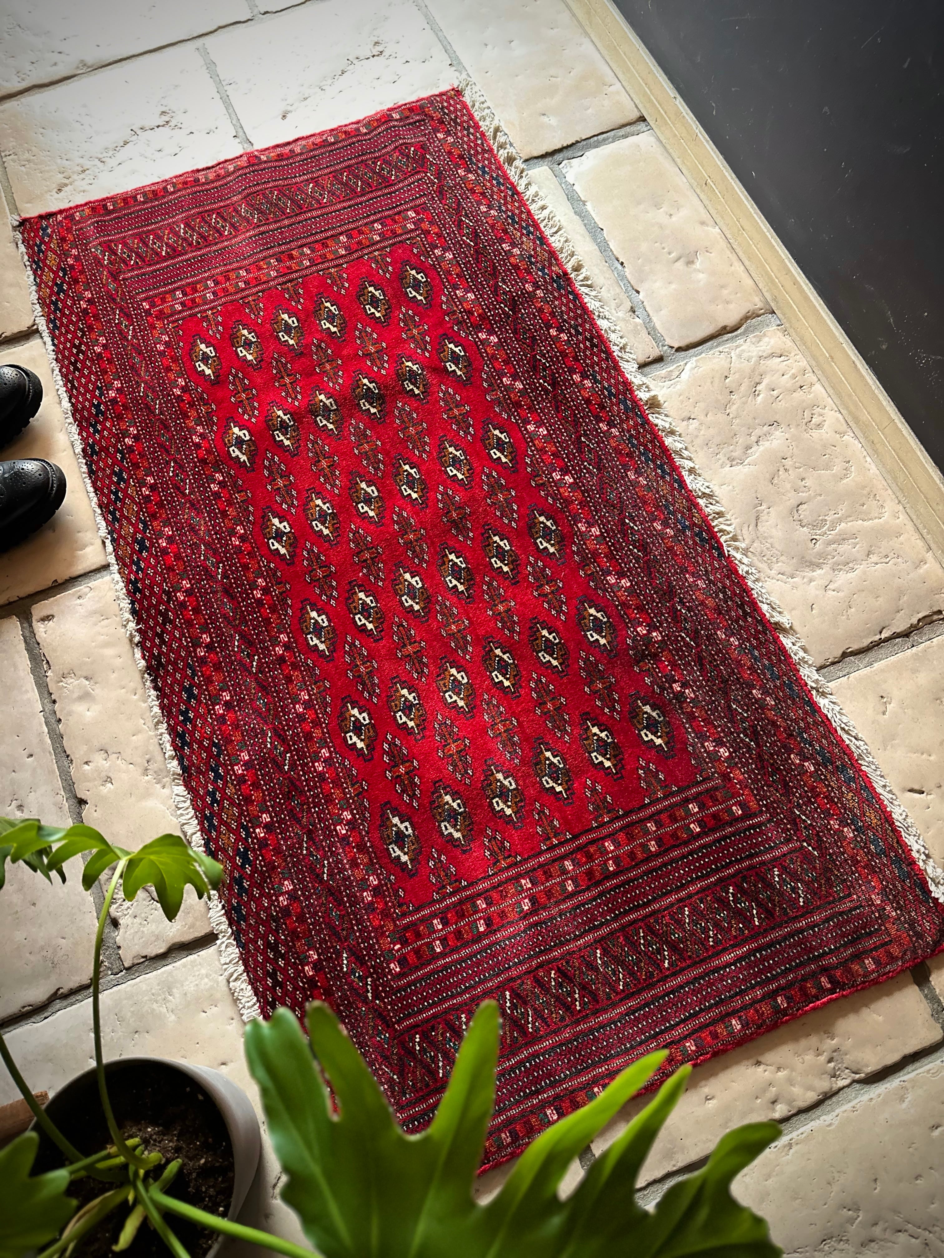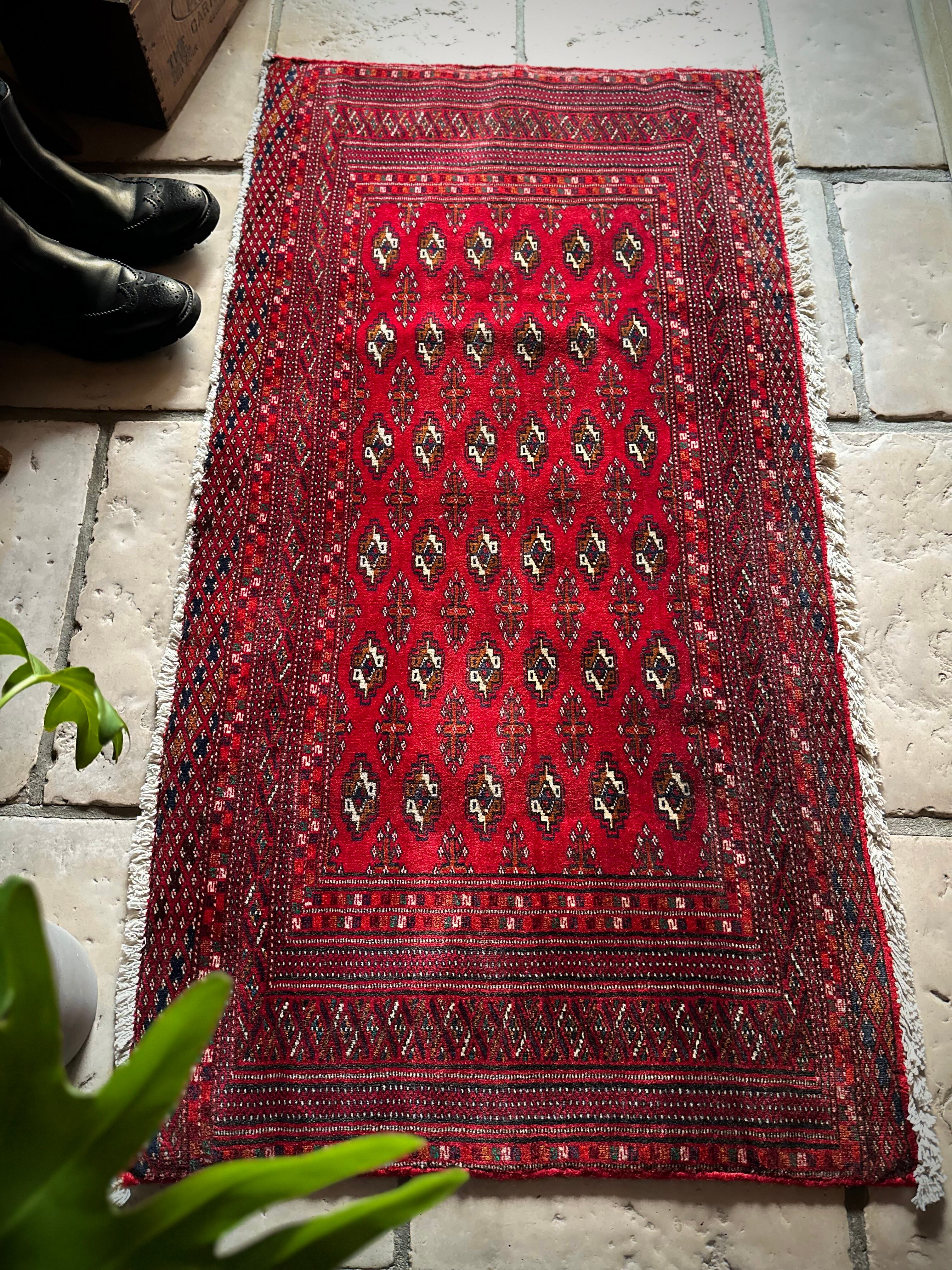 真っ赤な絨毯を代表するトルクメンから、こちらは細かな織りの模様に深みのある赤がヴィンテージ然としたトライバルラグになります。