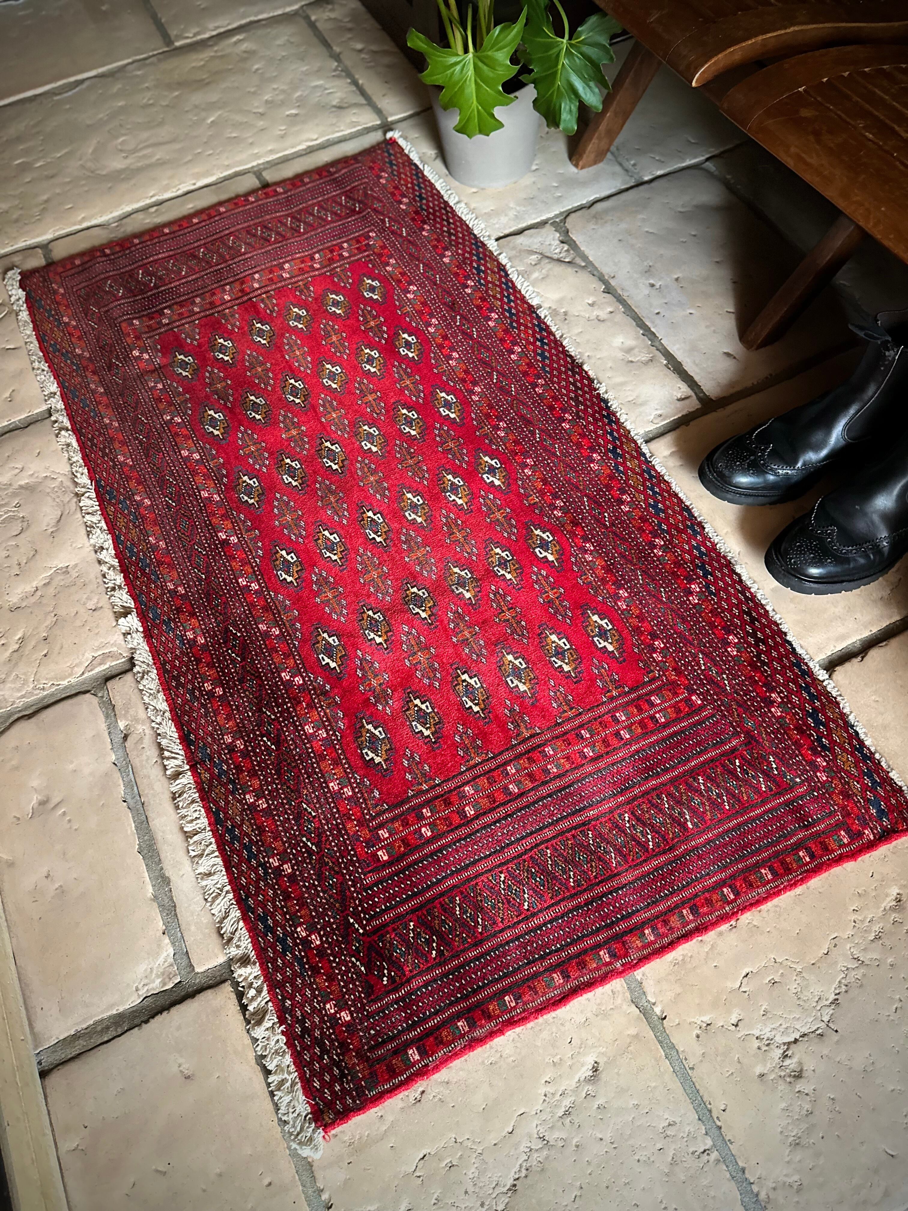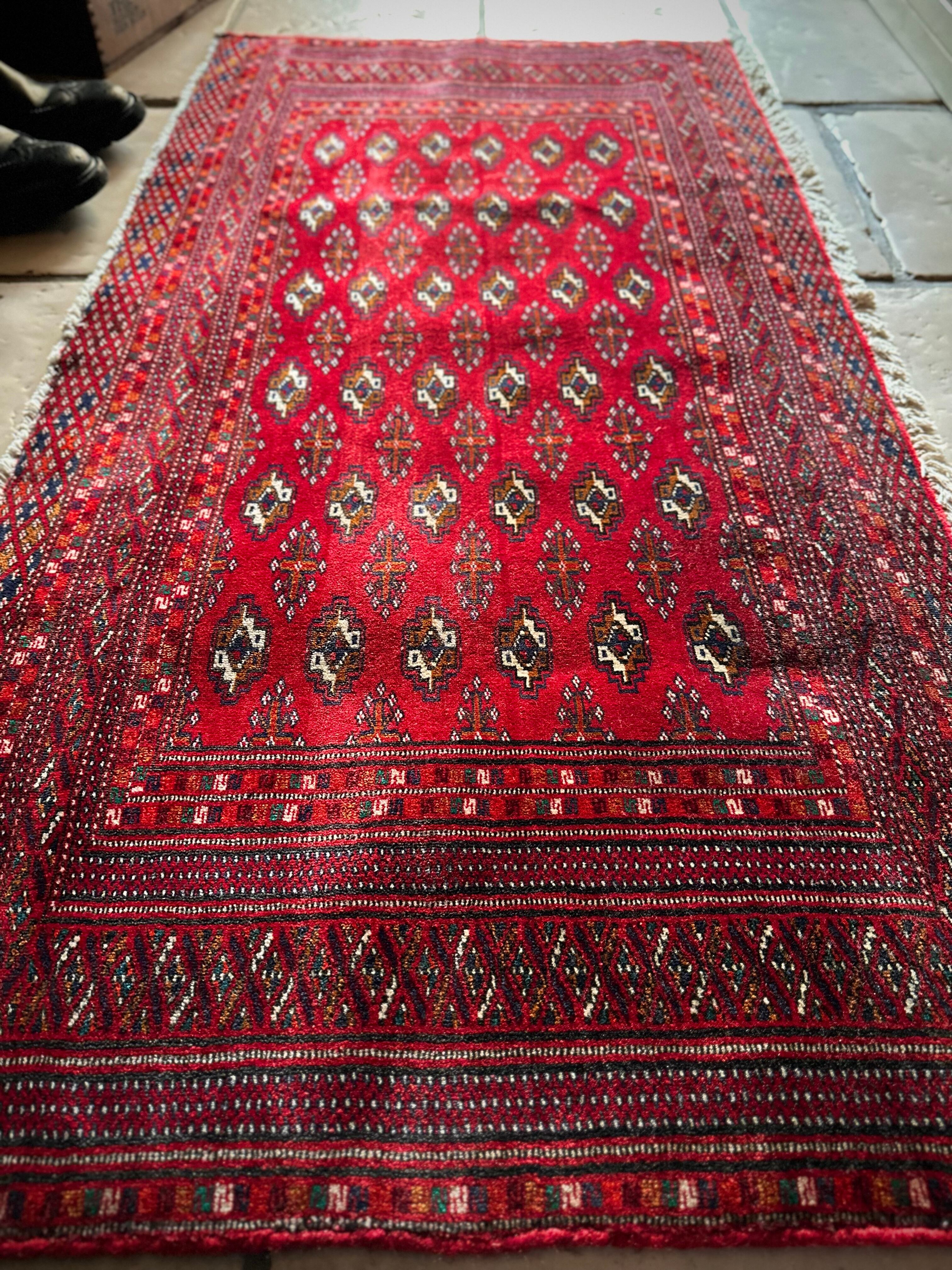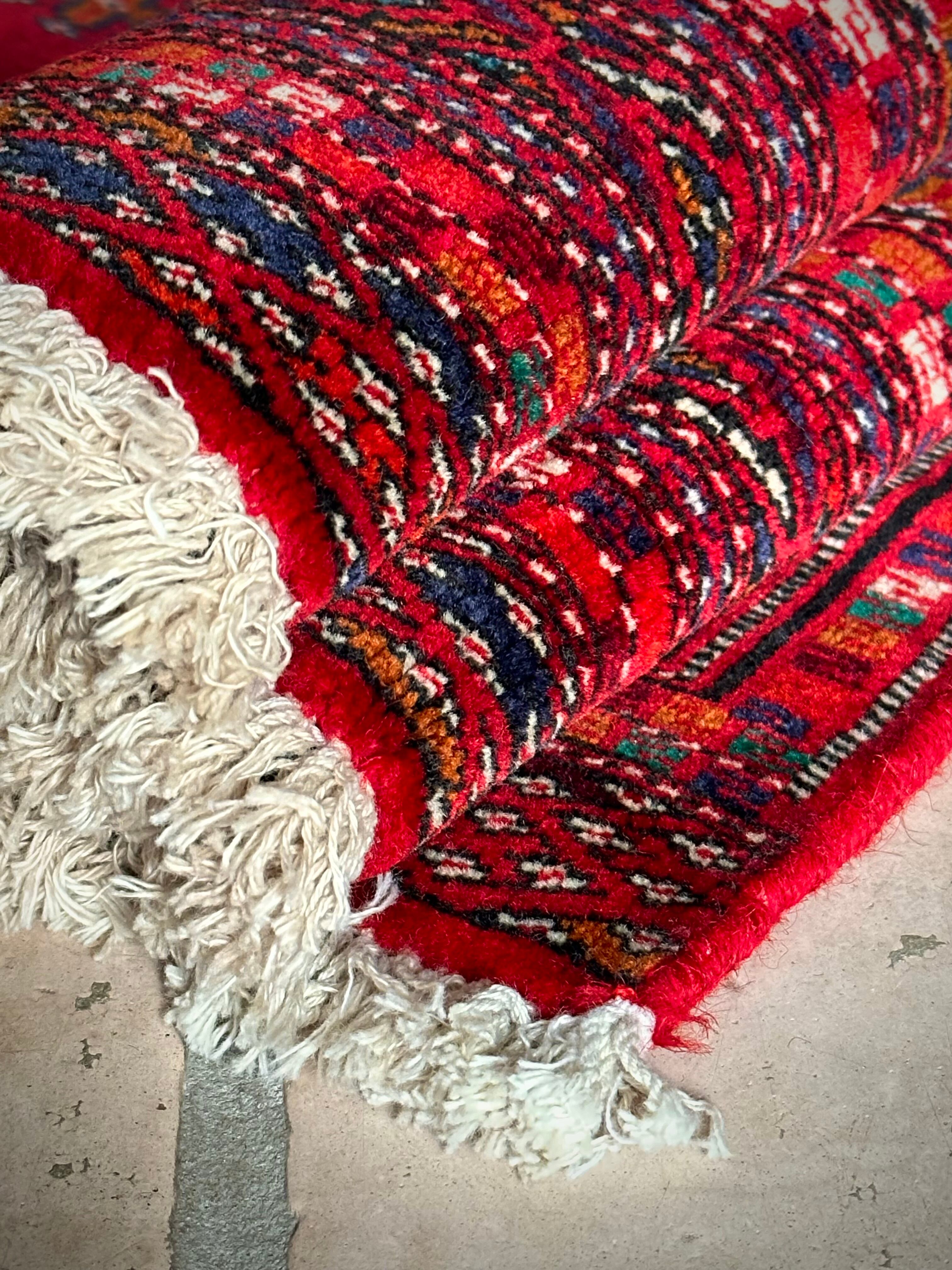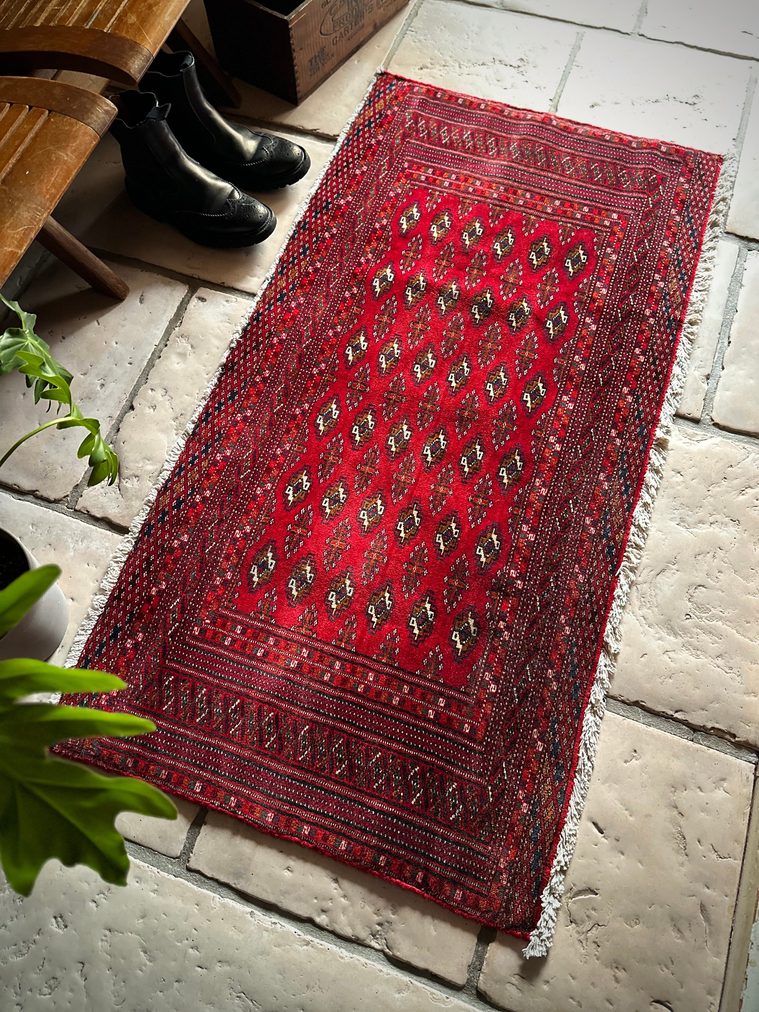 真っ赤な絨毯を代表するトルクメンから、こちらは細かな織りの模様に深みのある赤がヴィンテージ然としたトライバルラグになります。